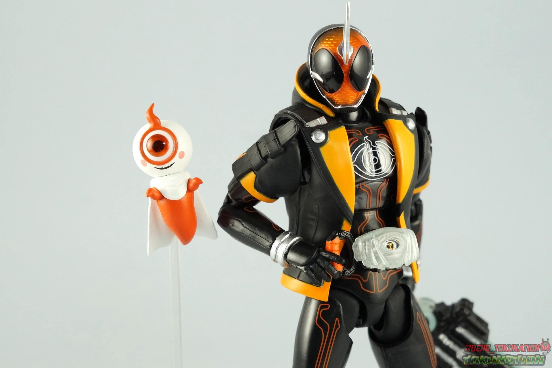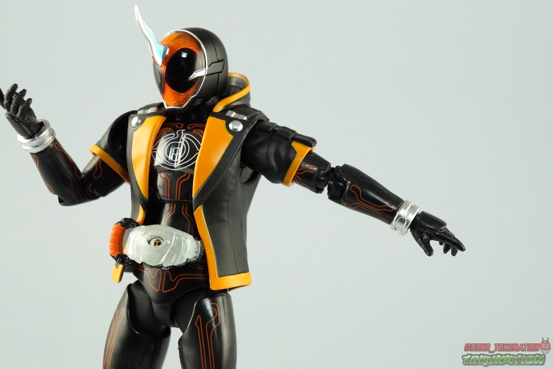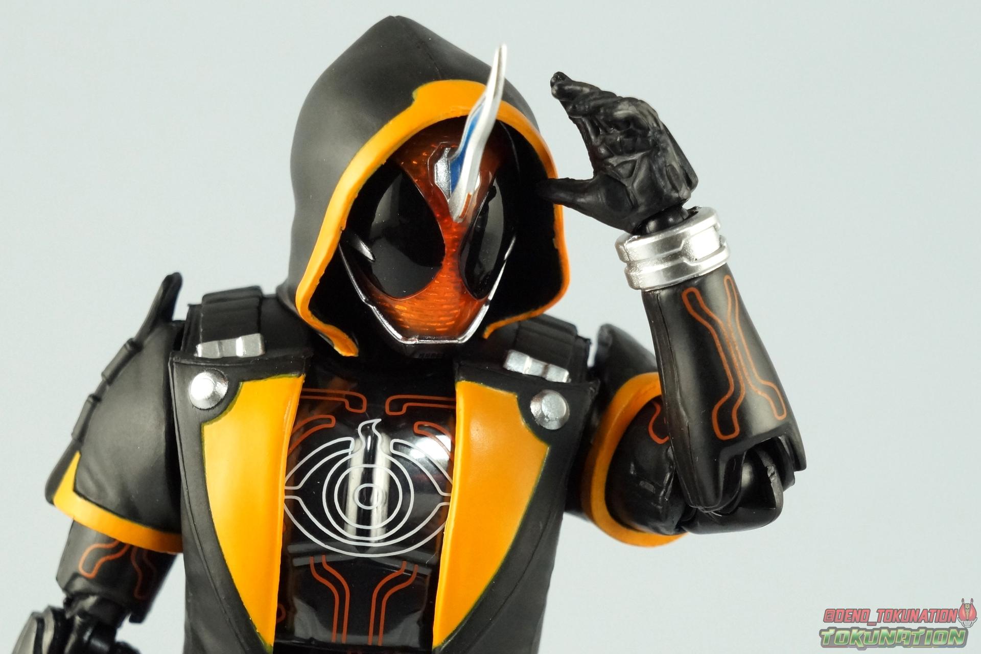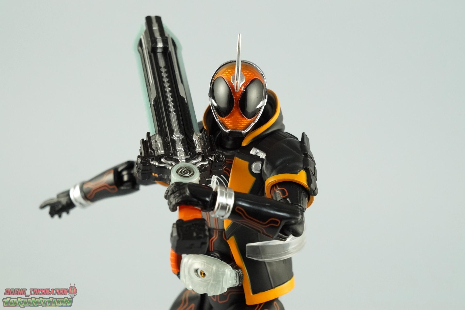 The latest Heisei Rider has made his debut in Bandai's long running collector's line with S.H. Figuarts Kamen Rider Ghost Ore Damashii! Takeru's 1st basic form, Ore Damashii is the embodiment of his own soul. In figure terms it's also our first outing with this line. So let's see how it'' be be shaping up. Packaging For starters the packaging is styled in the now very common slim box popularized during Kamen Rider Drive's run. It's not bad but it doesn't offer much to look at aside from some stock photos on the back. This 1st release of the figuart features a gold foil sticker on the window indicating it includes the 1st run bonus Yurusen figure. Similar to how S.H. Figuarts Sailor Moon had a 1st run sticker indicating the extra faces she came with. But all in all a pretty standard box. Main Figure Like many collectors you may be thinking that Ghost Ore Damashii will be a disappointment. And who could blame you? At the time of release this figure got quite a few negative reviews and there were more than a few stories about it's hit or miss QC. However I'll kick off my review by saying that, while Ghost is flawed, it's actually a quite solid figure. And that's coming from someone who hates the show itself, and generally doesn't care for this riders' design. For starters Ghost is painted in a combination of matte black & orange that while not bad, is lazily applied in spots. Especially around the trim on his Parka Ghost. However the finer details lining the glossy translucent parts of the armor are top notch. No imperfections at all. Likewise the ghost emblem on his chest is spot on and the head couldn't be more perfect. Ghost's head is a gorgeous brilliant orange that captures light perfectly. It just glows at the right angles. And for once I'm sold on those massive black eyes, they really give him a sense of depth and power I hadn't realized before. The Ghost Driver is a pretty bland opaque blue but much like it's DX counterpart this opaque face plate can be removed to expose the toothy monstrous face beneath. An Ore Damashii Eyecon is present but non-removable as it's sculpted in. It is however painted pretty well for something at that scale. Now lets talk about how Ghost moves. Again, many people have talked about how limited his articulation is. I'd like to dispel some of that myth. Ghost's leg design provides a full range of motion stunted only by the ankle tilts being just a bit limited. If they had a bit more forward/back room to move then they'd be great. But the cuff around the ankle limits that. The hips just need to be pulled down and rotated a little to clear the waste which is a relief, drop down hips are something I'm not a fan of. Here's the biggest issue the figure has though, the waist. While it certainly is possible to rotate it side to side, the flawed design also means you have to apply excessive for to the joint to make it move. This can make a scary loud clicking sound and can in some cases, as sadly evidenced by board member Barricade64, snap the waist in two entirely. I can't quite get my Ghost's waist to rotate that much and I certainly don't plan to force it. Liberal applications of shock oil to that joint seem to be the most popular fix. His jacket contributes to the restriction of the waist when it impacts the Driver, but more particularly it limits the upper body and shoulders. The arms themselves are actually pretty well thought out. Though mine must be a bad example of quality control. They keep pulling out of the body at the shoulder & elbow joints. It plugs right back together but it gets annoying while posing. The weakest piece of their design is the soft rubber shoulder sections. The "tabs" on the end are made of soft rubber so they don't get in the way while posing, as you can tuck the shoulders sort of up into the torso recesses. But they get bent very very easily. So watch out for those. I have to mention that wrist cuffs also nix just about any ankle tilt. When the hand is plugged on to the wrist it sits nearly flush so there isn't much room to work with. Finally Ghosts' head, as mentioned above, is perfect. But the molded folded down hoodie on his shoulders really limits how it can move. Forcing Ghost to look up when turned to one side or the other. The included normal hoodie accessory fixes that issue somewhat. Ghost Ore Damashii is more or less the spitting image of his TV counterpart. It's a great scale representation of a suit that I don't particularly care for, that somehow manages to make me like it. Posability issues aside, Ghost is actually a pretty great figure that fits right in with your other Heisei Riders. I've included comparison images with Gaim Orange Arms & Drive Type Speed as well below. Accessories Retail releases tend to come with a pretty nice array of accessories these days and Ghost is no slouch: 2 - sets of additional hands. 1 splayed open pair for posing, 1 "holding things" pair for use with his weapon. 1 - Gan Gun Saber. Once again this figure manages to surprise me and sell me on something I didn't like from the show. I felt the Saber looked clunky and silly in action but it scales well with the figuart and is surprisingly semi-functional. Now it can't replicate it's multitude of forms for various Ghost Changes like in show, but it can manage to do 2 of them. The default Blade Mode as well as Gun Mode. Just split the blade in half, plug the removed portion back on backwards, & fold the grip down to form the Gun. This is an unwieldy mode for it that thanks to the figures arm & shoulder design means it's difficult to 2-hand hold, but it's got a shotgun vibe to it that I like. 1 - hoodie (up). Intended to replace the default folded down hoodie, this piece can be used by removing the standard one as well as a small panel on the top of Ghosts' head. Then just plug this hoodie down on. Weirdly this hoodie which totally surrounds his head provides far far better neck movement. It's free floating so it's not attached to anything b