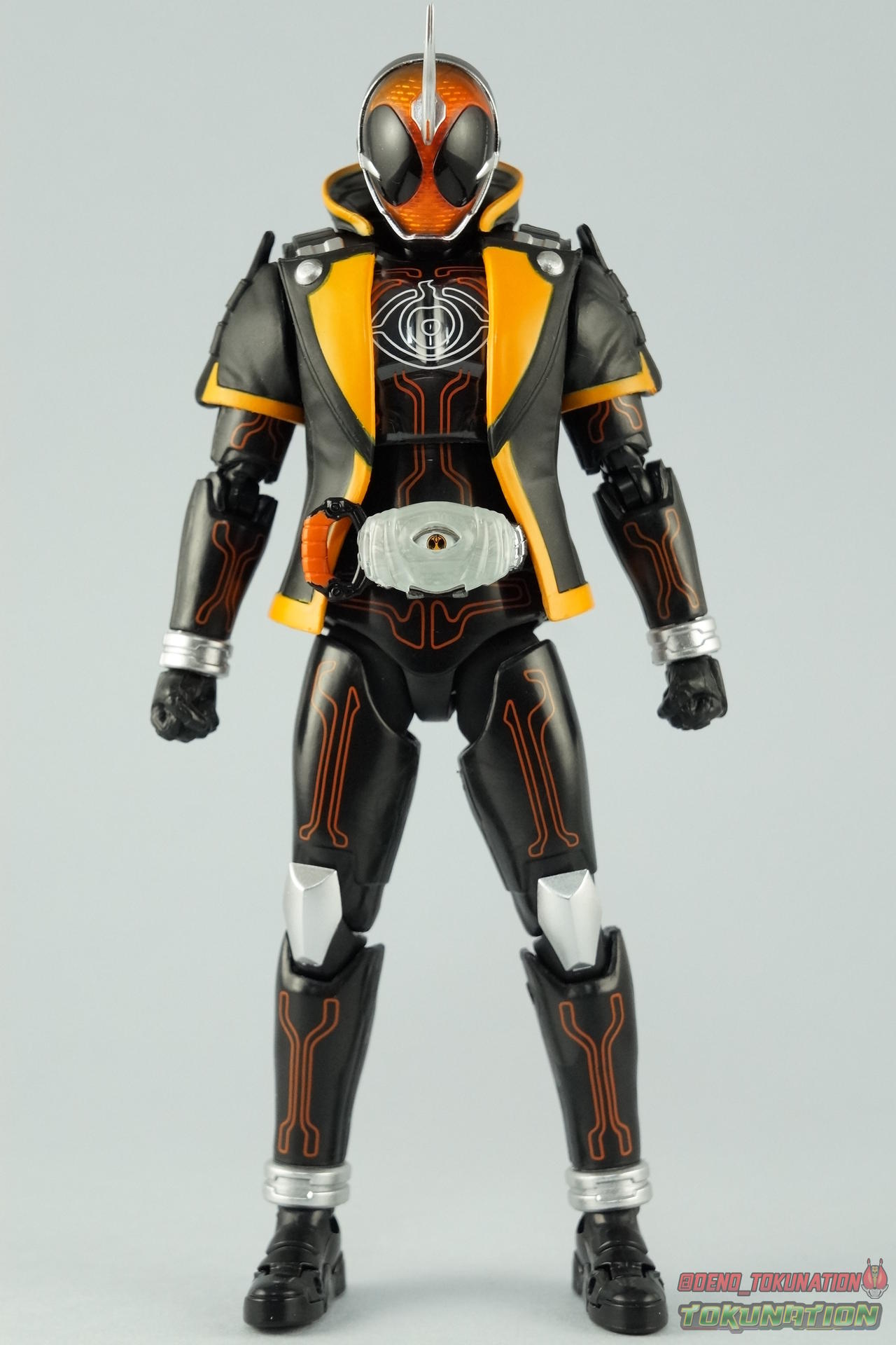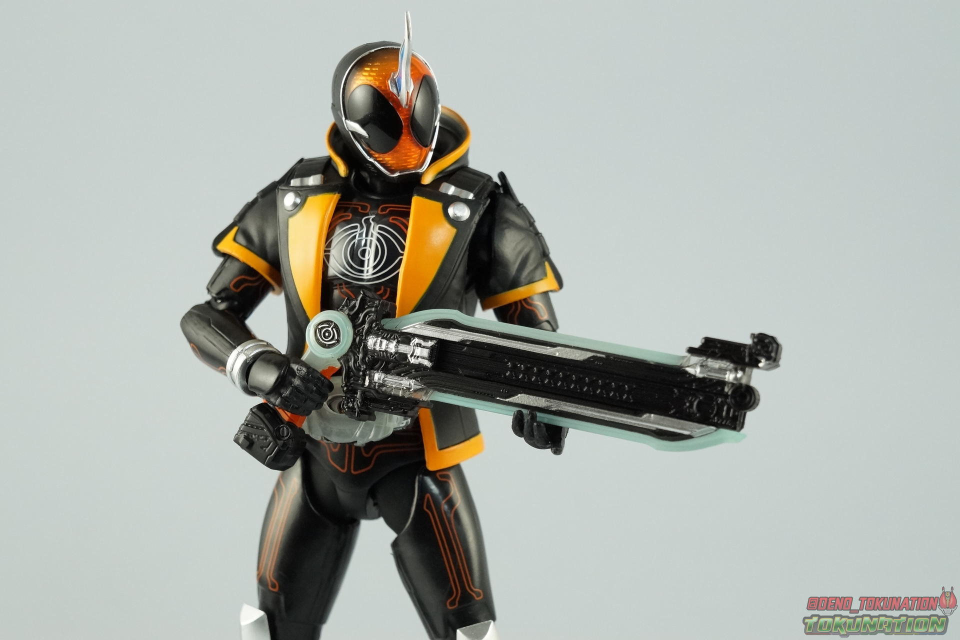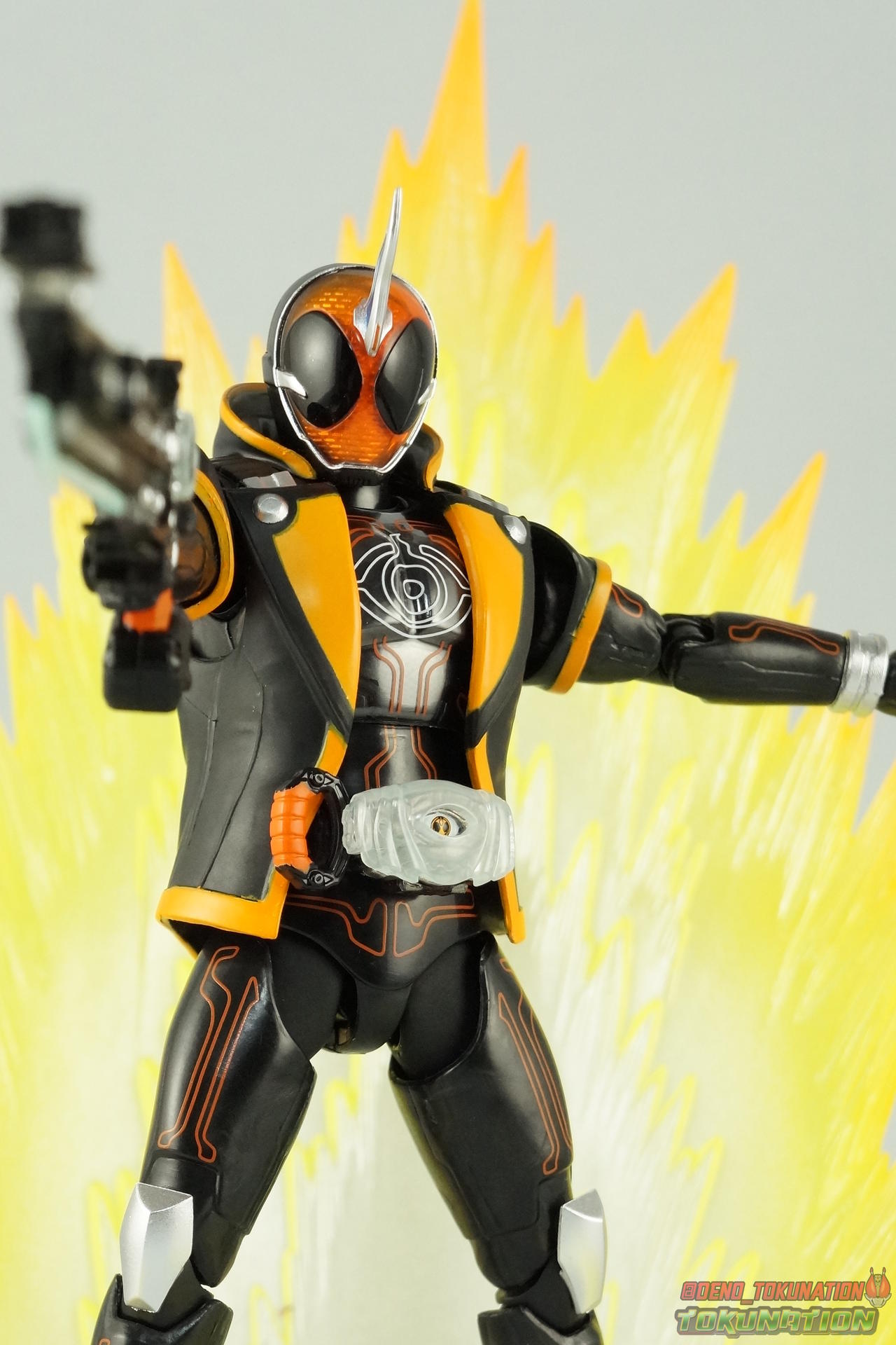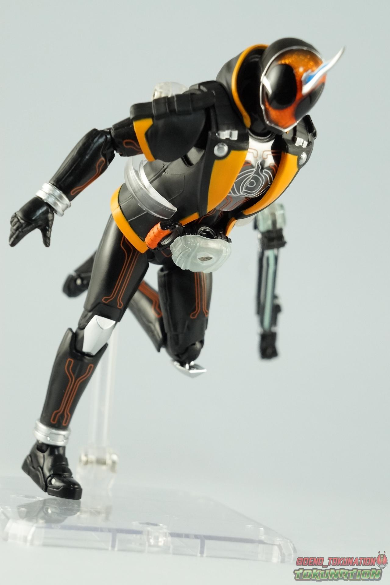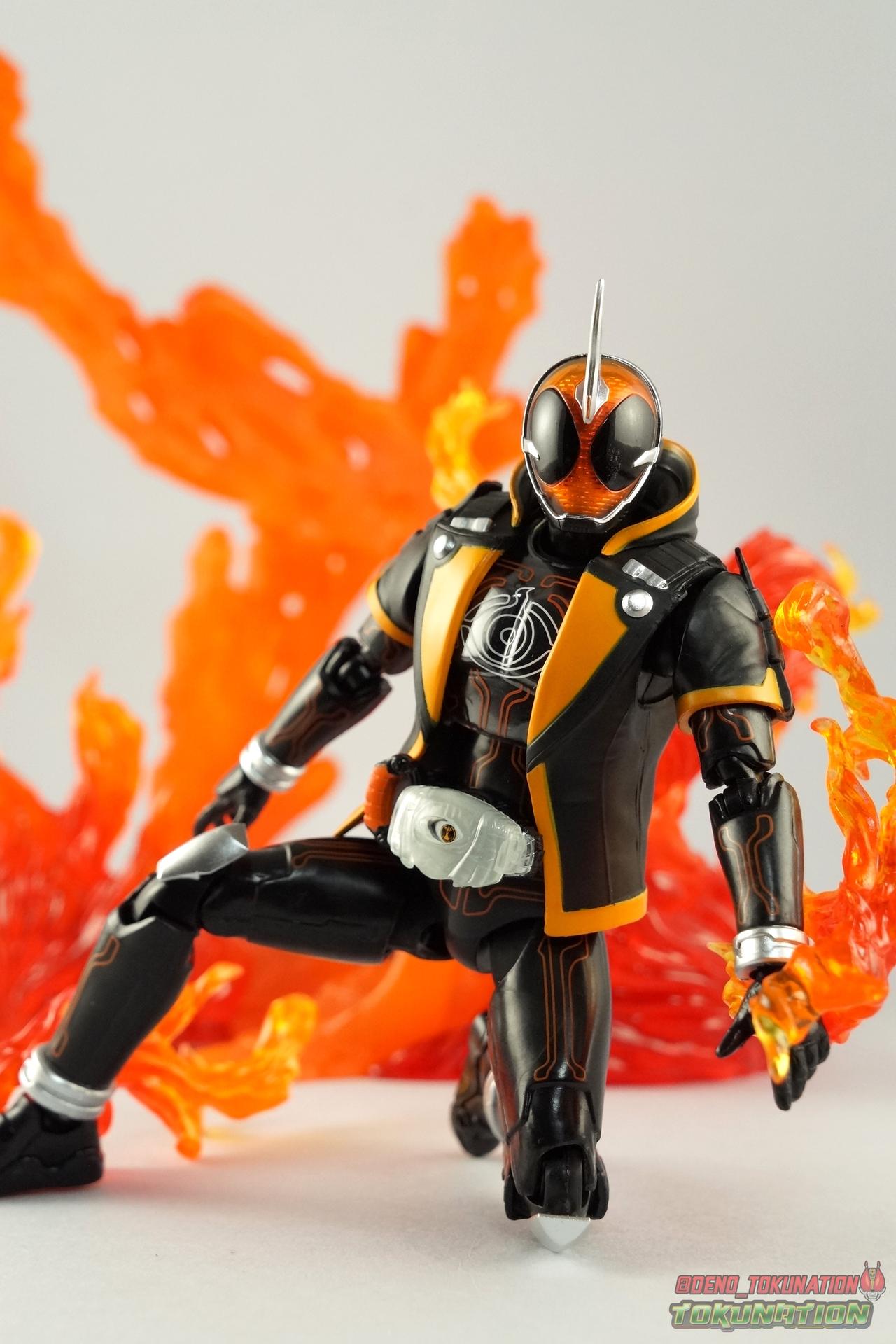 The latest Heisei Rider has made his debut in Bandai's long running collector's line with S.H. Figuarts Kamen Rider Ghost Ore Damashii! Takeru's 1st basic form, Ore Damashii is the embodiment of his own soul. In figure terms it's also our first outing with this line. So let's see how it'' be be shaping up. Packaging For starters the packaging is styled in the now very common slim box popularized during Kamen Rider Drive's run. It's not bad but it doesn't offer much to look at aside from some stock photos on the back. This 1st release of the figuart features a gold foil sticker on the window indicating it includes the 1st run bonus Yurusen figure. Similar to how S.H. Figuarts Sailor Moon had a 1st run sticker indicating the extra faces she came with. But all in all a pretty standard box. Main Figure Like many collectors you may be thinking that Ghost Ore Damashii will be a disappointment. And who could blame you? At the time of release this figure got quite a few negative reviews and there were more than a few stories about it's hit or miss QC. However I'll kick off my review by saying that, while Ghost is flawed, it's actually a quite solid figure. And that's coming from someone who hates the show itself, and generally doesn't care for this riders' design. For starters Ghost is painted in a combination of matte black & orange that while not bad, is lazily applied in spots. Especially around the trim on his Parka Ghost. However the finer details lining the glossy translucent parts of the armor are top notch. No imperfections at all. Likewise the ghost emblem on his chest is spot on and the head couldn't be more perfect. Ghost's head is a gorgeous brilliant orange that captures light perfectly. It just glows at the right angles. And for once I'm sold on those massive black eyes, they really give him a sense of depth and power I hadn't realized before. The Ghost Driver is a pretty bland opaque blue but much like it's DX counterpart this opaque face plate can be removed to expose the toothy monstrous face beneath. An Ore Damashii Eyecon is present but non-removable as it's sculpted in. It is however painted pretty well for something at that scale. Now lets talk about how Ghost moves. Again, many people have talked about how limited his articulation is. I'd like to dispel some of that myth. Ghost's leg design provides a full range of motion stunted only by the ankle tilts being just a bit limited. If they had a bit more forward/back room to move then they'd be great. But the cuff around the ankle limits that. The hips just need to be pulled down and rotated a little to clear the waste which is a relief, drop down hips are something I'm not a fan of. Here's the biggest issue the figure has though, the waist. While it certainly is possible to rotate it side to side, the flawed design also means you have to apply excessive for to the joint to make it move. This can make a scary loud clicking sound and can in some cases, as sadly evidenced by board member Barricade64, snap the waist in two entirely. I can't quite get my Ghost's waist to rotate that much and I certainly don't plan to force it. Liberal applications of shock oil to that joint seem to be the most popular fix. His jacket contributes to the restriction of the waist when it impacts the Driver, but more particularly it limits the upper body and shoulders. The arms themselves are actually pretty well thought out. Though mine must be a bad example of quality control. They keep pulling out of the body at the shoulder & elbow joints. It plugs right back together but it gets annoying while posing. The weakest piece of their design is the soft rubber shoulder sections. The "tabs" on the end are made of soft rubber so they don't get in the way while posing, as you can tuck the shoulders sort of up into the torso recesses. But they get bent very very easily. So watch out for those. I have to mention that wrist cuffs also nix just about any ankle tilt. When the hand is plugged on to the wrist it sits nearly flush so there isn't much room to work with. Finally Ghosts' head, as mentioned above, is perfect. But the molded folded down hoodie on his shoulders really limits how it can move. Forcing Ghost to look up when turned to one side or the other. The included normal hoodie accessory fixes that issue somewhat. Ghost Ore Damashii is more or less the spitting image of his TV counterpart. It's a great scale representation of a suit that I don't particularly care for, that somehow manages to make me like it. Posability issues aside, Ghost is actually a pretty great figure that fits right in with your other Heisei Riders. I've included comparison images with Gaim Orange Arms & Drive Type Speed as well below. Accessories Retail releases tend to come with a pretty nice array of accessories these days and Ghost is no slouch: 2 - sets of additional hands. 1 splayed open pair for posing, 1 "holding things" pair for use with his weapon. 1 - Gan Gun Saber. Once again this figure manages to surprise me and sell me on something I didn't like from the show. I felt the Saber looked clunky and silly in action but it scales well with the figuart and is surprisingly semi-functional. Now it can't replicate it's multitude of forms for various Ghost Changes like in show, but it can manage to do 2 of them. The default Blade Mode as well as Gun Mode. Just split the blade in half, plug the removed portion back on backwards, & fold the grip down to form the Gun. This is an unwieldy mode for it that thanks to the figures arm & shoulder design means it's difficult to 2-hand hold, but it's got a shotgun vibe to it that I like. 1 - hoodie (up). Intended to replace the default folded down hoodie, this piece can be used by removing the standard one as well as a small panel on the top of Ghosts' head. Then just plug this hoodie down on. Weirdly this hoodie which totally surrounds his head provides far far better neck movement. It's free floating so it's not attached to anything b