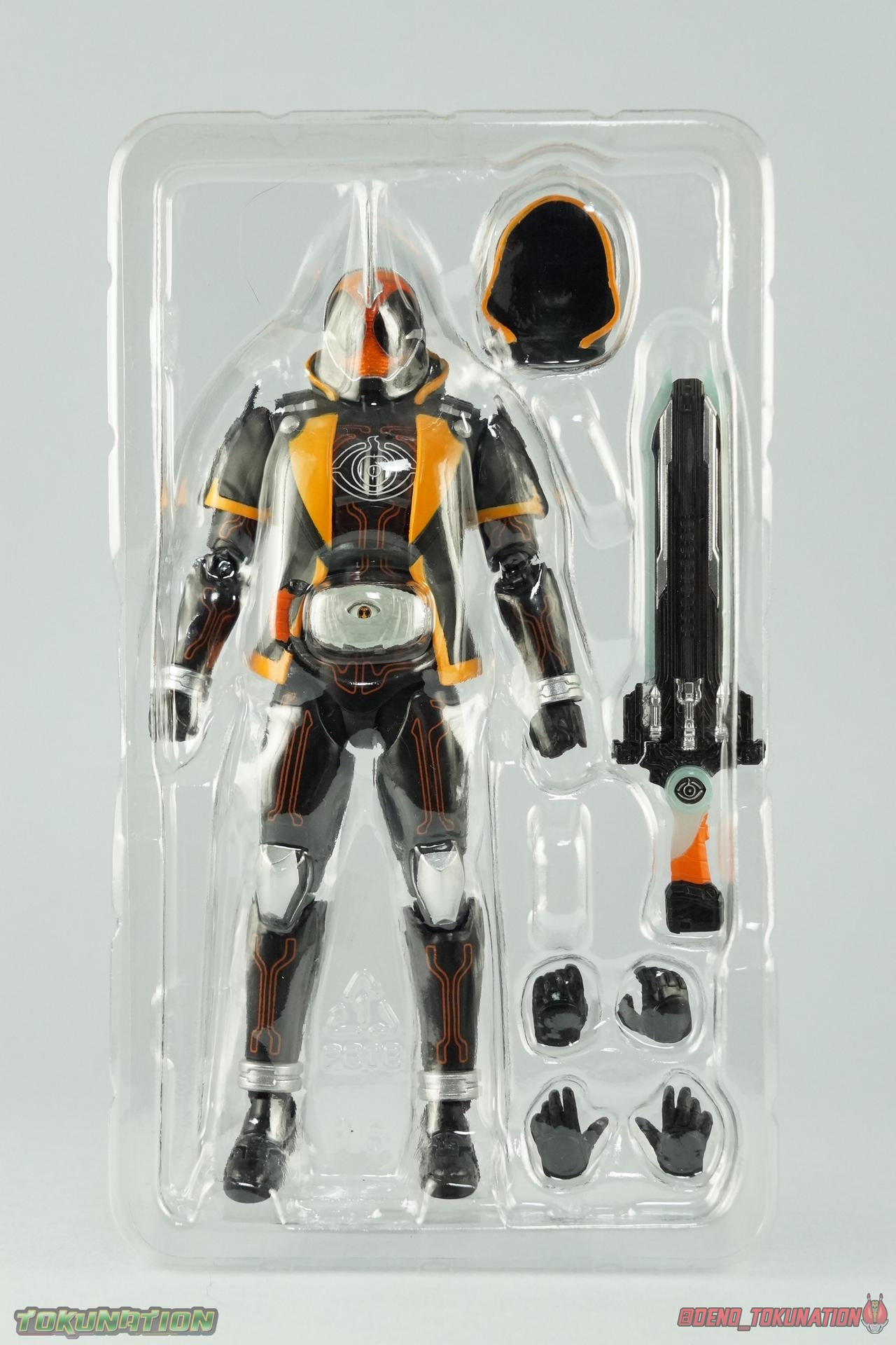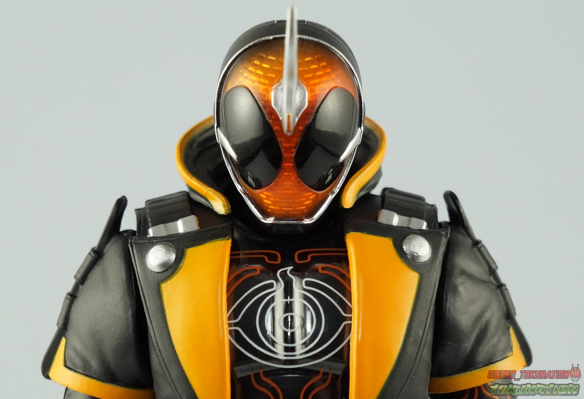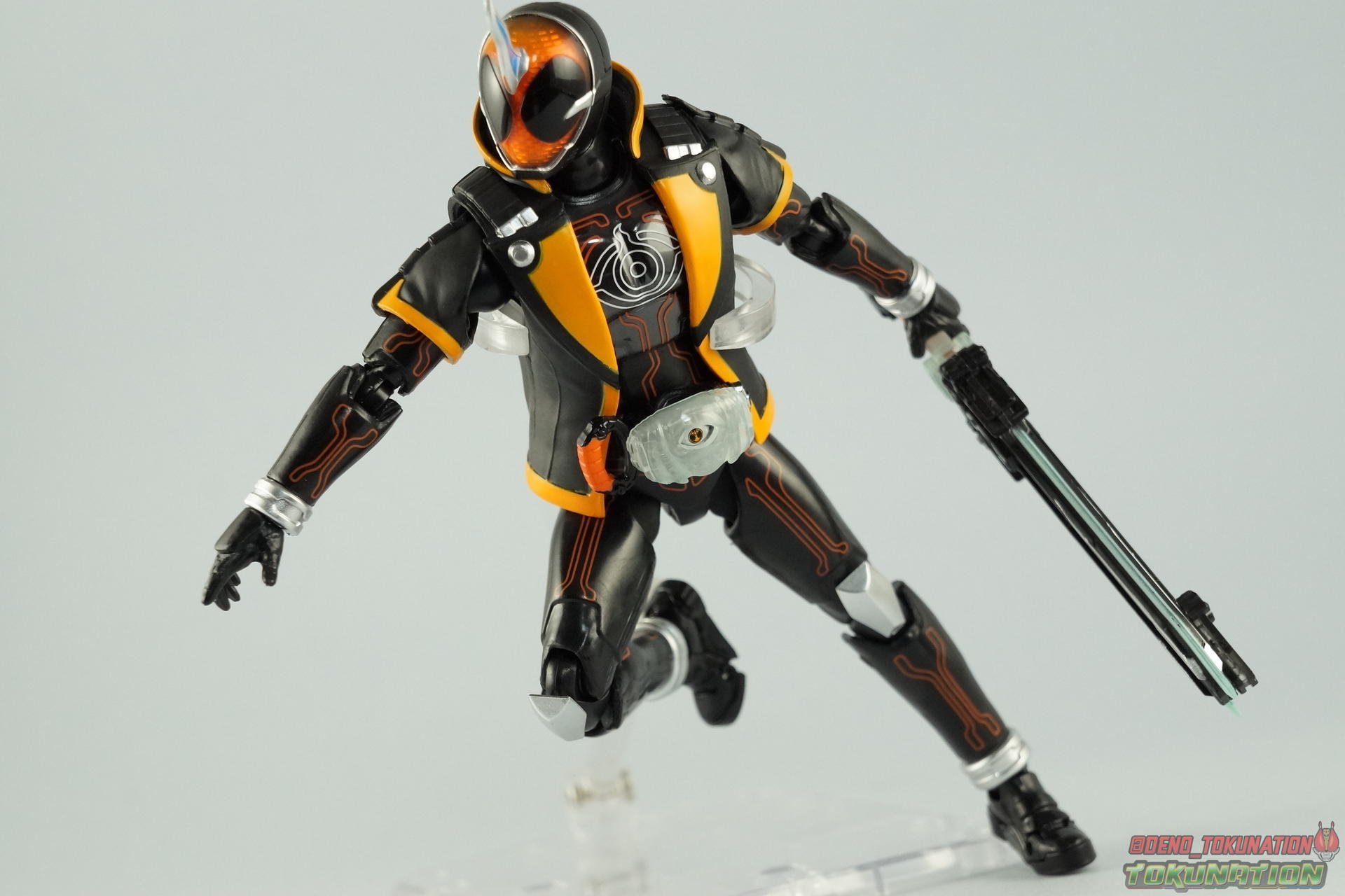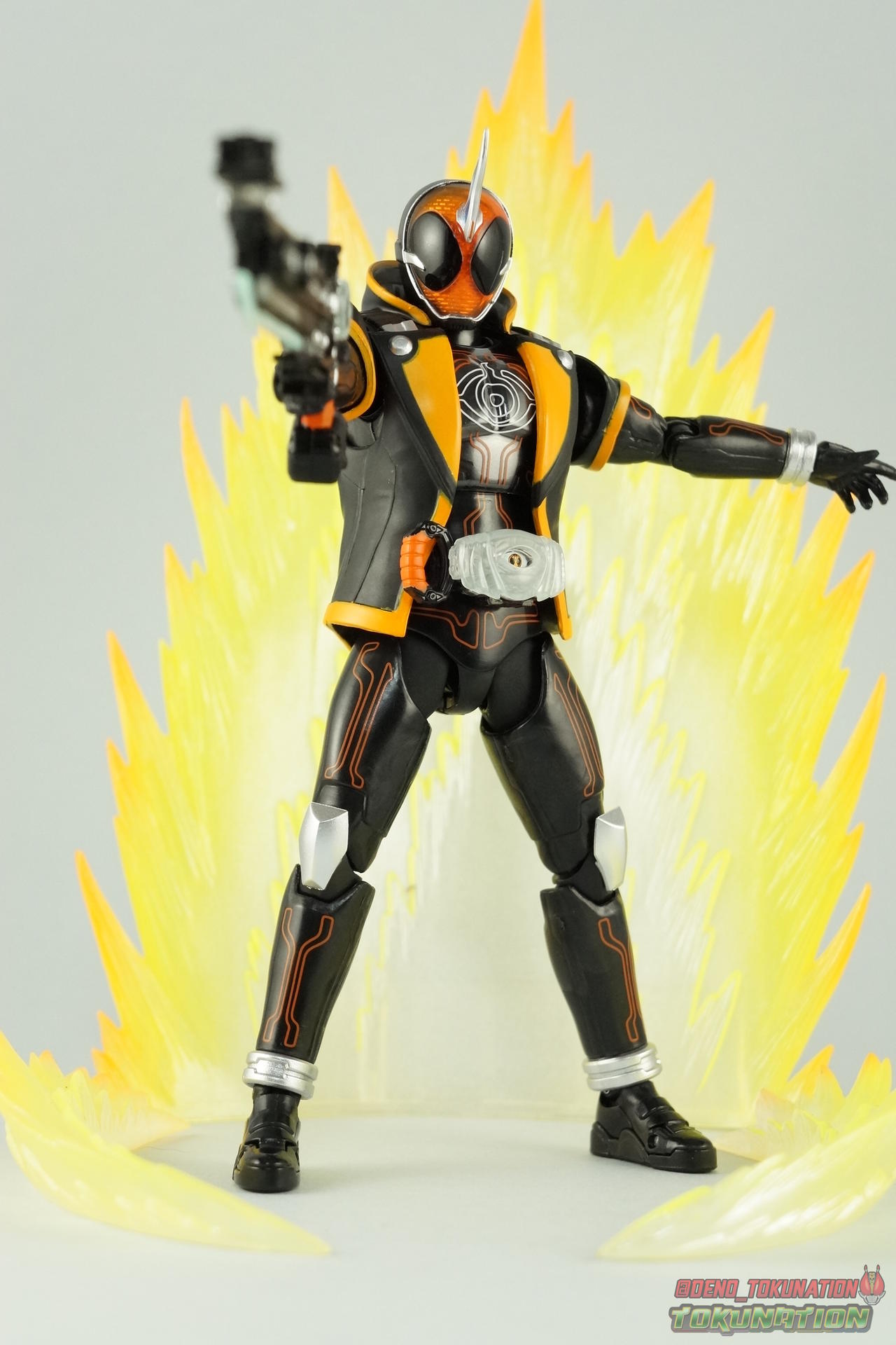 The latest Heisei Rider has made his debut in Bandai's long running collector's line with S.H. Figuarts Kamen Rider Ghost Ore Damashii! Takeru's 1st basic form, Ore Damashii is the embodiment of his own soul. In figure terms it's also our first outing with this line. So let's see how it'' be be shaping up. Packaging For starters the packaging is styled in the now very common slim box popularized during Kamen Rider Drive's run. It's not bad but it doesn't offer much to look at aside from some stock photos on the back. This 1st release of the figuart features a gold foil sticker on the window indicating it includes the 1st run bonus Yurusen figure. Similar to how S.H. Figuarts Sailor Moon had a 1st run sticker indicating the extra faces she came with. But all in all a pretty standard box. Main Figure Like many collectors you may be thinking that Ghost Ore Damashii will be a disappointment. And who could blame you? At the time of release this figure got quite a few negative reviews and there were more than a few stories about it's hit or miss QC. However I'll kick off my review by saying that, while Ghost is flawed, it's actually a quite solid figure. And that's coming from someone who hates the show itself, and generally doesn't care for this riders' design. For starters Ghost is painted in a combination of matte black & orange that while not bad, is lazily applied in spots. Especially around the trim on his Parka Ghost. However the finer details lining the glossy translucent parts of the armor are top notch. No imperfections at all. Likewise the ghost emblem on his chest is spot on and the head couldn't be more perfect. Ghost's head is a gorgeous brilliant orange that captures light perfectly. It just glows at the right angles. And for once I'm sold on those massive black eyes, they really give him a sense of depth and power I hadn't realized before. The Ghost Driver is a pretty bland opaque blue but much like it's DX counterpart this opaque face plate can be removed to expose the toothy monstrous face beneath. An Ore Damashii Eyecon is present but non-removable as it's sculpted in. It is however painted pretty well for something at that scale. Now lets talk about how Ghost moves. Again, many people have talked about how limited his articulation is. I'd like to dispel some of that myth. Ghost's leg design provides a full range of motion stunted only by the ankle tilts being just a bit limited. If they had a bit more forward/back room to move then they'd be great. But the cuff around the ankle limits that. The hips just need to be pulled down and rotated a little to clear the waste which is a relief, drop down hips are something I'm not a fan of. Here's the biggest issue the figure has though, the waist. While it certainly is possible to rotate it side to side, the flawed design also means you have to apply excessive for to the joint to make it move. This can make a scary loud clicking sound and can in some cases, as sadly evidenced by board member Barricade64, snap the waist in two entirely. I can't quite get my Ghost's waist to rotate that much and I certainly don't plan to force it. Liberal applications of shock oil to that joint seem to be the most popular fix. His jacket contributes to the restriction of the waist when it impacts the Driver, but more particularly it limits the upper body and shoulders. The arms themselves are actually pretty well thought out. Though mine must be a bad example of quality control. They keep pulling out of the body at the shoulder & elbow joints. It plugs right back together but it gets annoying while posing. The weakest piece of their design is the soft rubber shoulder sections. The "tabs" on the end are made of soft rubber so they don't get in the way while posing, as you can tuck the shoulders sort of up into the torso recesses. But they get bent very very easily. So watch out for those. I have to mention that wrist cuffs also nix just about any ankle tilt. When the hand is plugged on to the wrist it sits nearly flush so there isn't much room to work with. Finally Ghosts' head, as mentioned above, is perfect. But the molded folded down hoodie on his shoulders really limits how it can move. Forcing Ghost to look up when turned to one side or the other. The included normal hoodie accessory fixes that issue somewhat. Ghost Ore Damashii is more or less the spitting image of his TV counterpart. It's a great scale representation of a suit that I don't particularly care for, that somehow manages to make me like it. Posability issues aside, Ghost is actually a pretty great figure that fits right in with your other Heisei Riders. I've included comparison images with Gaim Orange Arms & Drive Type Speed as well below. Accessories Retail releases tend to come with a pretty nice array of accessories these days and Ghost is no slouch: 2 - sets of additional hands. 1 splayed open pair for posing, 1 "holding things" pair for use with his weapon. 1 - Gan Gun Saber. Once again this figure manages to surprise me and sell me on something I didn't like from the show. I felt the Saber looked clunky and silly in action but it scales well with the figuart and is surprisingly semi-functional. Now it can't replicate it's multitude of forms for various Ghost Changes like in show, but it can manage to do 2 of them. The default Blade Mode as well as Gun Mode. Just split the blade in half, plug the removed portion back on backwards, & fold the grip down to form the Gun. This is an unwieldy mode for it that thanks to the figures arm & shoulder design means it's difficult to 2-hand hold, but it's got a shotgun vibe to it that I like. 1 - hoodie (up). Intended to replace the default folded down hoodie, this piece can be used by removing the standard one as well as a small panel on the top of Ghosts' head. Then just plug this hoodie down on. Weirdly this hoodie which totally surrounds his head provides far far better neck movement. It's free floating so it's not attached to anything b