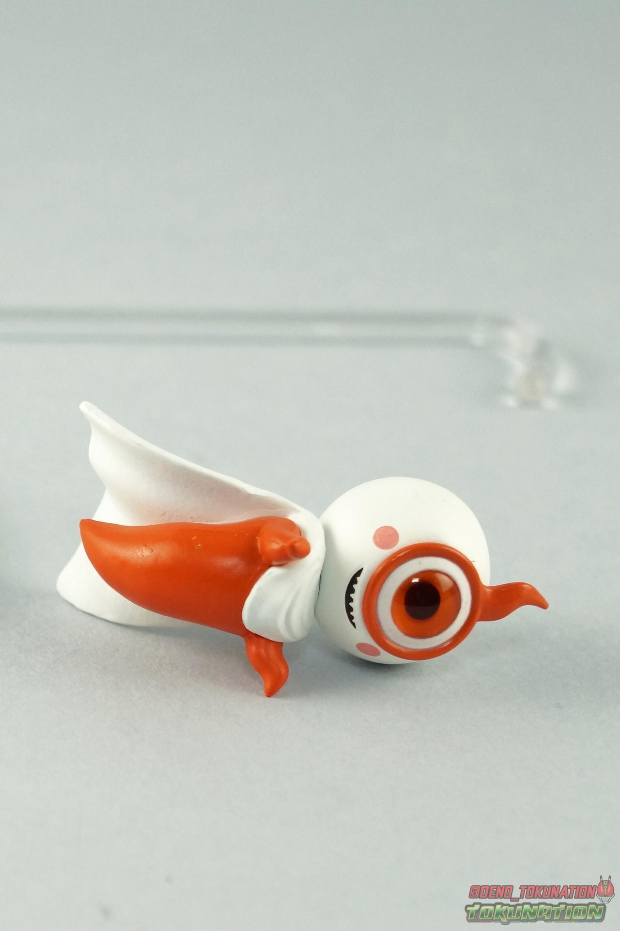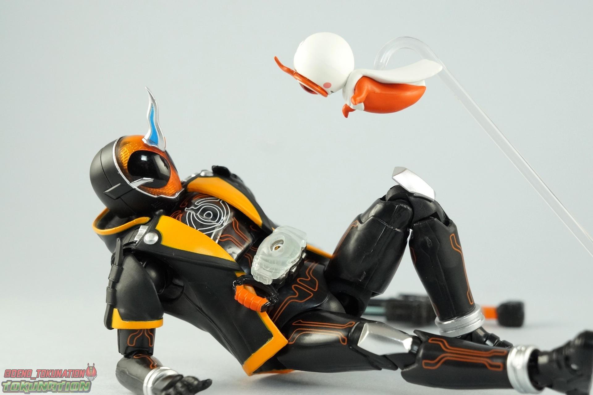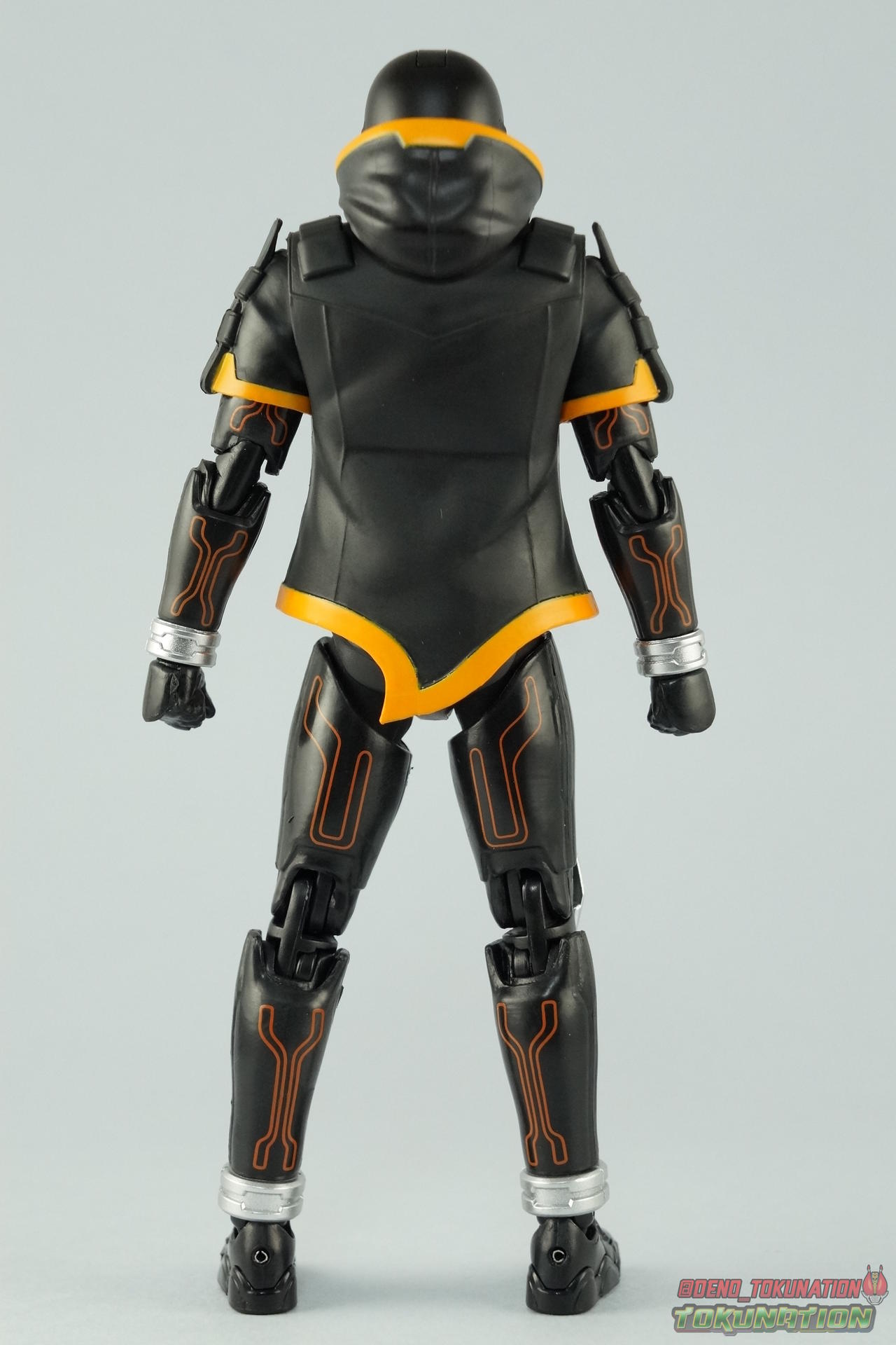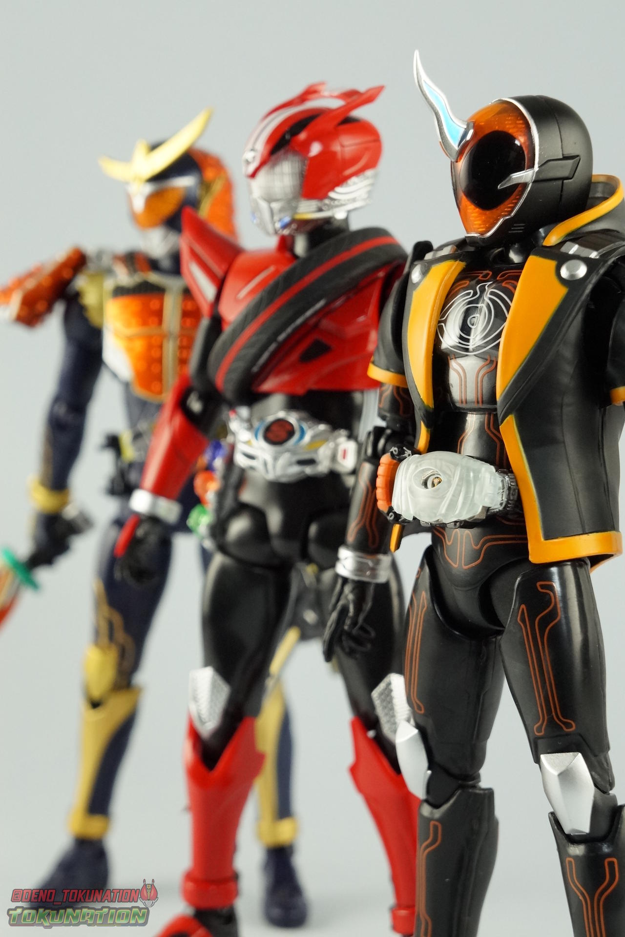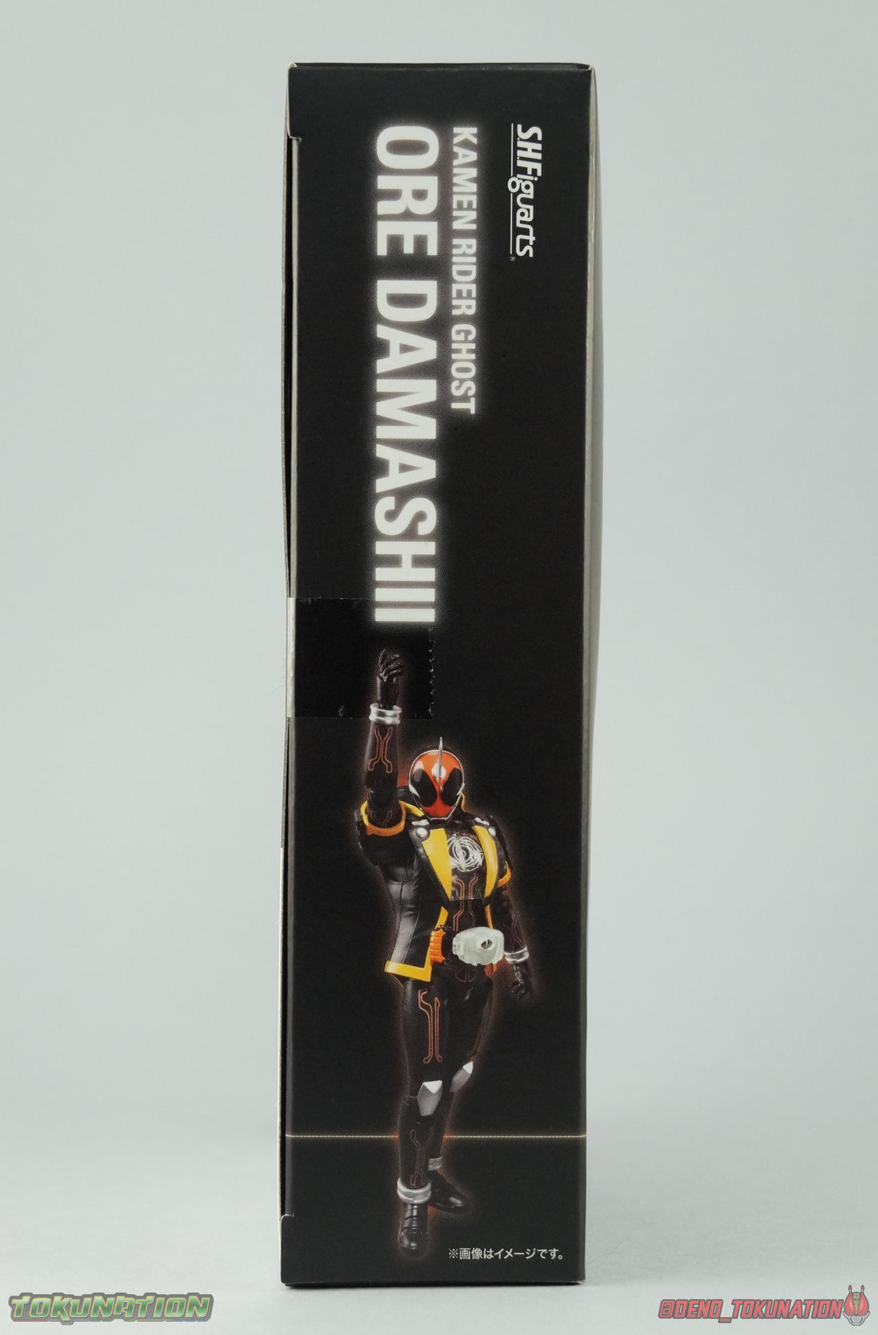 The latest Heisei Rider has made his debut in Bandai's long running collector's line with S.H. Figuarts Kamen Rider Ghost Ore Damashii! Takeru's 1st basic form, Ore Damashii is the embodiment of his own soul. In figure terms it's also our first outing with this line. So let's see how it'' be be shaping up. Packaging For starters the packaging is styled in the now very common slim box popularized during Kamen Rider Drive's run. It's not bad but it doesn't offer much to look at aside from some stock photos on the back. This 1st release of the figuart features a gold foil sticker on the window indicating it includes the 1st run bonus Yurusen figure. Similar to how S.H. Figuarts Sailor Moon had a 1st run sticker indicating the extra faces she came with. But all in all a pretty standard box. Main Figure Like many collectors you may be thinking that Ghost Ore Damashii will be a disappointment. And who could blame you? At the time of release this figure got quite a few negative reviews and there were more than a few stories about it's hit or miss QC. However I'll kick off my review by saying that, while Ghost is flawed, it's actually a quite solid figure. And that's coming from someone who hates the show itself, and generally doesn't care for this riders' design. For starters Ghost is painted in a combination of matte black & orange that while not bad, is lazily applied in spots. Especially around the trim on his Parka Ghost. However the finer details lining the glossy translucent parts of the armor are top notch. No imperfections at all. Likewise the ghost emblem on his chest is spot on and the head couldn't be more perfect. Ghost's head is a gorgeous brilliant orange that captures light perfectly. It just glows at the right angles. And for once I'm sold on those massive black eyes, they really give him a sense of depth and power I hadn't realized before. The Ghost Driver is a pretty bland opaque blue but much like it's DX counterpart this opaque face plate can be removed to expose the toothy monstrous face beneath. An Ore Damashii Eyecon is present but non-removable as it's sculpted in. It is however painted pretty well for something at that scale. Now lets talk about how Ghost moves. Again, many people have talked about how limited his articulation is. I'd like to dispel some of that myth. Ghost's leg design provides a full range of motion stunted only by the ankle tilts being just a bit limited. If they had a bit more forward/back room to move then they'd be great. But the cuff around the ankle limits that. The hips just need to be pulled down and rotated a little to clear the waste which is a relief, drop down hips are something I'm not a fan of. Here's the biggest issue the figure has though, the waist. While it certainly is possible to rotate it side to side, the flawed design also means you have to apply excessive for to the joint to make it move. This can make a scary loud clicking sound and can in some cases, as sadly evidenced by board member Barricade64, snap the waist in two entirely. I can't quite get my Ghost's waist to rotate that much and I certainly don't plan to force it. Liberal applications of shock oil to that joint seem to be the most popular fix. His jacket contributes to the restriction of the waist when it impacts the Driver, but more particularly it limits the upper body and shoulders. The arms themselves are actually pretty well thought out. Though mine must be a bad example of quality control. They keep pulling out of the body at the shoulder & elbow joints. It plugs right back together but it gets annoying while posing. The weakest piece of their design is the soft rubber shoulder sections. The "tabs" on the end are made of soft rubber so they don't get in the way while posing, as you can tuck the shoulders sort of up into the torso recesses. But they get bent very very easily. So watch out for those. I have to mention that wrist cuffs also nix just about any ankle tilt. When the hand is plugged on to the wrist it sits nearly flush so there isn't much room to work with. Finally Ghosts' head, as mentioned above, is perfect. But the molded folded down hoodie on his shoulders really limits how it can move. Forcing Ghost to look up when turned to one side or the other. The included normal hoodie accessory fixes that issue somewhat. Ghost Ore Damashii is more or less the spitting image of his TV counterpart. It's a great scale representation of a suit that I don't particularly care for, that somehow manages to make me like it. Posability issues aside, Ghost is actually a pretty great figure that fits right in with your other Heisei Riders. I've included comparison images with Gaim Orange Arms & Drive Type Speed as well below. Accessories Retail releases tend to come with a pretty nice array of accessories these days and Ghost is no slouch: 2 - sets of additional hands. 1 splayed open pair for posing, 1 "holding things" pair for use with his weapon. 1 - Gan Gun Saber. Once again this figure manages to surprise me and sell me on something I didn't like from the show. I felt the Saber looked clunky and silly in action but it scales well with the figuart and is surprisingly semi-functional. Now it can't replicate it's multitude of forms for various Ghost Changes like in show, but it can manage to do 2 of them. The default Blade Mode as well as Gun Mode. Just split the blade in half, plug the removed portion back on backwards, & fold the grip down to form the Gun. This is an unwieldy mode for it that thanks to the figures arm & shoulder design means it's difficult to 2-hand hold, but it's got a shotgun vibe to it that I like. 1 - hoodie (up). Intended to replace the default folded down hoodie, this piece can be used by removing the standard one as well as a small panel on the top of Ghosts' head. Then just plug this hoodie down on. Weirdly this hoodie which totally surrounds his head provides far far better neck movement. It's free floating so it's not attached to anything b