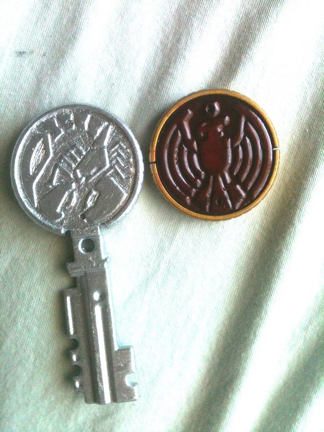 Well, key XD. I tried to strip the paint on my GokaiViolet key so I could repaint it, but it came out horrible. The only thing that was safe was the key bit at the end. And then I got an idea after looking at my Sasori Cell Medal.