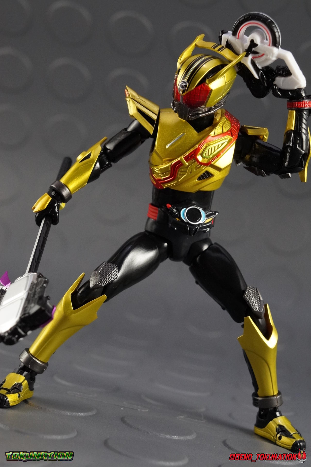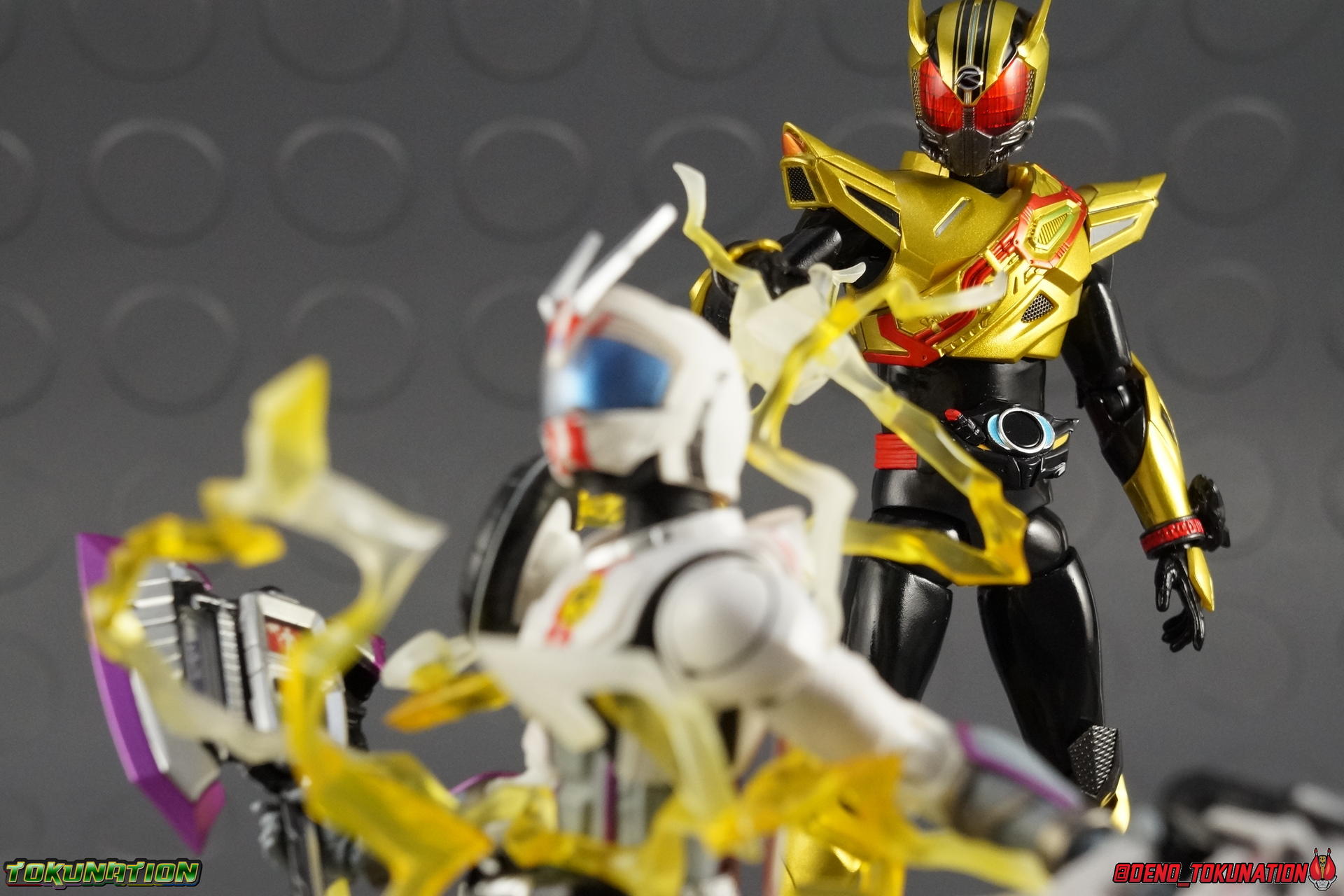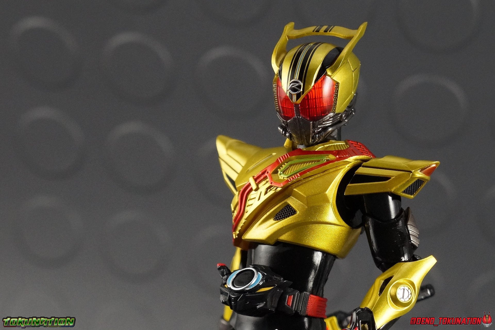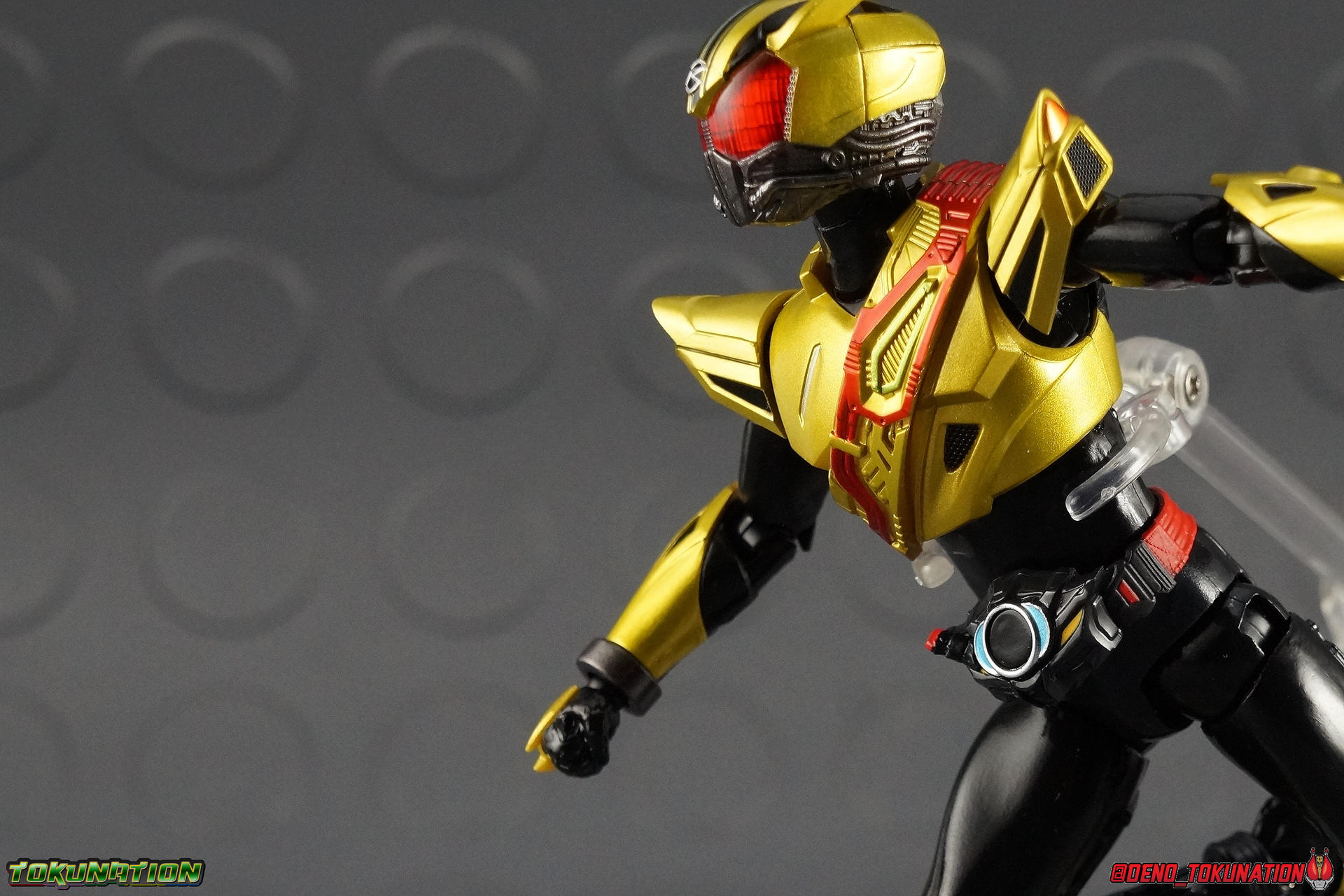 I've patiently waited for this bad boy to come in for a review and gallery and I'm overjoyed to have him now. One of my favorite hero designs ever redone as an irredeemably, purely evil, villain? Sweet sweet gold paint? AND it was a retail release?? You better believe I'm excited to share this gallery of S.H. Figuarts Kamen Rider Gold Drive! Packaging The last 7 releases from Kamen Rider Drive came out between October 2015 & July 2016, and they were all web exclusives. None featured window boxes due to their web exclusive nature. But bucking that trend after a very long stretch is Gold Drive, which is a retail release! Gold Drive employs the exact same packaging as the original Drive Type Speed. This is a very common box design at this point, it began with Drive but has actually been carried over to Ghost as well, so no real surprises. Just new stock photos and a Banno Tablet face on the top right corner of the box. The box obviously romanizes the name as "Gord Drive" but given his color scheme and context we obviously know the proper name is Gold Drive. R's & L's are often flipped when going from Japanese to English. Main Figure This figure is a straight up repaint of the Drive Type Speed Mold but with a Proto-Speed Tire/Archetype Gear from Kamen Rider Proto-Drive. As such this is our 3rd outing with this mold, and a 4th is on the way with the soon to be released Zero Drive. At this point if you've handled any version of the Type Speed/Proto/Gold/Zero body, you know what to expect, excellence. Once again I want to emphasize that the Drive Type Speed mold is one of my all time favorite S.H. Figuarts. It's a fantastic figure, so by extension Gold Drive is fantastic. He's primarily painted in a gorgeous shiny gold finish that really stands out from the glossy black parts of his undersuit. He stands out very much in any display, in a good way. The paints apps on this release are just as strong as the previous 2 iterations of the mold, aside from one minor complaint, the tire. The "Archetype Gear" as it was know on occasion has some great detailing and the gold paint makes it all really pop. But the front of the tire should have a more significant green detail on the upper right. You can see it on the figure, but its very muted. It should be bright, like almost neon green. Unlike the other versions of the mold the Banno Driver doesn't feature many paint apps, but as a mostly black repaint that's to be expected. Physically the driver is unchanged from the other versions & like them it's removable, very fitting for recreating evil Banno moments. The face of the driver itself can be removed exposing the cylindrical part that displays Banno's facial expression & technically Tire Koukans. From the ground up this figure was designed for cross compatibility with future Shift Car/Tire sets. However the Proto/Archetype tire deviates from Type Speed at this juncture. It can't be removed without some degree of customization or the possibility of damage. So still, unlike the Type Speed's which could come apart to allow for Tire exchanges, Gold Drive's tire can't. The basic structure of his body would allow for it. But the tire has been molded as one piece. I've seen plenty of pictures where people have taken the time to pry it off. I'm just not interested in damaging my figure over it. The Shift Brace on the left wrist is identical to a normal one but with no Shift Car present. Gold Drive doesn't have or need one to function. Likewise there is no Shift Car holster on the right hip like there was on Type Speed & Proto Drive. Since Banno doesn't use Shift Cars he doesn't need the holster either. These small removals don't add up to much tooling or parts cost, but I wish the accessory count could have gone up because of them. Last but not least I want to talk about Gold Drive's head. Which is again, the Type Speed head done up in brilliant gold with a blood red visor. It just looks so so good. These colors just do not disappoint, a totally heroic design with these colors just looks deliciously evil. I'd gladly take this color scheme on other riders too, like maybe Decade or Hibiki. Finally I just want to remind everyone how fantastic this figure's articulation is. It's every bit the same excellence as Dirve Type Speed & Proto-Drive. Accessories Sadly this is where Gold Drive falls massively short: 1 - Banno face plate. Granted, Banno only ever had the 1 expressionless face when he was a tablet, and that carried over to his life as a Driver. But this feels a little slim is all. You can remove the Banno Driver and swap out the standard blank black one for this. 4- sets of additional hands. That's actually double the number of hands that Drive Type Speed & Proto-Drive came with. They had 2 sets each. Gold Drive includes recolors of the hands for the Door Gun that came with Drive Type Technic as well as the Handle Sword hands that came with Drive Type Wild. These are intended to use with the weapons that the numerous Drive Mach & Chaser figures came with. But he sadly comes with no weapons of his own to hold. That's the biggest letdown of this figure. His special Gold Conversion ability allows him to steal the weapons of other riders that haven't been treated to resist it. Seeing as there were no shift cars or holsters included with this release I'd have been happy to pay extra to at least get like a Zenrin Shooter or Door Gun or just something with him. Gold Drive's whole thing is that he steals weapons. You can borrow them from other figures, but that's just not the same. I also wish he'd come with a split in half driver to replicate his death, or maybe a Banno tablet, but oh well. Final Thoughts As with any Drive release I'm really really pleased. The Type Speed mold is still the strongest of the numerous Kamen Rider Drive releases. While S.H. Figuarts Kamen Rider Gold Drive doesn't particularly build on that in any way, it still embodies the best qualities of one of my favorite figuarts. Just with a little