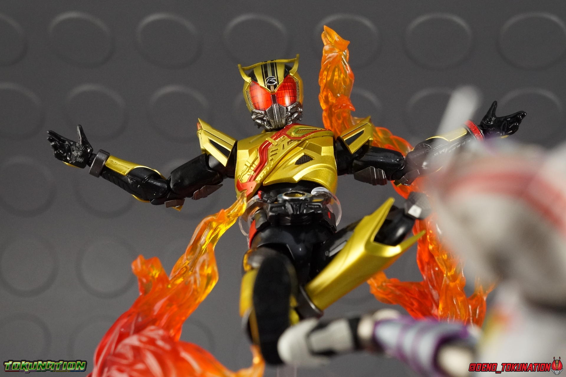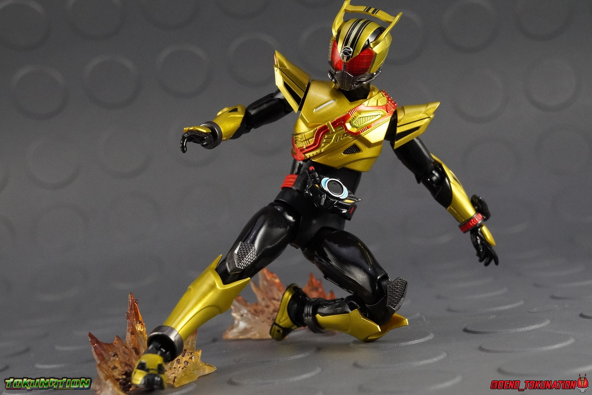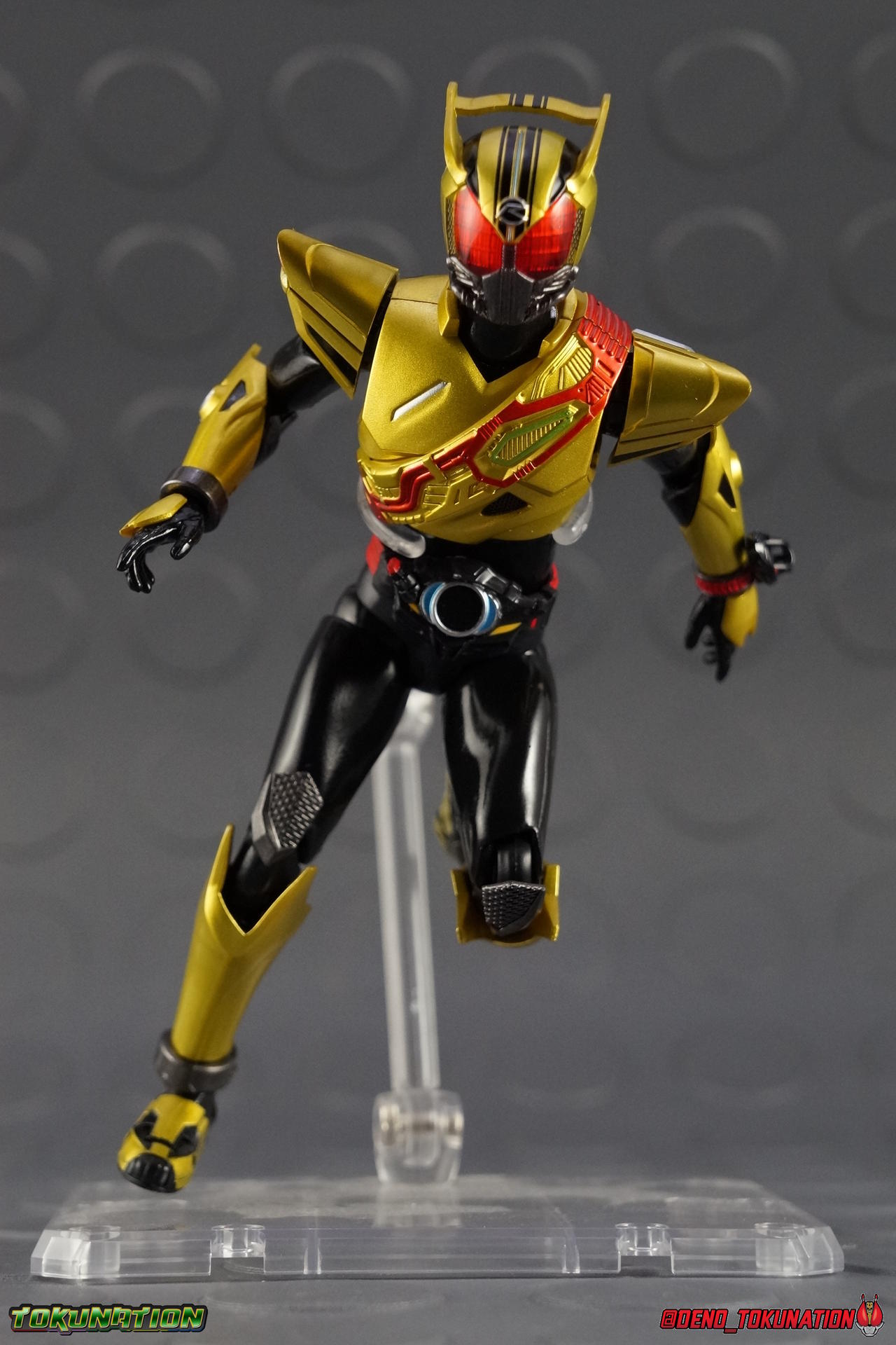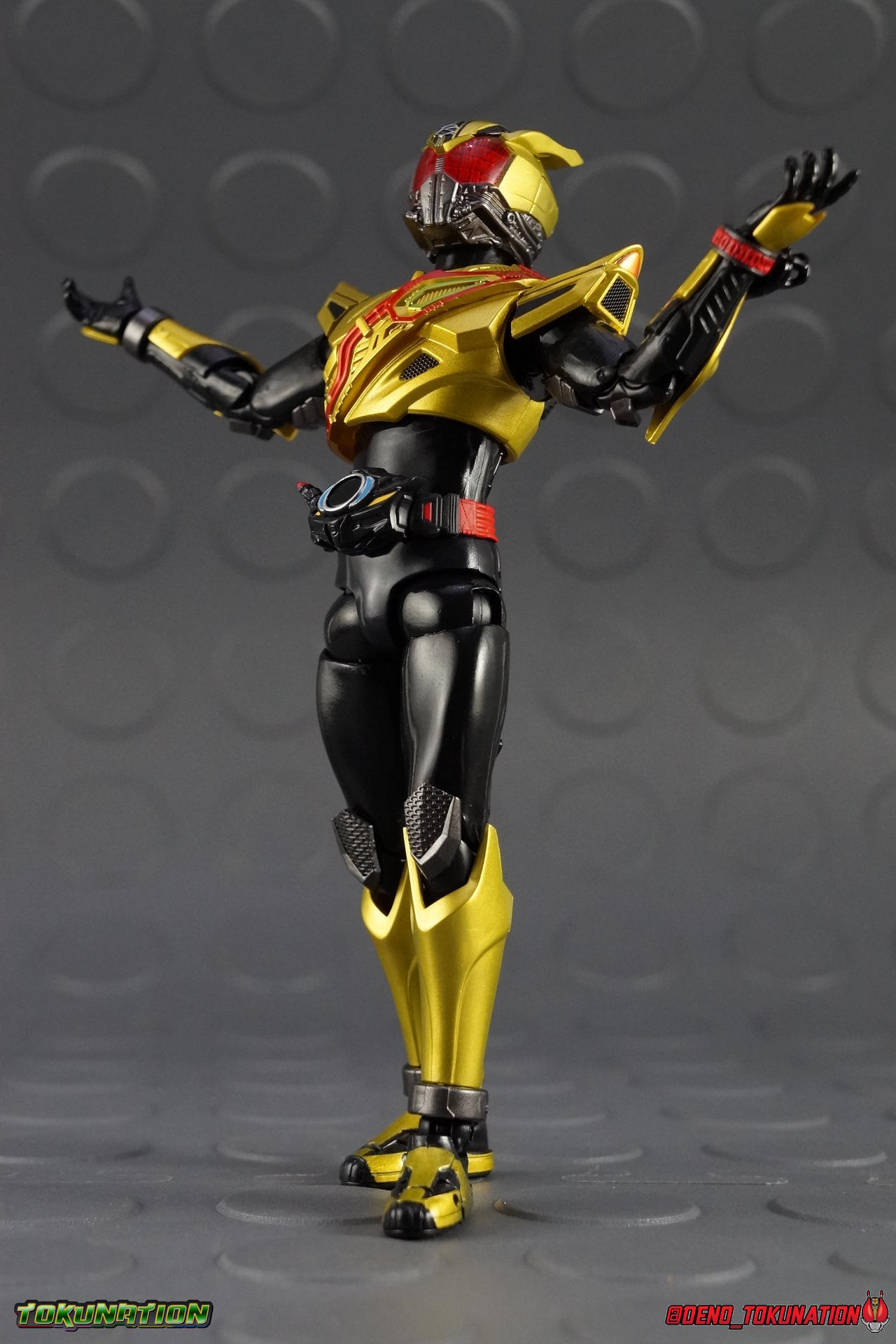 I've patiently waited for this bad boy to come in for a review and gallery and I'm overjoyed to have him now. One of my favorite hero designs ever redone as an irredeemably, purely evil, villain? Sweet sweet gold paint? AND it was a retail release?? You better believe I'm excited to share this gallery of S.H. Figuarts Kamen Rider Gold Drive! Packaging The last 7 releases from Kamen Rider Drive came out between October 2015 & July 2016, and they were all web exclusives. None featured window boxes due to their web exclusive nature. But bucking that trend after a very long stretch is Gold Drive, which is a retail release! Gold Drive employs the exact same packaging as the original Drive Type Speed. This is a very common box design at this point, it began with Drive but has actually been carried over to Ghost as well, so no real surprises. Just new stock photos and a Banno Tablet face on the top right corner of the box. The box obviously romanizes the name as "Gord Drive" but given his color scheme and context we obviously know the proper name is Gold Drive. R's & L's are often flipped when going from Japanese to English. Main Figure This figure is a straight up repaint of the Drive Type Speed Mold but with a Proto-Speed Tire/Archetype Gear from Kamen Rider Proto-Drive. As such this is our 3rd outing with this mold, and a 4th is on the way with the soon to be released Zero Drive. At this point if you've handled any version of the Type Speed/Proto/Gold/Zero body, you know what to expect, excellence. Once again I want to emphasize that the Drive Type Speed mold is one of my all time favorite S.H. Figuarts. It's a fantastic figure, so by extension Gold Drive is fantastic. He's primarily painted in a gorgeous shiny gold finish that really stands out from the glossy black parts of his undersuit. He stands out very much in any display, in a good way. The paints apps on this release are just as strong as the previous 2 iterations of the mold, aside from one minor complaint, the tire. The "Archetype Gear" as it was know on occasion has some great detailing and the gold paint makes it all really pop. But the front of the tire should have a more significant green detail on the upper right. You can see it on the figure, but its very muted. It should be bright, like almost neon green. Unlike the other versions of the mold the Banno Driver doesn't feature many paint apps, but as a mostly black repaint that's to be expected. Physically the driver is unchanged from the other versions & like them it's removable, very fitting for recreating evil Banno moments. The face of the driver itself can be removed exposing the cylindrical part that displays Banno's facial expression & technically Tire Koukans. From the ground up this figure was designed for cross compatibility with future Shift Car/Tire sets. However the Proto/Archetype tire deviates from Type Speed at this juncture. It can't be removed without some degree of customization or the possibility of damage. So still, unlike the Type Speed's which could come apart to allow for Tire exchanges, Gold Drive's tire can't. The basic structure of his body would allow for it. But the tire has been molded as one piece. I've seen plenty of pictures where people have taken the time to pry it off. I'm just not interested in damaging my figure over it. The Shift Brace on the left wrist is identical to a normal one but with no Shift Car present. Gold Drive doesn't have or need one to function. Likewise there is no Shift Car holster on the right hip like there was on Type Speed & Proto Drive. Since Banno doesn't use Shift Cars he doesn't need the holster either. These small removals don't add up to much tooling or parts cost, but I wish the accessory count could have gone up because of them. Last but not least I want to talk about Gold Drive's head. Which is again, the Type Speed head done up in brilliant gold with a blood red visor. It just looks so so good. These colors just do not disappoint, a totally heroic design with these colors just looks deliciously evil. I'd gladly take this color scheme on other riders too, like maybe Decade or Hibiki. Finally I just want to remind everyone how fantastic this figure's articulation is. It's every bit the same excellence as Dirve Type Speed & Proto-Drive. Accessories Sadly this is where Gold Drive falls massively short: 1 - Banno face plate. Granted, Banno only ever had the 1 expressionless face when he was a tablet, and that carried over to his life as a Driver. But this feels a little slim is all. You can remove the Banno Driver and swap out the standard blank black one for this. 4- sets of additional hands. That's actually double the number of hands that Drive Type Speed & Proto-Drive came with. They had 2 sets each. Gold Drive includes recolors of the hands for the Door Gun that came with Drive Type Technic as well as the Handle Sword hands that came with Drive Type Wild. These are intended to use with the weapons that the numerous Drive Mach & Chaser figures came with. But he sadly comes with no weapons of his own to hold. That's the biggest letdown of this figure. His special Gold Conversion ability allows him to steal the weapons of other riders that haven't been treated to resist it. Seeing as there were no shift cars or holsters included with this release I'd have been happy to pay extra to at least get like a Zenrin Shooter or Door Gun or just something with him. Gold Drive's whole thing is that he steals weapons. You can borrow them from other figures, but that's just not the same. I also wish he'd come with a split in half driver to replicate his death, or maybe a Banno tablet, but oh well. Final Thoughts As with any Drive release I'm really really pleased. The Type Speed mold is still the strongest of the numerous Kamen Rider Drive releases. While S.H. Figuarts Kamen Rider Gold Drive doesn't particularly build on that in any way, it still embodies the best qualities of one of my favorite figuarts. Just with a little