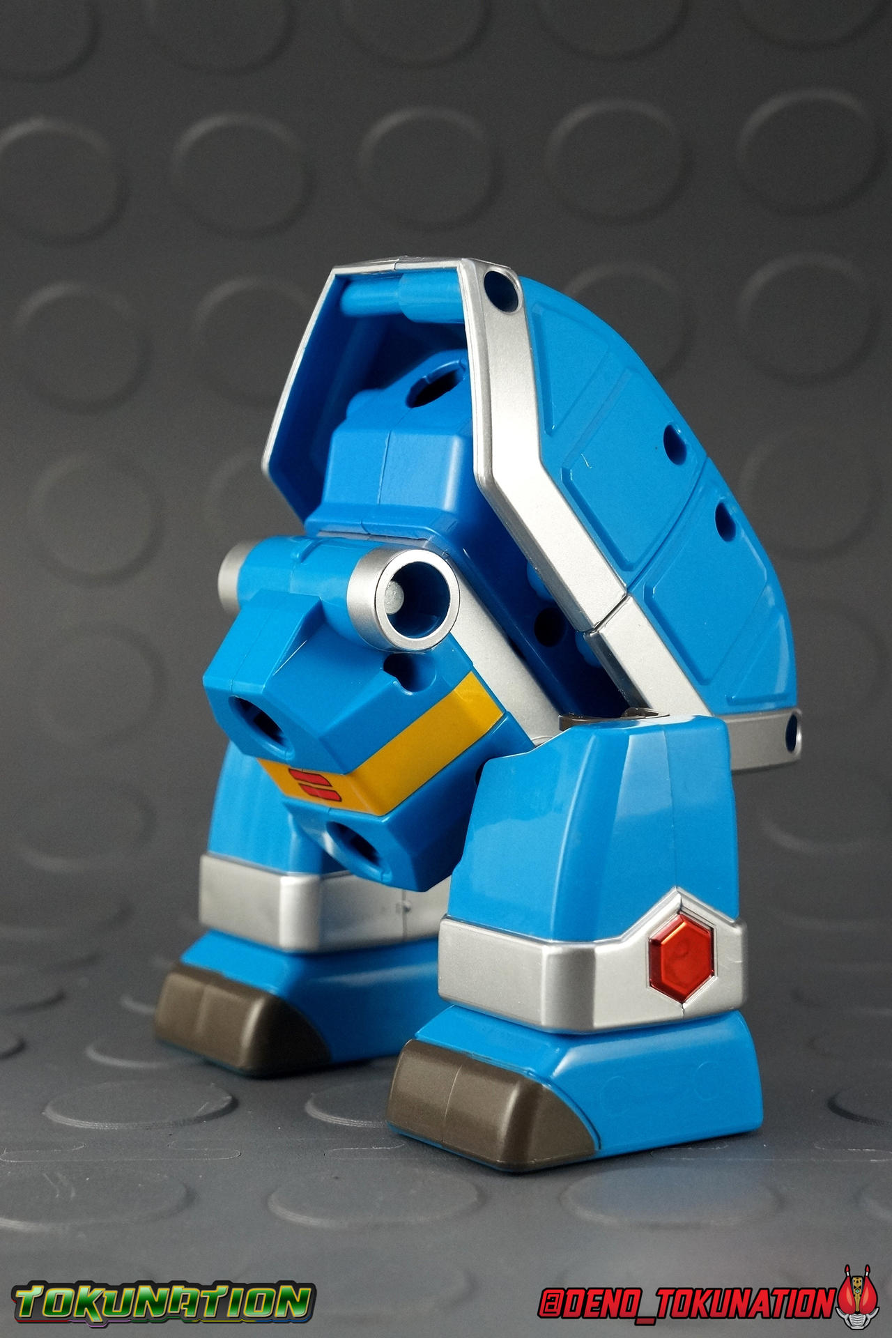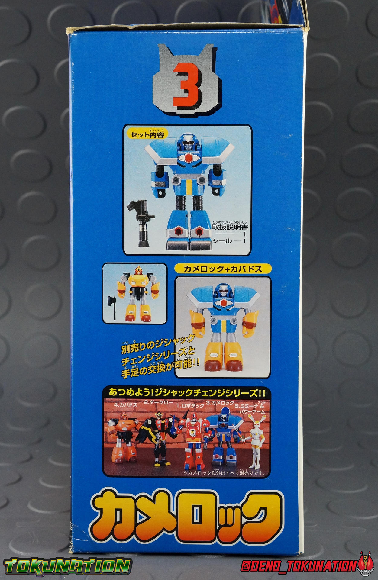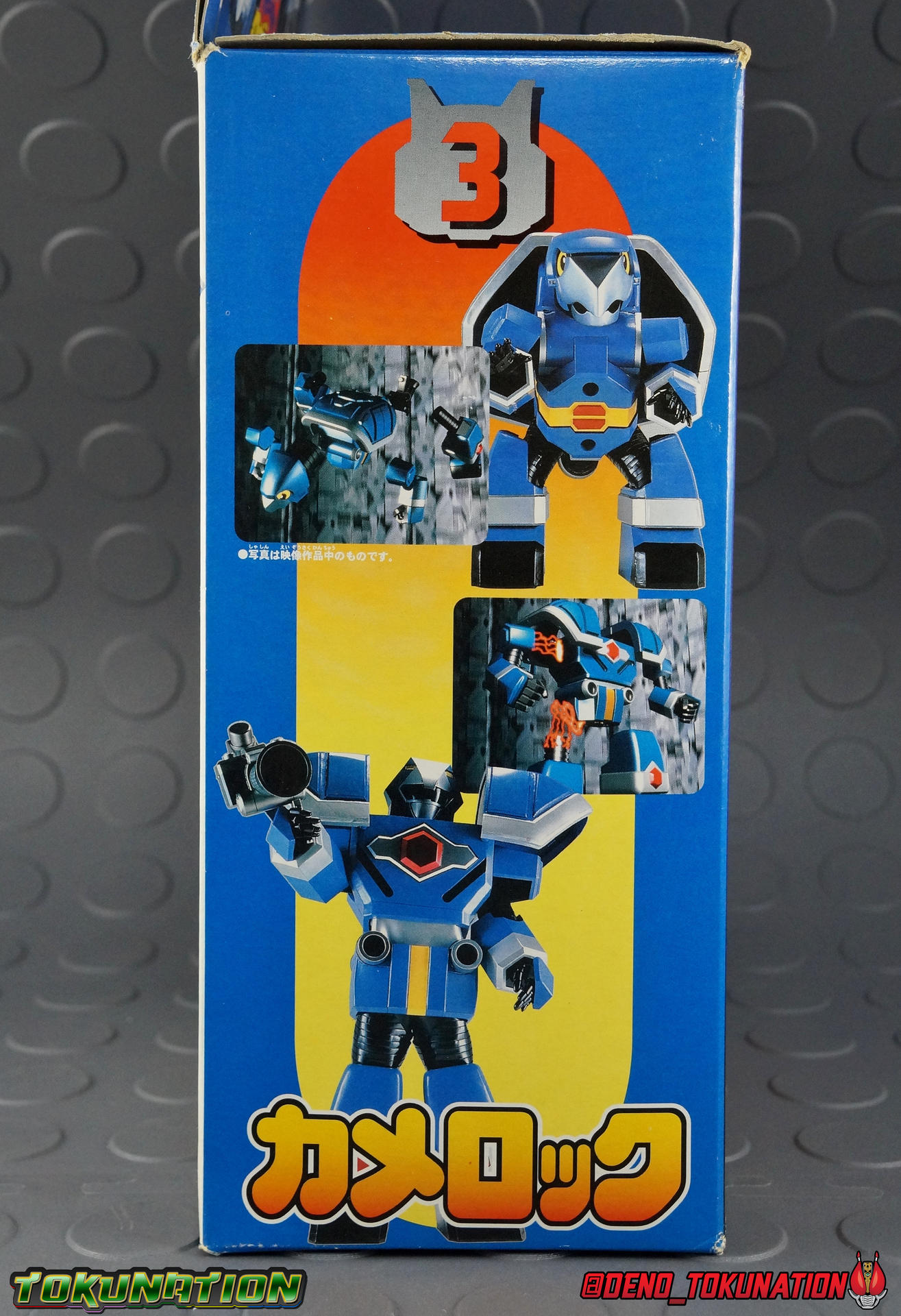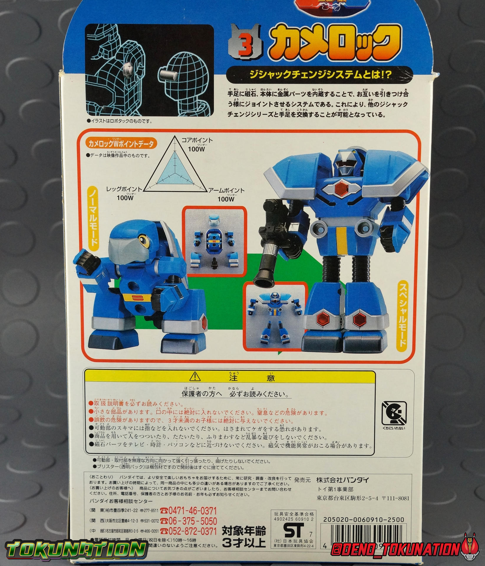 ** For a broader explanation of the series itself, feel free to read through my previous Robotack gallery linked to above. Packaging Basically we have the exact same style box & styrofoam tray that Robotack did. The only difference for Kamerock are the release number, colors, and stock photos. Just superficial stuff really. Differing from the Kabutack releases of the previous year, Magnet Change figures are larger and heftier. So the heavy duty styrofoam is welcome to support the weight. Kamerock (like all other releases in this line) comes packaged in his Super Mode. We'll take him back to Normal Mode first to get the review underway though. I should mention that also a small label sheet meant to accessorize the figure is included, though I've never actually used them. i've been waiting to have repros made for years, eventually I'll get around to it. A flyer advertising the Land Tool mail away exclusive is also included (a figure which I have). These were the good old days of toku toys though. When you collected points to mail away for new figures. Lastly a toy catalog, is included. It features contemporary toku releases from Seiju Sentai Gingaman, Tetsuwan Tantei Robotack, Ultraman Dyna, & Godzilla. Main Figure Basically this line is almost identical across the board. If you checked out my last gallery then you know that all of these figures featured a revolutionary transformation system called Magnet Change/ジシャックチェンジ. You begin with 7 components, legs arms head tail & torso. Each of the sockets on the central body has a port with a magnetic plate in it. The corresponding limbs likewise have a magnet of the opposite polarity. But to get started we'll need to remove the Super Mode head and collapse the turtle shell together. Now each of the limbs can be plugged in normally. But make sure to collapse the legs and rotate the feet the proper direction first, as well as rotating the arms. Kamerock is an upright turtle so he needs to be angled properly. His appropriately, and incredibly named gun, the Kamerazooka, will fold up to form a tail of sorts in one shoulder socket while the combo Normal/Super head will go in the other for this modes head. Kamerock Normal Mode is a short squat robot known as a Wonder Turtle type in the shows terminology. A fun and cute design that definitely played well with children in the 90's. In this form he can't do much other than rotate his arms. Which have I mentioned is incredible? There are grooves on the limbs and sockets that hold the cylinder in the shoulder in a locked position but the arms can rotate on an axis on the end. It's just a genius design. I also have to mention this figure is HEAVY. A majority of the torso is solid painted diecast metal. Imagine the difference between early G1 Transformers and current lines like Titans Return. Then you'll understand just how radically different the construction of this toyline is in comparison. To get Kamerock into Super Mode detach everything again and start fresh. Unlike Robotack the transformation isn't quite as complex, but still very fun. The legs just need to be unlocked & extended fully up. Then the toes need to be rotated pointing out the same direction as the knee pad, then just plug them into the bottom of the torso. Next pull apart the halves of the turtle shell upand diagonally until they lock securely in place. The arms can just plugged into the shoulder sockets as they don't really transform. Then attach the turtle head to the center of the back and rotate the robot mode head down into the neck cavity. Arm him with the Kamerazooka and that's Kamerock Super Mode! In this form Kamerock stands significantly taller and has some really chunky proportions, unlike Robotack, who looks generally more heroic. As with all of the other figures in this line he towers over many more modern figures and even his contemporaries. The previous years' Kabutack line was overall much smaller. But Kamerock Super Mode just looks awesome. Find me a better more awesome looking turtle robot, I challenge you! But seriously this is the figures' strongest form. Unlike Robotack who's honestly quite good in either mode, Kamerack has a mostly forgettable Normal Mode but a very nice looking Super Mode. Articulation is basically non-existent though, being limited to the elbows and some minor use in the knees. Really he's a brick, but a gorgeous, hefty, sturdy brick. Another of my favorite vintage pieces. The Magnet Change gimmick of the line also winds up on full display with these figures in their Super Modes as everyone can interchange limbs freely. I've included some shots of Kamerock's budy Robotack below to showcase how the 2 look when magnet changed. The Magnet Change gimmick is a brilliant precursor to the types of form switching that abound in tokusatsu toys today, and for me it's sorely missed. However it also doesn't work very well in any of the characters Normal Modes as you'll see below. Accessories Technically there aren't really any accessories included with Kamerock. All of his "parts" are integral to both modes. But the Kamerazooka can technically be considered one. While it's not a terribly powerful looking sidearm, it's befitting of Kamerock's Super Mode. It kind of looks like a bubble gun to me honestly. None of these figures really have true accessories but there is an accessory set with Mimeena and the Power Arms which includes weapons that can be used by any compatible figure. Final Thoughts The toyline of Tetsuwan Tantei Robotack is still one of my all time favorites. The engineering of Magnet Change gimmick still blows me away. And while Kamerock may not be as complex or satisfying as the figure that started the line, he's more than deserving of a spot in your collection. This line is fantastic.