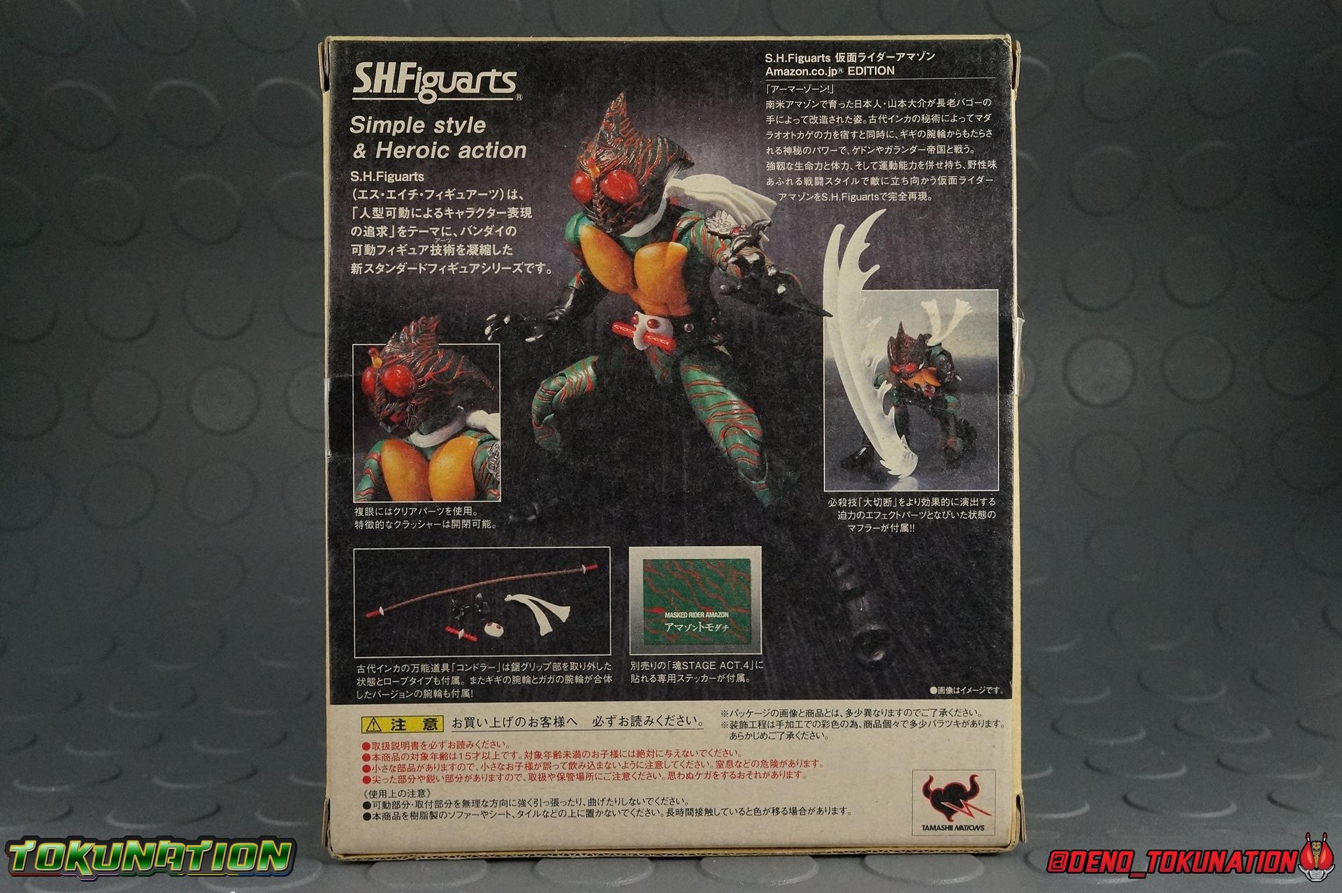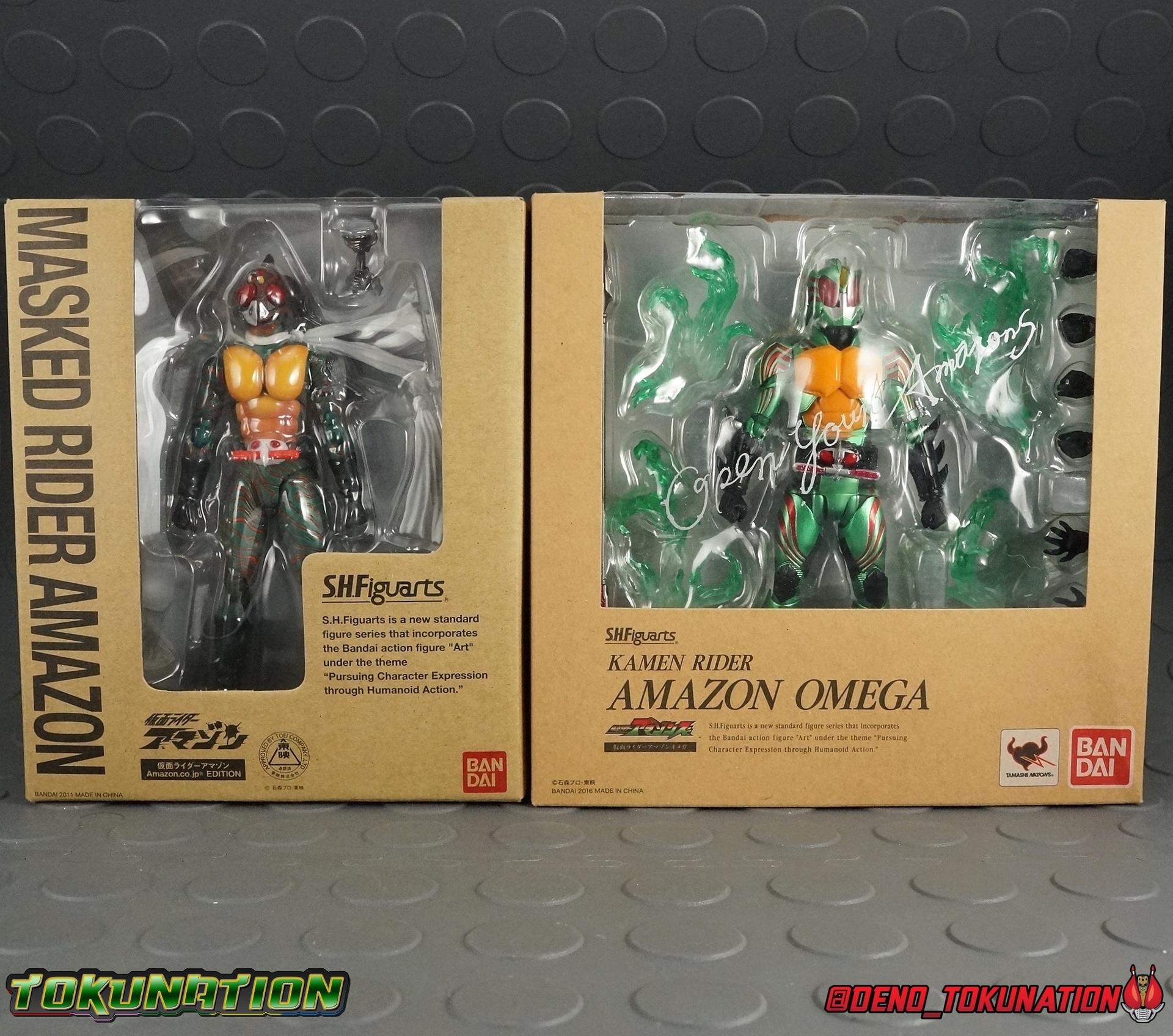 The original violent hero rounds out our line up of galleries for this year! You may be more familiar with the name Amazon because of the recent Super Hero Year mini-series Kamen Rider Amazons. A drastically altered idea on what being a Kamen Rider, and specifically an Amazon, is. This reboot of the 1974 series Kamen Rider Amazon has been critically acclaimed by many rider fans, both old & new. And of course it's success has lead to numerous collector products being manufactured. This month saw the release of the first high end figure from the show with S.H. Figuarts Kamen Rider Amazon Omega. But we simply couldn't review him yet, not until we took a look back at his Showa predecessor with the original S.H. Figuarts Kamen Rider Amazon (Amazon JP Edition)! The original Amazon was himself known for some particularly brutal moments in his own series, and at the time his series was quite a departure from what Kamen Rider had been up to that point. As a bit of an older release I'm sure many of you are interested to see how this figuart stacks up with more modern releases as well. Read on to find out how! Packaging As the first (and for a long time only) Amazon Japan edition figuart, Amazon came in a special box that echoed Amazon's actual brown shipping boxes. This corrugated brown box was pretty unique for a long time, but with Amazon.JP exclusive versions of both the new Amazon Alpha & Omega, Showa Amazon has to share the spotlight now. As is it was an interesting idea for packaging, and winds up being particularly sturdy as well. This type of box is much stronger than your typical figuarts box would be. Main Figure The original Kamen Rider Amazon has made multiple appearances throughout the decades since his 1974 inception. Whether it be for a brief cameo in JAKQ VS Goranger or appearances in Skyrider, Black RX, or any of the numerous summer films of the last decade. Frankly between those early Showa appearances his costume changed a decent amount as well. You'll see some inconsistency in coloring and the fabric used to construct his suit in various appearances, as with most early Kamen Riders. Simply because these suits would degrade over time. This figuart represents the best approximation of what Amazon should look like, and how he looks in basically all of his modern appearances as well. Kicking things off let's just talk about the fantastic way the "stripes" on Amazon are handled. In many cases you'd see this sort of thing simply painted on. In Amazon's case every single line is sculpted into the body then painted giving it a much more real and 3-dimensional look. If they had just painted these stripes on then Bandai could be forgiven as that's basically the way the original suit functioned, but this is a really welcome detail on the figuart. And speaking of welcome details, watch out for those arms and ankle spikes, they're actually quite sharp! Getting into some of the articulation, Amazon actually gets pretty high marks from me. He has fairly un-obstructed hips, nice clean ankle joints, perfect knees, wide ranging shoulders and wrists, and a good break up between the two torso sections. However, over time this figures ankles have loosened considerably making every pose a balancing act. Simultaneously the hips have stiffened over time, I'm at a point now where I required an application of shock oil to free up the right hip, which was basically frozen in place completely. The only other problem areas for articulation are the neck, which impacts the muffler enough to be a bother. And the mouth on Amazon's helmet. Which is really the best part about this figure. It's hinged enough to allow him to look bestial and wild from certain angles. But honestly most of the time he comes off just looking, happy? The head itself features more of the wonderful sculpted in stripes and is probably the one feature of the figure that most resembles an actual prop from the show. It just looks dead on. The GiGi armlet on his left arm is already on there for you straight out of the box. It has a strong defined sculpt with a couple of minor but well placed paint apps. Though removing it to use the alternate included armlet can be a pain. I should mention that one totally bizarre feature Amazon has is articulated pecs. For some reason I've yet to comprehend, his pecs can rotate. They serve no genuine purpose but there they are. Use them as you will! All in all for a figure released 5 years ago now, Kamen Rider Amazon is still a fantastic release. Later end Showa releases really started pulling it out compared to earlier figures in the line. Amazon is a great example of where engineering went in the last few years for this toyline. Figures like this are the missing link between the old era of figuarts, and the renewal/S.S. era. Accessories Amazon actually comes with almost everything he conceivably should: 2.5 - sets of additional hands. Thankfully these covers the basics for what Amazon needs. Holding things hands, and some nice splayed out wild hands for his more berserker tendencies. 1 - scarf/muffler. Amazon comes with the windswept version already attached in box. The additional one is of the more standard flat variety and is good for rider line-ups, things that don't require dynamic action. Stuff like that. 1 - GiGi Armlet. The armlet given to Daisuke in the first episode of the series, allowing for his biological transformation into Amazon. This armlet is already attached to Amazon in package. It's the basis for the Amazons Register from the recent Amazons reboot mini-series. 1 - Combined GiGi/GaGa Armlet. The twin ancient Incan artifact to Amazon's GiGi Armlet is the GaGa. When the two are combined the user attains mastery over ancient Incan science & power, to rule the world. In the final episode of the series these 2 armlet's combined, the figuarts don't really do this. Instead Amazon comes with the GiGi Armlet on him in package already, the alternate included accessory is the already combined GiGi
