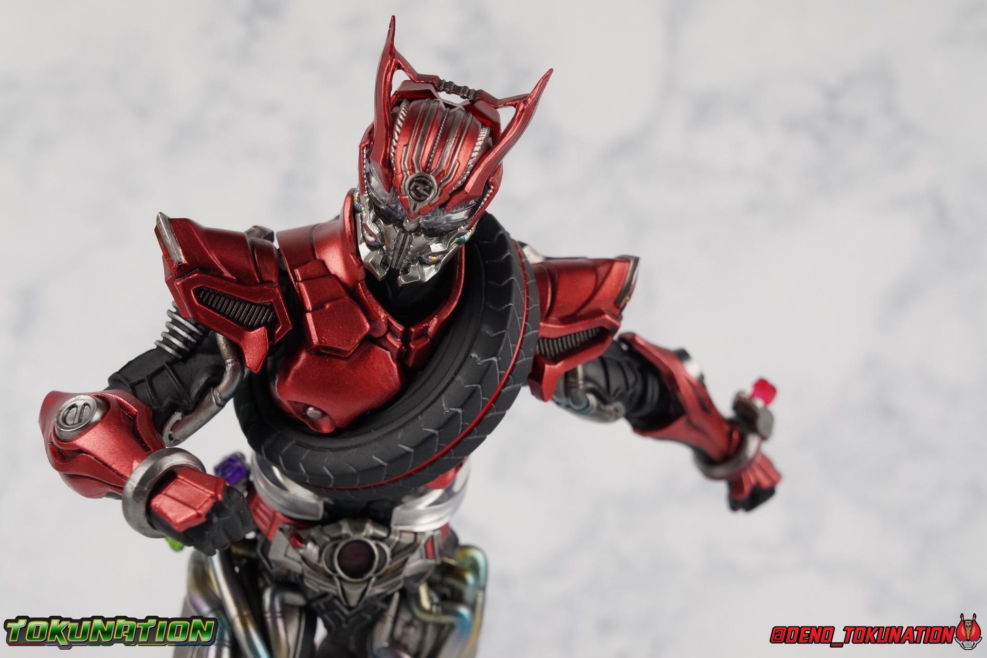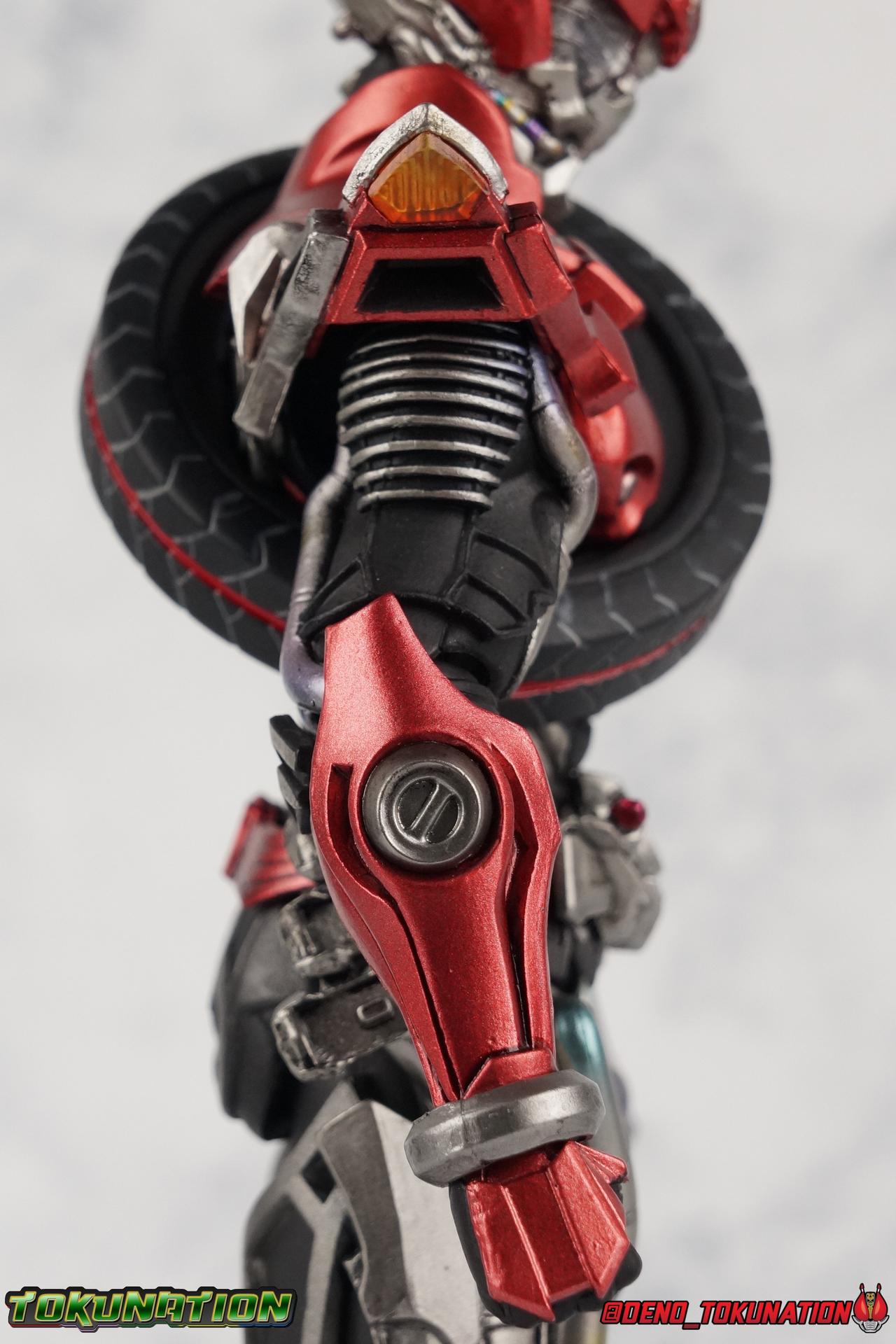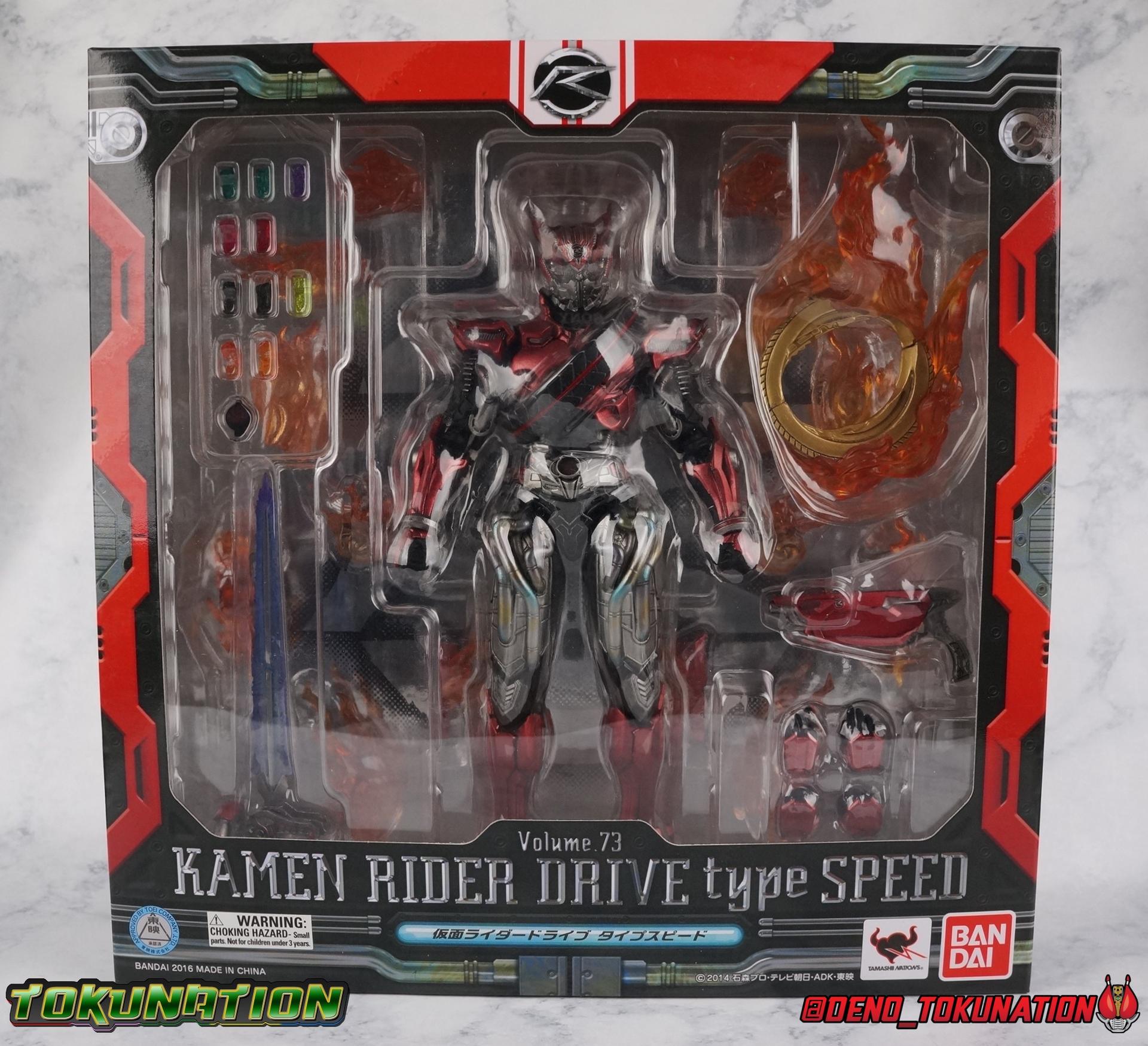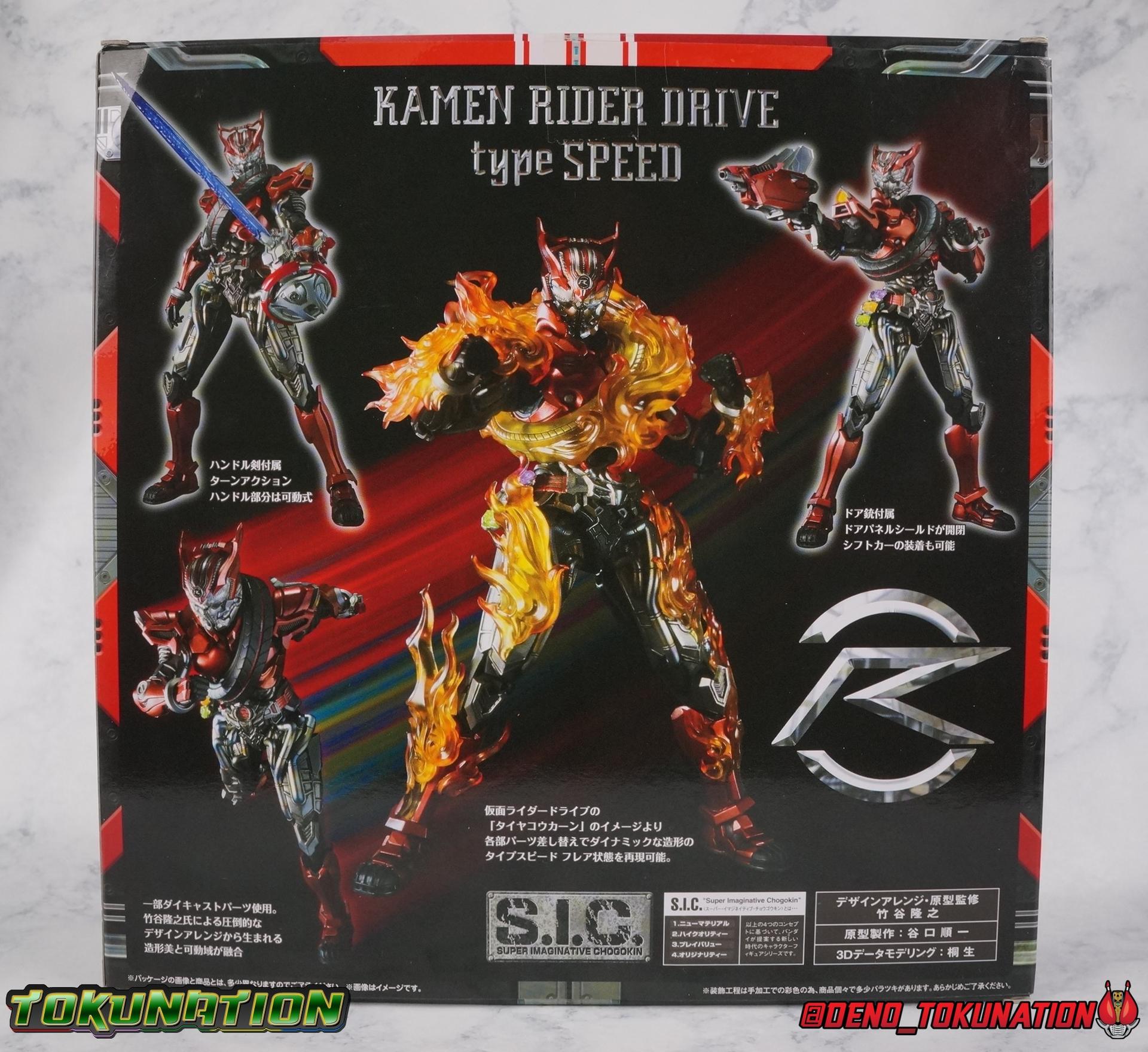 Normally I tend to limit myself to one scale of collecting for a particular show. I stick to 1/12 stuff, most often S.H. Figuarts. or gimmick and vintage figures around that scale. But every once in a while a show or figure grabs me enough that I do want to own it in a different size or line. Today's example of my weakness is brought to you by Kamen Rider Drive! I've never been huge into collecting S.I.C. figures, but S.I.C. Kamen Rider Drive Type Speed may finally be changing my tastes a little. Check out a full gallery & review below! Packaging As with most all modern S.I.C.'s, Drive Type Speed comes in a really elaborate and detailed window style box. The front actually looks like a stylized version of his helmet which I really dig. Obviously S.I.C.'s are fairly large, clocking in around 8", so this box is quite a bit bigger than an average figuart. And there are some fantastic stock photos on the exterior. They don't quite do this figure justice. Also the cardboard insert for the box is a fantastic reflective chrome with Drive's "R" emblem on it. It works great as a photo backdrop! Main Figure One thing I'll always give the S.I.C. toyline, details are key. And that's almost entirely thanks to the amazing man behind the line, Takeyuki Takeya. A brilliant artist with a mind for elaborate details and the meshing of organic and technological detailing. This release is doubly impressive because Takeya himself designed all the Roidmudes for Kamen Rider Drive. It was the first Kamen Rider Series to feature villains to be entirely designed by him. Though the riders themselves were not. S.I.C. Drive however, as with practically every other S.I.C. figure, was. This is Takeya taking a crack at Drive with his own unique style of detail and flourish. And it has been wonderfully executed. Though there are some minor caveats. The way the ball joints operate in the feet really irks me. They're on hinges but the ball also rotates 360, so it's very easy to get them off center, then Drive's feet won't sit flat at the same angle. The double jointed knees are astounding though. The entire calve can rest on the back of the thigh. That's just crazy. The hips can actually rotate out much further than I would have assumed too, those pipes on the thighs don't get in the way too much for outward movement, but they aren't exactly perfect either. They do pop off easily due to their design. And actually the hips can pull down a decent amount out of the waist so forward and back movement is remarkably good. This Drive can sit properly as though there were a Tridoron scaled to him. However he cant really get down on one knee to kneel, which is sort of my benchmark for figure posability. The upper body really only has one big thing that bugs me. And that's how loosely the Drive Driver sits on the belt itself. It's quite easy to pop off, the belt is pretty loose around the waist already, which normally I like because it frees up movement. But in this case it makes it easier to knock the driver off, that coupled with the soft plastic of the belt is obviously a great recipe for losing small parts. The lower torso also moves quite freely and is made of a soft plastic, though sometimes you can see straight through a hole in the waist because of the way it moves. The upper torso has some of the best asymmetrical detailing I've ever seen, I really love it. Taking Drive's tire sash to a new level. The way the ridges on the lower right & upper left corner of the chest compliment each other is gorgeous. And I love the added detail of a neck collar around the right side of Drive's head. It really drives (pun!) home the 'bisected by a tire idea' of his design. It's as though he was a totally normal rider then this thing just smashed it's way into the design and the suit just accommodated. This is why I love Takeya's work. The arms have some pretty standard movement, which is to say the shoulder pads keep them from doing much and the elbows can do about a 90 degree angle. The wrists don't have a ton of clearance because of how they sit flush with the wrist pads but you can get some use out of them. And lastly the head. Wow that just gorgeous brilliant detailed head. This take on the design easily looks like it could have fit in with the Roidmudes of the series. It's heroic, but it looks so, sinister? I love it. And it actually has plenty of room to move. Bravo on this design. This figure just rocks it at every level. It's just a gorgeous re-design of a suit that I already loved immensely. S.I.C. Kamen Rider Drive Type Speed gets the best of both worlds in it's first outing with this line. Hopefully S.I.C. Mashin Chaser & Heart can live up to this standard as well! Accessories As with most S.I.C.'s Drive is loaded up! 1 - Handle Sword. This version of the handle sword is quite the detailed departure from the figuart. As with everything else about this figure it takes the car aesthetic to the extreme. I love it. It can accept Shift Cars in a similar fashion to the S.H. Figuarts release. 1 - Door Gun. While the Door Gun may not look as radically different as the normal version it's still a great looking weapon that compliments Drive's new deep details very well. It can accept Shift Cars in a similar fashion to the S.H. Figuarts release and has an opening door as well. 1 - Max Flare Tire. This giant hunk of plastic can replace the standard Type Speed tire in much the same way as the figuart. It comes apart in sections to snap over the chest. In the case of this one the flame effects are molded onto the tire so they aren't removable. They are also totally awesome. 1 - Max Flare belt read out. This replaces Mr. Belt's standard face. It works basically just like the SHF, take the driver off and replace the plate. 3 - sets of hands. 1 open pair, 1 set for holding the gun, 1 set for holding the sword. I am a bit disappointed that he doesn't have a pair of relaxed open hands, but oh well. 6 - Shift Cars. That's 1 each of Midnight Shadow, 
