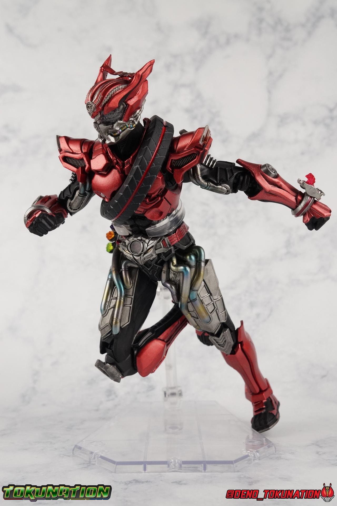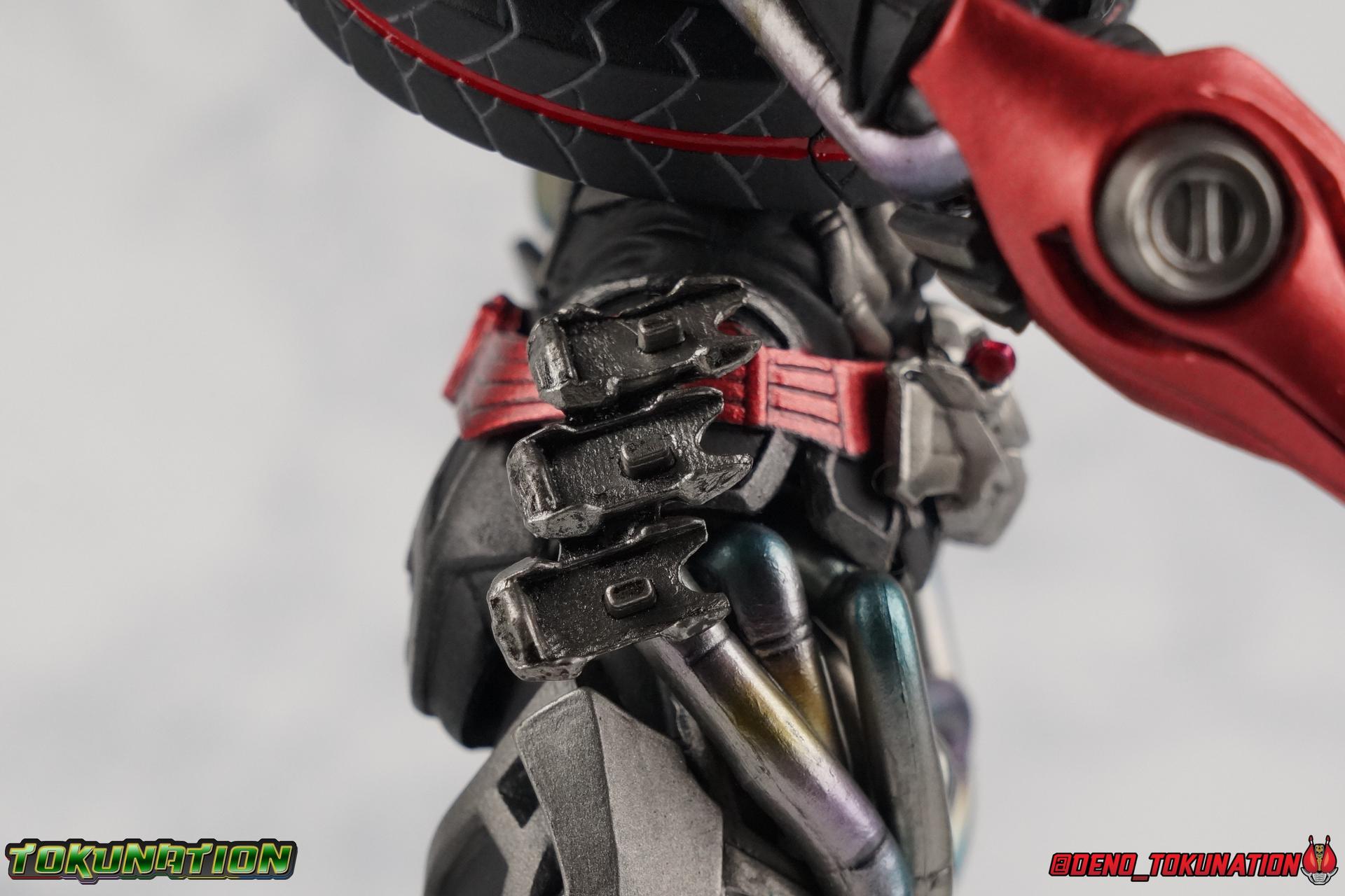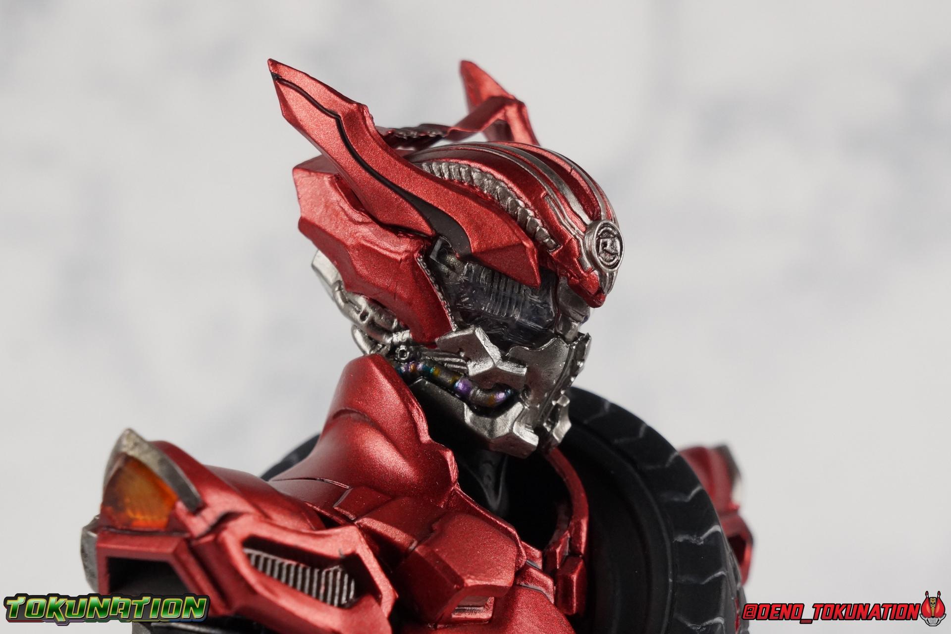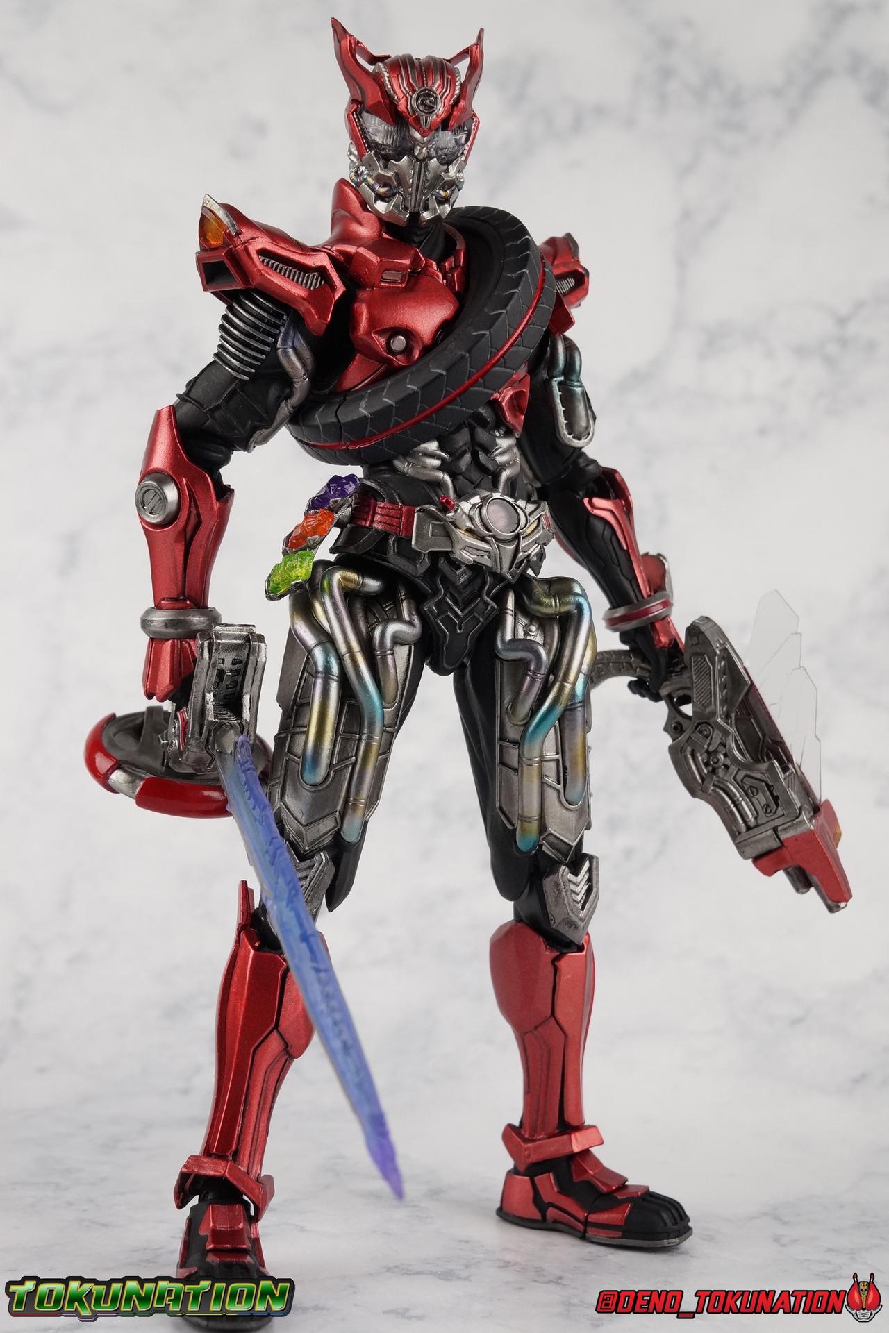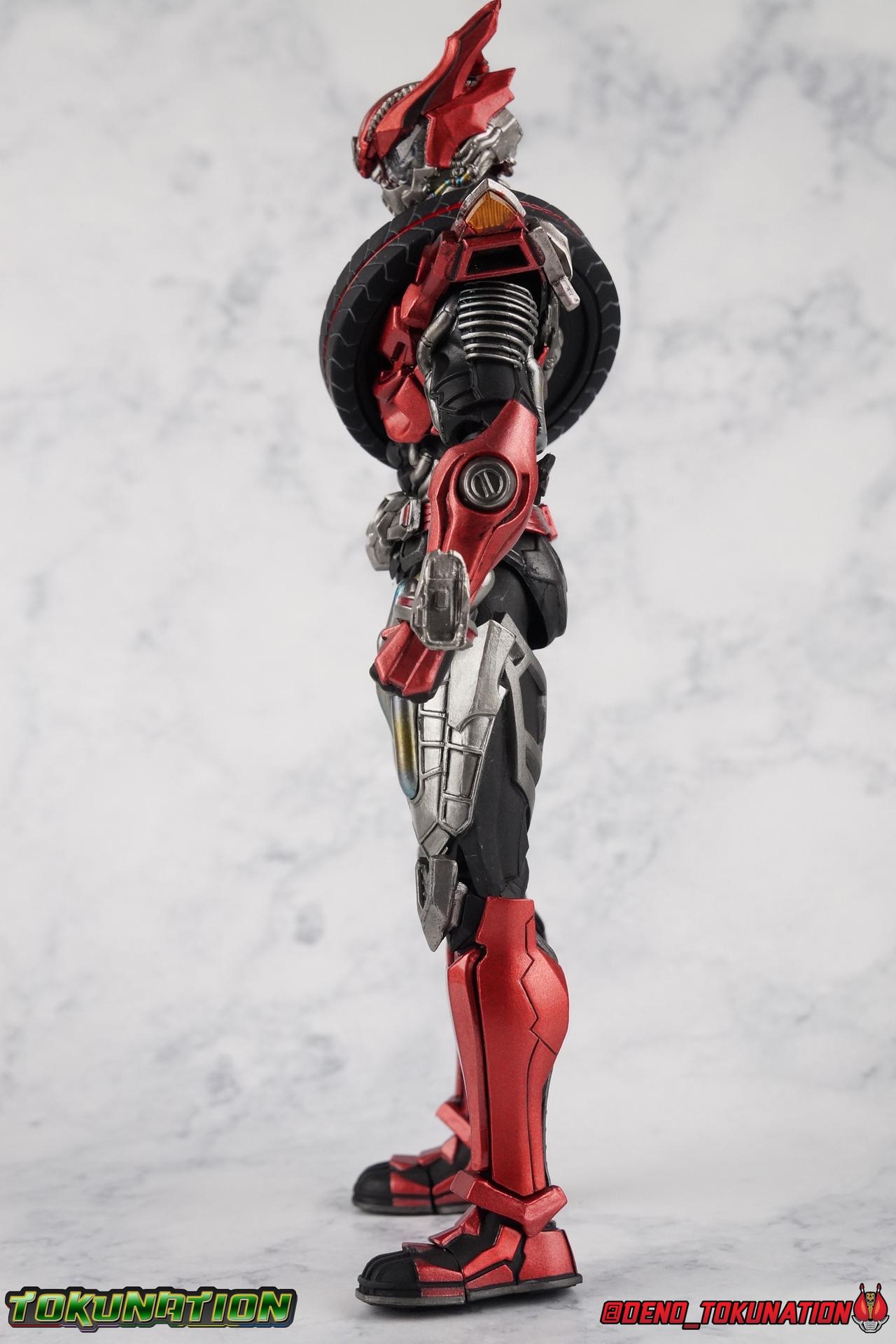 Normally I tend to limit myself to one scale of collecting for a particular show. I stick to 1/12 stuff, most often S.H. Figuarts. or gimmick and vintage figures around that scale. But every once in a while a show or figure grabs me enough that I do want to own it in a different size or line. Today's example of my weakness is brought to you by Kamen Rider Drive! I've never been huge into collecting S.I.C. figures, but S.I.C. Kamen Rider Drive Type Speed may finally be changing my tastes a little. Check out a full gallery & review below! Packaging As with most all modern S.I.C.'s, Drive Type Speed comes in a really elaborate and detailed window style box. The front actually looks like a stylized version of his helmet which I really dig. Obviously S.I.C.'s are fairly large, clocking in around 8", so this box is quite a bit bigger than an average figuart. And there are some fantastic stock photos on the exterior. They don't quite do this figure justice. Also the cardboard insert for the box is a fantastic reflective chrome with Drive's "R" emblem on it. It works great as a photo backdrop! Main Figure One thing I'll always give the S.I.C. toyline, details are key. And that's almost entirely thanks to the amazing man behind the line, Takeyuki Takeya. A brilliant artist with a mind for elaborate details and the meshing of organic and technological detailing. This release is doubly impressive because Takeya himself designed all the Roidmudes for Kamen Rider Drive. It was the first Kamen Rider Series to feature villains to be entirely designed by him. Though the riders themselves were not. S.I.C. Drive however, as with practically every other S.I.C. figure, was. This is Takeya taking a crack at Drive with his own unique style of detail and flourish. And it has been wonderfully executed. Though there are some minor caveats. The way the ball joints operate in the feet really irks me. They're on hinges but the ball also rotates 360, so it's very easy to get them off center, then Drive's feet won't sit flat at the same angle. The double jointed knees are astounding though. The entire calve can rest on the back of the thigh. That's just crazy. The hips can actually rotate out much further than I would have assumed too, those pipes on the thighs don't get in the way too much for outward movement, but they aren't exactly perfect either. They do pop off easily due to their design. And actually the hips can pull down a decent amount out of the waist so forward and back movement is remarkably good. This Drive can sit properly as though there were a Tridoron scaled to him. However he cant really get down on one knee to kneel, which is sort of my benchmark for figure posability. The upper body really only has one big thing that bugs me. And that's how loosely the Drive Driver sits on the belt itself. It's quite easy to pop off, the belt is pretty loose around the waist already, which normally I like because it frees up movement. But in this case it makes it easier to knock the driver off, that coupled with the soft plastic of the belt is obviously a great recipe for losing small parts. The lower torso also moves quite freely and is made of a soft plastic, though sometimes you can see straight through a hole in the waist because of the way it moves. The upper torso has some of the best asymmetrical detailing I've ever seen, I really love it. Taking Drive's tire sash to a new level. The way the ridges on the lower right & upper left corner of the chest compliment each other is gorgeous. And I love the added detail of a neck collar around the right side of Drive's head. It really drives (pun!) home the 'bisected by a tire idea' of his design. It's as though he was a totally normal rider then this thing just smashed it's way into the design and the suit just accommodated. This is why I love Takeya's work. The arms have some pretty standard movement, which is to say the shoulder pads keep them from doing much and the elbows can do about a 90 degree angle. The wrists don't have a ton of clearance because of how they sit flush with the wrist pads but you can get some use out of them. And lastly the head. Wow that just gorgeous brilliant detailed head. This take on the design easily looks like it could have fit in with the Roidmudes of the series. It's heroic, but it looks so, sinister? I love it. And it actually has plenty of room to move. Bravo on this design. This figure just rocks it at every level. It's just a gorgeous re-design of a suit that I already loved immensely. S.I.C. Kamen Rider Drive Type Speed gets the best of both worlds in it's first outing with this line. Hopefully S.I.C. Mashin Chaser & Heart can live up to this standard as well! Accessories As with most S.I.C.'s Drive is loaded up! 1 - Handle Sword. This version of the handle sword is quite the detailed departure from the figuart. As with everything else about this figure it takes the car aesthetic to the extreme. I love it. It can accept Shift Cars in a similar fashion to the S.H. Figuarts release. 1 - Door Gun. While the Door Gun may not look as radically different as the normal version it's still a great looking weapon that compliments Drive's new deep details very well. It can accept Shift Cars in a similar fashion to the S.H. Figuarts release and has an opening door as well. 1 - Max Flare Tire. This giant hunk of plastic can replace the standard Type Speed tire in much the same way as the figuart. It comes apart in sections to snap over the chest. In the case of this one the flame effects are molded onto the tire so they aren't removable. They are also totally awesome. 1 - Max Flare belt read out. This replaces Mr. Belt's standard face. It works basically just like the SHF, take the driver off and replace the plate. 3 - sets of hands. 1 open pair, 1 set for holding the gun, 1 set for holding the sword. I am a bit disappointed that he doesn't have a pair of relaxed open hands, but oh well. 6 - Shift Cars. That's 1 each of Midnight Shadow, 