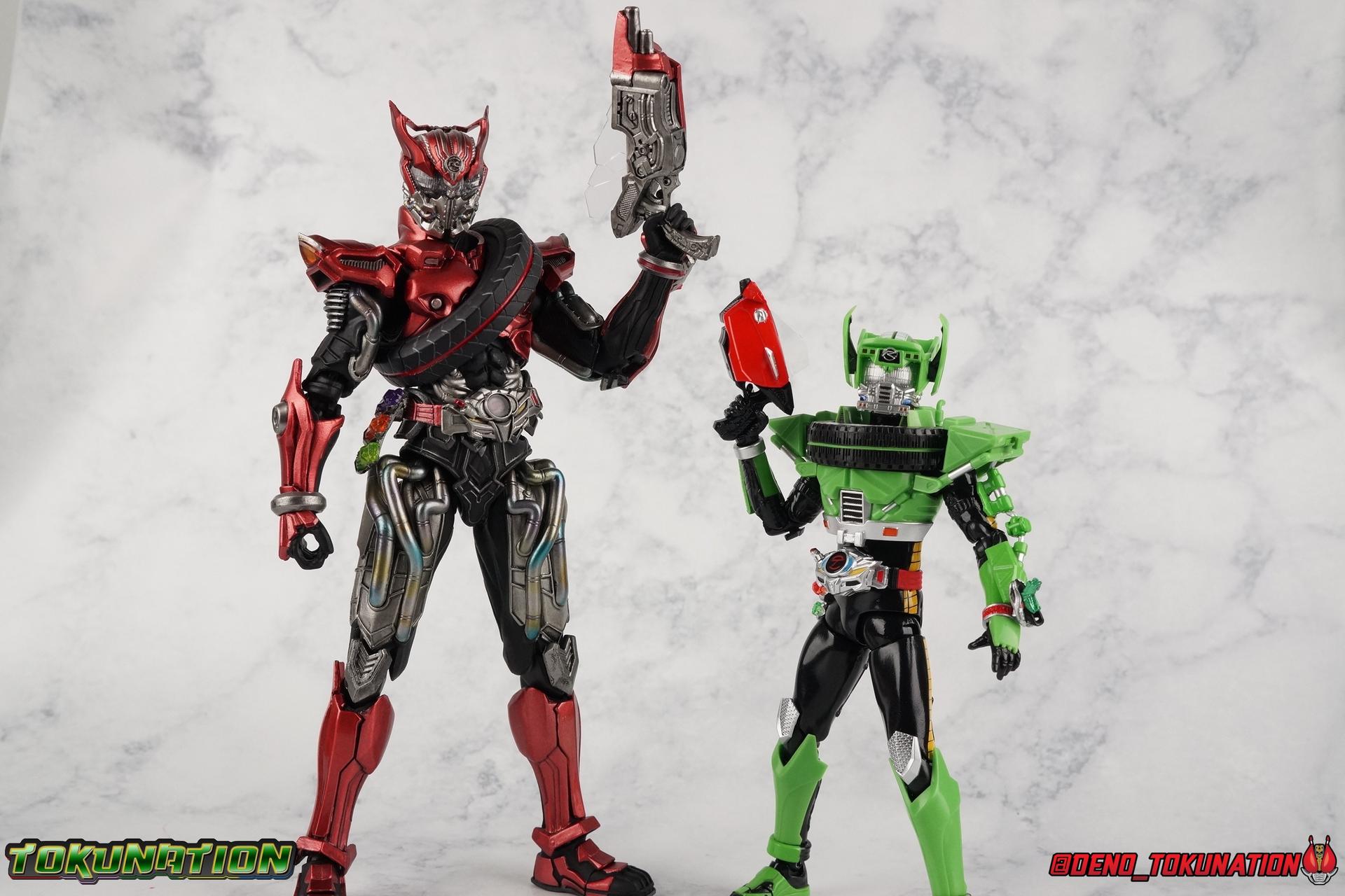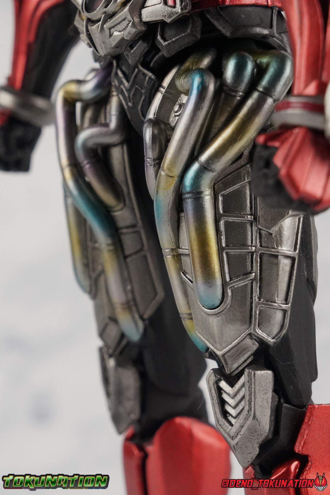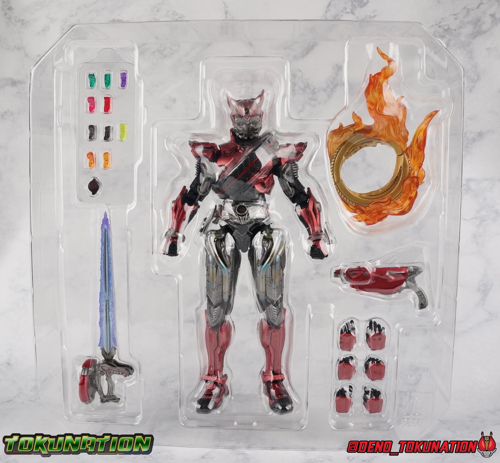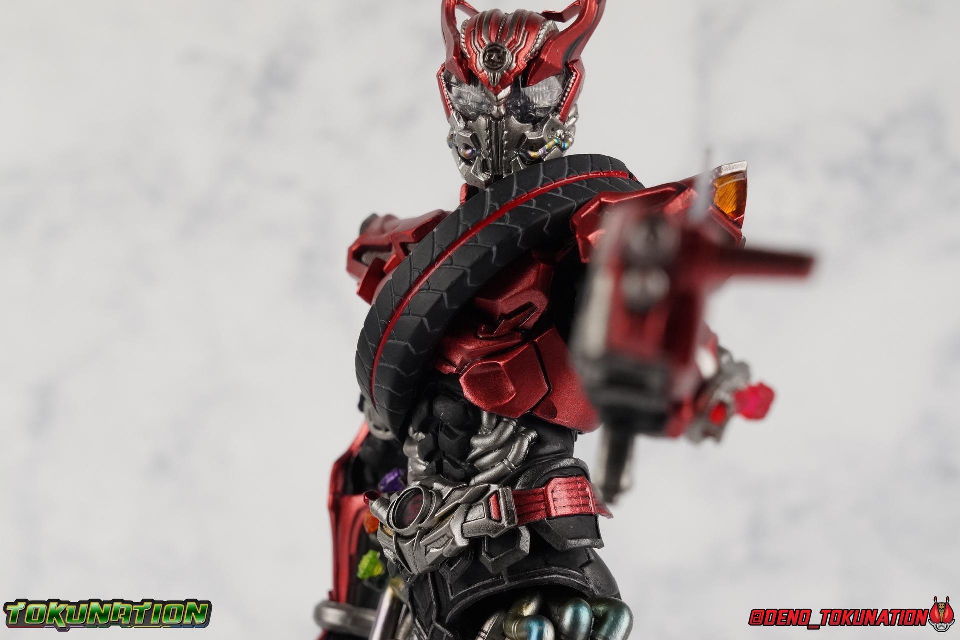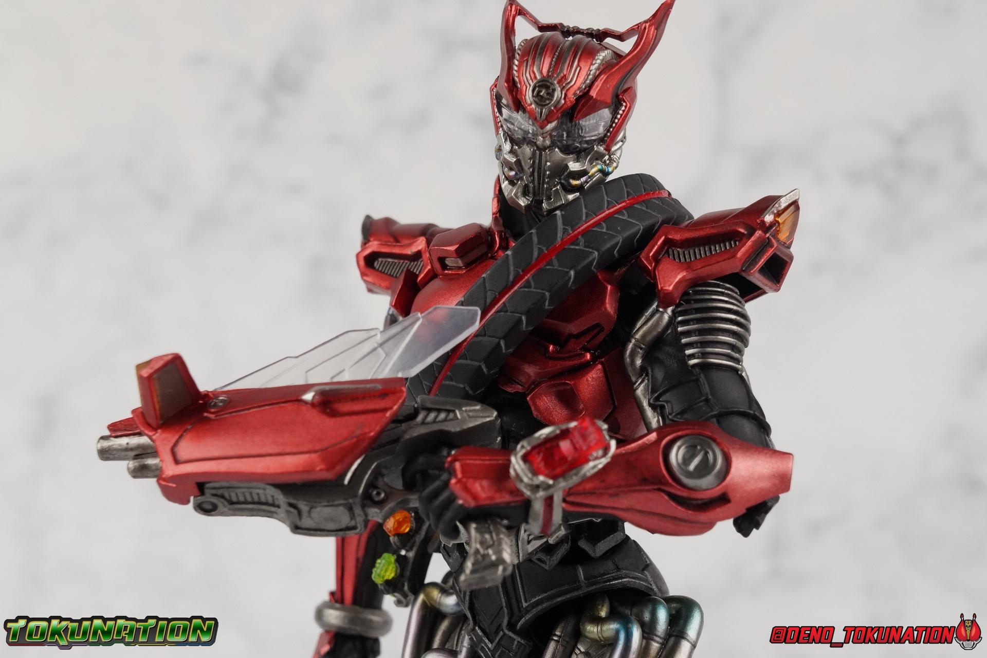 Normally I tend to limit myself to one scale of collecting for a particular show. I stick to 1/12 stuff, most often S.H. Figuarts. or gimmick and vintage figures around that scale. But every once in a while a show or figure grabs me enough that I do want to own it in a different size or line. Today's example of my weakness is brought to you by Kamen Rider Drive! I've never been huge into collecting S.I.C. figures, but S.I.C. Kamen Rider Drive Type Speed may finally be changing my tastes a little. Check out a full gallery & review below! Packaging As with most all modern S.I.C.'s, Drive Type Speed comes in a really elaborate and detailed window style box. The front actually looks like a stylized version of his helmet which I really dig. Obviously S.I.C.'s are fairly large, clocking in around 8", so this box is quite a bit bigger than an average figuart. And there are some fantastic stock photos on the exterior. They don't quite do this figure justice. Also the cardboard insert for the box is a fantastic reflective chrome with Drive's "R" emblem on it. It works great as a photo backdrop! Main Figure One thing I'll always give the S.I.C. toyline, details are key. And that's almost entirely thanks to the amazing man behind the line, Takeyuki Takeya. A brilliant artist with a mind for elaborate details and the meshing of organic and technological detailing. This release is doubly impressive because Takeya himself designed all the Roidmudes for Kamen Rider Drive. It was the first Kamen Rider Series to feature villains to be entirely designed by him. Though the riders themselves were not. S.I.C. Drive however, as with practically every other S.I.C. figure, was. This is Takeya taking a crack at Drive with his own unique style of detail and flourish. And it has been wonderfully executed. Though there are some minor caveats. The way the ball joints operate in the feet really irks me. They're on hinges but the ball also rotates 360, so it's very easy to get them off center, then Drive's feet won't sit flat at the same angle. The double jointed knees are astounding though. The entire calve can rest on the back of the thigh. That's just crazy. The hips can actually rotate out much further than I would have assumed too, those pipes on the thighs don't get in the way too much for outward movement, but they aren't exactly perfect either. They do pop off easily due to their design. And actually the hips can pull down a decent amount out of the waist so forward and back movement is remarkably good. This Drive can sit properly as though there were a Tridoron scaled to him. However he cant really get down on one knee to kneel, which is sort of my benchmark for figure posability. The upper body really only has one big thing that bugs me. And that's how loosely the Drive Driver sits on the belt itself. It's quite easy to pop off, the belt is pretty loose around the waist already, which normally I like because it frees up movement. But in this case it makes it easier to knock the driver off, that coupled with the soft plastic of the belt is obviously a great recipe for losing small parts. The lower torso also moves quite freely and is made of a soft plastic, though sometimes you can see straight through a hole in the waist because of the way it moves. The upper torso has some of the best asymmetrical detailing I've ever seen, I really love it. Taking Drive's tire sash to a new level. The way the ridges on the lower right & upper left corner of the chest compliment each other is gorgeous. And I love the added detail of a neck collar around the right side of Drive's head. It really drives (pun!) home the 'bisected by a tire idea' of his design. It's as though he was a totally normal rider then this thing just smashed it's way into the design and the suit just accommodated. This is why I love Takeya's work. The arms have some pretty standard movement, which is to say the shoulder pads keep them from doing much and the elbows can do about a 90 degree angle. The wrists don't have a ton of clearance because of how they sit flush with the wrist pads but you can get some use out of them. And lastly the head. Wow that just gorgeous brilliant detailed head. This take on the design easily looks like it could have fit in with the Roidmudes of the series. It's heroic, but it looks so, sinister? I love it. And it actually has plenty of room to move. Bravo on this design. This figure just rocks it at every level. It's just a gorgeous re-design of a suit that I already loved immensely. S.I.C. Kamen Rider Drive Type Speed gets the best of both worlds in it's first outing with this line. Hopefully S.I.C. Mashin Chaser & Heart can live up to this standard as well! Accessories As with most S.I.C.'s Drive is loaded up! 1 - Handle Sword. This version of the handle sword is quite the detailed departure from the figuart. As with everything else about this figure it takes the car aesthetic to the extreme. I love it. It can accept Shift Cars in a similar fashion to the S.H. Figuarts release. 1 - Door Gun. While the Door Gun may not look as radically different as the normal version it's still a great looking weapon that compliments Drive's new deep details very well. It can accept Shift Cars in a similar fashion to the S.H. Figuarts release and has an opening door as well. 1 - Max Flare Tire. This giant hunk of plastic can replace the standard Type Speed tire in much the same way as the figuart. It comes apart in sections to snap over the chest. In the case of this one the flame effects are molded onto the tire so they aren't removable. They are also totally awesome. 1 - Max Flare belt read out. This replaces Mr. Belt's standard face. It works basically just like the SHF, take the driver off and replace the plate. 3 - sets of hands. 1 open pair, 1 set for holding the gun, 1 set for holding the sword. I am a bit disappointed that he doesn't have a pair of relaxed open hands, but oh well. 6 - Shift Cars. That's 1 each of Midnight Shadow, 