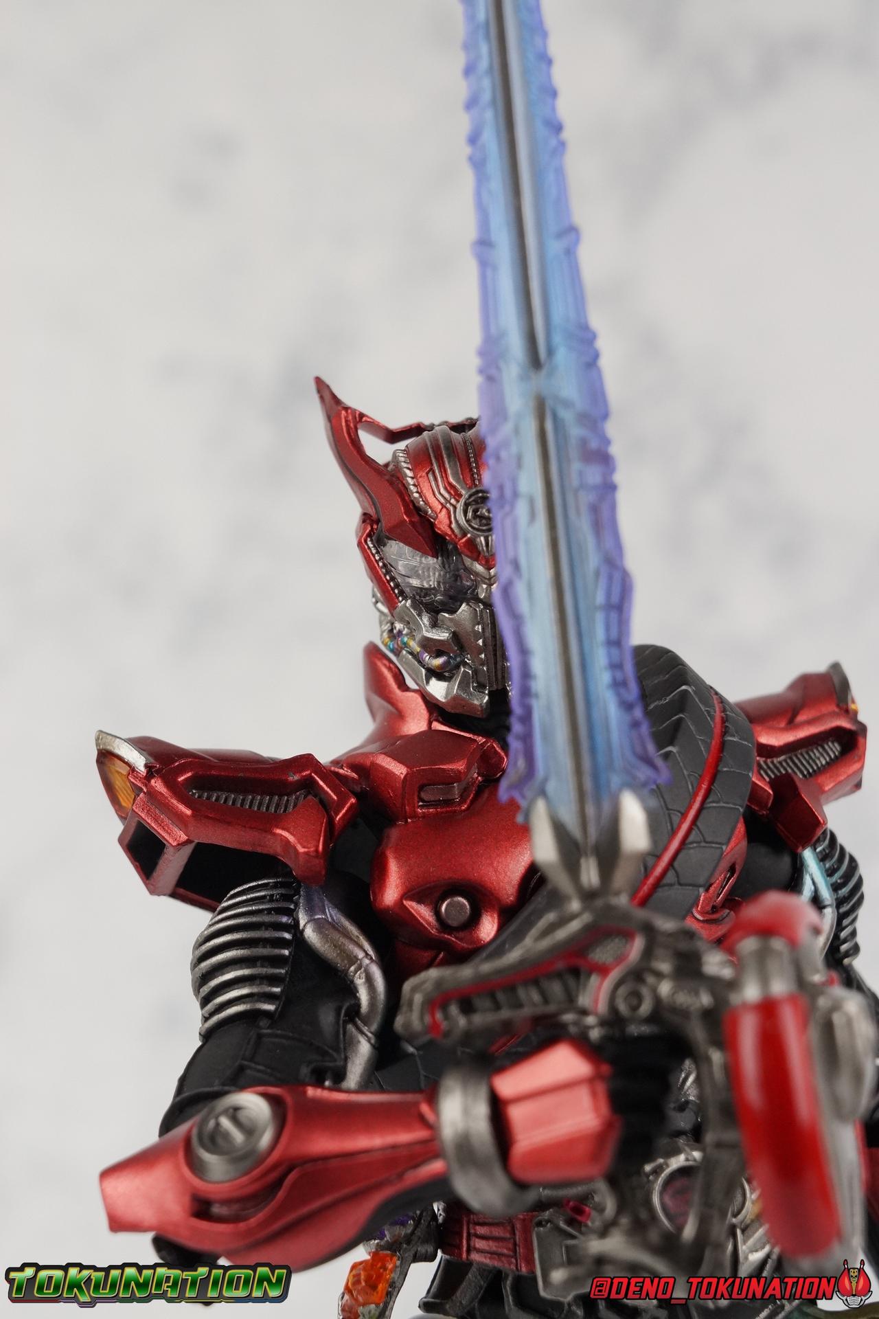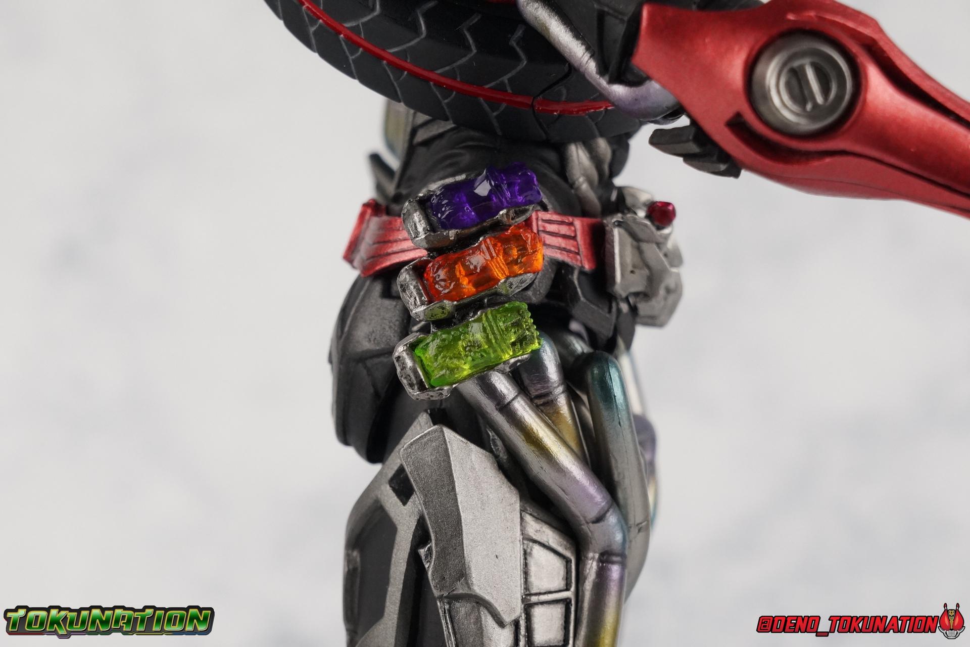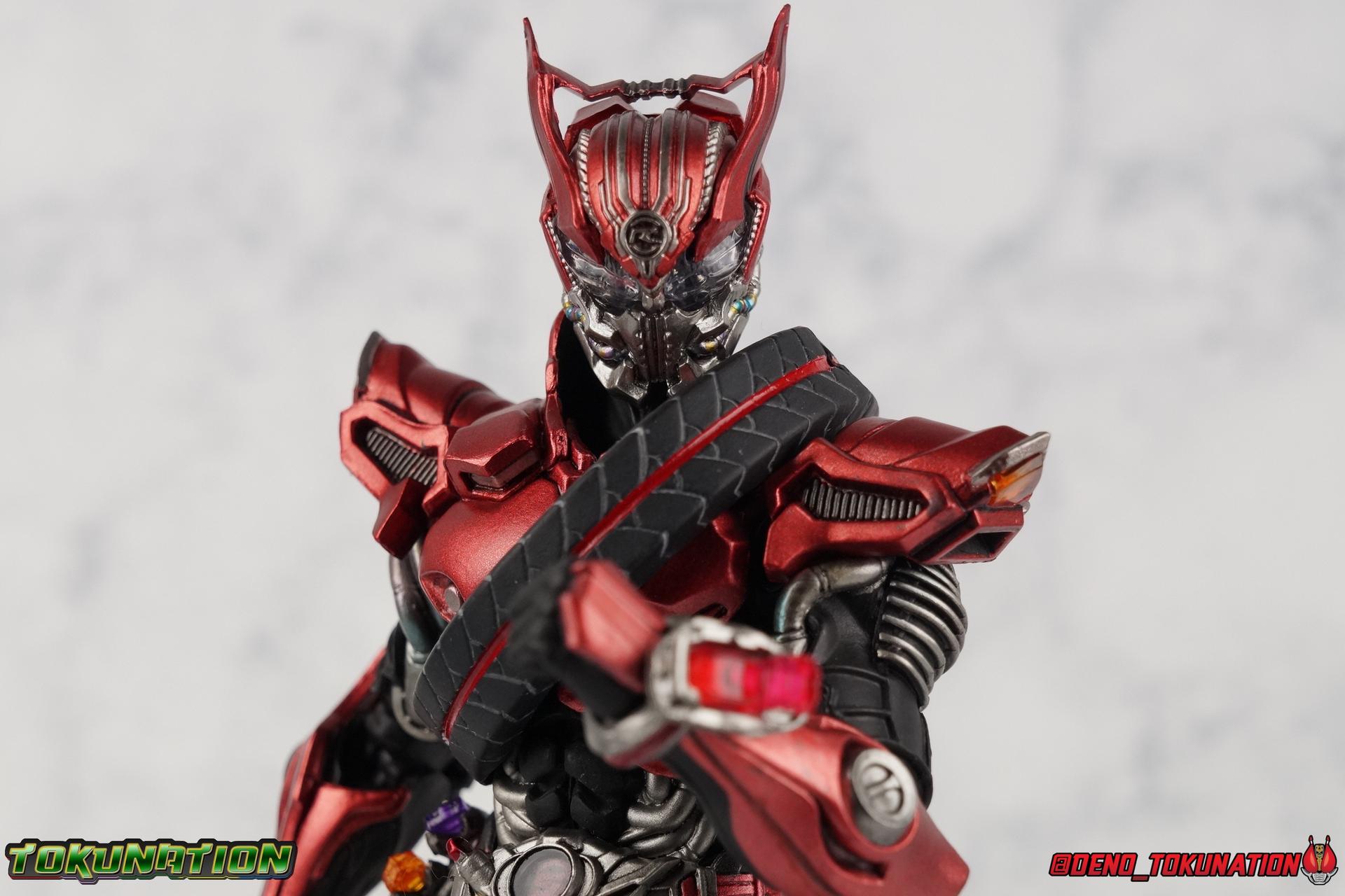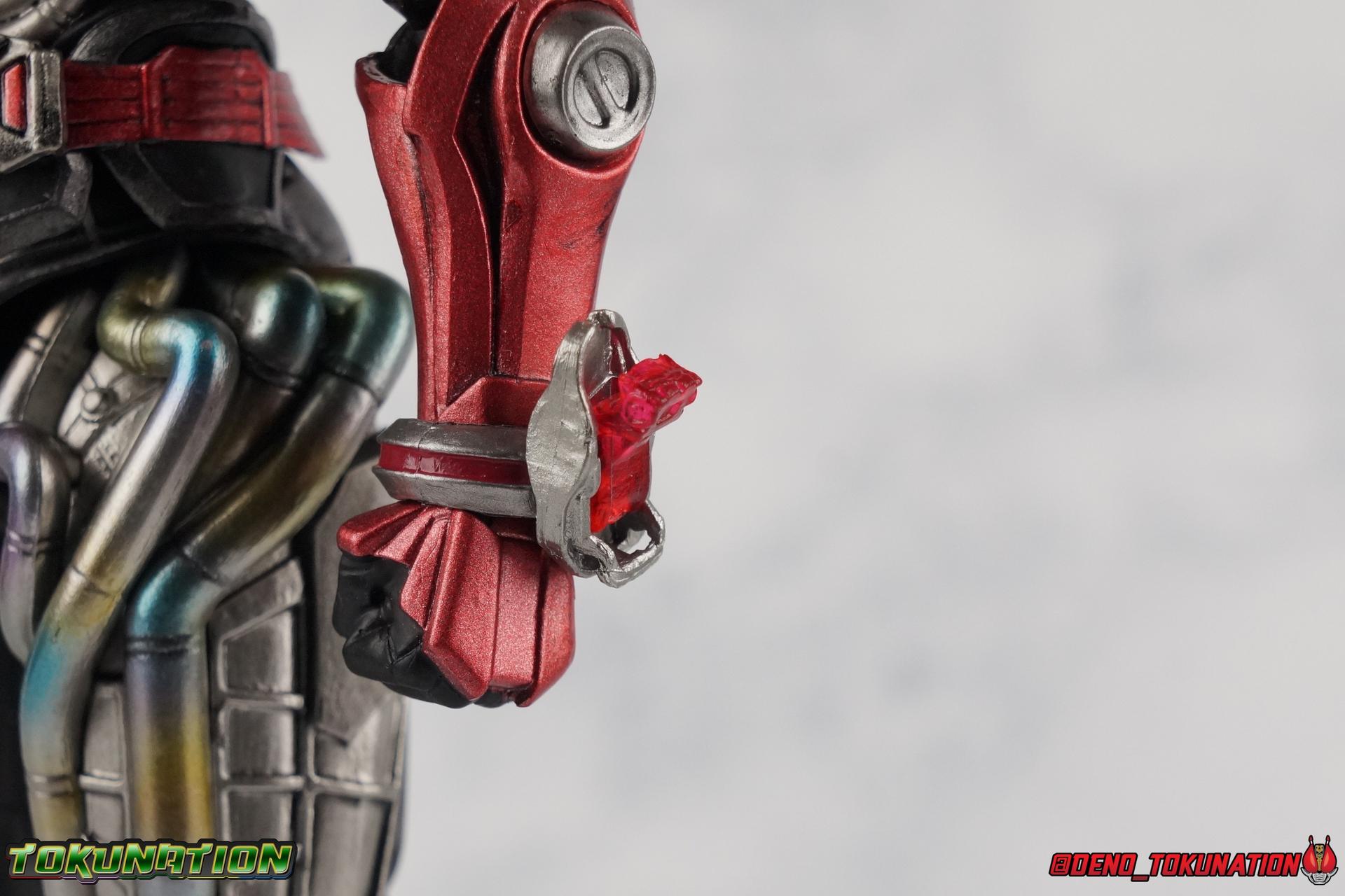 Normally I tend to limit myself to one scale of collecting for a particular show. I stick to 1/12 stuff, most often S.H. Figuarts. or gimmick and vintage figures around that scale. But every once in a while a show or figure grabs me enough that I do want to own it in a different size or line. Today's example of my weakness is brought to you by Kamen Rider Drive! I've never been huge into collecting S.I.C. figures, but S.I.C. Kamen Rider Drive Type Speed may finally be changing my tastes a little. Check out a full gallery & review below! Packaging As with most all modern S.I.C.'s, Drive Type Speed comes in a really elaborate and detailed window style box. The front actually looks like a stylized version of his helmet which I really dig. Obviously S.I.C.'s are fairly large, clocking in around 8", so this box is quite a bit bigger than an average figuart. And there are some fantastic stock photos on the exterior. They don't quite do this figure justice. Also the cardboard insert for the box is a fantastic reflective chrome with Drive's "R" emblem on it. It works great as a photo backdrop! Main Figure One thing I'll always give the S.I.C. toyline, details are key. And that's almost entirely thanks to the amazing man behind the line, Takeyuki Takeya. A brilliant artist with a mind for elaborate details and the meshing of organic and technological detailing. This release is doubly impressive because Takeya himself designed all the Roidmudes for Kamen Rider Drive. It was the first Kamen Rider Series to feature villains to be entirely designed by him. Though the riders themselves were not. S.I.C. Drive however, as with practically every other S.I.C. figure, was. This is Takeya taking a crack at Drive with his own unique style of detail and flourish. And it has been wonderfully executed. Though there are some minor caveats. The way the ball joints operate in the feet really irks me. They're on hinges but the ball also rotates 360, so it's very easy to get them off center, then Drive's feet won't sit flat at the same angle. The double jointed knees are astounding though. The entire calve can rest on the back of the thigh. That's just crazy. The hips can actually rotate out much further than I would have assumed too, those pipes on the thighs don't get in the way too much for outward movement, but they aren't exactly perfect either. They do pop off easily due to their design. And actually the hips can pull down a decent amount out of the waist so forward and back movement is remarkably good. This Drive can sit properly as though there were a Tridoron scaled to him. However he cant really get down on one knee to kneel, which is sort of my benchmark for figure posability. The upper body really only has one big thing that bugs me. And that's how loosely the Drive Driver sits on the belt itself. It's quite easy to pop off, the belt is pretty loose around the waist already, which normally I like because it frees up movement. But in this case it makes it easier to knock the driver off, that coupled with the soft plastic of the belt is obviously a great recipe for losing small parts. The lower torso also moves quite freely and is made of a soft plastic, though sometimes you can see straight through a hole in the waist because of the way it moves. The upper torso has some of the best asymmetrical detailing I've ever seen, I really love it. Taking Drive's tire sash to a new level. The way the ridges on the lower right & upper left corner of the chest compliment each other is gorgeous. And I love the added detail of a neck collar around the right side of Drive's head. It really drives (pun!) home the 'bisected by a tire idea' of his design. It's as though he was a totally normal rider then this thing just smashed it's way into the design and the suit just accommodated. This is why I love Takeya's work. The arms have some pretty standard movement, which is to say the shoulder pads keep them from doing much and the elbows can do about a 90 degree angle. The wrists don't have a ton of clearance because of how they sit flush with the wrist pads but you can get some use out of them. And lastly the head. Wow that just gorgeous brilliant detailed head. This take on the design easily looks like it could have fit in with the Roidmudes of the series. It's heroic, but it looks so, sinister? I love it. And it actually has plenty of room to move. Bravo on this design. This figure just rocks it at every level. It's just a gorgeous re-design of a suit that I already loved immensely. S.I.C. Kamen Rider Drive Type Speed gets the best of both worlds in it's first outing with this line. Hopefully S.I.C. Mashin Chaser & Heart can live up to this standard as well! Accessories As with most S.I.C.'s Drive is loaded up! 1 - Handle Sword. This version of the handle sword is quite the detailed departure from the figuart. As with everything else about this figure it takes the car aesthetic to the extreme. I love it. It can accept Shift Cars in a similar fashion to the S.H. Figuarts release. 1 - Door Gun. While the Door Gun may not look as radically different as the normal version it's still a great looking weapon that compliments Drive's new deep details very well. It can accept Shift Cars in a similar fashion to the S.H. Figuarts release and has an opening door as well. 1 - Max Flare Tire. This giant hunk of plastic can replace the standard Type Speed tire in much the same way as the figuart. It comes apart in sections to snap over the chest. In the case of this one the flame effects are molded onto the tire so they aren't removable. They are also totally awesome. 1 - Max Flare belt read out. This replaces Mr. Belt's standard face. It works basically just like the SHF, take the driver off and replace the plate. 3 - sets of hands. 1 open pair, 1 set for holding the gun, 1 set for holding the sword. I am a bit disappointed that he doesn't have a pair of relaxed open hands, but oh well. 6 - Shift Cars. That's 1 each of Midnight Shadow, 