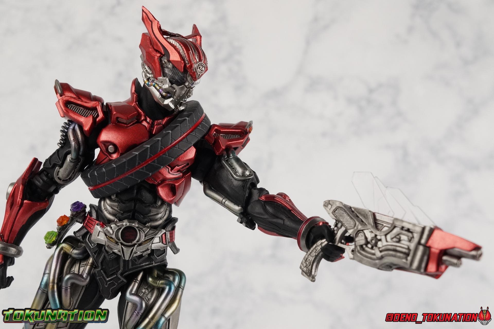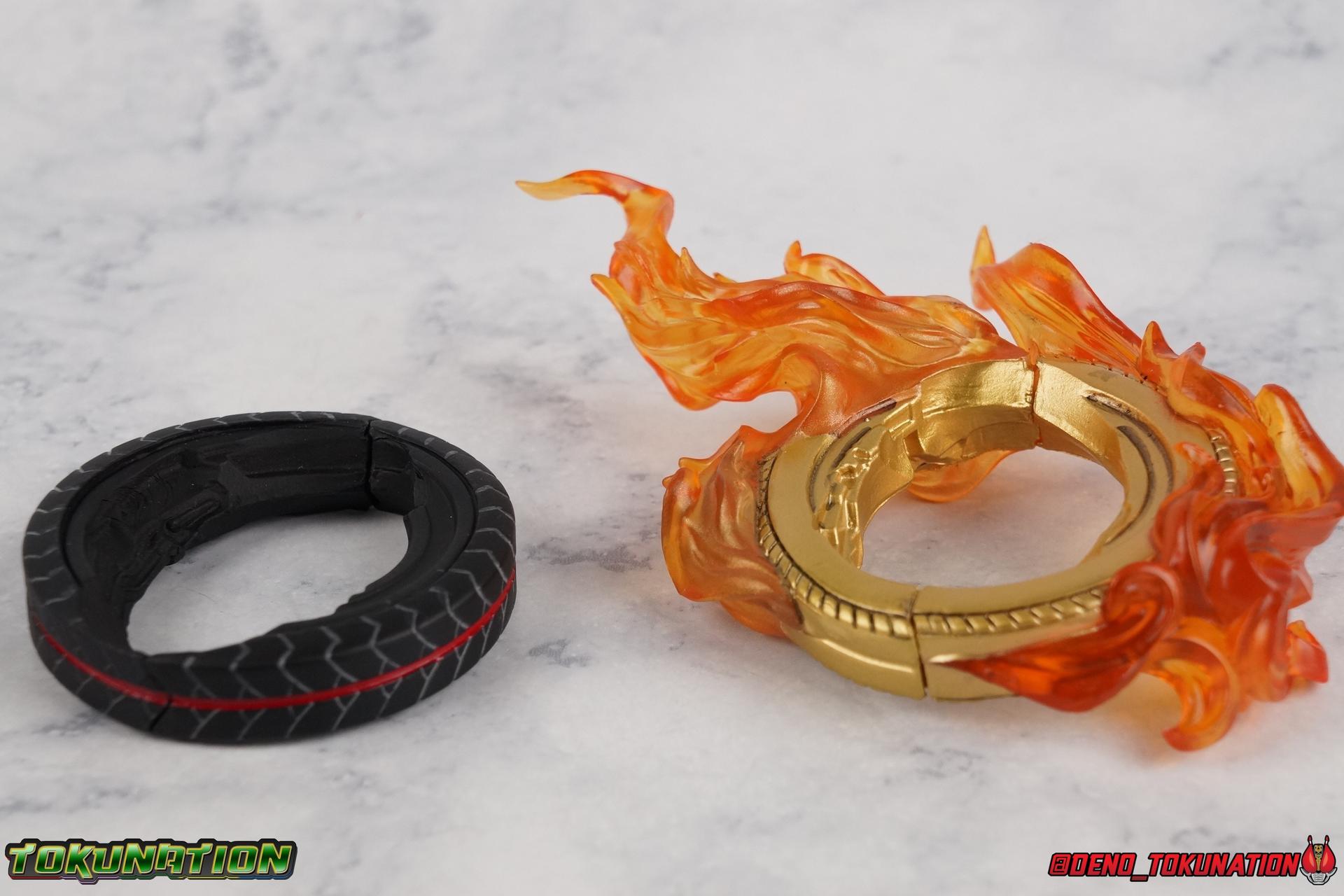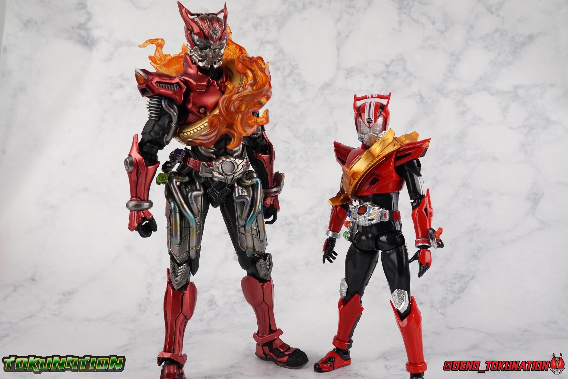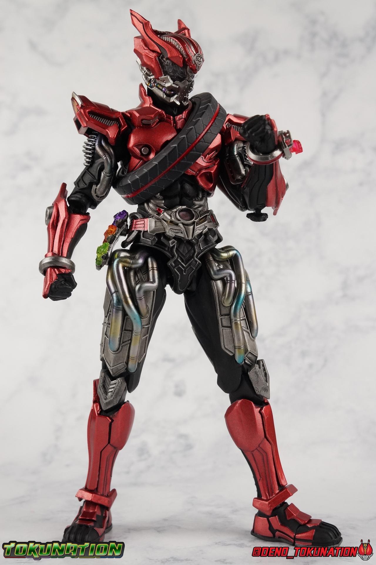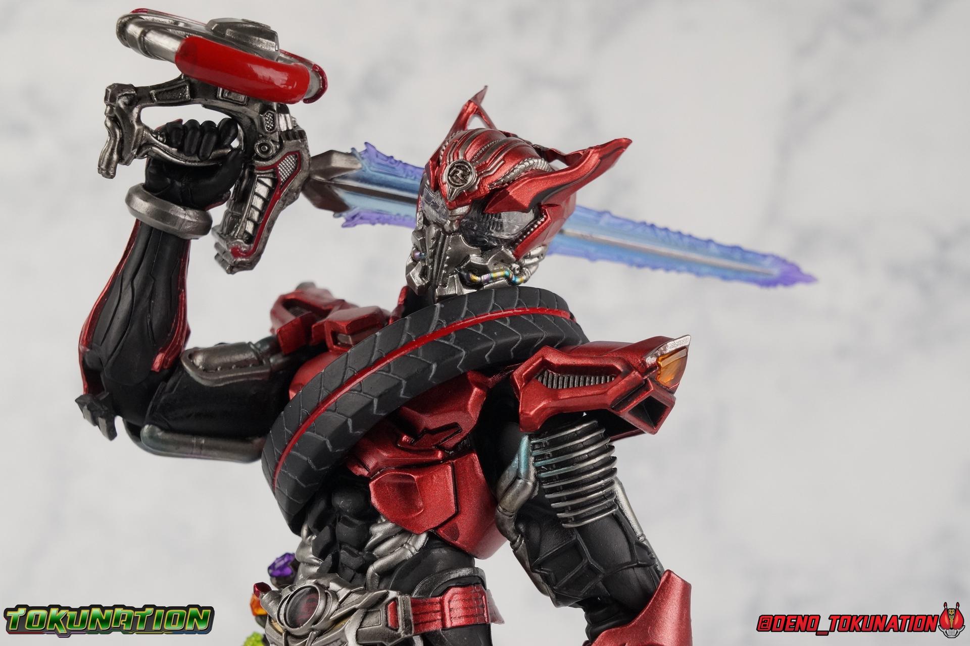 Normally I tend to limit myself to one scale of collecting for a particular show. I stick to 1/12 stuff, most often S.H. Figuarts. or gimmick and vintage figures around that scale. But every once in a while a show or figure grabs me enough that I do want to own it in a different size or line. Today's example of my weakness is brought to you by Kamen Rider Drive! I've never been huge into collecting S.I.C. figures, but S.I.C. Kamen Rider Drive Type Speed may finally be changing my tastes a little. Check out a full gallery & review below! Packaging As with most all modern S.I.C.'s, Drive Type Speed comes in a really elaborate and detailed window style box. The front actually looks like a stylized version of his helmet which I really dig. Obviously S.I.C.'s are fairly large, clocking in around 8", so this box is quite a bit bigger than an average figuart. And there are some fantastic stock photos on the exterior. They don't quite do this figure justice. Also the cardboard insert for the box is a fantastic reflective chrome with Drive's "R" emblem on it. It works great as a photo backdrop! Main Figure One thing I'll always give the S.I.C. toyline, details are key. And that's almost entirely thanks to the amazing man behind the line, Takeyuki Takeya. A brilliant artist with a mind for elaborate details and the meshing of organic and technological detailing. This release is doubly impressive because Takeya himself designed all the Roidmudes for Kamen Rider Drive. It was the first Kamen Rider Series to feature villains to be entirely designed by him. Though the riders themselves were not. S.I.C. Drive however, as with practically every other S.I.C. figure, was. This is Takeya taking a crack at Drive with his own unique style of detail and flourish. And it has been wonderfully executed. Though there are some minor caveats. The way the ball joints operate in the feet really irks me. They're on hinges but the ball also rotates 360, so it's very easy to get them off center, then Drive's feet won't sit flat at the same angle. The double jointed knees are astounding though. The entire calve can rest on the back of the thigh. That's just crazy. The hips can actually rotate out much further than I would have assumed too, those pipes on the thighs don't get in the way too much for outward movement, but they aren't exactly perfect either. They do pop off easily due to their design. And actually the hips can pull down a decent amount out of the waist so forward and back movement is remarkably good. This Drive can sit properly as though there were a Tridoron scaled to him. However he cant really get down on one knee to kneel, which is sort of my benchmark for figure posability. The upper body really only has one big thing that bugs me. And that's how loosely the Drive Driver sits on the belt itself. It's quite easy to pop off, the belt is pretty loose around the waist already, which normally I like because it frees up movement. But in this case it makes it easier to knock the driver off, that coupled with the soft plastic of the belt is obviously a great recipe for losing small parts. The lower torso also moves quite freely and is made of a soft plastic, though sometimes you can see straight through a hole in the waist because of the way it moves. The upper torso has some of the best asymmetrical detailing I've ever seen, I really love it. Taking Drive's tire sash to a new level. The way the ridges on the lower right & upper left corner of the chest compliment each other is gorgeous. And I love the added detail of a neck collar around the right side of Drive's head. It really drives (pun!) home the 'bisected by a tire idea' of his design. It's as though he was a totally normal rider then this thing just smashed it's way into the design and the suit just accommodated. This is why I love Takeya's work. The arms have some pretty standard movement, which is to say the shoulder pads keep them from doing much and the elbows can do about a 90 degree angle. The wrists don't have a ton of clearance because of how they sit flush with the wrist pads but you can get some use out of them. And lastly the head. Wow that just gorgeous brilliant detailed head. This take on the design easily looks like it could have fit in with the Roidmudes of the series. It's heroic, but it looks so, sinister? I love it. And it actually has plenty of room to move. Bravo on this design. This figure just rocks it at every level. It's just a gorgeous re-design of a suit that I already loved immensely. S.I.C. Kamen Rider Drive Type Speed gets the best of both worlds in it's first outing with this line. Hopefully S.I.C. Mashin Chaser & Heart can live up to this standard as well! Accessories As with most S.I.C.'s Drive is loaded up! 1 - Handle Sword. This version of the handle sword is quite the detailed departure from the figuart. As with everything else about this figure it takes the car aesthetic to the extreme. I love it. It can accept Shift Cars in a similar fashion to the S.H. Figuarts release. 1 - Door Gun. While the Door Gun may not look as radically different as the normal version it's still a great looking weapon that compliments Drive's new deep details very well. It can accept Shift Cars in a similar fashion to the S.H. Figuarts release and has an opening door as well. 1 - Max Flare Tire. This giant hunk of plastic can replace the standard Type Speed tire in much the same way as the figuart. It comes apart in sections to snap over the chest. In the case of this one the flame effects are molded onto the tire so they aren't removable. They are also totally awesome. 1 - Max Flare belt read out. This replaces Mr. Belt's standard face. It works basically just like the SHF, take the driver off and replace the plate. 3 - sets of hands. 1 open pair, 1 set for holding the gun, 1 set for holding the sword. I am a bit disappointed that he doesn't have a pair of relaxed open hands, but oh well. 6 - Shift Cars. That's 1 each of Midnight Shadow, 