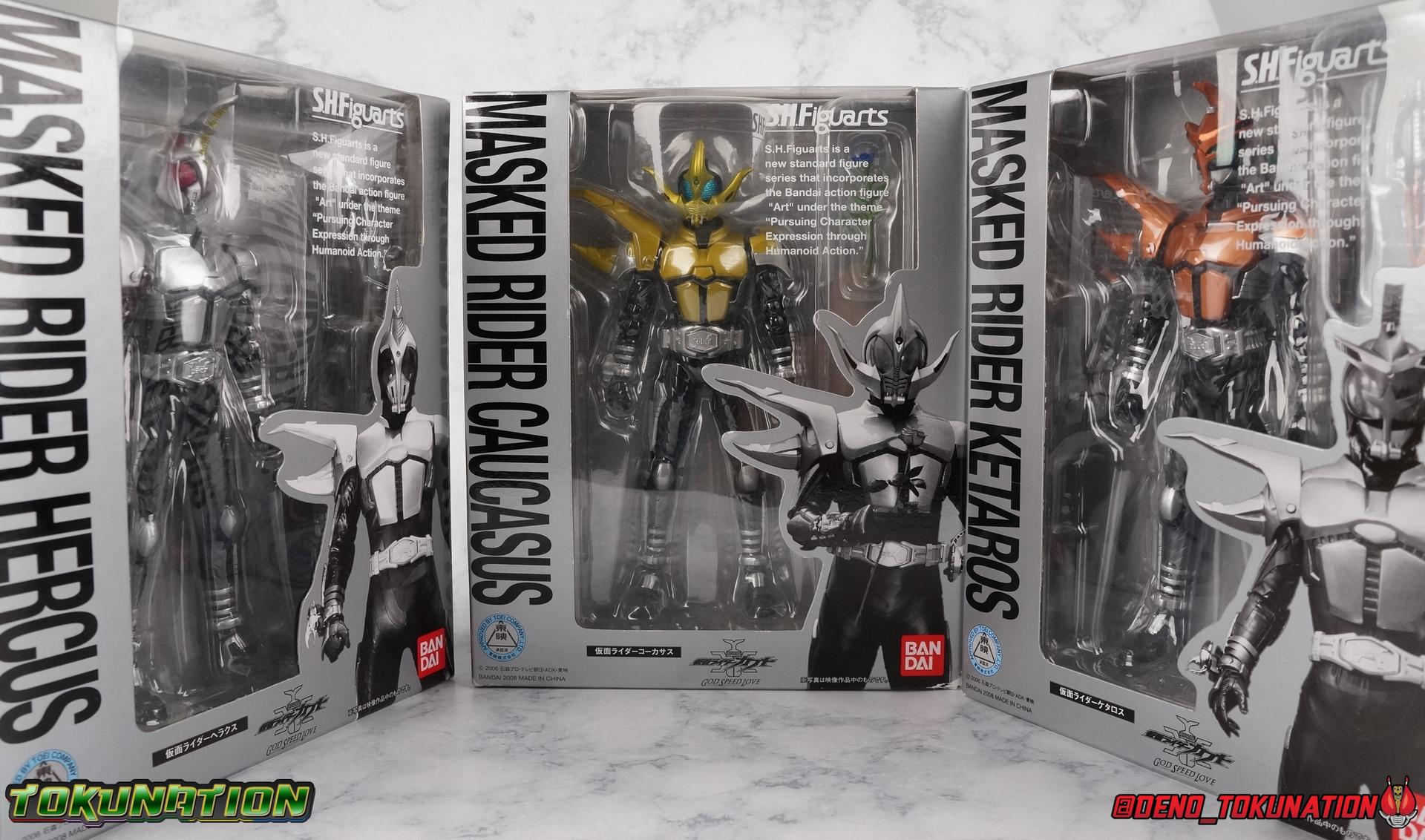 With Shinkochou Seihou releases in full swing, particularly for Kamen Rider Kabuto, I thought it was time we went back to take an extensive look at the trio of new riders that were introduced in Kabuto's film. Exclusive to God Speed Love, each of the 3 riders, Hercus Ketaros & Caucasus, has their own allegiance to one of the various future factions of ZECT. And even though ultimately each of them were sacrificial lambs for Tendou's path to the past, they all had particularly strong designs. We'll focus on each briefly below, be forewarned that the mold each of these figures uses as a base is the original Kabuto/Dark Kabuto mold, NOT the Seihou release. These are the original releases, they are quite dated, they do still have many faults of that original mold. Faults that most of the releases in the original Kabuto line suffered from. I won't focus on their functionality for too long as that mold doesn't really have much to offer in discussion anymore. Post #1 will focus on Hercus & Ketaros while Post #3 will primarily focus on Caucasus. If you'd like to hear my thoughts on this older body mold please feel fee to thumb through my original release Gattack & Dark Kabuto galleries for an idea. Packaging Each of these figures hails from an era of S.H. figuarts when gray scale plain boxes were the norm. So it's no shock that the packaging is incredibly boring for each of these figures. Main Figures Hercus: We'll start here with the silver Hercules Beetle themed Kamen Rider Hercus. A pretty basic repaint of the original Kabuto mold, Hercus does feature a new head and right shoulder. The new shoulder reminds me more of a Rhinoceros beetle than his actual head does, but I do like the double pronged nature of the heads' design. One large horn striking forward from the forehead, and a small upward pointing blade from the chin. While not the most exciting of the 3 new riders, it has a uniqueness all it's own. Aside from these changes Hercus also has a remolded right wrist which now has a brace and port for the included Hercus Kabutech Zecter to attach. Accessories: 2 sets of additional hands, 1 Hercus Zecter, and 1 ZECT Kunai Gun (gun mode). That's pretty lite, but also quite standard for the time of his release. I can't recall any of the original Kabuto riders actually including both the Kunai Gun and it's actual kunai mode. Technically he can wield it as the axe form too, but it's not quite the right shape or size for that. Ketaros: Next up we have the rust brown Centaurus Beetle themed Kamen Rider Ketaros. Another basic repaint of the original Kabuto mold, Ketaros does feature a more elaborately molded new head than Hercus. The new shoulder is identical to the one on Hercus, just with different paint apps. The new head however is a vast departure, I get the impression of dragonfly & scorpion combined in his visor design. It really is something else. The way that unique part splits the compound eyes is pretty striking, it's much less safe than most of the Kabuto rider form helmets were. Not exactly my favorite of the 3 movie riders, Ketaros is still a nice departure from Hercus' blandness. Aside from these changes Ketaros also the remolded right wrist which now has a brace and port for the included Ketaros Kabutech Zecter to attach. Accessories: 2 sets of additional hands, 1 Ketaros Zecter (a repaint of the Hercus Zecter), and 1 ZECT Kunai Gun (Kunai mode). That's pretty lite, but still standard for the time of his release. My guess is that he includes the Kunai mode of the kunai gun simply to differentiate Ketaros a bit more from Hercus. And that actually does help some. Caucasus: Now we arrive at easily my favorite of the 3 movie riders, the golden Caucasus Beetle themed Kamen Rider Caucasus! While still not a huge departure from the original Kabuto mold, or in fact the other 2 movie riders, Caucasus somehow winds up as my favorite of the 3. He features the same remolded shoulder as the other 2, with different paint apps again. And he also features another fantastic elaborate head. Ketaros was really interesting looking, but Caucasus almost appears to have a giant mustache. Which is somehow way more awesome? I also really like how the blue compound eyes offset the gold armor. Each of these molds carries about the same weight personality wise, but this one some how squeaks out as my favorite. Like the others his right wrist has been remolded with a new brace to accommodate the included Caucasus Kabutech Zecter. Accessories: 2 sets of additional hands, 1 Caucasus Zecter, 1 Hyper Zecter, and 1 blue rose. Even though Caucauss doesn't even include a simple repack of a weapon like the others do, he really comes with all he needs. The signature blue rose he's seen with in the film is a fantastic touch, and the Hyper Zecter is a must. Final Thoughts I have to say that even though these are all based on a pretty inferior mold, these figures still hold up decently. Obviously they're a bit undersized to scale correctly with today's line of Shinkocchou Seihou riders from Kabuto, but they can get the job done on a budget until the real deal comes out. If you see the trio cheaply I'd recommend picking them up to fill out a display at least. Kamen Riders Hercus, Ketaros, & Caucasus are worth that at least. But I'm also a huge Kabuto fan, the movie especially really worked for me. Often times people site Den-O as the first time that a Kamen Rider theatrical movie directly impacted the plot of the TV series, but really, it's Kabuto. If future Tendou hadn't managed to defeat Caucasus & steal the Hyper Zecter, as well as travel to the past, the original TV series would have never happened. Without this alternate future that's actually a prequel, the show wouldn't exist. And I love that. That's probably where a huge chunk of my attachment for these 3 designs comes from as well. But enough of me pontificating. Check out the full gallery below and let that be the deciding factor for you.