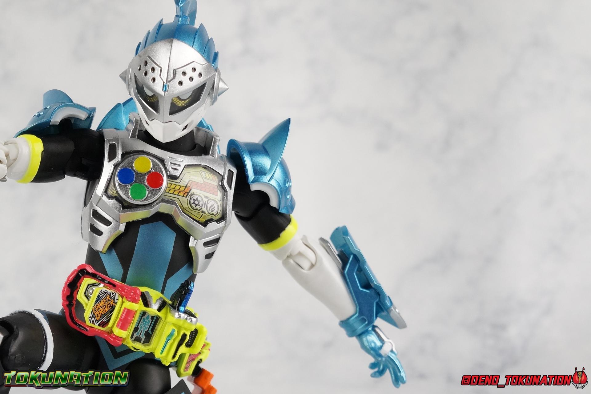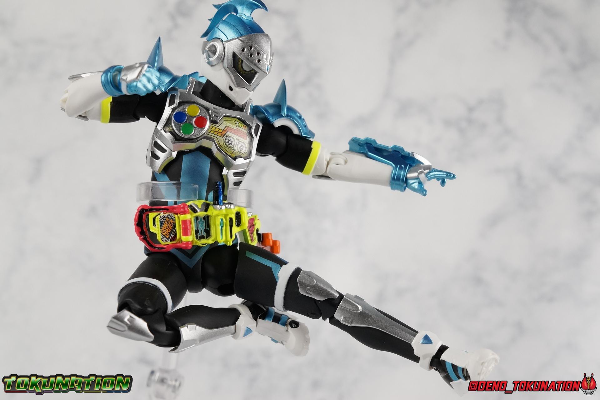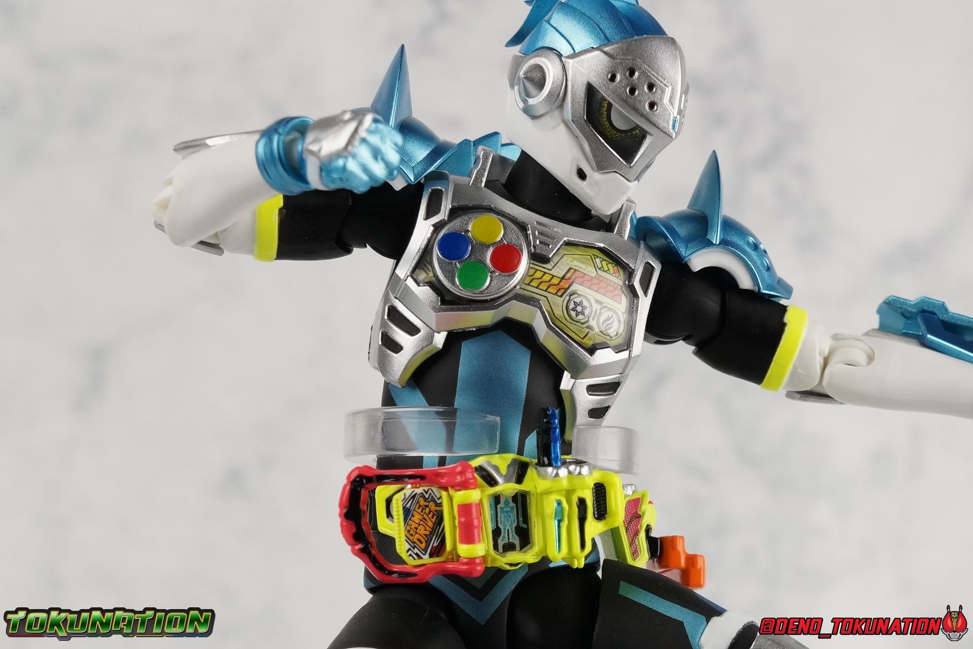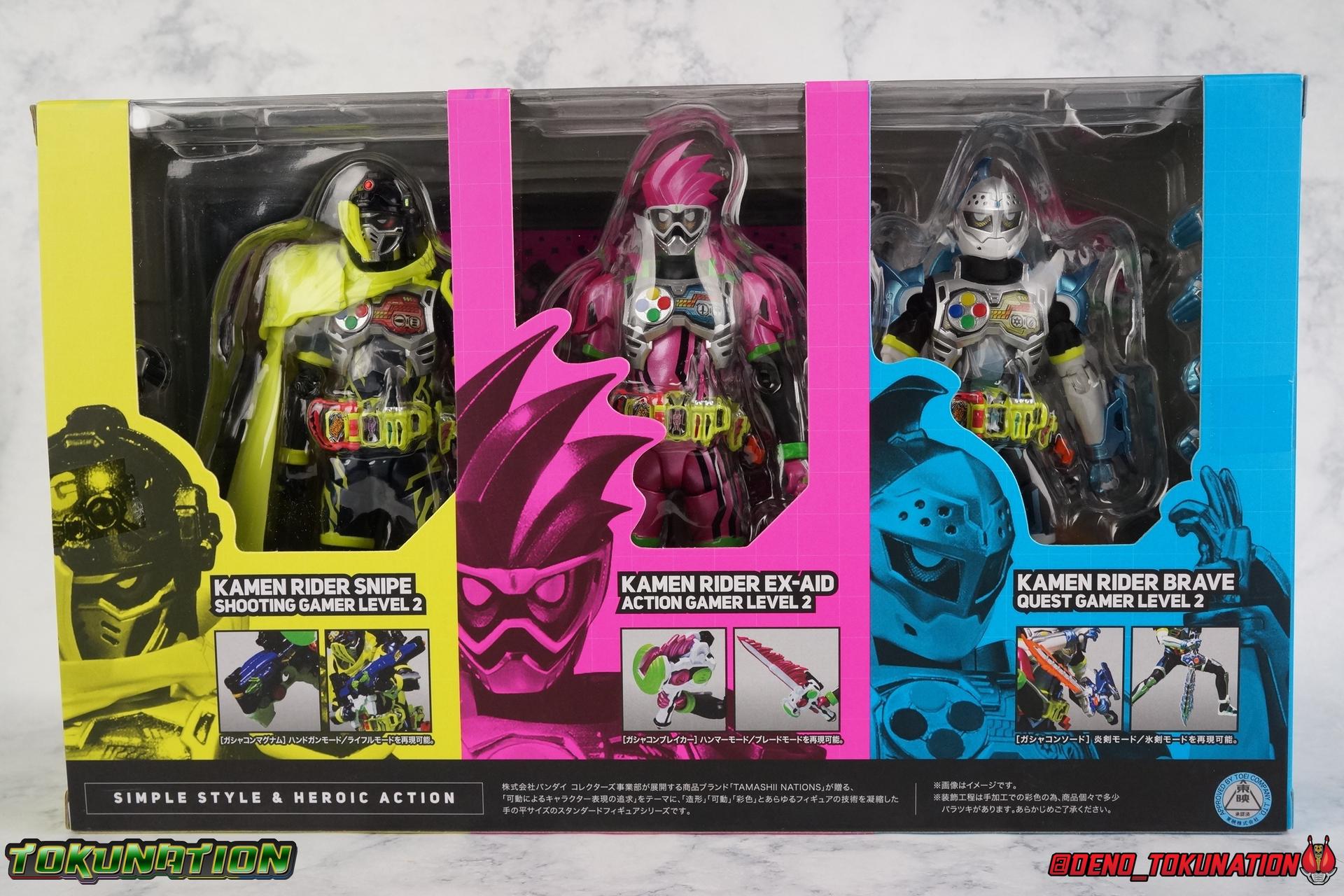 "Taddle Quest!" And we're back for part 2 of our Mighty Action X Beginning Set gallery series! Last time we took a look at the first rider in this set with S.H. Figuarts Kamen Rider Ex-Aid Action Gamer Level 2, this time we get to spend some time with the world's greatest surgeon, S.H Figuarts Kamen Rider Brave Quest Gamer Level 2! Each of the 3 figures in the Mighty Action set will be photographed separately. So that's 3 different full galleries! This gallery is part 2 of 3. We've already knocked out Ex-Aid, today takes care of Brave, and next time it's Snipe! Packaging The Mighty Action X Beginning set is a rather large 3-pack. Something that's rarely tried with figuarts release. The last 3-pack in recent memory was the Hakaider Squad set, that was a web exclusive release, and it didn't sell well. So for Bandai to take a chance on 3 unique riders from Ex-Aid, and release them at retail, that was pretty surprising. The box is a rather colorful 3-tone type that really pops, definitely befitting of the series it's from. Honestly the figures in box would make for a nice display piece if you'd like to pick up the individual figures to open too. It just looks good. The 3 riders come in one large tray with their hands, while the Mighty Action X stage as well as their unique weapons are in a separate tray below. Main Figure Obviously each Ex-Aid rider has a pretty radically different design, as with any series each character is unique. But they also tend to share some design influence, and in many cases parts reuse. The Ex-Aid line, at least so far as Level 2 forms are concerned is a prime example of this. Each suit has it's own unique detailing and colors, but at a basic level they feature the same mold. Sporty type shoes, the bike shorts look, the driver, the chest plate. You see what I mean. So although Ex-Aid and Brave Level 2 look very different, they also have a ton of similarities. So a good portion of my review will be very similar to that of Ex-Aid. If you'd like to skip a bit further down below then feel free as there will be a bit of rehash here. As with Ex-Aid, Brave features a ton of complex detail that we don't normally see each year. Paint apps and small molded details galore. Even more so than Ex-Aid, Brave is lavish. From the Ground up the new Ex-Aid type body is pretty solidly built. Though the ankles are still a huge fault for me. They don't have the full range of motion they need for Brave to assume many of the dynamic poses he's known for. You'll find that wide stances are just really really difficult to achieve, which means he's always gonna be a bit off balance. The knees have a great bend that helps add to Taddle Quest's sort of adventurous platformer theme. And all that being said, the paint apps for the legs are exquisite. I loved the black striping on Ex-Aids legs, but the blue detailing on top of the matte black finish on Brave's legs is really striking. That holds true for his entire under suit, it's just really gorgeous. One of the more elaborate pieces on the figure is the Gamer Driver itself. This entire device is extraordinarily detailed for something at this scale. The Driver handle can flip shut, thus hiding the rider read out on the front screen as well. The right of the driver has 2 slots for Gasshats. One is already attached in the form of the Taddle Quest Gasshat. It's kind of a dummy item though as it's really just the handle portion that pegs in. To the right of the driver, is a Gashat holster. There are 2 slots for extra Gasshats as well as 1 slot for a Critical Finish to be inserted. This whole assembly just looks fantastic. I'm taken back to Gaim Orange Arms and the wonderful design of his Sengoku Driver. This level of functionality is always impressive. I won't sell the rest of the upper body short either. Brave is absolutely breathtaking but his chest detailing is magnificent. The paint apps on the outer layer are crisp and clear, but I'm so impressed by the Rider Gauge label within his chest. Again, unlike Bandai's previous failures with labels (Kiwami Arms) this is flawless. On the flip side of the torso is the deactivated Level 1 head. As with Ex-Aid it's a bit stylized and shrunk down, but wow it looks good. It's such a strange detail for me to love but I do. Not to be forgotten are the arms, which admittedly only have one flaw that I'm bothered by, it's the same as with Ex-Aid. The shoulder pads. Every time I try to stretch the arms out it's like rather than sliding out properly the pads just pop off again. But it's a minor issue. The wrists are solid, the elbows fully functional and the bicep swivel welcome as always. Finally that brings us to the head. While Ex-Aid's head still seems to get a far bit criticism, I don't see how you could complain with Brave. That design is sharp, solid, and gorgeous. Somehow that head just wonderfully conveys Hiiro's dour attitude and sternness. It just oozes Mr. perfect surgeon. My only issue with it is the inconsistency of the white paint on the chin. Mine had a few flecks chipped off right out of the box, and I don't know that that's a common issue. But it bothers me a bit. Otherwise I think the shape & sculpt of the head are totally on point. It's a great new body mold with a brand new personality slapped onto it. I love it! Accessories Brave, much like Ex-Aid, comes with a pretty basic assortment but it's also basically everything you need for him: 4 - Sets of additional hands. That's 1 more set than Ex-Aid came with which I find odd, but I'll take it. Basically the only difference with Brave is the extra set is a totally open palm with spread fingers. 1 - Explosive Freezing Gashacon Sword. As the name implies this weapon carries both heat & cold abilities. In show this was represented by the blade transforming, on both sides, between the two forms. However this toy version opts for a blade that has fire on one side & ice on the other. It simply rotates at the base for whatever your preferred use is. It'