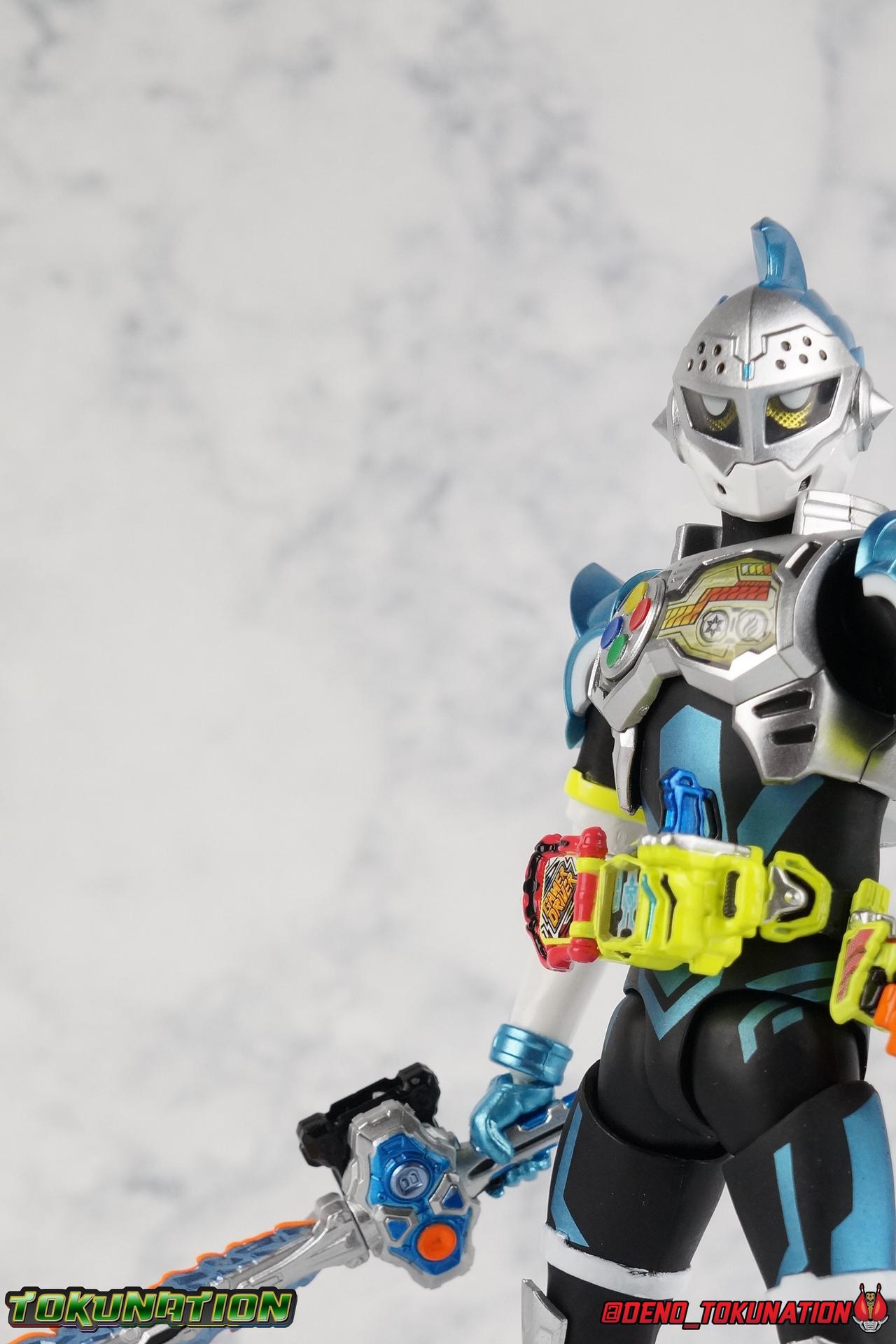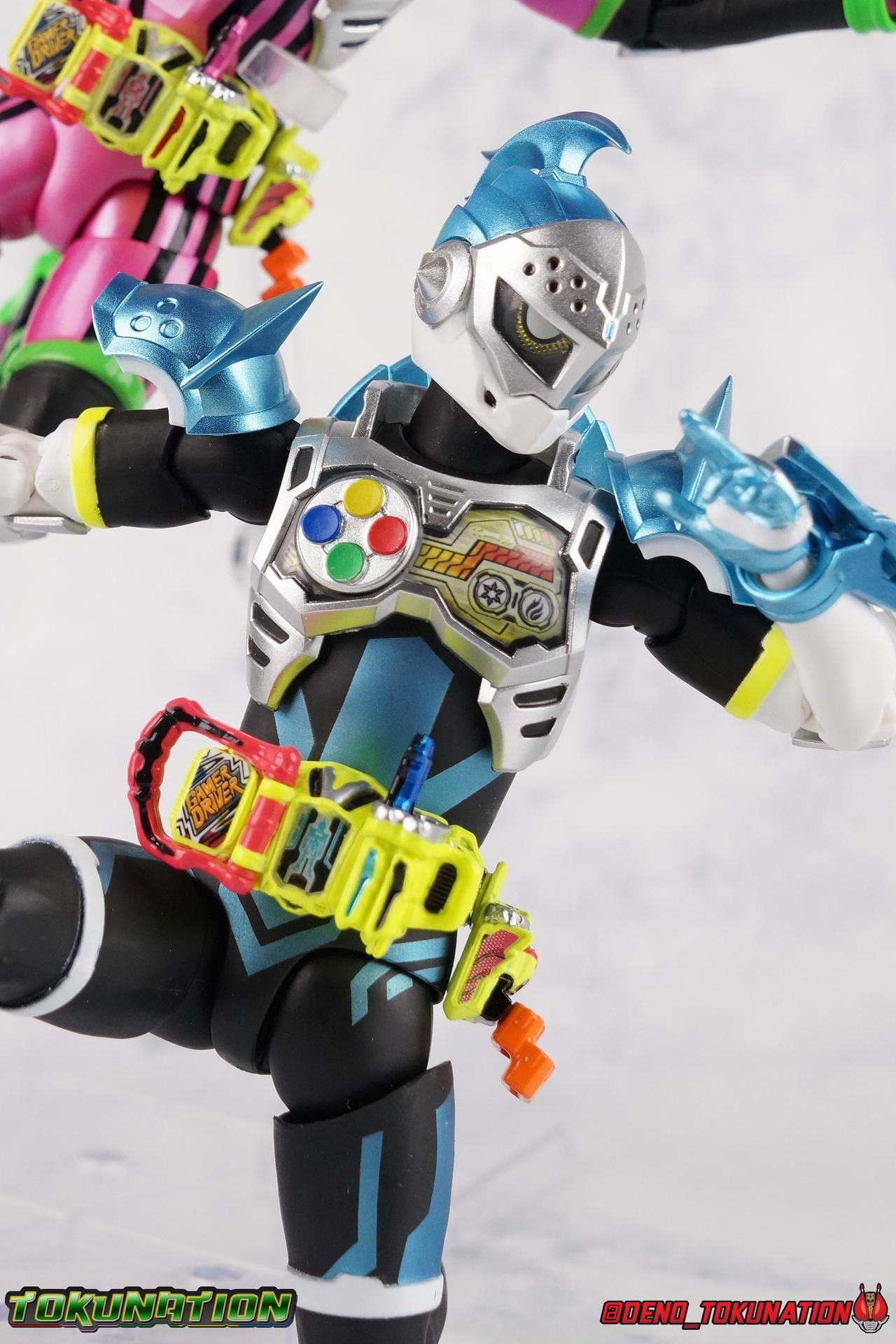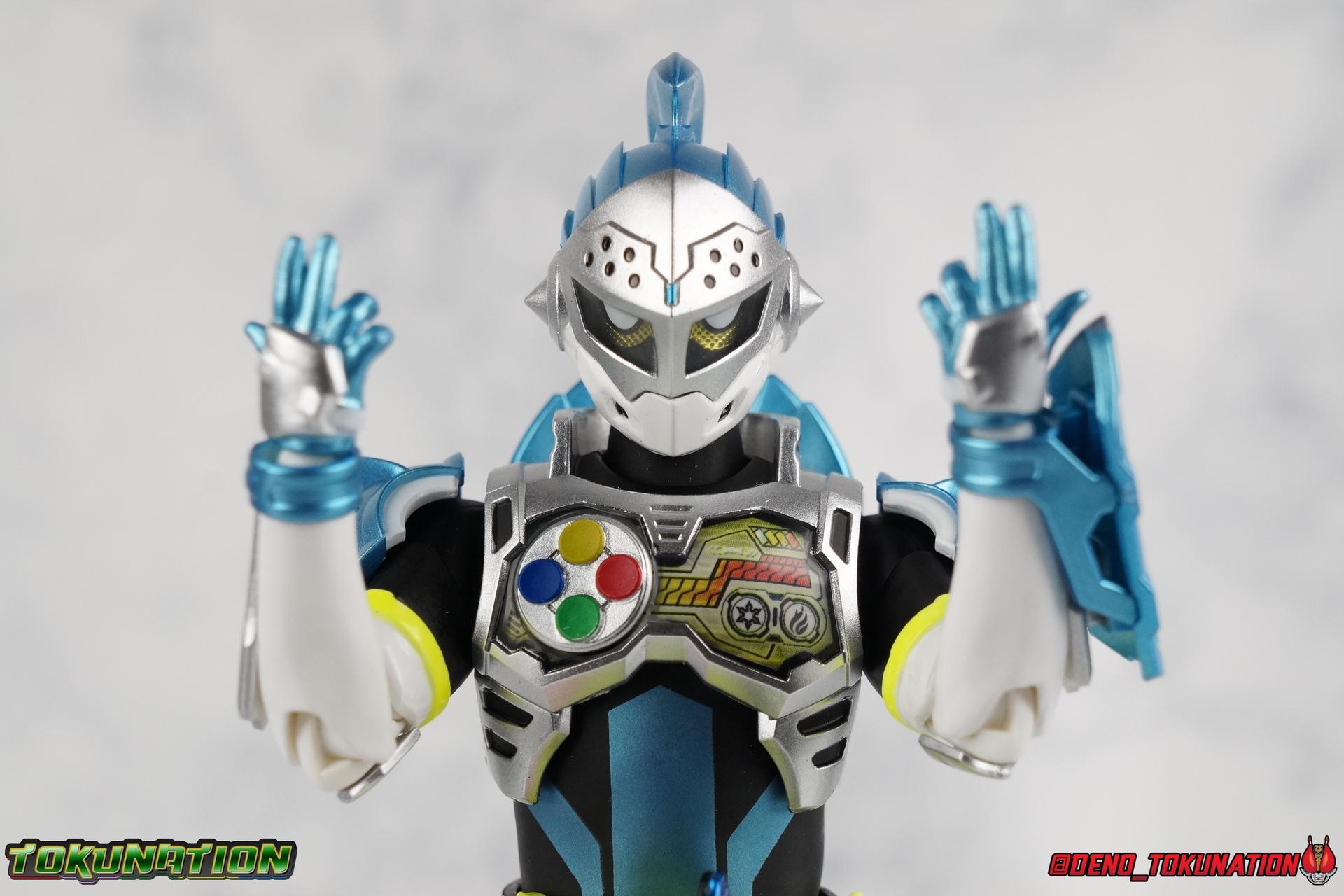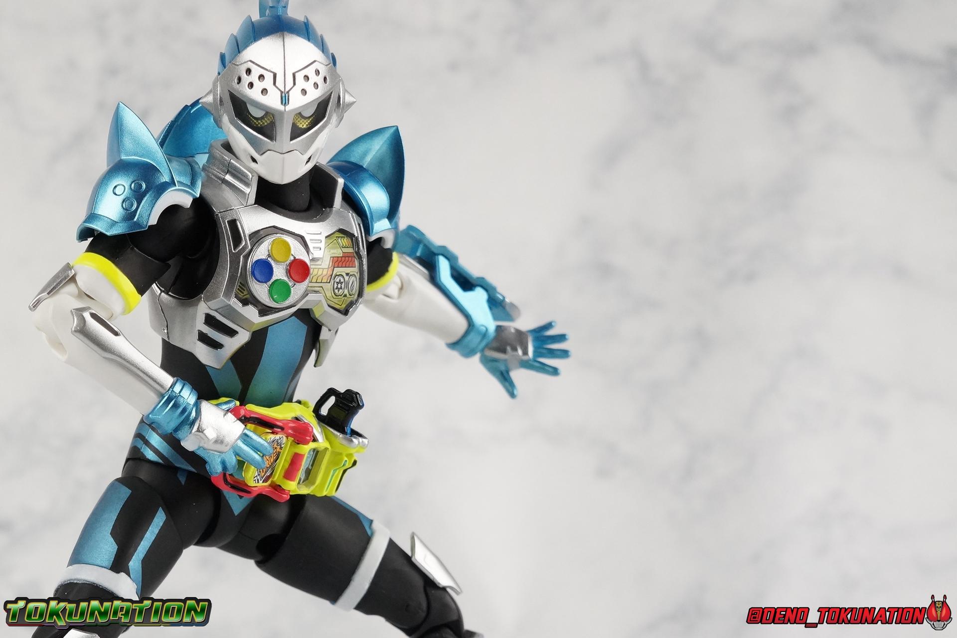 "Taddle Quest!" And we're back for part 2 of our Mighty Action X Beginning Set gallery series! Last time we took a look at the first rider in this set with S.H. Figuarts Kamen Rider Ex-Aid Action Gamer Level 2, this time we get to spend some time with the world's greatest surgeon, S.H Figuarts Kamen Rider Brave Quest Gamer Level 2! Each of the 3 figures in the Mighty Action set will be photographed separately. So that's 3 different full galleries! This gallery is part 2 of 3. We've already knocked out Ex-Aid, today takes care of Brave, and next time it's Snipe! Packaging The Mighty Action X Beginning set is a rather large 3-pack. Something that's rarely tried with figuarts release. The last 3-pack in recent memory was the Hakaider Squad set, that was a web exclusive release, and it didn't sell well. So for Bandai to take a chance on 3 unique riders from Ex-Aid, and release them at retail, that was pretty surprising. The box is a rather colorful 3-tone type that really pops, definitely befitting of the series it's from. Honestly the figures in box would make for a nice display piece if you'd like to pick up the individual figures to open too. It just looks good. The 3 riders come in one large tray with their hands, while the Mighty Action X stage as well as their unique weapons are in a separate tray below. Main Figure Obviously each Ex-Aid rider has a pretty radically different design, as with any series each character is unique. But they also tend to share some design influence, and in many cases parts reuse. The Ex-Aid line, at least so far as Level 2 forms are concerned is a prime example of this. Each suit has it's own unique detailing and colors, but at a basic level they feature the same mold. Sporty type shoes, the bike shorts look, the driver, the chest plate. You see what I mean. So although Ex-Aid and Brave Level 2 look very different, they also have a ton of similarities. So a good portion of my review will be very similar to that of Ex-Aid. If you'd like to skip a bit further down below then feel free as there will be a bit of rehash here. As with Ex-Aid, Brave features a ton of complex detail that we don't normally see each year. Paint apps and small molded details galore. Even more so than Ex-Aid, Brave is lavish. From the Ground up the new Ex-Aid type body is pretty solidly built. Though the ankles are still a huge fault for me. They don't have the full range of motion they need for Brave to assume many of the dynamic poses he's known for. You'll find that wide stances are just really really difficult to achieve, which means he's always gonna be a bit off balance. The knees have a great bend that helps add to Taddle Quest's sort of adventurous platformer theme. And all that being said, the paint apps for the legs are exquisite. I loved the black striping on Ex-Aids legs, but the blue detailing on top of the matte black finish on Brave's legs is really striking. That holds true for his entire under suit, it's just really gorgeous. One of the more elaborate pieces on the figure is the Gamer Driver itself. This entire device is extraordinarily detailed for something at this scale. The Driver handle can flip shut, thus hiding the rider read out on the front screen as well. The right of the driver has 2 slots for Gasshats. One is already attached in the form of the Taddle Quest Gasshat. It's kind of a dummy item though as it's really just the handle portion that pegs in. To the right of the driver, is a Gashat holster. There are 2 slots for extra Gasshats as well as 1 slot for a Critical Finish to be inserted. This whole assembly just looks fantastic. I'm taken back to Gaim Orange Arms and the wonderful design of his Sengoku Driver. This level of functionality is always impressive. I won't sell the rest of the upper body short either. Brave is absolutely breathtaking but his chest detailing is magnificent. The paint apps on the outer layer are crisp and clear, but I'm so impressed by the Rider Gauge label within his chest. Again, unlike Bandai's previous failures with labels (Kiwami Arms) this is flawless. On the flip side of the torso is the deactivated Level 1 head. As with Ex-Aid it's a bit stylized and shrunk down, but wow it looks good. It's such a strange detail for me to love but I do. Not to be forgotten are the arms, which admittedly only have one flaw that I'm bothered by, it's the same as with Ex-Aid. The shoulder pads. Every time I try to stretch the arms out it's like rather than sliding out properly the pads just pop off again. But it's a minor issue. The wrists are solid, the elbows fully functional and the bicep swivel welcome as always. Finally that brings us to the head. While Ex-Aid's head still seems to get a far bit criticism, I don't see how you could complain with Brave. That design is sharp, solid, and gorgeous. Somehow that head just wonderfully conveys Hiiro's dour attitude and sternness. It just oozes Mr. perfect surgeon. My only issue with it is the inconsistency of the white paint on the chin. Mine had a few flecks chipped off right out of the box, and I don't know that that's a common issue. But it bothers me a bit. Otherwise I think the shape & sculpt of the head are totally on point. It's a great new body mold with a brand new personality slapped onto it. I love it! Accessories Brave, much like Ex-Aid, comes with a pretty basic assortment but it's also basically everything you need for him: 4 - Sets of additional hands. That's 1 more set than Ex-Aid came with which I find odd, but I'll take it. Basically the only difference with Brave is the extra set is a totally open palm with spread fingers. 1 - Explosive Freezing Gashacon Sword. As the name implies this weapon carries both heat & cold abilities. In show this was represented by the blade transforming, on both sides, between the two forms. However this toy version opts for a blade that has fire on one side & ice on the other. It simply rotates at the base for whatever your preferred use is. It'