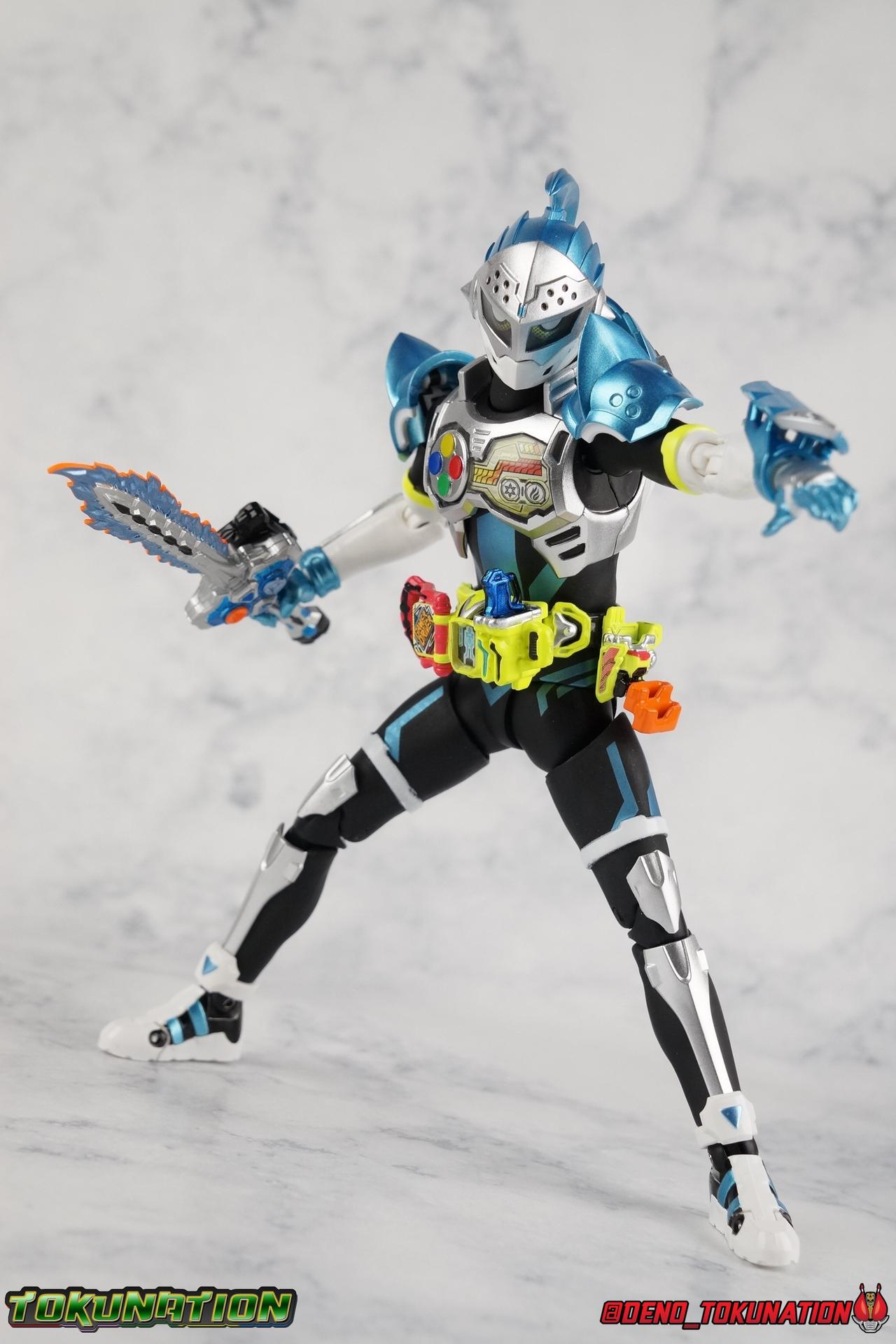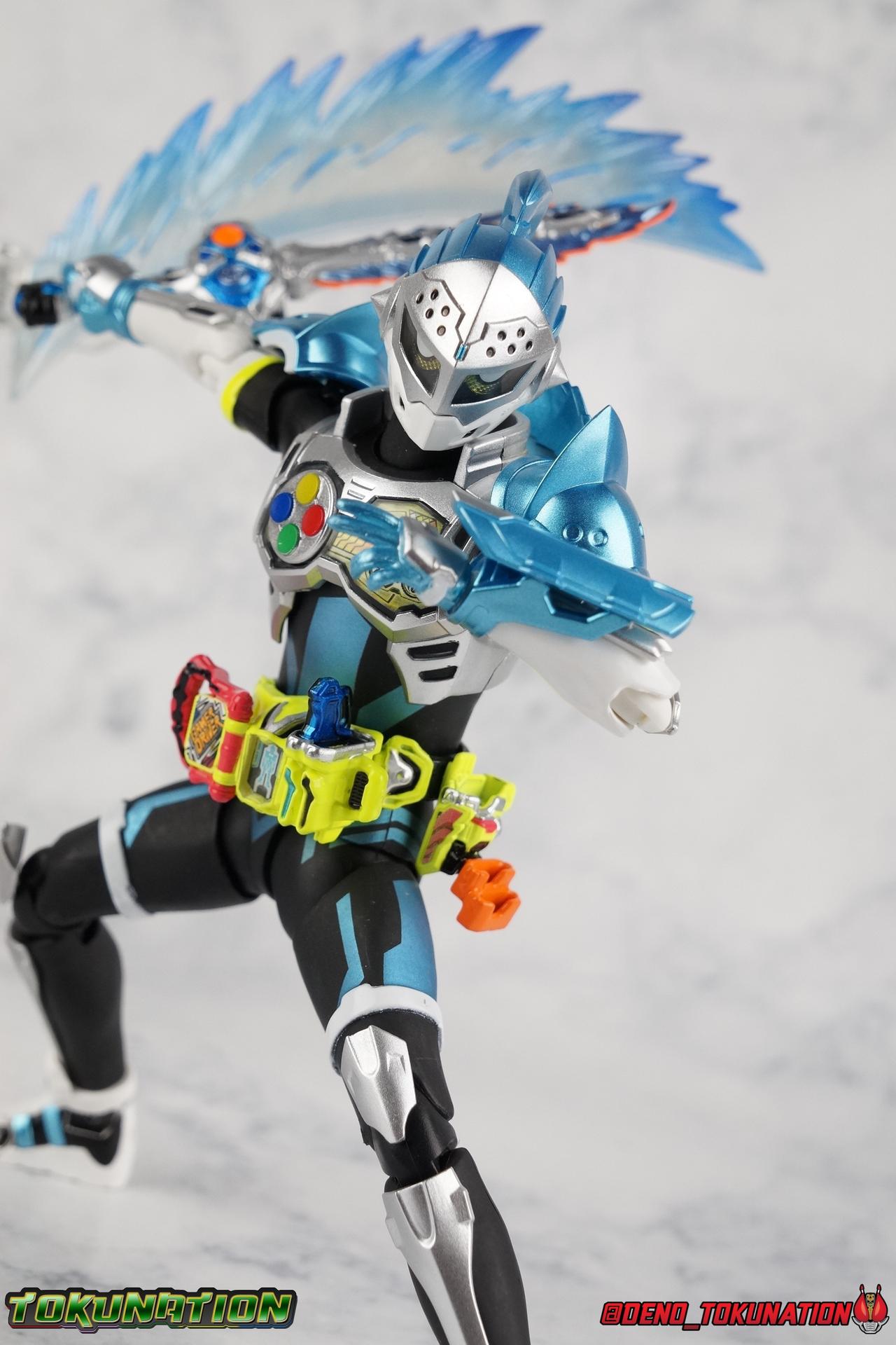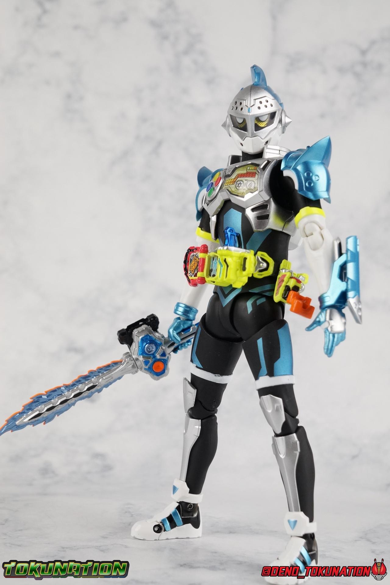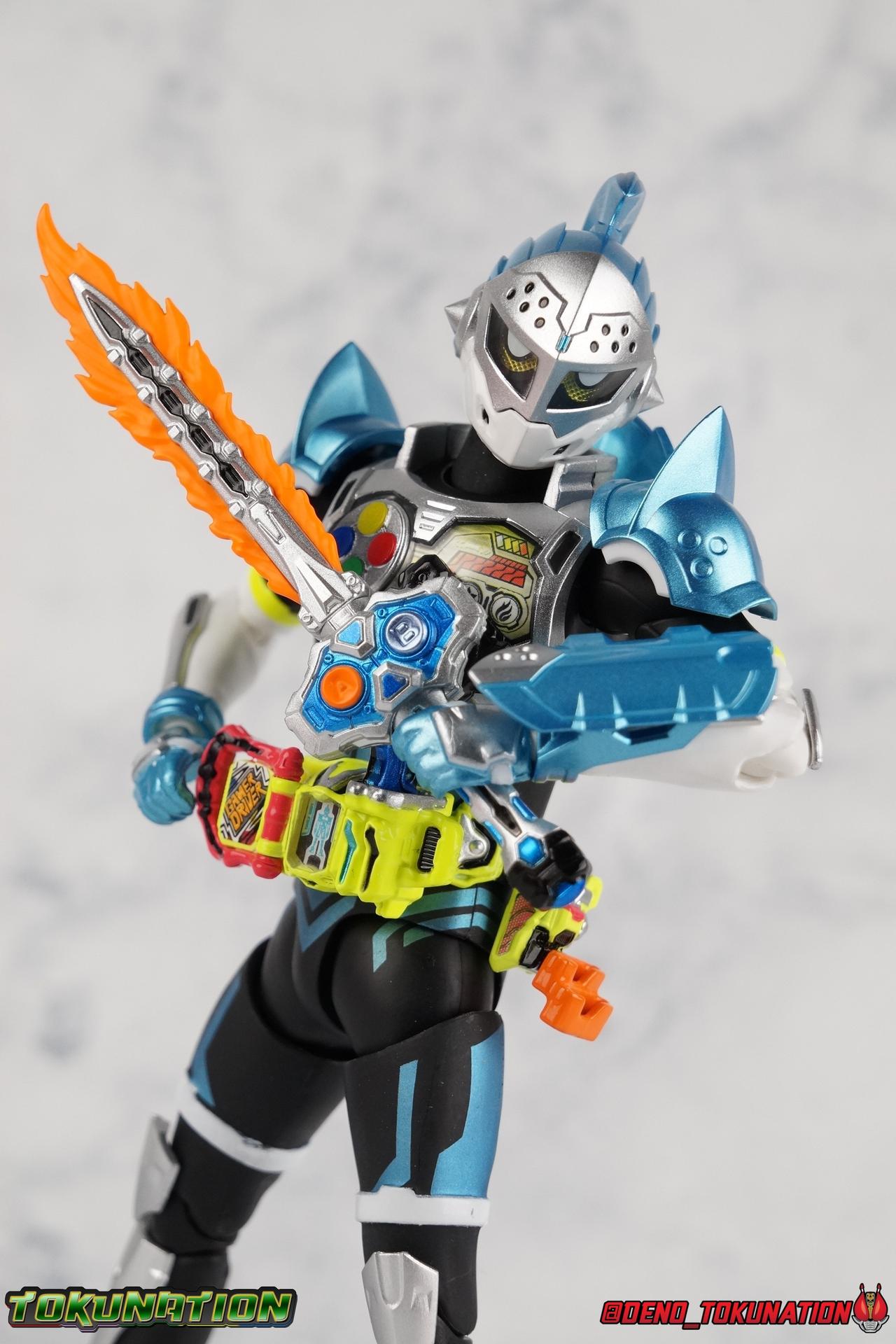 "Taddle Quest!" And we're back for part 2 of our Mighty Action X Beginning Set gallery series! Last time we took a look at the first rider in this set with S.H. Figuarts Kamen Rider Ex-Aid Action Gamer Level 2, this time we get to spend some time with the world's greatest surgeon, S.H Figuarts Kamen Rider Brave Quest Gamer Level 2! Each of the 3 figures in the Mighty Action set will be photographed separately. So that's 3 different full galleries! This gallery is part 2 of 3. We've already knocked out Ex-Aid, today takes care of Brave, and next time it's Snipe! Packaging The Mighty Action X Beginning set is a rather large 3-pack. Something that's rarely tried with figuarts release. The last 3-pack in recent memory was the Hakaider Squad set, that was a web exclusive release, and it didn't sell well. So for Bandai to take a chance on 3 unique riders from Ex-Aid, and release them at retail, that was pretty surprising. The box is a rather colorful 3-tone type that really pops, definitely befitting of the series it's from. Honestly the figures in box would make for a nice display piece if you'd like to pick up the individual figures to open too. It just looks good. The 3 riders come in one large tray with their hands, while the Mighty Action X stage as well as their unique weapons are in a separate tray below. Main Figure Obviously each Ex-Aid rider has a pretty radically different design, as with any series each character is unique. But they also tend to share some design influence, and in many cases parts reuse. The Ex-Aid line, at least so far as Level 2 forms are concerned is a prime example of this. Each suit has it's own unique detailing and colors, but at a basic level they feature the same mold. Sporty type shoes, the bike shorts look, the driver, the chest plate. You see what I mean. So although Ex-Aid and Brave Level 2 look very different, they also have a ton of similarities. So a good portion of my review will be very similar to that of Ex-Aid. If you'd like to skip a bit further down below then feel free as there will be a bit of rehash here. As with Ex-Aid, Brave features a ton of complex detail that we don't normally see each year. Paint apps and small molded details galore. Even more so than Ex-Aid, Brave is lavish. From the Ground up the new Ex-Aid type body is pretty solidly built. Though the ankles are still a huge fault for me. They don't have the full range of motion they need for Brave to assume many of the dynamic poses he's known for. You'll find that wide stances are just really really difficult to achieve, which means he's always gonna be a bit off balance. The knees have a great bend that helps add to Taddle Quest's sort of adventurous platformer theme. And all that being said, the paint apps for the legs are exquisite. I loved the black striping on Ex-Aids legs, but the blue detailing on top of the matte black finish on Brave's legs is really striking. That holds true for his entire under suit, it's just really gorgeous. One of the more elaborate pieces on the figure is the Gamer Driver itself. This entire device is extraordinarily detailed for something at this scale. The Driver handle can flip shut, thus hiding the rider read out on the front screen as well. The right of the driver has 2 slots for Gasshats. One is already attached in the form of the Taddle Quest Gasshat. It's kind of a dummy item though as it's really just the handle portion that pegs in. To the right of the driver, is a Gashat holster. There are 2 slots for extra Gasshats as well as 1 slot for a Critical Finish to be inserted. This whole assembly just looks fantastic. I'm taken back to Gaim Orange Arms and the wonderful design of his Sengoku Driver. This level of functionality is always impressive. I won't sell the rest of the upper body short either. Brave is absolutely breathtaking but his chest detailing is magnificent. The paint apps on the outer layer are crisp and clear, but I'm so impressed by the Rider Gauge label within his chest. Again, unlike Bandai's previous failures with labels (Kiwami Arms) this is flawless. On the flip side of the torso is the deactivated Level 1 head. As with Ex-Aid it's a bit stylized and shrunk down, but wow it looks good. It's such a strange detail for me to love but I do. Not to be forgotten are the arms, which admittedly only have one flaw that I'm bothered by, it's the same as with Ex-Aid. The shoulder pads. Every time I try to stretch the arms out it's like rather than sliding out properly the pads just pop off again. But it's a minor issue. The wrists are solid, the elbows fully functional and the bicep swivel welcome as always. Finally that brings us to the head. While Ex-Aid's head still seems to get a far bit criticism, I don't see how you could complain with Brave. That design is sharp, solid, and gorgeous. Somehow that head just wonderfully conveys Hiiro's dour attitude and sternness. It just oozes Mr. perfect surgeon. My only issue with it is the inconsistency of the white paint on the chin. Mine had a few flecks chipped off right out of the box, and I don't know that that's a common issue. But it bothers me a bit. Otherwise I think the shape & sculpt of the head are totally on point. It's a great new body mold with a brand new personality slapped onto it. I love it! Accessories Brave, much like Ex-Aid, comes with a pretty basic assortment but it's also basically everything you need for him: 4 - Sets of additional hands. That's 1 more set than Ex-Aid came with which I find odd, but I'll take it. Basically the only difference with Brave is the extra set is a totally open palm with spread fingers. 1 - Explosive Freezing Gashacon Sword. As the name implies this weapon carries both heat & cold abilities. In show this was represented by the blade transforming, on both sides, between the two forms. However this toy version opts for a blade that has fire on one side & ice on the other. It simply rotates at the base for whatever your preferred use is. It'