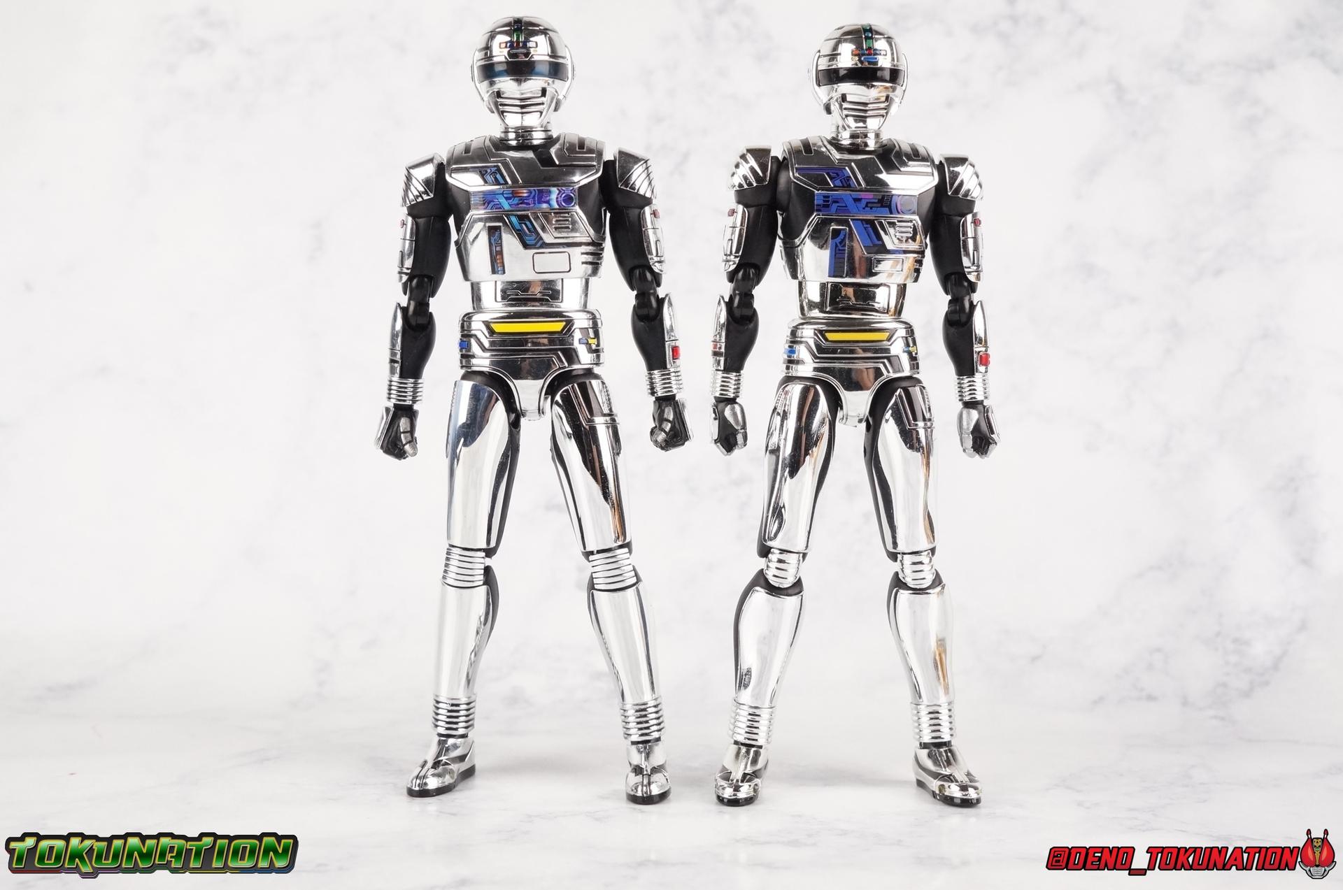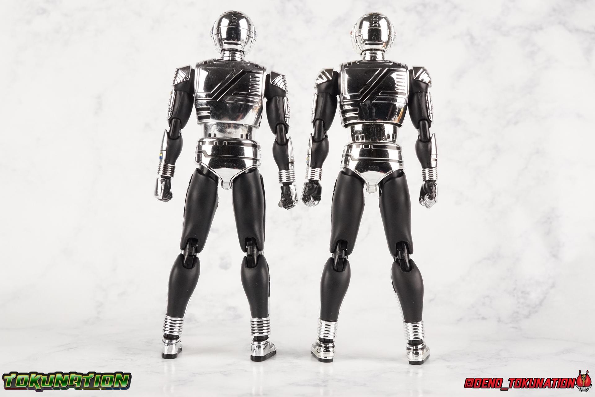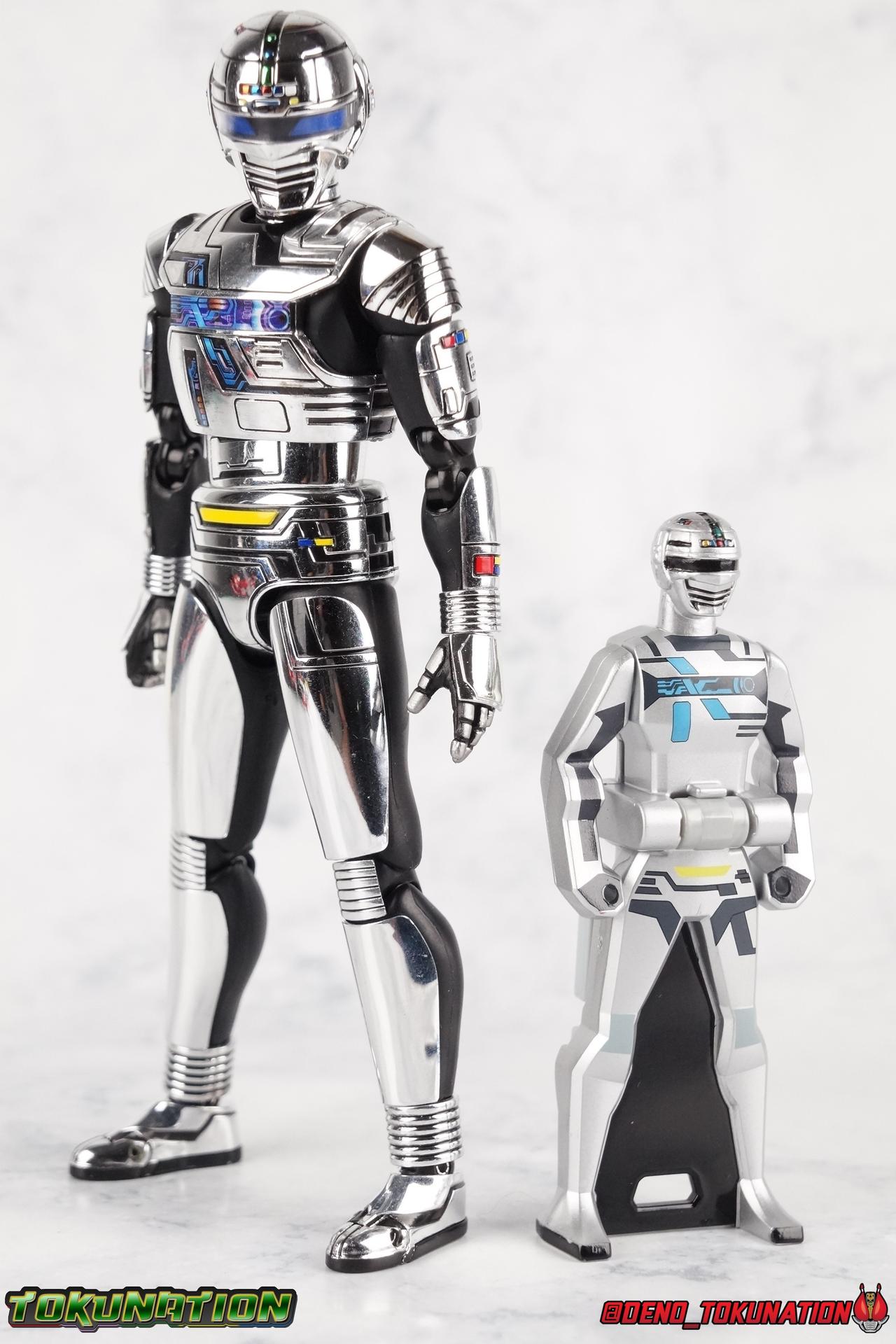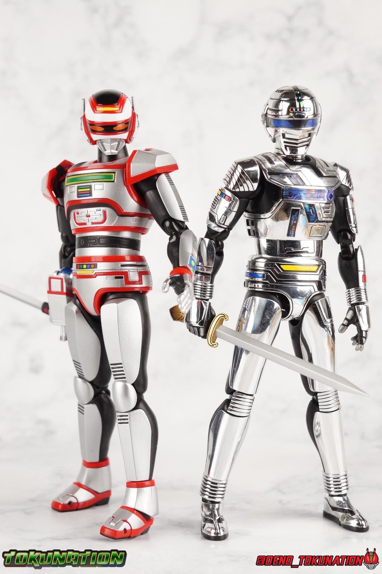 Over 4 years ago Tamashii Nations graced us with a pair of inaugural releases that launched the Metal Heroes sub-line for S.H. Figuarts. Back then we were treated to Gavan & his successor Gavan Type G. Now, during the new golden age of Metal Heroes it seems, Bandai is treating us to a pair of Renewals, one for each of these heroes! So today we're taking a look at the first of those released with S.H. Figuarts Space Sheriff Gavan Type G Space Squad Version! ** Physically this toy is very very similar to the original releases of Space Sheriff Gavan & Gavan Type G, though it's ostensibly meant to be a renewal of that mold. There are physical differences but the accessories and better paint apps are the most appreciable things you'll notice with this release. Just fair warning. Also, this gallery consists of 100+ images spread across the first 3 posts. So be sure to check out the whole thing! Packaging I actually really dig the new box that Bandai's come up with for Gavan Type G this time around. The first two Gavan releases both came in boxes that were themed around the original TV series aesthetic and each was partially color swapped to differentiate them from each other. This time it gets a bit more of a space theme going on thanks to the movie this release promotes. I just generally like it better to be honest. Main Figure So like I said up above, this mold is VERY similar to the original mold used for Gavan & Type G. In fact this one is simply a bit more thick and wide than that one. You'll notice wider hips, a more thick abdomen, a chest plate that sticks out a bit further, and just generally more clearance for these joints than the original had. But that's about it, ultimately these changes don't amount to a ton of appreciable improvements. So be forewarned this review will have many similarities to my old original Gavan gallery. Note that in comparison shots, the Space Squad version will be on the left with the original Type G on the right. Now with the statements I made above out of the way, I want to start by saying that this mold really is a great improvement over the original. It's not immediately something you notice, but more something that comes to mind as you handle it further. Starting at the bottom, the feet don't get a lot more clearance, so there isn't much to talk about there. The knees have the same old bends, but the hips are vastly improved. Not only are they stronger, no more sagging joints, but they have much more clearance for rotating than the old one. And that brings us up to the waist, where with the old one it was very gaunt and narrow, looking very awkward from the sides. This version beefs things up nicely enough to make it look like a real person is conceivably in there. And there isn't a ton of articulation lost either. By far the greatest improvement of the new Type G is the chest and head details. They are far more bright and elaborate, matching his appearance in Space Squad and in fact his first appearance in Gavan The Movie. I had never realized until now just how inaccurate the chest detailing on the first Type G was. Also you can see Gavan's "eyes" beneath the standard black visor quite a bit better. They should always be at least partially visible like this. Even when you aren't using the included laser scope head. So this release gets top marks for this as well. The head itself is a hair larger and more proportional to the body than the first release as well. Just adding to the overall improved look of this release over the original. I'll also mention that the arms aren't terribly different from the first one, though the shoulders seem to have much better clearance than before. But the hands, my god the best improvement is right there. You can actually change out the hands without fear of shearing off a razor thin wrist peg in the process, which happened with the first original Type G I owned and was very common throughout that production run. Ultimately this figure may not appear physically to be all that different. But in reality the small changes and differences made to it from the first release really are appreciable. I have to say I'm still fairly unsatisfied with the chrome applications this go around. While not inaccurate, the imperfections, scratches, and smudging to the chrome make it look like a used product. But all of these imperfections were present straight out of the box well. I wish Bandai would go with a more flat gray metallic paint app, like those on Juspion. But the reflective chrome is more accurate I suppose. A better application process needs to be used is all. Accessories This section is where the biggest differences between the the original release and the Space Squad one exist: 1 - Laser Scope head. This alternate head replicates Type G's visor lighting up as it does periodically. Originally an ability meant to allow classic Gavan to detect invisible monsters, it's since become synonymous with moments of either character powering up, or having showy flashy action. It's my preferred way to display this figure actually. I like how the eyes really pop. 3 - sets of additional hands. One set for weapon holding, one set of open palms, then a split pair that includes a flat karate chop style hand, and one with a set of two fingers pointing forward to recreate the Lazer Z Beam attack, or to hold the end of the Laser Blade. 1 - Laser Blade (Origin Version). A blade forged on Juspion's homeworld, one who can wield it properly is assured victory. This is the one weapon which sets apart this version from the original Type G release. That release came packed with the same classic Laser Blade that classic Gavan did. Both of the Gavan figuarts were packed with it. This new Origin version is a bit more ornate and elaborate in design. It's also the version of the Laser Blade that Geki/Type G is seen using in the Space Squad film after Mad Gallant destroys the original. So while the actual figuart itself may be similar physically to the 1st 