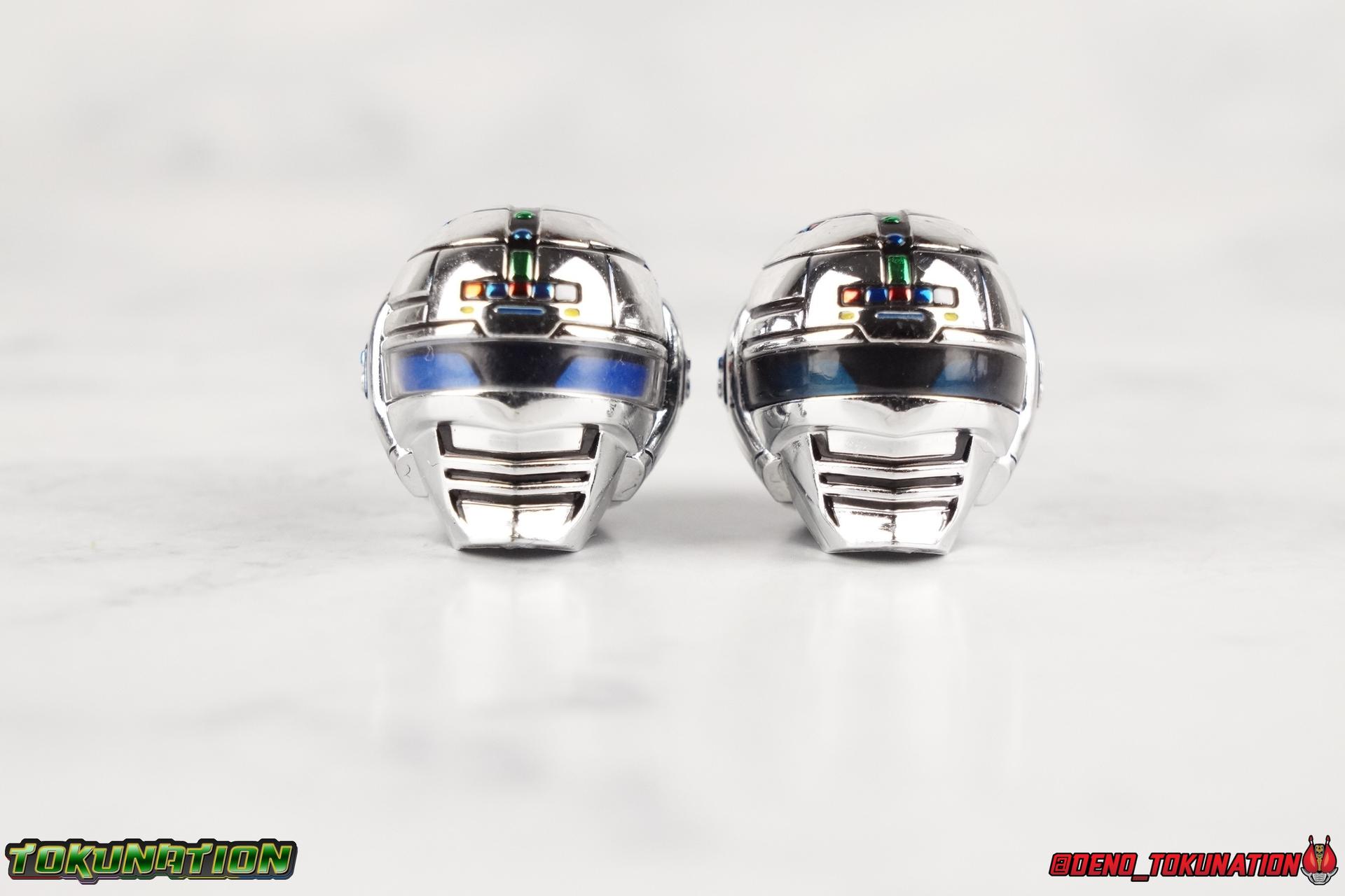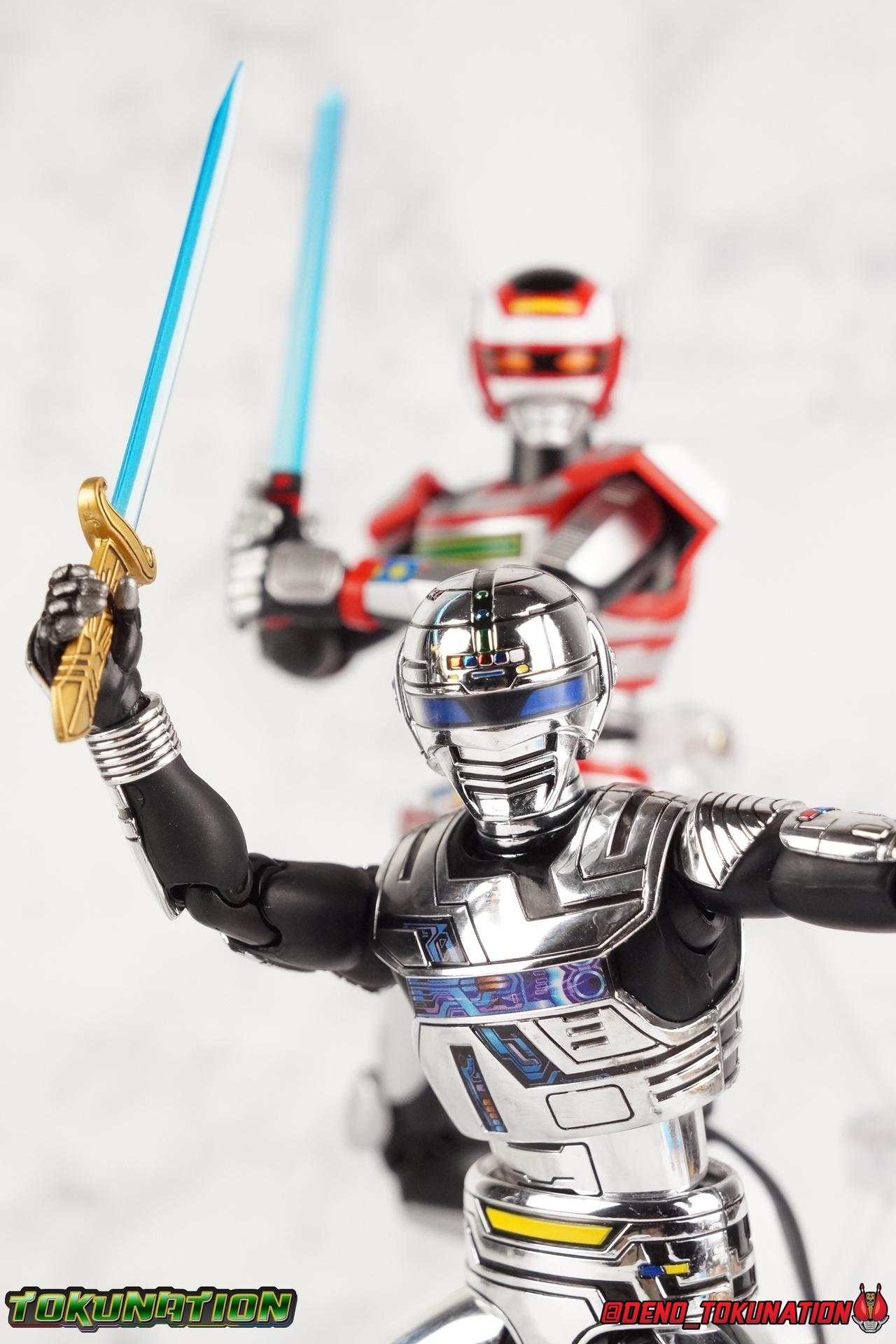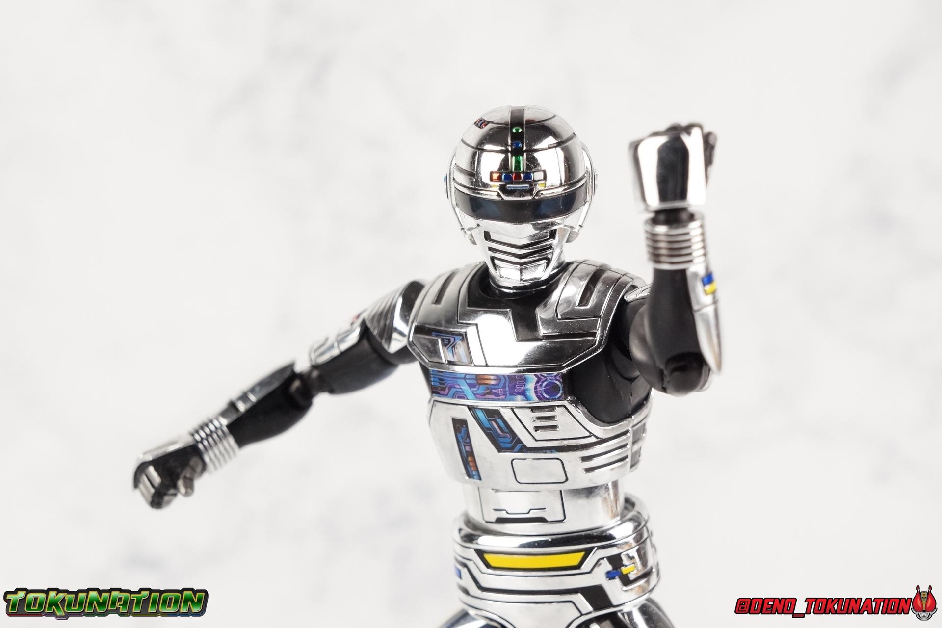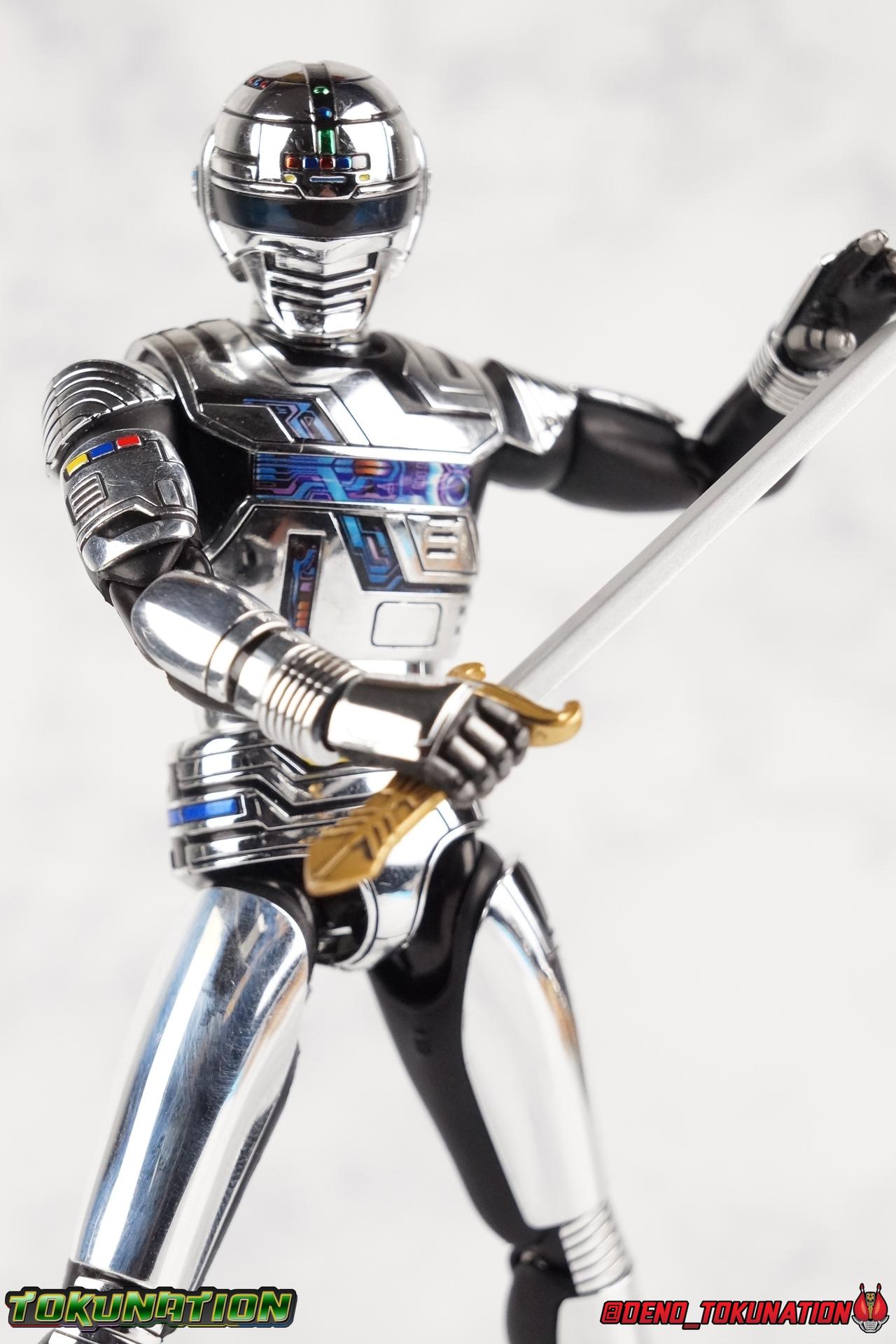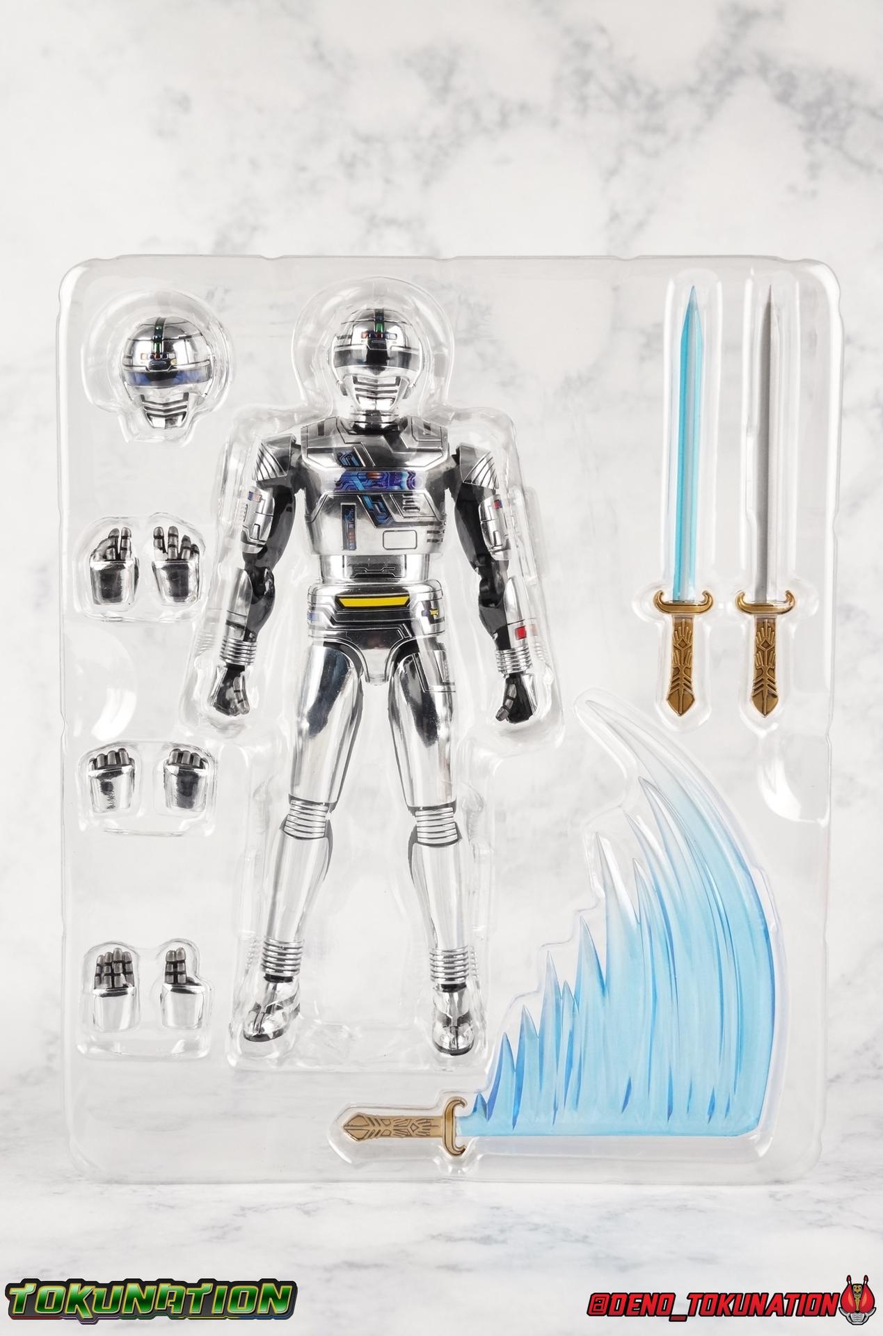 Over 4 years ago Tamashii Nations graced us with a pair of inaugural releases that launched the Metal Heroes sub-line for S.H. Figuarts. Back then we were treated to Gavan & his successor Gavan Type G. Now, during the new golden age of Metal Heroes it seems, Bandai is treating us to a pair of Renewals, one for each of these heroes! So today we're taking a look at the first of those released with S.H. Figuarts Space Sheriff Gavan Type G Space Squad Version! ** Physically this toy is very very similar to the original releases of Space Sheriff Gavan & Gavan Type G, though it's ostensibly meant to be a renewal of that mold. There are physical differences but the accessories and better paint apps are the most appreciable things you'll notice with this release. Just fair warning. Also, this gallery consists of 100+ images spread across the first 3 posts. So be sure to check out the whole thing! Packaging I actually really dig the new box that Bandai's come up with for Gavan Type G this time around. The first two Gavan releases both came in boxes that were themed around the original TV series aesthetic and each was partially color swapped to differentiate them from each other. This time it gets a bit more of a space theme going on thanks to the movie this release promotes. I just generally like it better to be honest. Main Figure So like I said up above, this mold is VERY similar to the original mold used for Gavan & Type G. In fact this one is simply a bit more thick and wide than that one. You'll notice wider hips, a more thick abdomen, a chest plate that sticks out a bit further, and just generally more clearance for these joints than the original had. But that's about it, ultimately these changes don't amount to a ton of appreciable improvements. So be forewarned this review will have many similarities to my old original Gavan gallery. Note that in comparison shots, the Space Squad version will be on the left with the original Type G on the right. Now with the statements I made above out of the way, I want to start by saying that this mold really is a great improvement over the original. It's not immediately something you notice, but more something that comes to mind as you handle it further. Starting at the bottom, the feet don't get a lot more clearance, so there isn't much to talk about there. The knees have the same old bends, but the hips are vastly improved. Not only are they stronger, no more sagging joints, but they have much more clearance for rotating than the old one. And that brings us up to the waist, where with the old one it was very gaunt and narrow, looking very awkward from the sides. This version beefs things up nicely enough to make it look like a real person is conceivably in there. And there isn't a ton of articulation lost either. By far the greatest improvement of the new Type G is the chest and head details. They are far more bright and elaborate, matching his appearance in Space Squad and in fact his first appearance in Gavan The Movie. I had never realized until now just how inaccurate the chest detailing on the first Type G was. Also you can see Gavan's "eyes" beneath the standard black visor quite a bit better. They should always be at least partially visible like this. Even when you aren't using the included laser scope head. So this release gets top marks for this as well. The head itself is a hair larger and more proportional to the body than the first release as well. Just adding to the overall improved look of this release over the original. I'll also mention that the arms aren't terribly different from the first one, though the shoulders seem to have much better clearance than before. But the hands, my god the best improvement is right there. You can actually change out the hands without fear of shearing off a razor thin wrist peg in the process, which happened with the first original Type G I owned and was very common throughout that production run. Ultimately this figure may not appear physically to be all that different. But in reality the small changes and differences made to it from the first release really are appreciable. I have to say I'm still fairly unsatisfied with the chrome applications this go around. While not inaccurate, the imperfections, scratches, and smudging to the chrome make it look like a used product. But all of these imperfections were present straight out of the box well. I wish Bandai would go with a more flat gray metallic paint app, like those on Juspion. But the reflective chrome is more accurate I suppose. A better application process needs to be used is all. Accessories This section is where the biggest differences between the the original release and the Space Squad one exist: 1 - Laser Scope head. This alternate head replicates Type G's visor lighting up as it does periodically. Originally an ability meant to allow classic Gavan to detect invisible monsters, it's since become synonymous with moments of either character powering up, or having showy flashy action. It's my preferred way to display this figure actually. I like how the eyes really pop. 3 - sets of additional hands. One set for weapon holding, one set of open palms, then a split pair that includes a flat karate chop style hand, and one with a set of two fingers pointing forward to recreate the Lazer Z Beam attack, or to hold the end of the Laser Blade. 1 - Laser Blade (Origin Version). A blade forged on Juspion's homeworld, one who can wield it properly is assured victory. This is the one weapon which sets apart this version from the original Type G release. That release came packed with the same classic Laser Blade that classic Gavan did. Both of the Gavan figuarts were packed with it. This new Origin version is a bit more ornate and elaborate in design. It's also the version of the Laser Blade that Geki/Type G is seen using in the Space Squad film after Mad Gallant destroys the original. So while the actual figuart itself may be similar physically to the 1st 