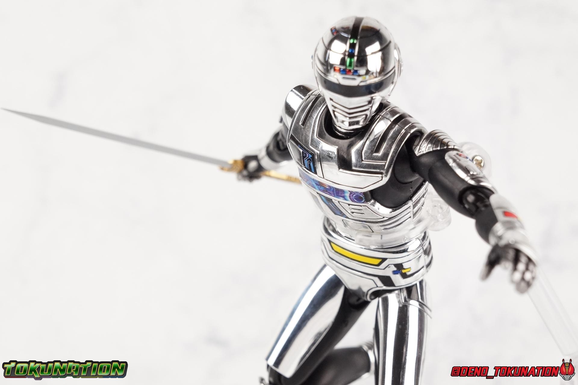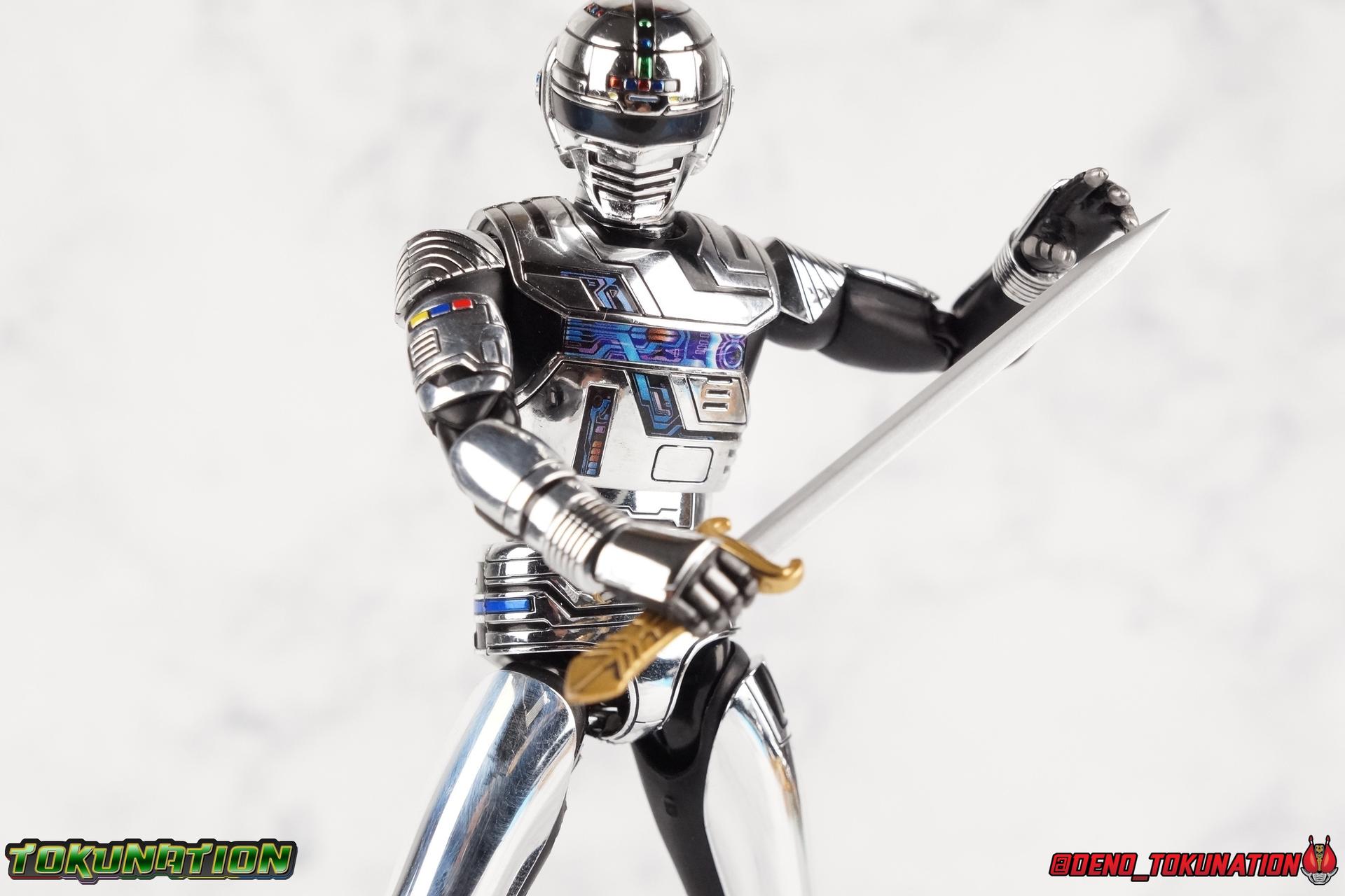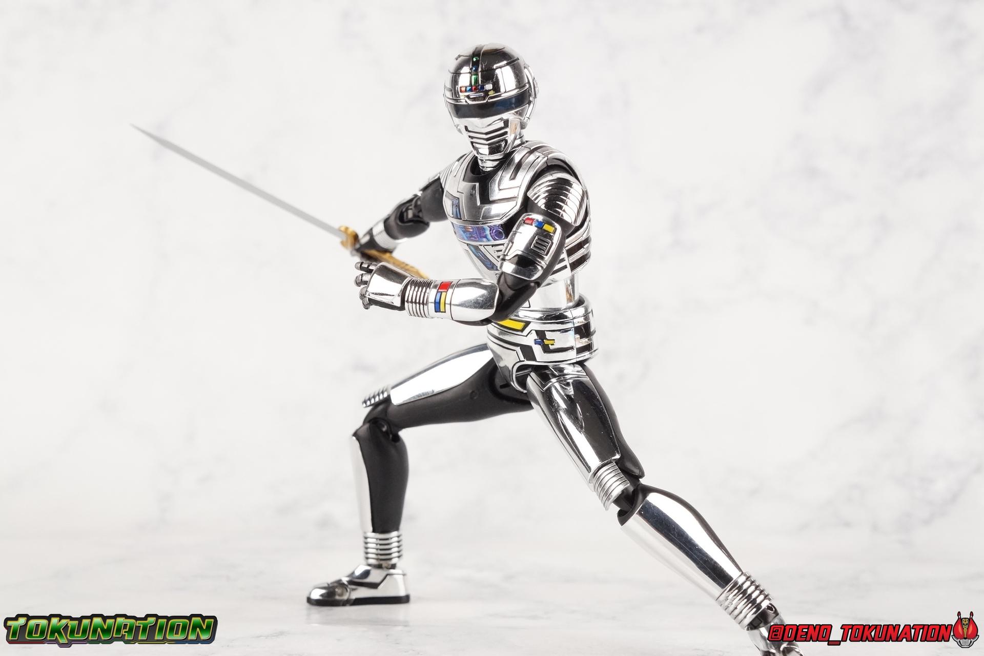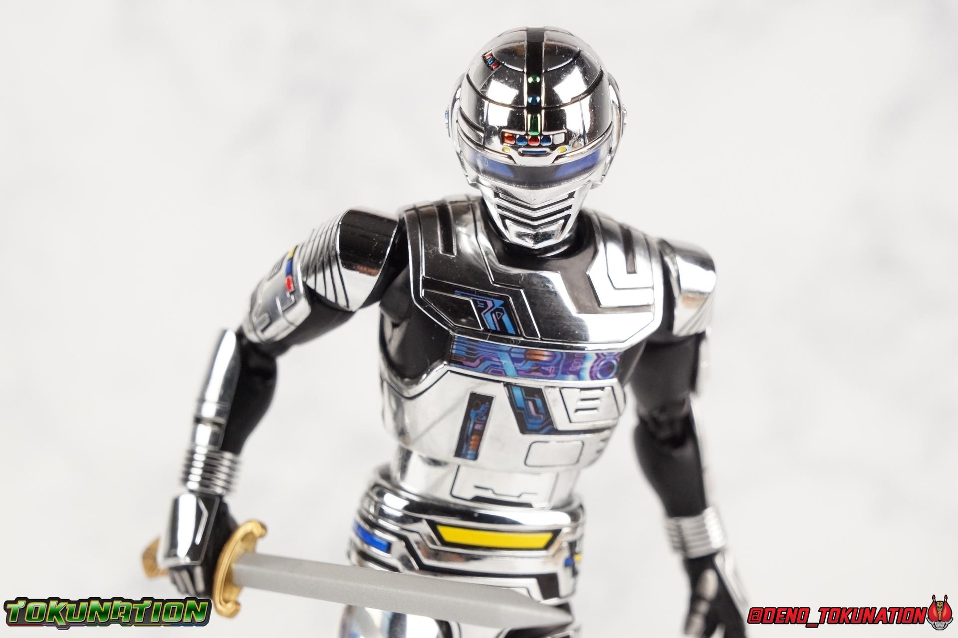 Over 4 years ago Tamashii Nations graced us with a pair of inaugural releases that launched the Metal Heroes sub-line for S.H. Figuarts. Back then we were treated to Gavan & his successor Gavan Type G. Now, during the new golden age of Metal Heroes it seems, Bandai is treating us to a pair of Renewals, one for each of these heroes! So today we're taking a look at the first of those released with S.H. Figuarts Space Sheriff Gavan Type G Space Squad Version! ** Physically this toy is very very similar to the original releases of Space Sheriff Gavan & Gavan Type G, though it's ostensibly meant to be a renewal of that mold. There are physical differences but the accessories and better paint apps are the most appreciable things you'll notice with this release. Just fair warning. Also, this gallery consists of 100+ images spread across the first 3 posts. So be sure to check out the whole thing! Packaging I actually really dig the new box that Bandai's come up with for Gavan Type G this time around. The first two Gavan releases both came in boxes that were themed around the original TV series aesthetic and each was partially color swapped to differentiate them from each other. This time it gets a bit more of a space theme going on thanks to the movie this release promotes. I just generally like it better to be honest. Main Figure So like I said up above, this mold is VERY similar to the original mold used for Gavan & Type G. In fact this one is simply a bit more thick and wide than that one. You'll notice wider hips, a more thick abdomen, a chest plate that sticks out a bit further, and just generally more clearance for these joints than the original had. But that's about it, ultimately these changes don't amount to a ton of appreciable improvements. So be forewarned this review will have many similarities to my old original Gavan gallery. Note that in comparison shots, the Space Squad version will be on the left with the original Type G on the right. Now with the statements I made above out of the way, I want to start by saying that this mold really is a great improvement over the original. It's not immediately something you notice, but more something that comes to mind as you handle it further. Starting at the bottom, the feet don't get a lot more clearance, so there isn't much to talk about there. The knees have the same old bends, but the hips are vastly improved. Not only are they stronger, no more sagging joints, but they have much more clearance for rotating than the old one. And that brings us up to the waist, where with the old one it was very gaunt and narrow, looking very awkward from the sides. This version beefs things up nicely enough to make it look like a real person is conceivably in there. And there isn't a ton of articulation lost either. By far the greatest improvement of the new Type G is the chest and head details. They are far more bright and elaborate, matching his appearance in Space Squad and in fact his first appearance in Gavan The Movie. I had never realized until now just how inaccurate the chest detailing on the first Type G was. Also you can see Gavan's "eyes" beneath the standard black visor quite a bit better. They should always be at least partially visible like this. Even when you aren't using the included laser scope head. So this release gets top marks for this as well. The head itself is a hair larger and more proportional to the body than the first release as well. Just adding to the overall improved look of this release over the original. I'll also mention that the arms aren't terribly different from the first one, though the shoulders seem to have much better clearance than before. But the hands, my god the best improvement is right there. You can actually change out the hands without fear of shearing off a razor thin wrist peg in the process, which happened with the first original Type G I owned and was very common throughout that production run. Ultimately this figure may not appear physically to be all that different. But in reality the small changes and differences made to it from the first release really are appreciable. I have to say I'm still fairly unsatisfied with the chrome applications this go around. While not inaccurate, the imperfections, scratches, and smudging to the chrome make it look like a used product. But all of these imperfections were present straight out of the box well. I wish Bandai would go with a more flat gray metallic paint app, like those on Juspion. But the reflective chrome is more accurate I suppose. A better application process needs to be used is all. Accessories This section is where the biggest differences between the the original release and the Space Squad one exist: 1 - Laser Scope head. This alternate head replicates Type G's visor lighting up as it does periodically. Originally an ability meant to allow classic Gavan to detect invisible monsters, it's since become synonymous with moments of either character powering up, or having showy flashy action. It's my preferred way to display this figure actually. I like how the eyes really pop. 3 - sets of additional hands. One set for weapon holding, one set of open palms, then a split pair that includes a flat karate chop style hand, and one with a set of two fingers pointing forward to recreate the Lazer Z Beam attack, or to hold the end of the Laser Blade. 1 - Laser Blade (Origin Version). A blade forged on Juspion's homeworld, one who can wield it properly is assured victory. This is the one weapon which sets apart this version from the original Type G release. That release came packed with the same classic Laser Blade that classic Gavan did. Both of the Gavan figuarts were packed with it. This new Origin version is a bit more ornate and elaborate in design. It's also the version of the Laser Blade that Geki/Type G is seen using in the Space Squad film after Mad Gallant destroys the original. So while the actual figuart itself may be similar physically to the 1st 