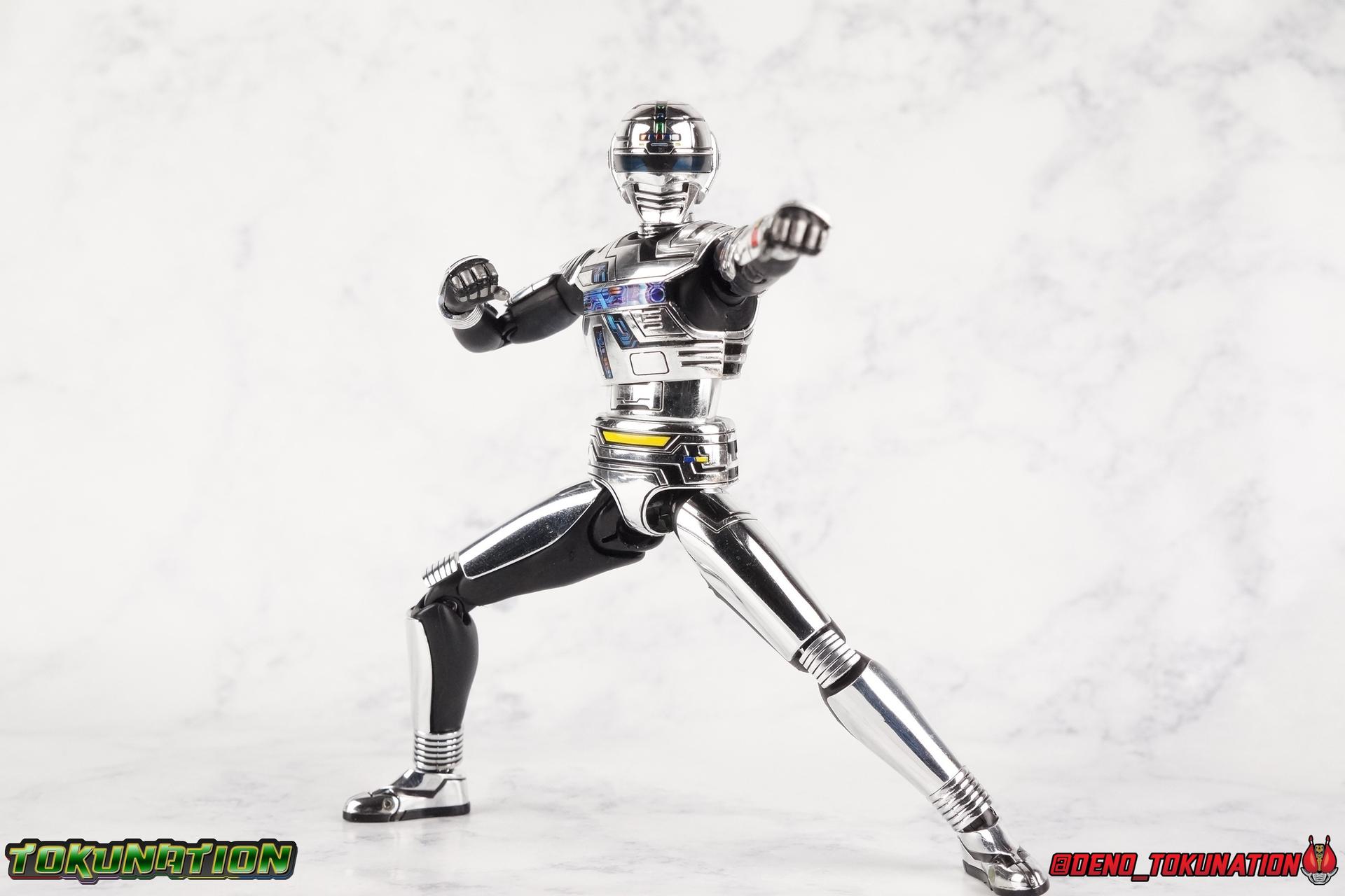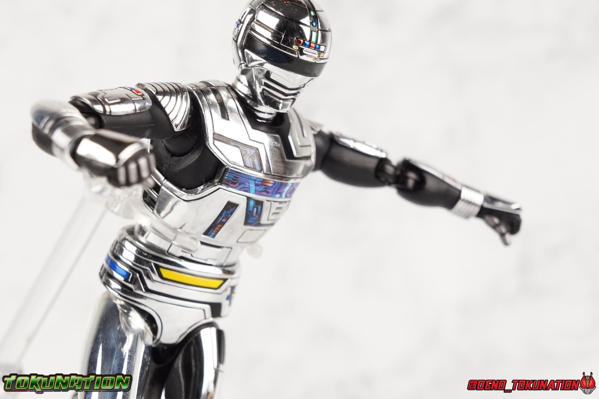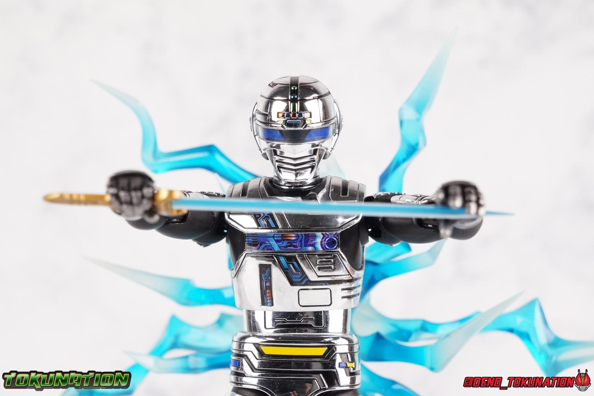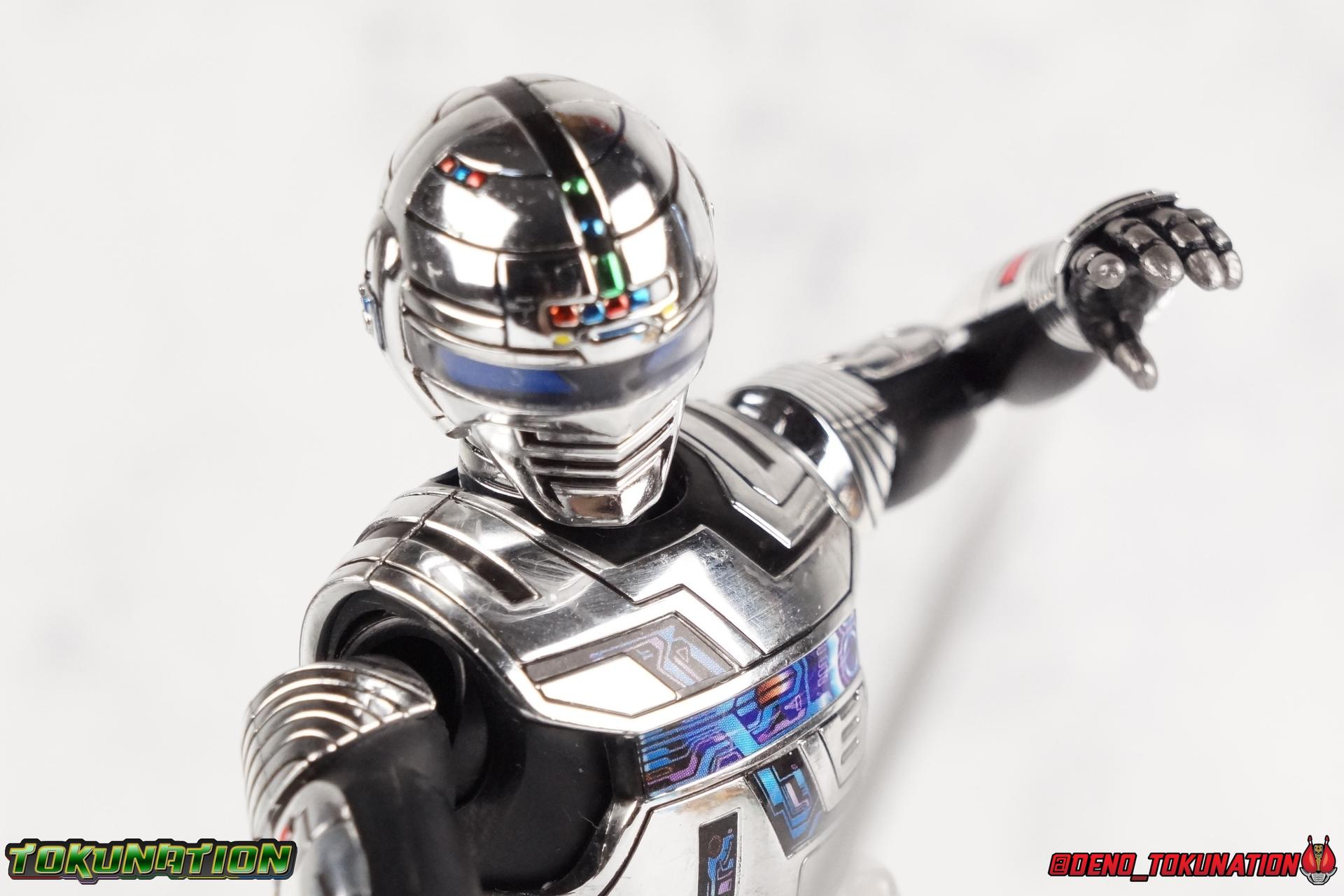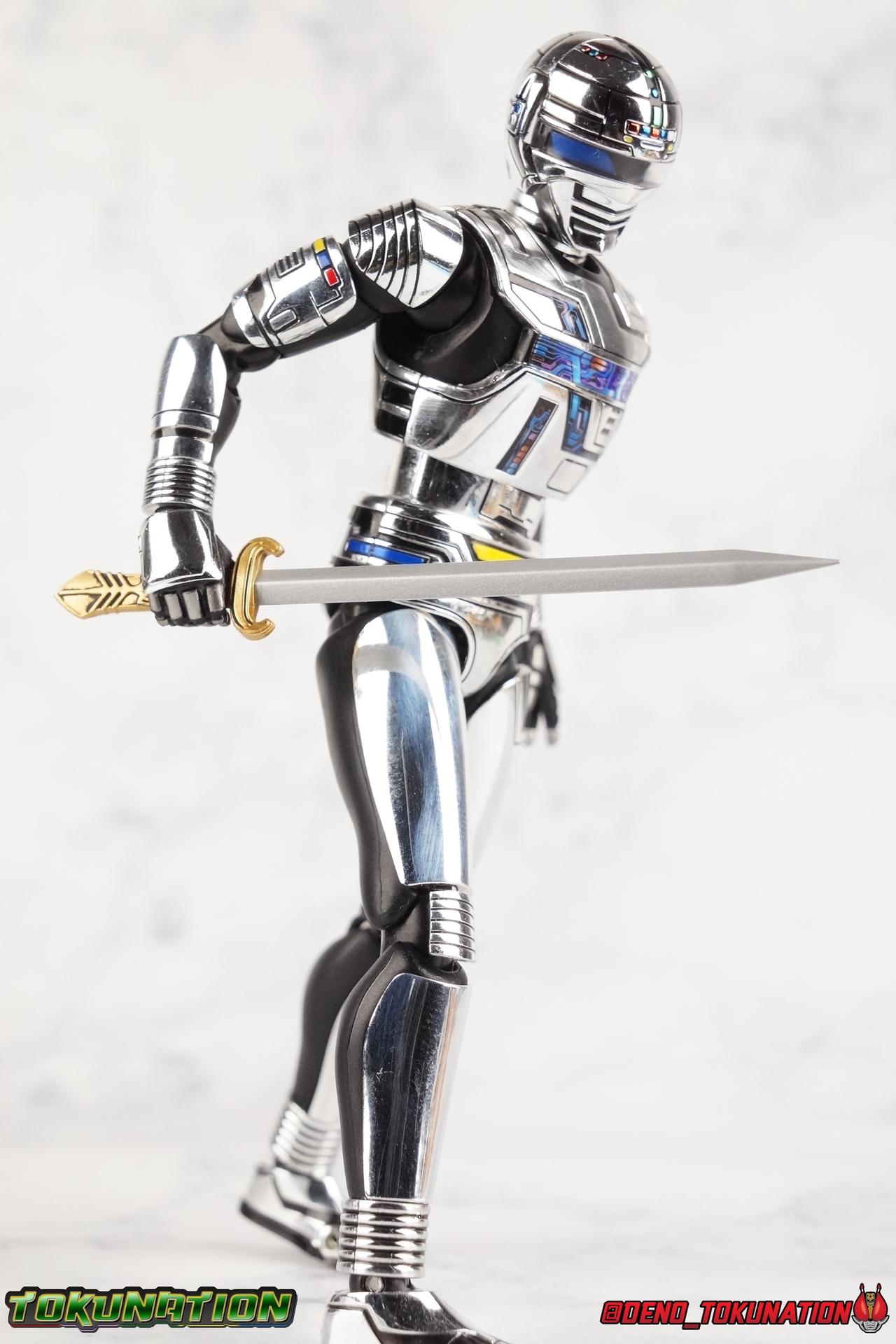 Over 4 years ago Tamashii Nations graced us with a pair of inaugural releases that launched the Metal Heroes sub-line for S.H. Figuarts. Back then we were treated to Gavan & his successor Gavan Type G. Now, during the new golden age of Metal Heroes it seems, Bandai is treating us to a pair of Renewals, one for each of these heroes! So today we're taking a look at the first of those released with S.H. Figuarts Space Sheriff Gavan Type G Space Squad Version! ** Physically this toy is very very similar to the original releases of Space Sheriff Gavan & Gavan Type G, though it's ostensibly meant to be a renewal of that mold. There are physical differences but the accessories and better paint apps are the most appreciable things you'll notice with this release. Just fair warning. Also, this gallery consists of 100+ images spread across the first 3 posts. So be sure to check out the whole thing! Packaging I actually really dig the new box that Bandai's come up with for Gavan Type G this time around. The first two Gavan releases both came in boxes that were themed around the original TV series aesthetic and each was partially color swapped to differentiate them from each other. This time it gets a bit more of a space theme going on thanks to the movie this release promotes. I just generally like it better to be honest. Main Figure So like I said up above, this mold is VERY similar to the original mold used for Gavan & Type G. In fact this one is simply a bit more thick and wide than that one. You'll notice wider hips, a more thick abdomen, a chest plate that sticks out a bit further, and just generally more clearance for these joints than the original had. But that's about it, ultimately these changes don't amount to a ton of appreciable improvements. So be forewarned this review will have many similarities to my old original Gavan gallery. Note that in comparison shots, the Space Squad version will be on the left with the original Type G on the right. Now with the statements I made above out of the way, I want to start by saying that this mold really is a great improvement over the original. It's not immediately something you notice, but more something that comes to mind as you handle it further. Starting at the bottom, the feet don't get a lot more clearance, so there isn't much to talk about there. The knees have the same old bends, but the hips are vastly improved. Not only are they stronger, no more sagging joints, but they have much more clearance for rotating than the old one. And that brings us up to the waist, where with the old one it was very gaunt and narrow, looking very awkward from the sides. This version beefs things up nicely enough to make it look like a real person is conceivably in there. And there isn't a ton of articulation lost either. By far the greatest improvement of the new Type G is the chest and head details. They are far more bright and elaborate, matching his appearance in Space Squad and in fact his first appearance in Gavan The Movie. I had never realized until now just how inaccurate the chest detailing on the first Type G was. Also you can see Gavan's "eyes" beneath the standard black visor quite a bit better. They should always be at least partially visible like this. Even when you aren't using the included laser scope head. So this release gets top marks for this as well. The head itself is a hair larger and more proportional to the body than the first release as well. Just adding to the overall improved look of this release over the original. I'll also mention that the arms aren't terribly different from the first one, though the shoulders seem to have much better clearance than before. But the hands, my god the best improvement is right there. You can actually change out the hands without fear of shearing off a razor thin wrist peg in the process, which happened with the first original Type G I owned and was very common throughout that production run. Ultimately this figure may not appear physically to be all that different. But in reality the small changes and differences made to it from the first release really are appreciable. I have to say I'm still fairly unsatisfied with the chrome applications this go around. While not inaccurate, the imperfections, scratches, and smudging to the chrome make it look like a used product. But all of these imperfections were present straight out of the box well. I wish Bandai would go with a more flat gray metallic paint app, like those on Juspion. But the reflective chrome is more accurate I suppose. A better application process needs to be used is all. Accessories This section is where the biggest differences between the the original release and the Space Squad one exist: 1 - Laser Scope head. This alternate head replicates Type G's visor lighting up as it does periodically. Originally an ability meant to allow classic Gavan to detect invisible monsters, it's since become synonymous with moments of either character powering up, or having showy flashy action. It's my preferred way to display this figure actually. I like how the eyes really pop. 3 - sets of additional hands. One set for weapon holding, one set of open palms, then a split pair that includes a flat karate chop style hand, and one with a set of two fingers pointing forward to recreate the Lazer Z Beam attack, or to hold the end of the Laser Blade. 1 - Laser Blade (Origin Version). A blade forged on Juspion's homeworld, one who can wield it properly is assured victory. This is the one weapon which sets apart this version from the original Type G release. That release came packed with the same classic Laser Blade that classic Gavan did. Both of the Gavan figuarts were packed with it. This new Origin version is a bit more ornate and elaborate in design. It's also the version of the Laser Blade that Geki/Type G is seen using in the Space Squad film after Mad Gallant destroys the original. So while the actual figuart itself may be similar physically to the 1st 