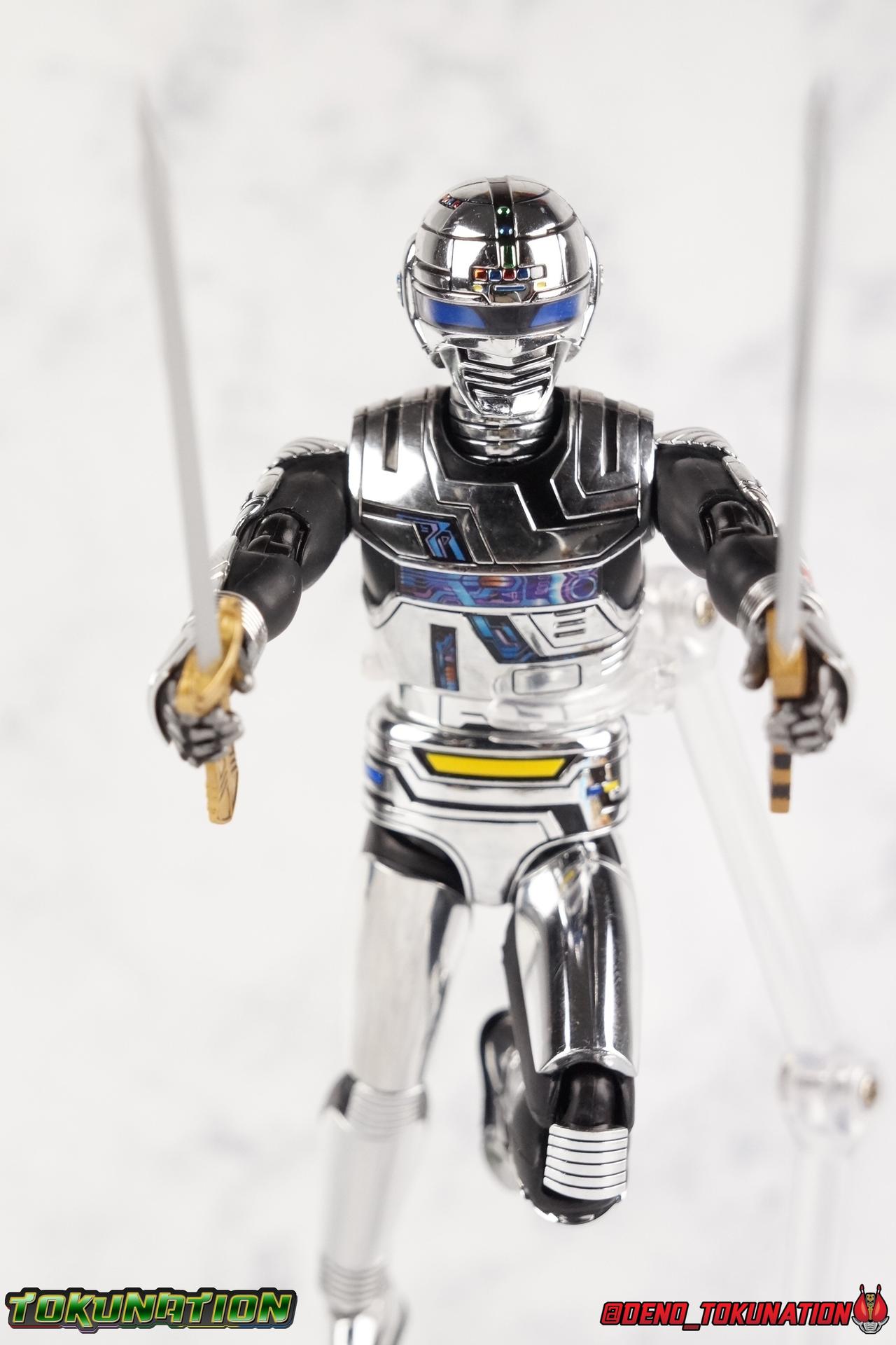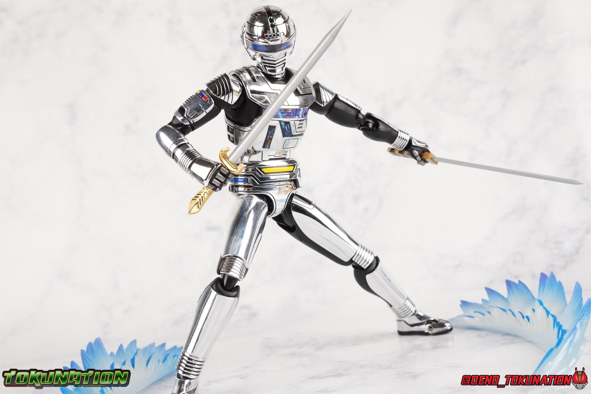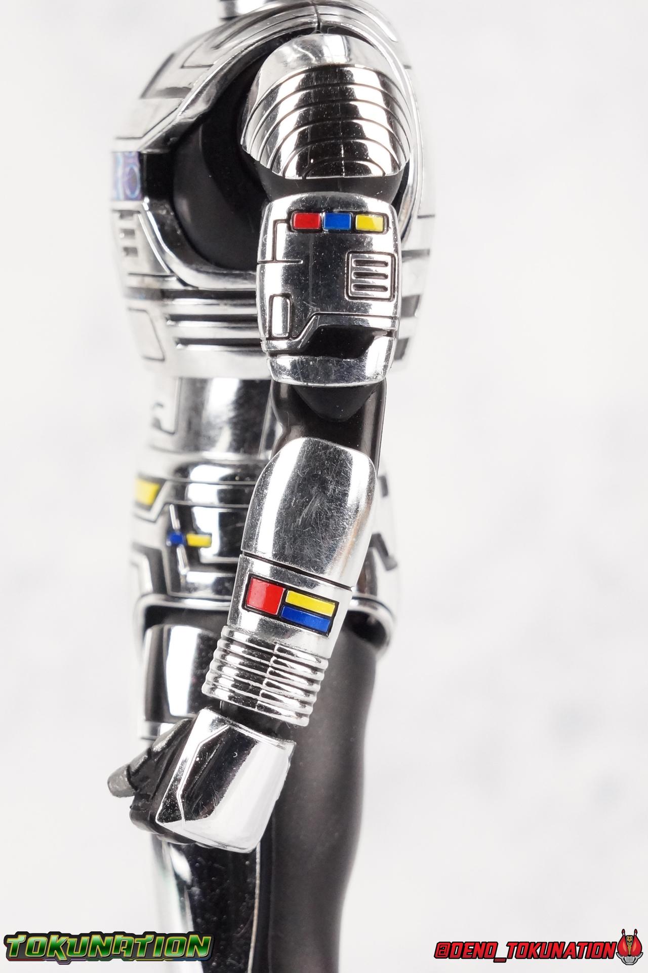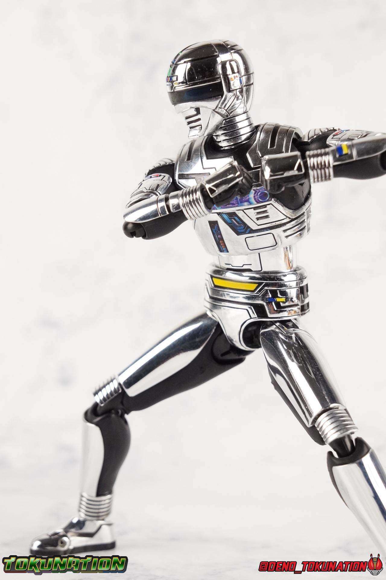 Over 4 years ago Tamashii Nations graced us with a pair of inaugural releases that launched the Metal Heroes sub-line for S.H. Figuarts. Back then we were treated to Gavan & his successor Gavan Type G. Now, during the new golden age of Metal Heroes it seems, Bandai is treating us to a pair of Renewals, one for each of these heroes! So today we're taking a look at the first of those released with S.H. Figuarts Space Sheriff Gavan Type G Space Squad Version! ** Physically this toy is very very similar to the original releases of Space Sheriff Gavan & Gavan Type G, though it's ostensibly meant to be a renewal of that mold. There are physical differences but the accessories and better paint apps are the most appreciable things you'll notice with this release. Just fair warning. Also, this gallery consists of 100+ images spread across the first 3 posts. So be sure to check out the whole thing! Packaging I actually really dig the new box that Bandai's come up with for Gavan Type G this time around. The first two Gavan releases both came in boxes that were themed around the original TV series aesthetic and each was partially color swapped to differentiate them from each other. This time it gets a bit more of a space theme going on thanks to the movie this release promotes. I just generally like it better to be honest. Main Figure So like I said up above, this mold is VERY similar to the original mold used for Gavan & Type G. In fact this one is simply a bit more thick and wide than that one. You'll notice wider hips, a more thick abdomen, a chest plate that sticks out a bit further, and just generally more clearance for these joints than the original had. But that's about it, ultimately these changes don't amount to a ton of appreciable improvements. So be forewarned this review will have many similarities to my old original Gavan gallery. Note that in comparison shots, the Space Squad version will be on the left with the original Type G on the right. Now with the statements I made above out of the way, I want to start by saying that this mold really is a great improvement over the original. It's not immediately something you notice, but more something that comes to mind as you handle it further. Starting at the bottom, the feet don't get a lot more clearance, so there isn't much to talk about there. The knees have the same old bends, but the hips are vastly improved. Not only are they stronger, no more sagging joints, but they have much more clearance for rotating than the old one. And that brings us up to the waist, where with the old one it was very gaunt and narrow, looking very awkward from the sides. This version beefs things up nicely enough to make it look like a real person is conceivably in there. And there isn't a ton of articulation lost either. By far the greatest improvement of the new Type G is the chest and head details. They are far more bright and elaborate, matching his appearance in Space Squad and in fact his first appearance in Gavan The Movie. I had never realized until now just how inaccurate the chest detailing on the first Type G was. Also you can see Gavan's "eyes" beneath the standard black visor quite a bit better. They should always be at least partially visible like this. Even when you aren't using the included laser scope head. So this release gets top marks for this as well. The head itself is a hair larger and more proportional to the body than the first release as well. Just adding to the overall improved look of this release over the original. I'll also mention that the arms aren't terribly different from the first one, though the shoulders seem to have much better clearance than before. But the hands, my god the best improvement is right there. You can actually change out the hands without fear of shearing off a razor thin wrist peg in the process, which happened with the first original Type G I owned and was very common throughout that production run. Ultimately this figure may not appear physically to be all that different. But in reality the small changes and differences made to it from the first release really are appreciable. I have to say I'm still fairly unsatisfied with the chrome applications this go around. While not inaccurate, the imperfections, scratches, and smudging to the chrome make it look like a used product. But all of these imperfections were present straight out of the box well. I wish Bandai would go with a more flat gray metallic paint app, like those on Juspion. But the reflective chrome is more accurate I suppose. A better application process needs to be used is all. Accessories This section is where the biggest differences between the the original release and the Space Squad one exist: 1 - Laser Scope head. This alternate head replicates Type G's visor lighting up as it does periodically. Originally an ability meant to allow classic Gavan to detect invisible monsters, it's since become synonymous with moments of either character powering up, or having showy flashy action. It's my preferred way to display this figure actually. I like how the eyes really pop. 3 - sets of additional hands. One set for weapon holding, one set of open palms, then a split pair that includes a flat karate chop style hand, and one with a set of two fingers pointing forward to recreate the Lazer Z Beam attack, or to hold the end of the Laser Blade. 1 - Laser Blade (Origin Version). A blade forged on Juspion's homeworld, one who can wield it properly is assured victory. This is the one weapon which sets apart this version from the original Type G release. That release came packed with the same classic Laser Blade that classic Gavan did. Both of the Gavan figuarts were packed with it. This new Origin version is a bit more ornate and elaborate in design. It's also the version of the Laser Blade that Geki/Type G is seen using in the Space Squad film after Mad Gallant destroys the original. So while the actual figuart itself may be similar physically to the 1st 