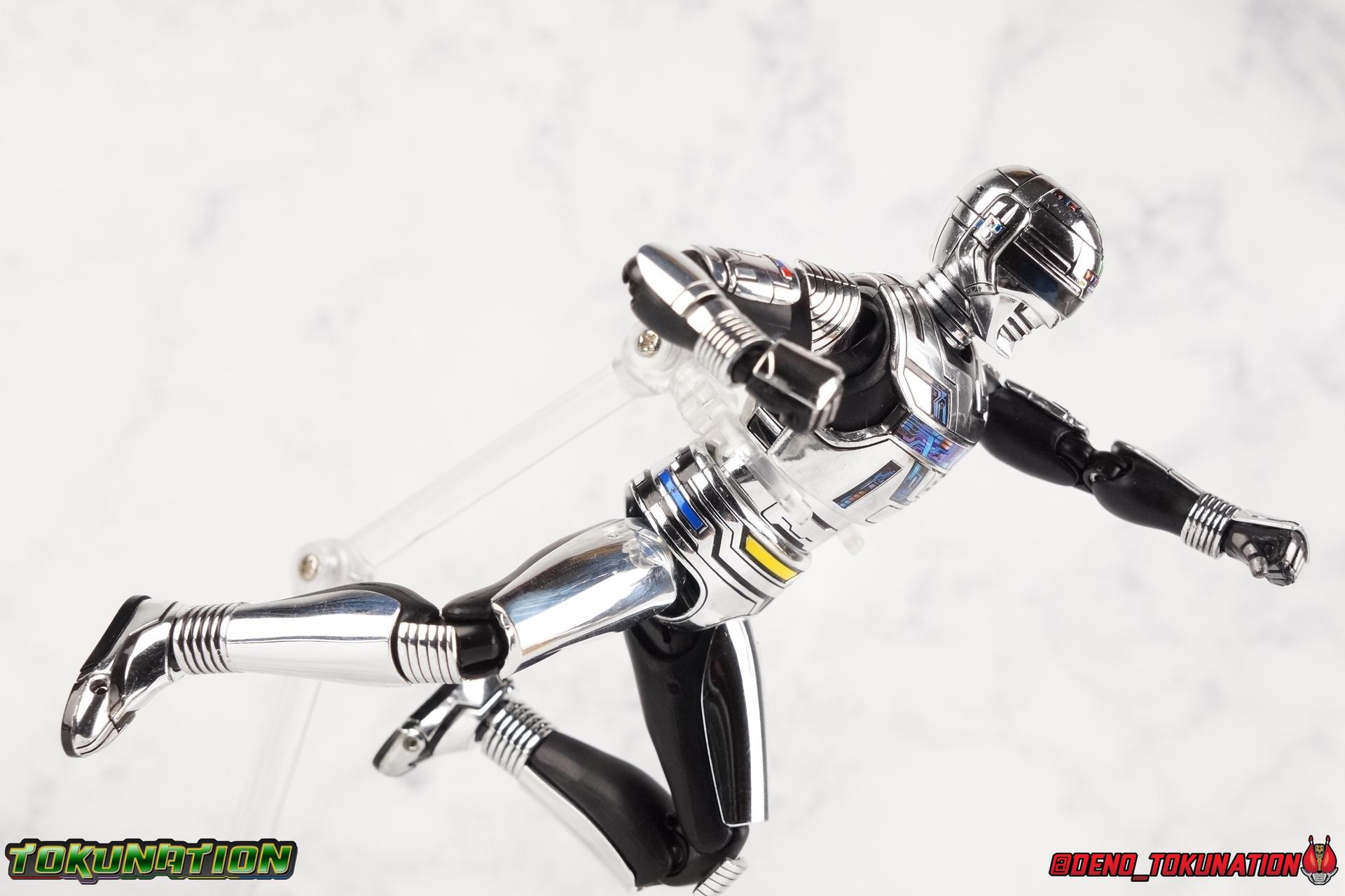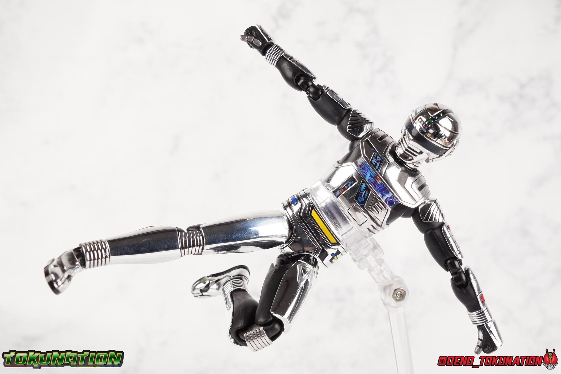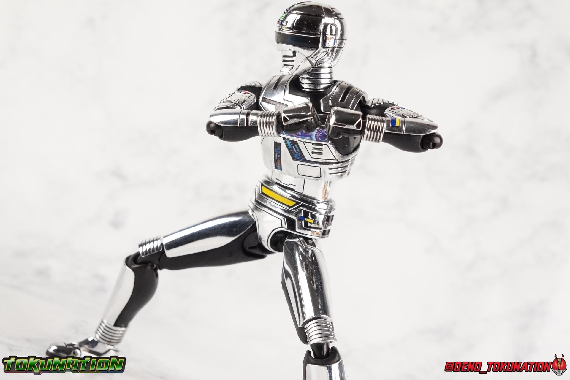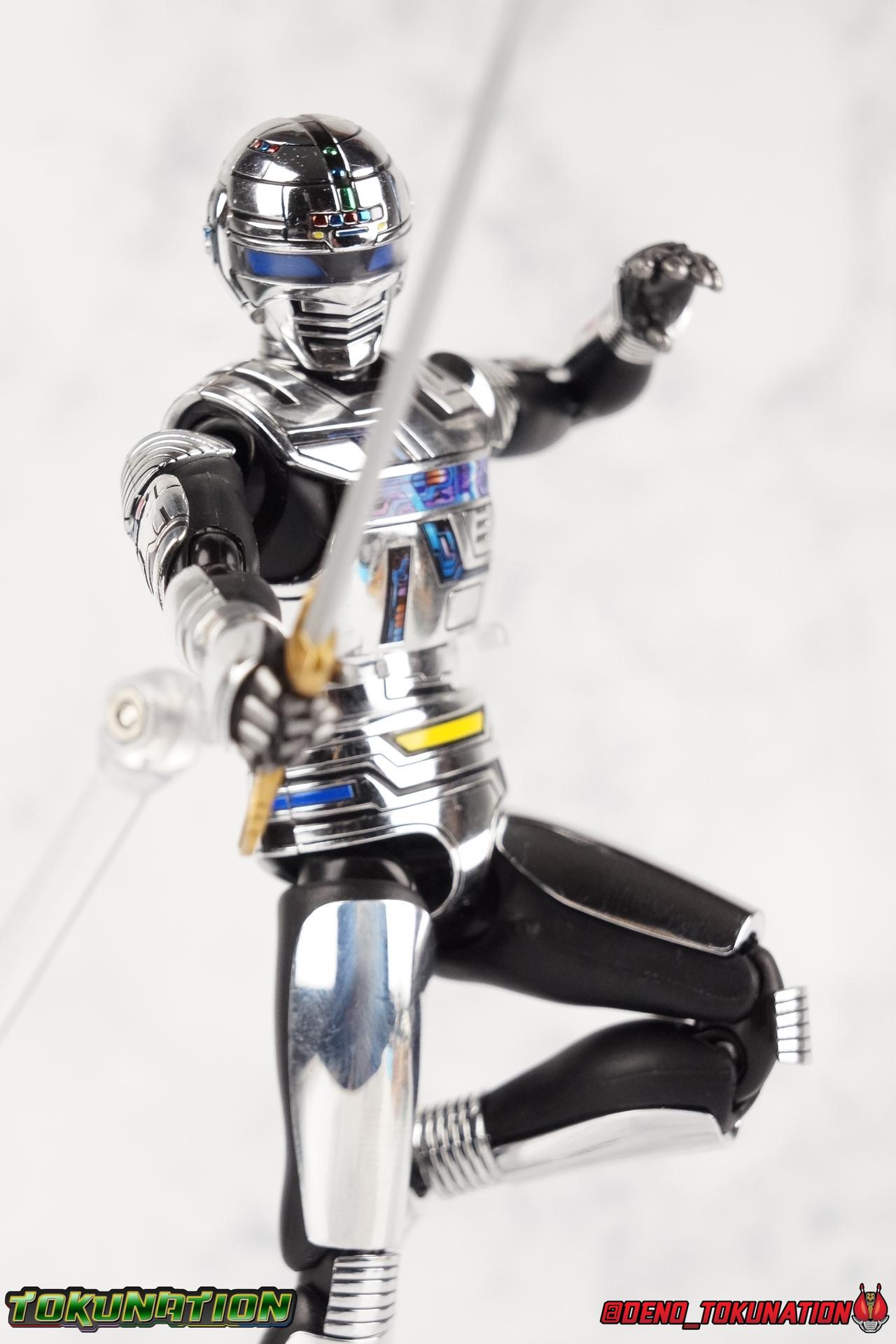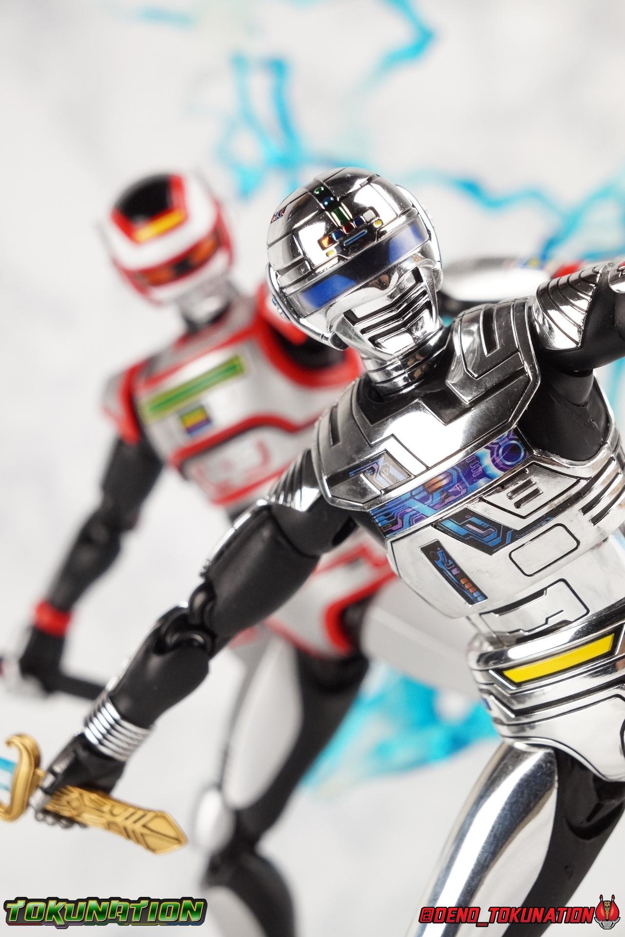 Over 4 years ago Tamashii Nations graced us with a pair of inaugural releases that launched the Metal Heroes sub-line for S.H. Figuarts. Back then we were treated to Gavan & his successor Gavan Type G. Now, during the new golden age of Metal Heroes it seems, Bandai is treating us to a pair of Renewals, one for each of these heroes! So today we're taking a look at the first of those released with S.H. Figuarts Space Sheriff Gavan Type G Space Squad Version! ** Physically this toy is very very similar to the original releases of Space Sheriff Gavan & Gavan Type G, though it's ostensibly meant to be a renewal of that mold. There are physical differences but the accessories and better paint apps are the most appreciable things you'll notice with this release. Just fair warning. Also, this gallery consists of 100+ images spread across the first 3 posts. So be sure to check out the whole thing! Packaging I actually really dig the new box that Bandai's come up with for Gavan Type G this time around. The first two Gavan releases both came in boxes that were themed around the original TV series aesthetic and each was partially color swapped to differentiate them from each other. This time it gets a bit more of a space theme going on thanks to the movie this release promotes. I just generally like it better to be honest. Main Figure So like I said up above, this mold is VERY similar to the original mold used for Gavan & Type G. In fact this one is simply a bit more thick and wide than that one. You'll notice wider hips, a more thick abdomen, a chest plate that sticks out a bit further, and just generally more clearance for these joints than the original had. But that's about it, ultimately these changes don't amount to a ton of appreciable improvements. So be forewarned this review will have many similarities to my old original Gavan gallery. Note that in comparison shots, the Space Squad version will be on the left with the original Type G on the right. Now with the statements I made above out of the way, I want to start by saying that this mold really is a great improvement over the original. It's not immediately something you notice, but more something that comes to mind as you handle it further. Starting at the bottom, the feet don't get a lot more clearance, so there isn't much to talk about there. The knees have the same old bends, but the hips are vastly improved. Not only are they stronger, no more sagging joints, but they have much more clearance for rotating than the old one. And that brings us up to the waist, where with the old one it was very gaunt and narrow, looking very awkward from the sides. This version beefs things up nicely enough to make it look like a real person is conceivably in there. And there isn't a ton of articulation lost either. By far the greatest improvement of the new Type G is the chest and head details. They are far more bright and elaborate, matching his appearance in Space Squad and in fact his first appearance in Gavan The Movie. I had never realized until now just how inaccurate the chest detailing on the first Type G was. Also you can see Gavan's "eyes" beneath the standard black visor quite a bit better. They should always be at least partially visible like this. Even when you aren't using the included laser scope head. So this release gets top marks for this as well. The head itself is a hair larger and more proportional to the body than the first release as well. Just adding to the overall improved look of this release over the original. I'll also mention that the arms aren't terribly different from the first one, though the shoulders seem to have much better clearance than before. But the hands, my god the best improvement is right there. You can actually change out the hands without fear of shearing off a razor thin wrist peg in the process, which happened with the first original Type G I owned and was very common throughout that production run. Ultimately this figure may not appear physically to be all that different. But in reality the small changes and differences made to it from the first release really are appreciable. I have to say I'm still fairly unsatisfied with the chrome applications this go around. While not inaccurate, the imperfections, scratches, and smudging to the chrome make it look like a used product. But all of these imperfections were present straight out of the box well. I wish Bandai would go with a more flat gray metallic paint app, like those on Juspion. But the reflective chrome is more accurate I suppose. A better application process needs to be used is all. Accessories This section is where the biggest differences between the the original release and the Space Squad one exist: 1 - Laser Scope head. This alternate head replicates Type G's visor lighting up as it does periodically. Originally an ability meant to allow classic Gavan to detect invisible monsters, it's since become synonymous with moments of either character powering up, or having showy flashy action. It's my preferred way to display this figure actually. I like how the eyes really pop. 3 - sets of additional hands. One set for weapon holding, one set of open palms, then a split pair that includes a flat karate chop style hand, and one with a set of two fingers pointing forward to recreate the Lazer Z Beam attack, or to hold the end of the Laser Blade. 1 - Laser Blade (Origin Version). A blade forged on Juspion's homeworld, one who can wield it properly is assured victory. This is the one weapon which sets apart this version from the original Type G release. That release came packed with the same classic Laser Blade that classic Gavan did. Both of the Gavan figuarts were packed with it. This new Origin version is a bit more ornate and elaborate in design. It's also the version of the Laser Blade that Geki/Type G is seen using in the Space Squad film after Mad Gallant destroys the original. So while the actual figuart itself may be similar physically to the 1st 