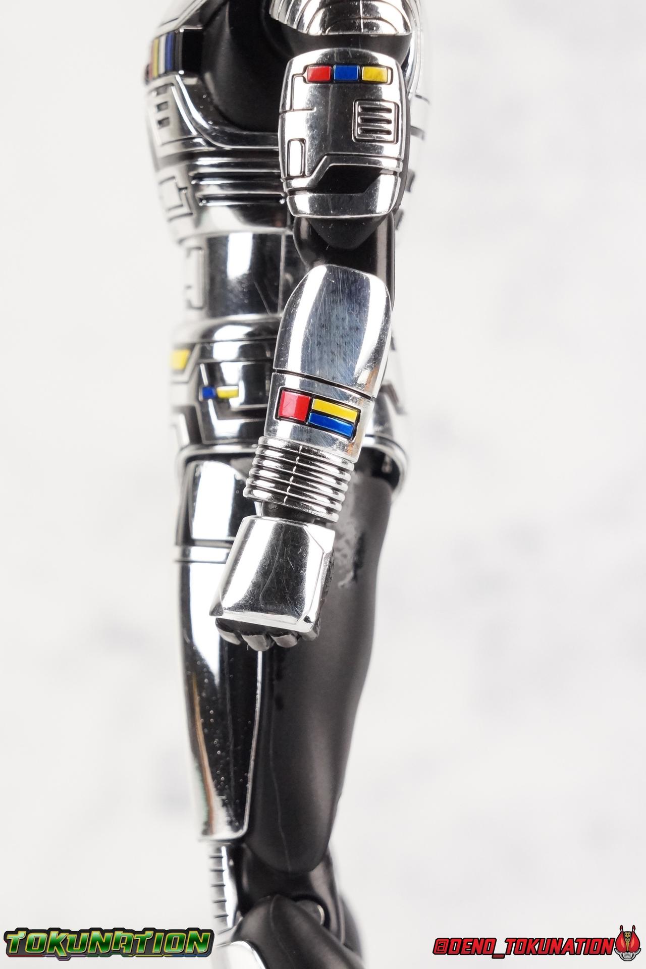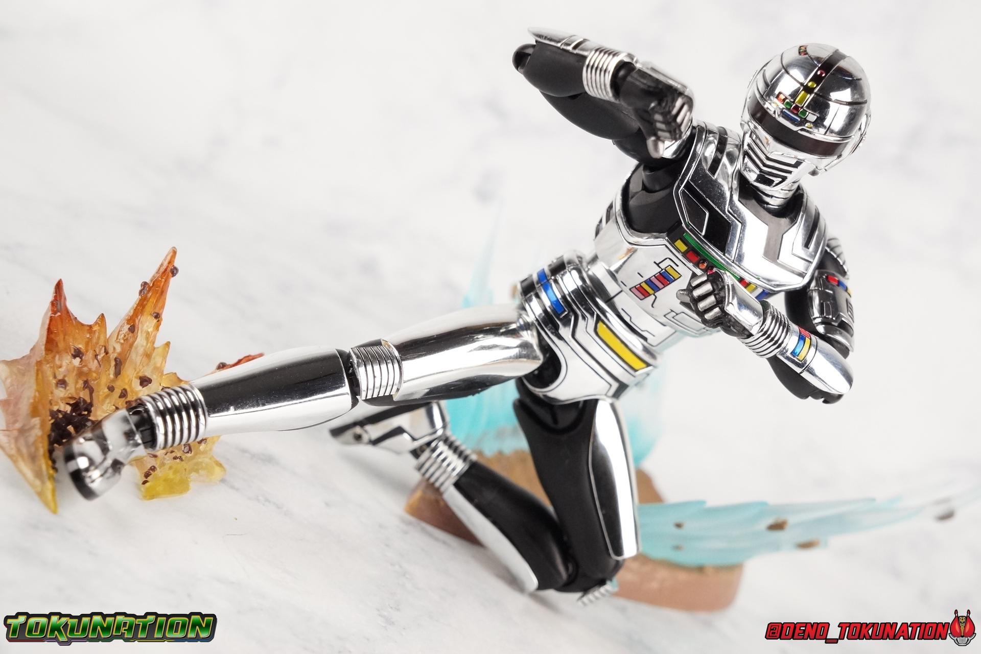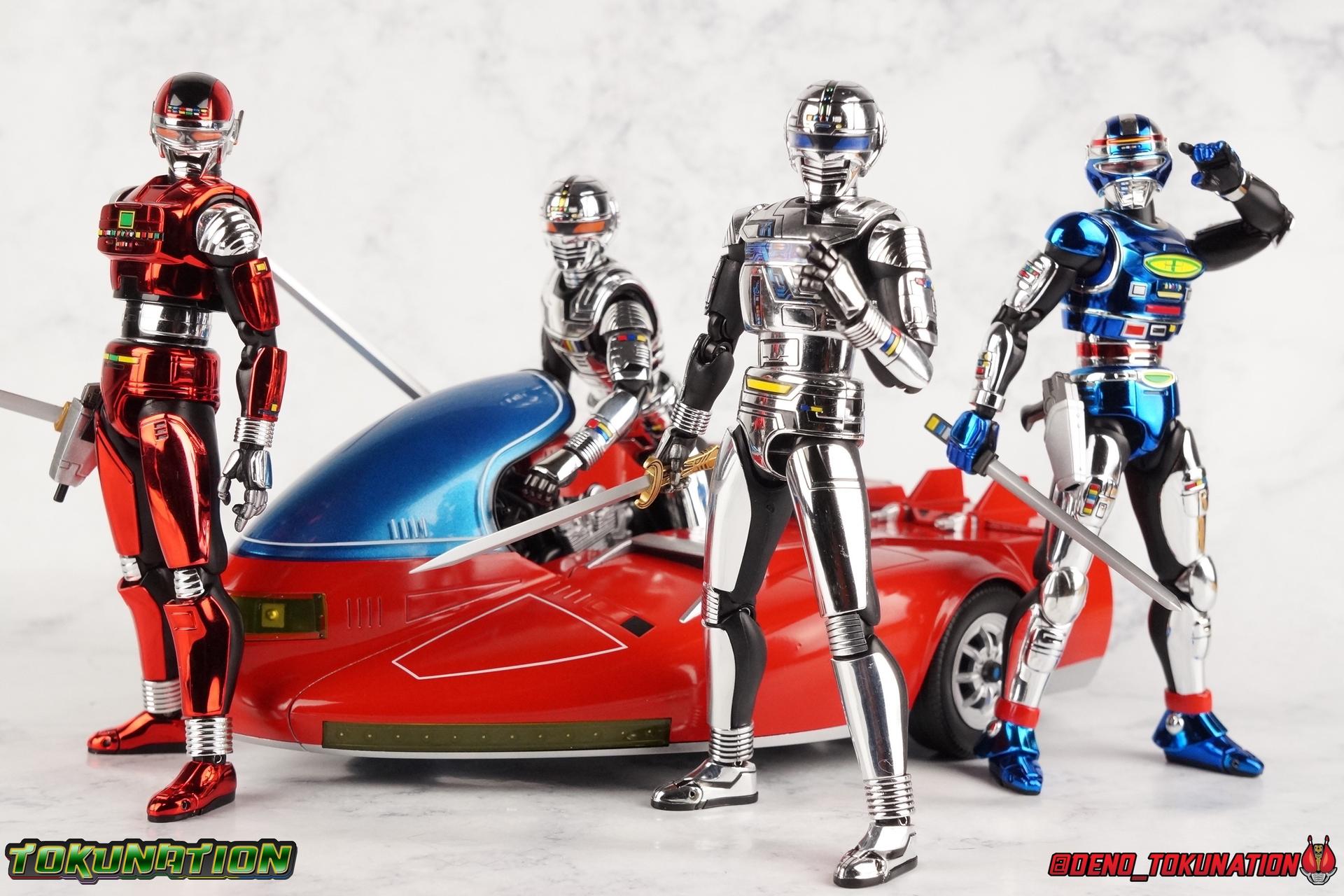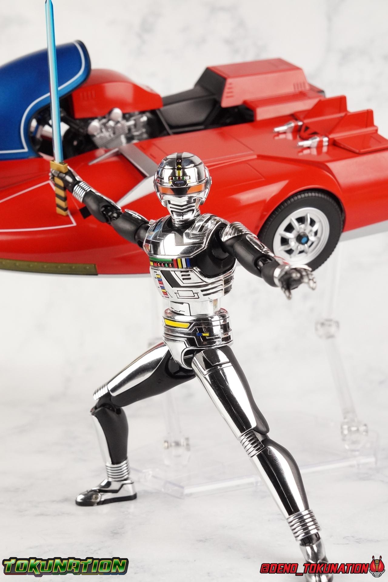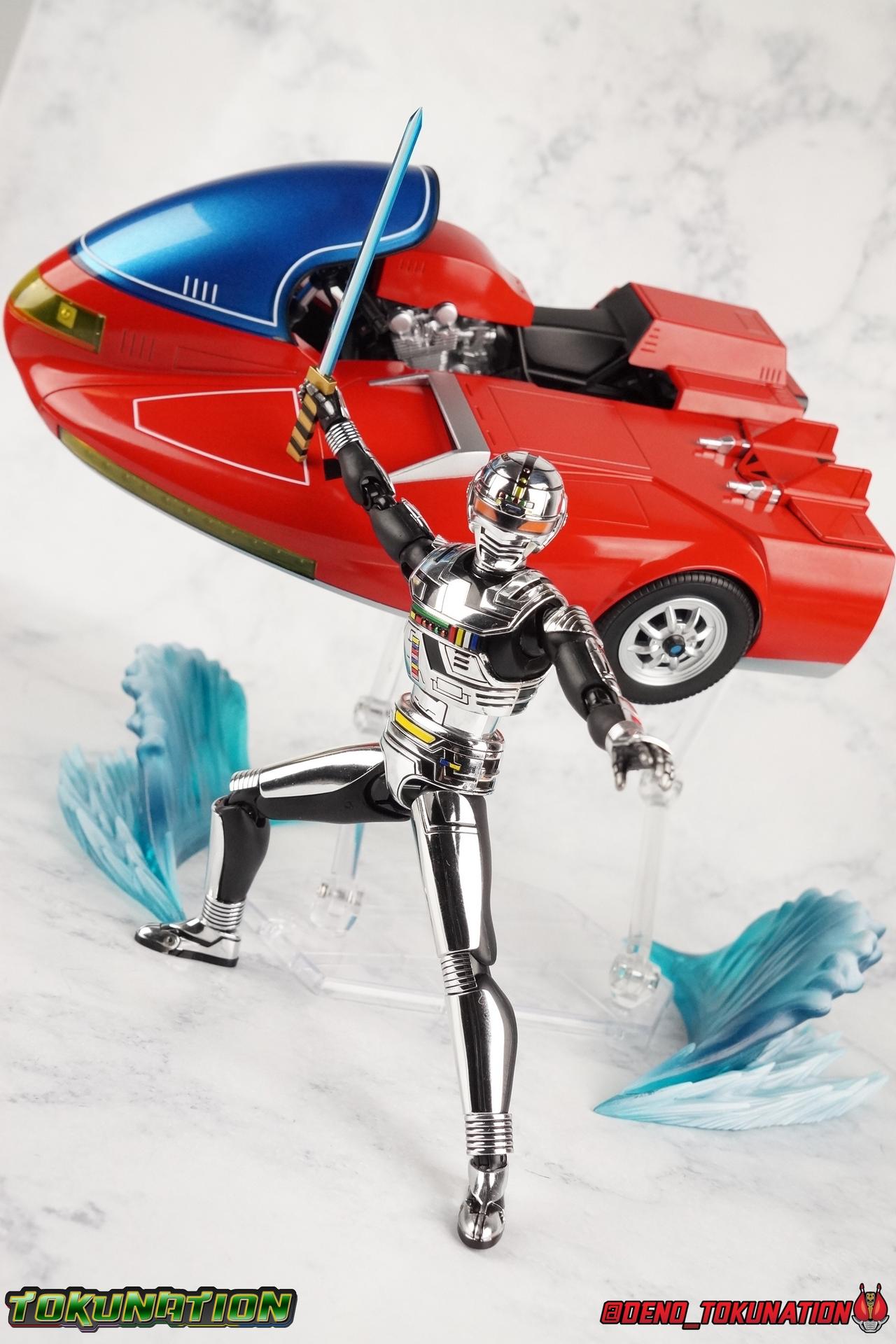Recently we took a look at the long overdue renewal of S.H. Figuarts Gavan Type G from the Space Squad: Gavan Vs Dekaranger film. Well now it's the original Metal Hero's turn! Retsu Ichijouji was the first Metal Hero, the original Space Sheriff Gavan, and thanks to the powerful resurgence Metal Heroes have experienced this year, he too has gotten a figure renewal. In Retsu's case though we've been treated to a massive 2-pack including S.H. Figuarts Space Sheriff Gavan & his futuristic super bike the Saibarian! ** Physically this toy is very similar to the original release of Space Sheriff Gavan though it's ostensibly meant to be a renewal of that mold. There are physical differences but you'll find this release very similar as well. This gallery will be spit into 4 posts, see each for a specific note of what they contain. Packaging So for this massive two-pack we get a pretty stellar box with some primo stock photos of Gavan riding the Saibarian and a great star covered back ground. Much like the new Type G this box just screams Gavan more than ever. I love the new style of packaging they've gone with for these. Main Figure So like I said up above, this mold is VERY similar to the original mold used for Gavan. And of course it's a straight repaint of the new Gavan Type G release. Unlike Type G, original Gavan doesn't come with any new accessories that Type G didn't, though he does have his Saibarian to ride. But I'll be discussing it separately down below. The Gavan portion of the review will be word for word identical in sections to my Type G review. Note that in comparison shots, the renewal version of Gavan will be on the left with the original release on the right. Now with the statements I made above out of the way, I want to start by saying that this mold really is a great improvement over the original. It's not immediately something you notice, but more something that comes to mind as you handle it further. Starting at the bottom, the feet don't get a lot more clearance, so there isn't much to talk about there. The knees have the same old bends, but the hips are vastly improved. I do feel they're a lot tighter on this release than they were on the new Type G though. Not only are they stronger, no more sagging joints, but they have much more clearance for rotating than the old one. However mine had some weird thick gunk on the left hip joint straight from the factory that you can see in a few shots. Just some weird oily stuff. And that brings us up to the waist, where with the old Gavan it was very gaunt and narrow, looking very awkward from the sides. And the lower torso could lift up in such a way that that entire section looked like it was disconnected from the waist. This version beefs things up nicely enough to make it look like a real person is conceivably in there. And there isn't a ton of articulation lost either. By far the greatest improvement of the new Gavan is the chest and head details. They are far more bright and elaborate, more closely matching his appearances from the last 3+ decades. Also you can see Gavan's "eyes" beneath the standard black visor quite a bit better. They should always be at least partially visible like this. Even when you aren't using the included laser scope head. So this release gets top marks for this as well. The head itself is a hair larger and more proportional to the body than the first release too. Just adding to the overall improved look of this release over the original. I'll also mention that the arms aren't terribly different from the first one, though the shoulders seem to have much better clearance than before. Special note for this release of the mold, for some bizarre reason the right shoulder of my Gavan isn't glued on properly so every time I move that joint it flies off. But the absolute best improvement again is right there in the hands. You can actually change out the hands without fear of shearing off a razor thin wrist peg in the process, which happened with the first original Type G I owned and was very common throughout both Gavan production runs. It's just as welcome this go around as it was with the new Type G. Ultimately this figure may not appear physically to be all that different. But in reality the small changes and differences made to it from the original Gavan releases really are appreciable. I have to say I'm still fairly unsatisfied with the chrome applications this go around. While not inaccurate, the imperfections, scratches, and smudging to the chrome make it look like a used product. Especially that one big noticeable scratch on his chest. But all of these imperfections were present straight out of the box well. Accessories Unlike Type G, Gavan comes with more standard accessories. 1 - Laser Scope head. This alternate head replicates Gavan's visor lighting up as it does periodically. Originally an ability meant to allow Gavan to detect invisible monsters, it's since become synonymous with moments of either character powering up, or having showy flashy action. It's my preferred way to display this figure actually. I like how the eyes really pop. 4 - sets of additional hands. One set for weapon holding, one set for bike riding, then a split pair that includes a flat karate chop style hand, and one with a set of two fingers pointing forward to recreate the Lazer Z Beam attack, or to hold the end of the Laser Blade. And two open palm hands as well. Everything you'll need! 1 - Laser Blade. At first glance I thought this was just a repack of the original Gavan's blade from 4 years ago. But it is subtly different. The stripes on the hilt are a bit more narrow and engraved into it slightly deeper. It looks a little better than the original though no one would blame you for not seeing the differences. 1 - Laser Blade (Charge Up). This is one totally new accessory this go around. The original Gavan figuart didn't include a charged blade. Which was sorely lacking when even the ancient Toei Action Works figure include