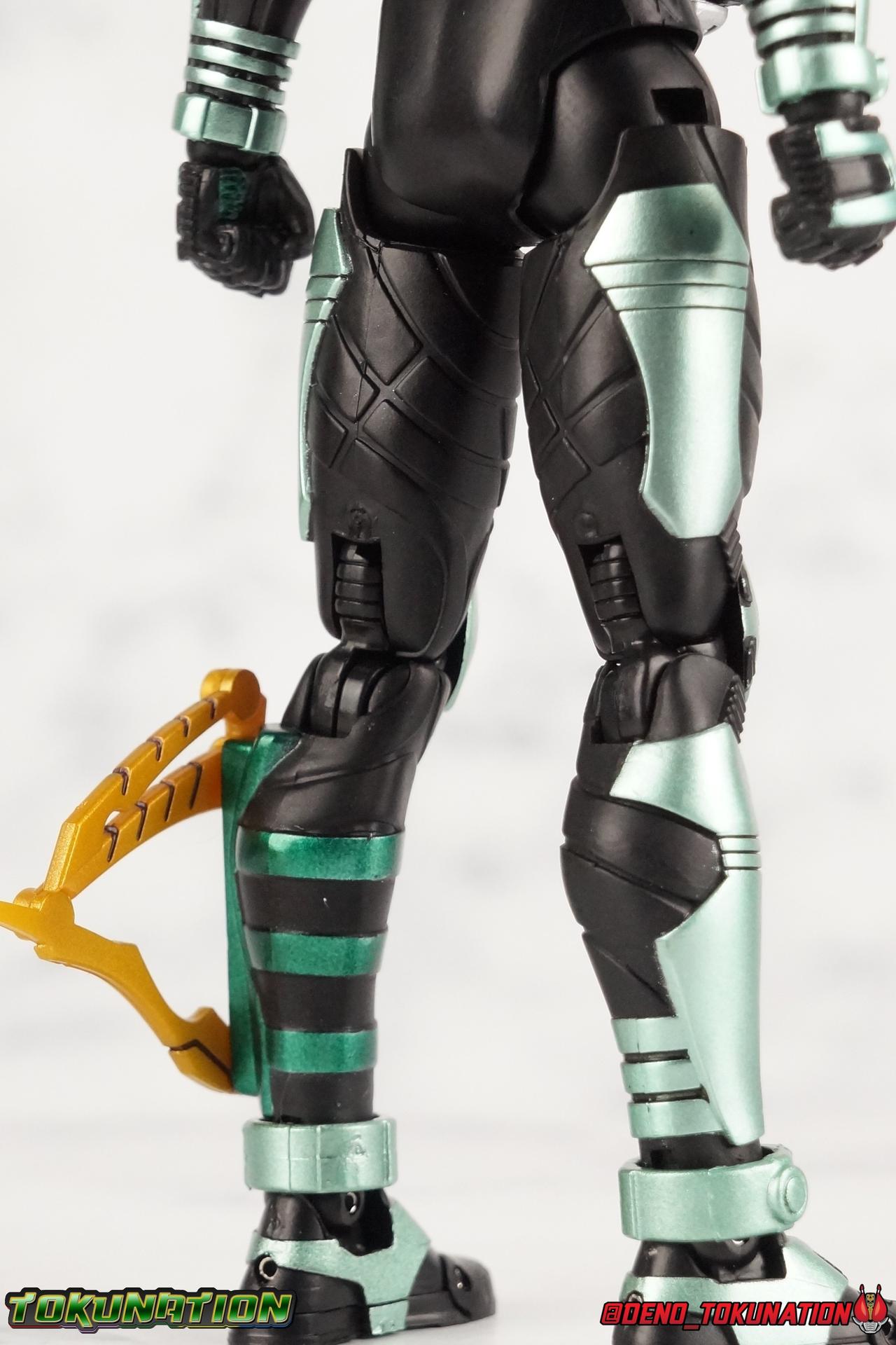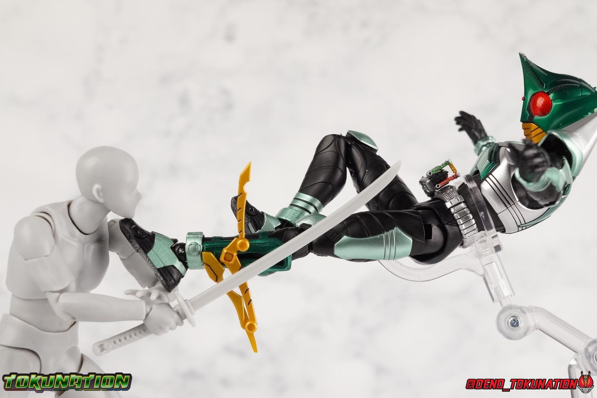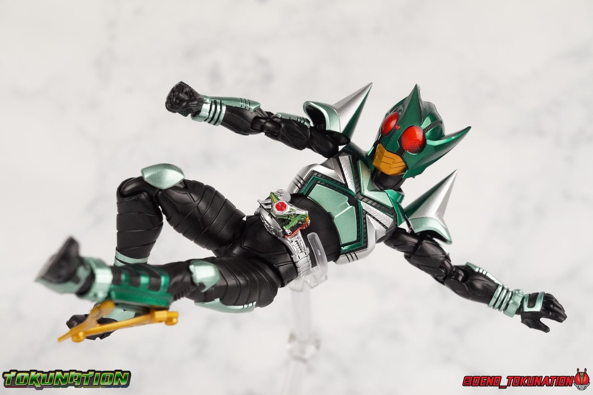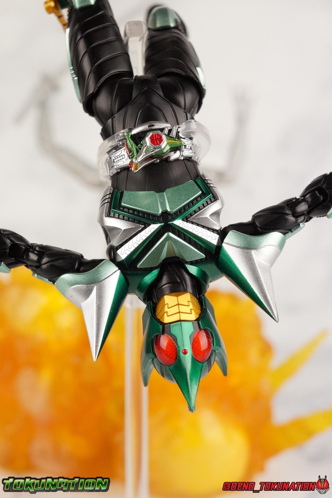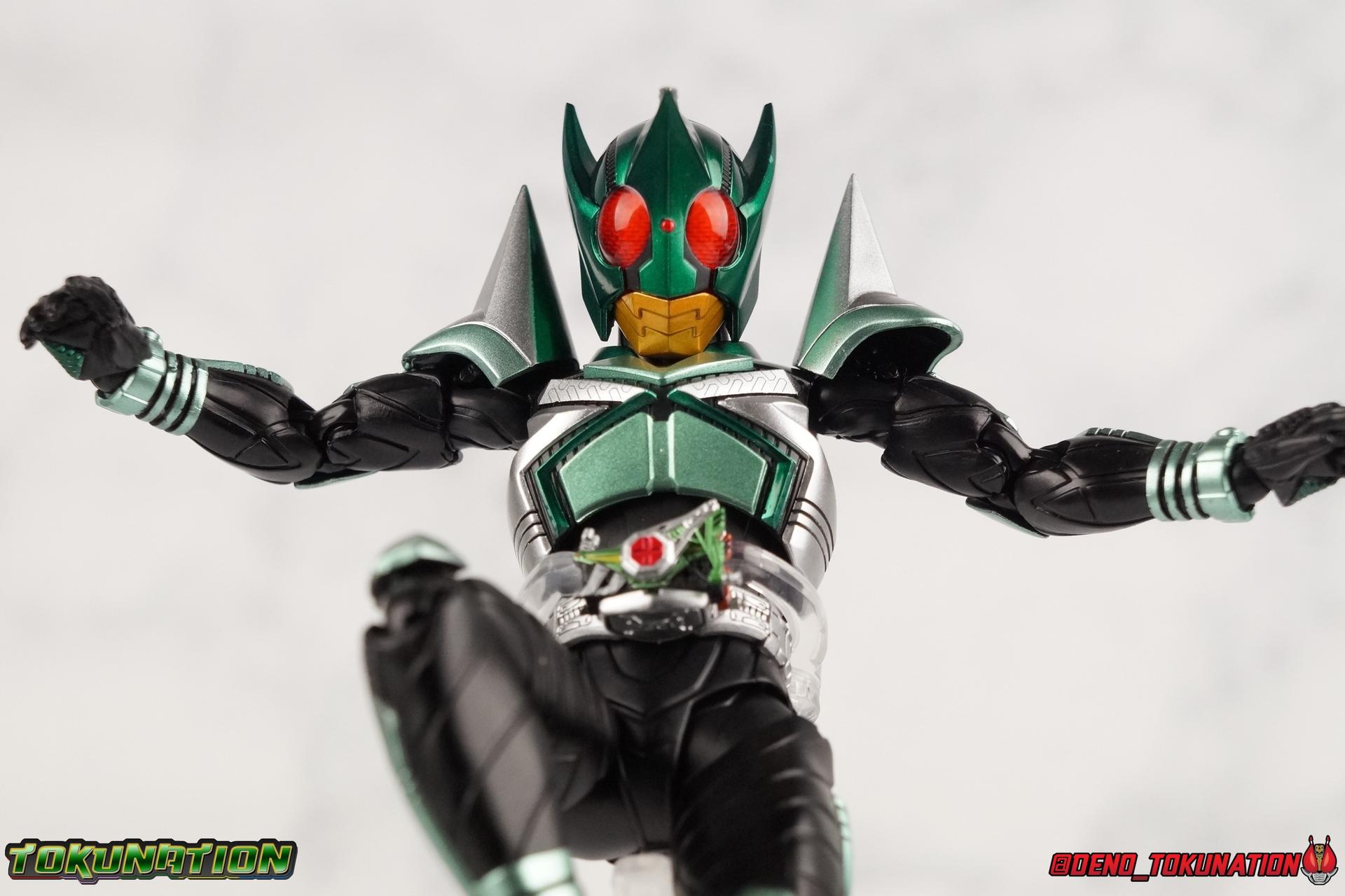 Sou Yaguruma was once the top dog of ZECT, commanding legions of ZECTroopers as Kamen Rider TheBee. The advocate of "perfect harmony" would soon be humbled however by Souji Tendou, and begin walking a darker path of self-loathing that eventually (and inexplicably) lead him to his new identity as Kamen Rider Kickhopper! Now Yaguruma is the latest addition to the Shinkocchou Seihou premium renewal line of S.H. Figuarts! So let's dive into our review of the figure. Packaging That standard slipcover packaging of Shinkocchou Seihou returns again. I promise I really appreciate the ease of access this kind of packaging provides. I really like this design more than a standard figuarts square box, but they've gotta start spicing things up. The one monotone image across the front of the box is getting rather boring. The presentation is nice but it's starting to fall flat in the face of more colorful and creative mainline releases like those from Ex-Aid is all. Main Figure Just as with Kabuto, Gattack, & Dark Kabuto before him, Kickhopper is an overwhelmingly needed update to an outdated and obsolete figure. The original release was plagued by the now standard QC issues of the original Kabuto line. Especially with those bowed legs. I'm happy to report that Seihou Kickhopper is the perfect successor to that original release. As with my last couple Seihou galleries form this series, you'll find a lot of similar passages in my review, it's just unavoidable when these figures share the same basic body and tooling aside from a few key areas. But I'll definitely zero in on the differences with this one. To start, the most iconic thing about Kickhopper is of course the Anchor Joint weapon attached to his left ankle. This unique item not only gives Kickhopper the 'jump' in his Rider Jump, but packs all the power behind his Rider Kick. It's also the most improved thing about this release. On the original figure it was a static accessory, permanently fixed in placed. This go around however the Anchor Joint is actually jointed and can be slid down the shin with the blade fully extendable to properly recreate a Rider Kick. The style of hips originally implemented in this mold provide a wide and balanced motion that allows you to replicate all of Kickhoppers most iconic poses & attacks. Though I do still think any standing kick looks pretty goofy in figure form. I would say the hips are limited only by their design as they do impact the waist assembly a little more prematurely than I'd like. But it's undeniable how versatile they are compared to many figures. The Hopper Zecter is really nicely detailed, especially when compared to the original. The details are sharp, the paint apps crisp, and it's even removeable. If you flip it around, the backside is also (properly) fully painted in Punch Hopper colors. It does pop off the buckle rather easily but it just looks so good. And while we don't have moving pectoral plates or flexible chest armor like with Kabuto & Dark Kabuto, Kickhopper's design is still pretty smooth, albeit a bit more limited in the upper body area. But you also don't have to worry about the torso impacting the Zecter. The new chest armor is really really nice though, it looks like a perfect replica of the show prop with really subtle paint details I had never really noticed before. The arms are free of nearly all obstruction thanks to wonderfully hinged shoulder pads. They do tend to look a little unnatural in some poses and expose the joints beneath however. But the elbows and wrist provide the same great range of motion we've come to expect from this mold, one that's still holding up very well 3 years on. Lastly we look at Kickhoppers head, which is just spot on. The original suffered from it's disproportionate size to the body as well as some issues with length and width. I'm happy to report that this go around the head is the correct size relative to the body and also the proper glossy green. The mouth plate is a brilliant gold and the compound eyes really sparkle in the right light. As with his 3 predecessors, Shinkocchou Seihou Kickhopper really is the ultimate apology for the original release. And being able to FINALLY recreate my favorite moment from Kabuto, the Triple Rider Kick in Seihou form, is the ultimate treat. Accessories Not much here, but just what you need: 1- Hopper Zecter (open). This is the flipped version of the Hopper Zecter from Kickhopper's Rider Jump/Kick combination. After the moving parts that were present on Seihou Kabuto's Zecter years ago I was surprised that Seihou Gattacks' was a swap out part instead, and I'm surprised again that the Hopper Zecter is the same. It just seems like something that could have been engineered to work instead. I mean just look at the W Driver & Gaia Memories. 2 - sets of hands. These hands are a bit odd if you ask me. The open hands are a very stiff variety of open palm. They aren't very expressive at all. The other pair are the standard type of "holding things" hands, and they look almost perfectly shaped for handlebars on a Rider Machine. But the Hopper Bros had no such bikes, nor any weapons they would have held. So these hands are a really pointless inclusion. The two glaring omissions that most collectors will notice are undoubtedly items included with the original figuart. The ramen bowl as well as a personalized Tamashii Stage. The ramen bowl was a pretty hilarious and iconic accessory, signifying one of the goofier plots of the show. And while the stage isn't nearly as important, it was nice that the original Hopper bros came with them. As is the original figuart is so dirt cheap now you could pretty much buy it just for those accessories. So while it's a bummer they weren't included here, it's no great loss either. Final Thoughts That's 4 down and well frankly quite a few to go. With Hyper Kabuto on the way finally, is it only a mater of time before TheBee, Sasword, Drake and others finally get this premium treatment as well