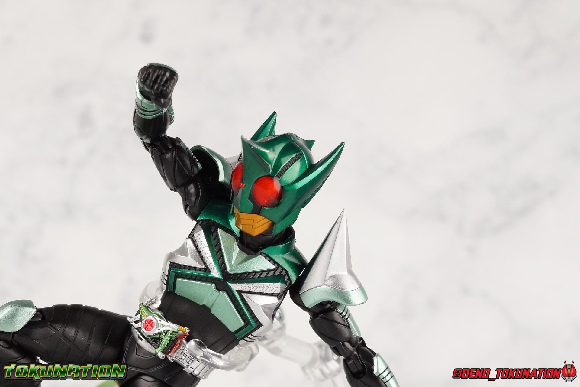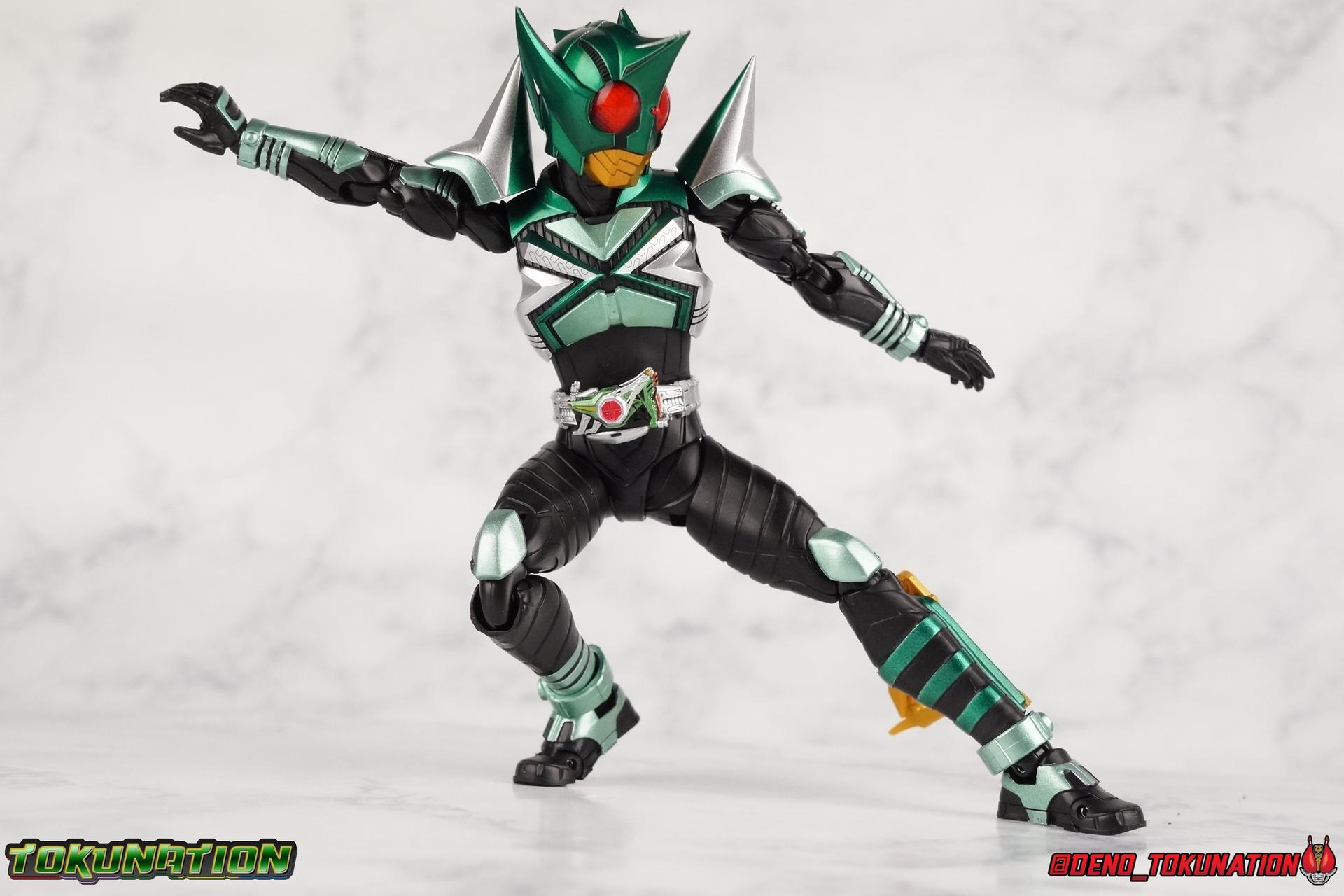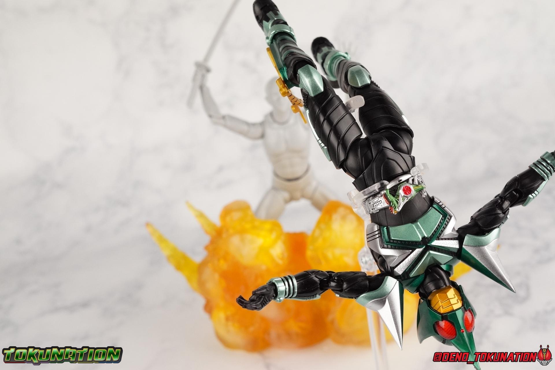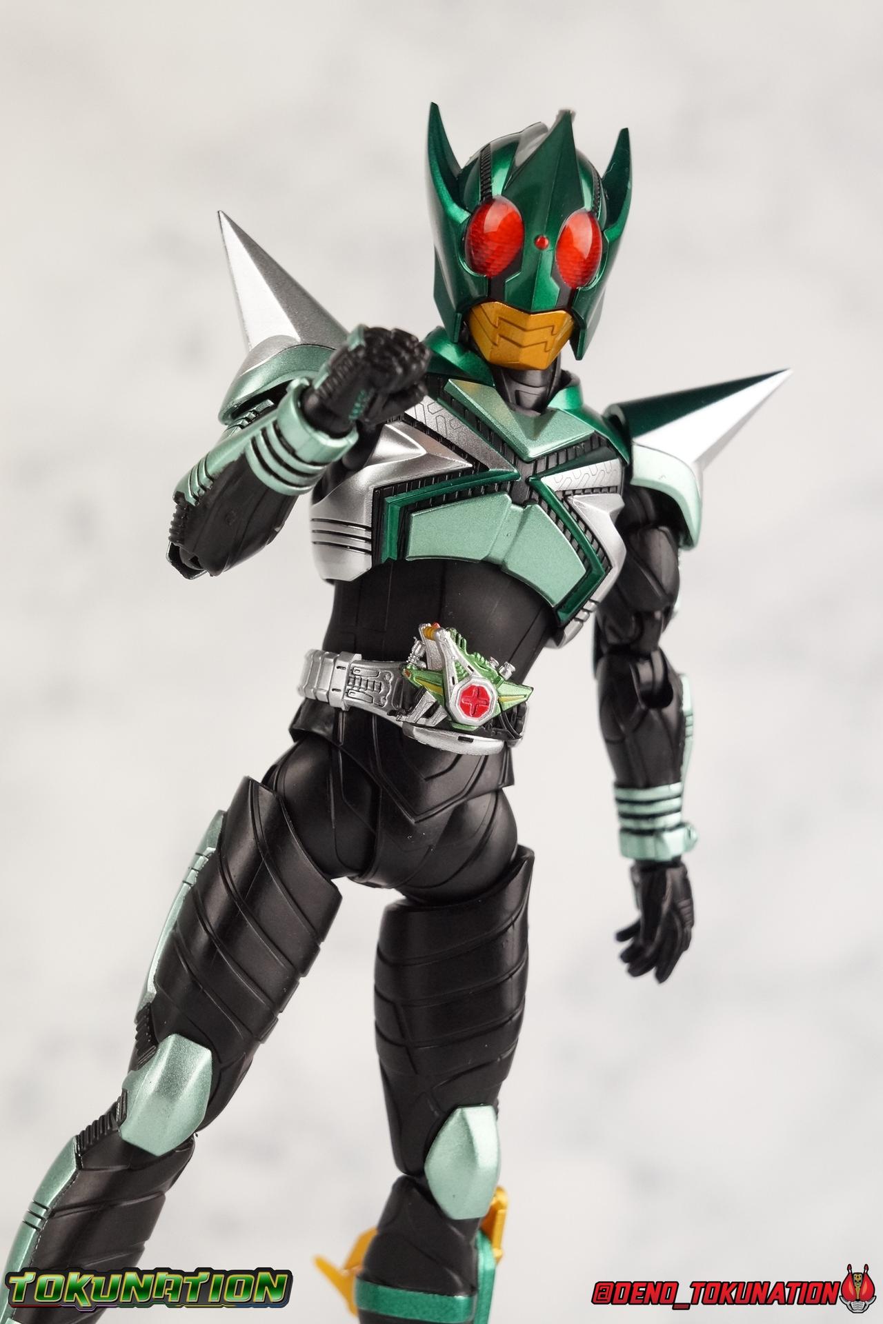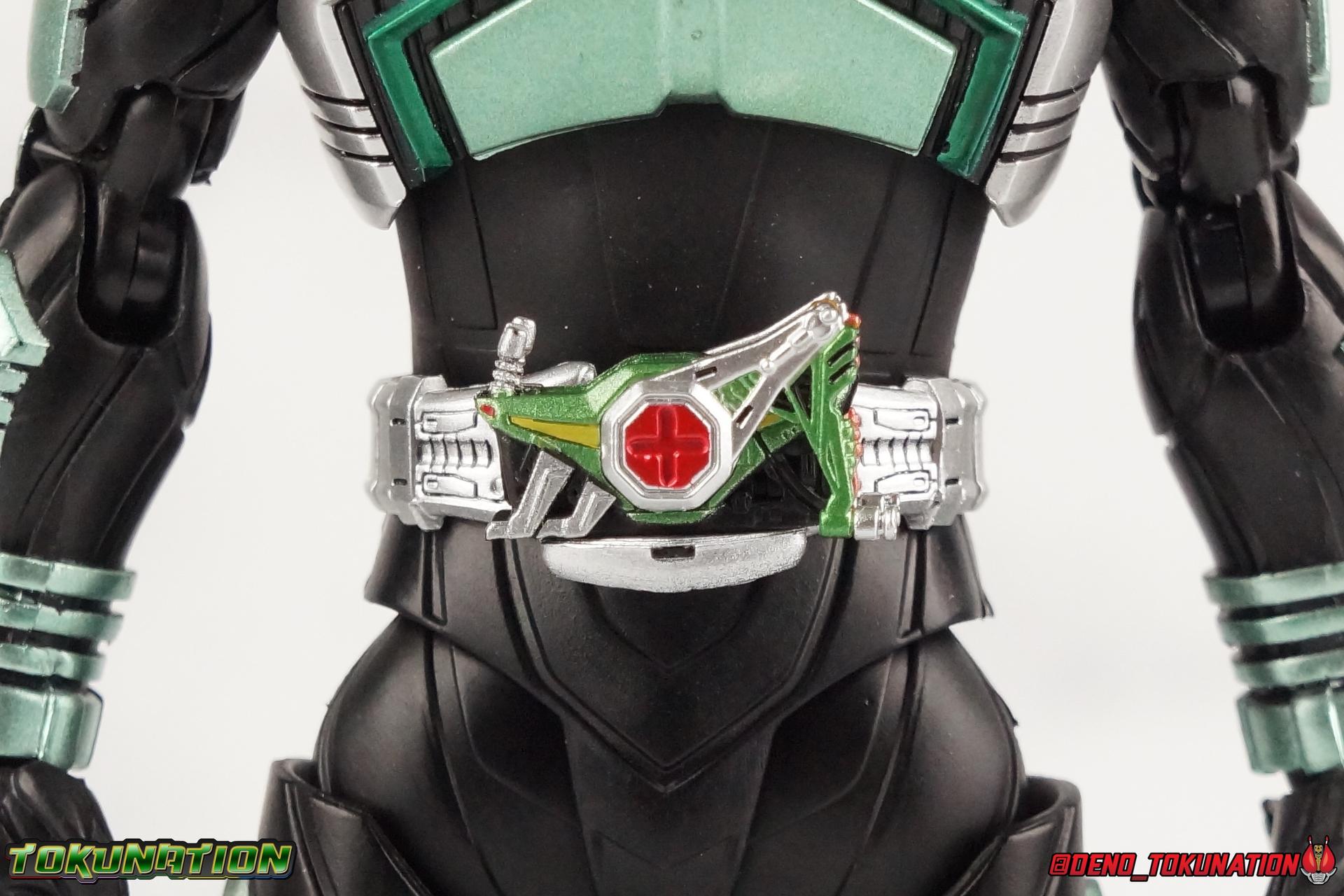 Sou Yaguruma was once the top dog of ZECT, commanding legions of ZECTroopers as Kamen Rider TheBee. The advocate of "perfect harmony" would soon be humbled however by Souji Tendou, and begin walking a darker path of self-loathing that eventually (and inexplicably) lead him to his new identity as Kamen Rider Kickhopper! Now Yaguruma is the latest addition to the Shinkocchou Seihou premium renewal line of S.H. Figuarts! So let's dive into our review of the figure. Packaging That standard slipcover packaging of Shinkocchou Seihou returns again. I promise I really appreciate the ease of access this kind of packaging provides. I really like this design more than a standard figuarts square box, but they've gotta start spicing things up. The one monotone image across the front of the box is getting rather boring. The presentation is nice but it's starting to fall flat in the face of more colorful and creative mainline releases like those from Ex-Aid is all. Main Figure Just as with Kabuto, Gattack, & Dark Kabuto before him, Kickhopper is an overwhelmingly needed update to an outdated and obsolete figure. The original release was plagued by the now standard QC issues of the original Kabuto line. Especially with those bowed legs. I'm happy to report that Seihou Kickhopper is the perfect successor to that original release. As with my last couple Seihou galleries form this series, you'll find a lot of similar passages in my review, it's just unavoidable when these figures share the same basic body and tooling aside from a few key areas. But I'll definitely zero in on the differences with this one. To start, the most iconic thing about Kickhopper is of course the Anchor Joint weapon attached to his left ankle. This unique item not only gives Kickhopper the 'jump' in his Rider Jump, but packs all the power behind his Rider Kick. It's also the most improved thing about this release. On the original figure it was a static accessory, permanently fixed in placed. This go around however the Anchor Joint is actually jointed and can be slid down the shin with the blade fully extendable to properly recreate a Rider Kick. The style of hips originally implemented in this mold provide a wide and balanced motion that allows you to replicate all of Kickhoppers most iconic poses & attacks. Though I do still think any standing kick looks pretty goofy in figure form. I would say the hips are limited only by their design as they do impact the waist assembly a little more prematurely than I'd like. But it's undeniable how versatile they are compared to many figures. The Hopper Zecter is really nicely detailed, especially when compared to the original. The details are sharp, the paint apps crisp, and it's even removeable. If you flip it around, the backside is also (properly) fully painted in Punch Hopper colors. It does pop off the buckle rather easily but it just looks so good. And while we don't have moving pectoral plates or flexible chest armor like with Kabuto & Dark Kabuto, Kickhopper's design is still pretty smooth, albeit a bit more limited in the upper body area. But you also don't have to worry about the torso impacting the Zecter. The new chest armor is really really nice though, it looks like a perfect replica of the show prop with really subtle paint details I had never really noticed before. The arms are free of nearly all obstruction thanks to wonderfully hinged shoulder pads. They do tend to look a little unnatural in some poses and expose the joints beneath however. But the elbows and wrist provide the same great range of motion we've come to expect from this mold, one that's still holding up very well 3 years on. Lastly we look at Kickhoppers head, which is just spot on. The original suffered from it's disproportionate size to the body as well as some issues with length and width. I'm happy to report that this go around the head is the correct size relative to the body and also the proper glossy green. The mouth plate is a brilliant gold and the compound eyes really sparkle in the right light. As with his 3 predecessors, Shinkocchou Seihou Kickhopper really is the ultimate apology for the original release. And being able to FINALLY recreate my favorite moment from Kabuto, the Triple Rider Kick in Seihou form, is the ultimate treat. Accessories Not much here, but just what you need: 1- Hopper Zecter (open). This is the flipped version of the Hopper Zecter from Kickhopper's Rider Jump/Kick combination. After the moving parts that were present on Seihou Kabuto's Zecter years ago I was surprised that Seihou Gattacks' was a swap out part instead, and I'm surprised again that the Hopper Zecter is the same. It just seems like something that could have been engineered to work instead. I mean just look at the W Driver & Gaia Memories. 2 - sets of hands. These hands are a bit odd if you ask me. The open hands are a very stiff variety of open palm. They aren't very expressive at all. The other pair are the standard type of "holding things" hands, and they look almost perfectly shaped for handlebars on a Rider Machine. But the Hopper Bros had no such bikes, nor any weapons they would have held. So these hands are a really pointless inclusion. The two glaring omissions that most collectors will notice are undoubtedly items included with the original figuart. The ramen bowl as well as a personalized Tamashii Stage. The ramen bowl was a pretty hilarious and iconic accessory, signifying one of the goofier plots of the show. And while the stage isn't nearly as important, it was nice that the original Hopper bros came with them. As is the original figuart is so dirt cheap now you could pretty much buy it just for those accessories. So while it's a bummer they weren't included here, it's no great loss either. Final Thoughts That's 4 down and well frankly quite a few to go. With Hyper Kabuto on the way finally, is it only a mater of time before TheBee, Sasword, Drake and others finally get this premium treatment as well