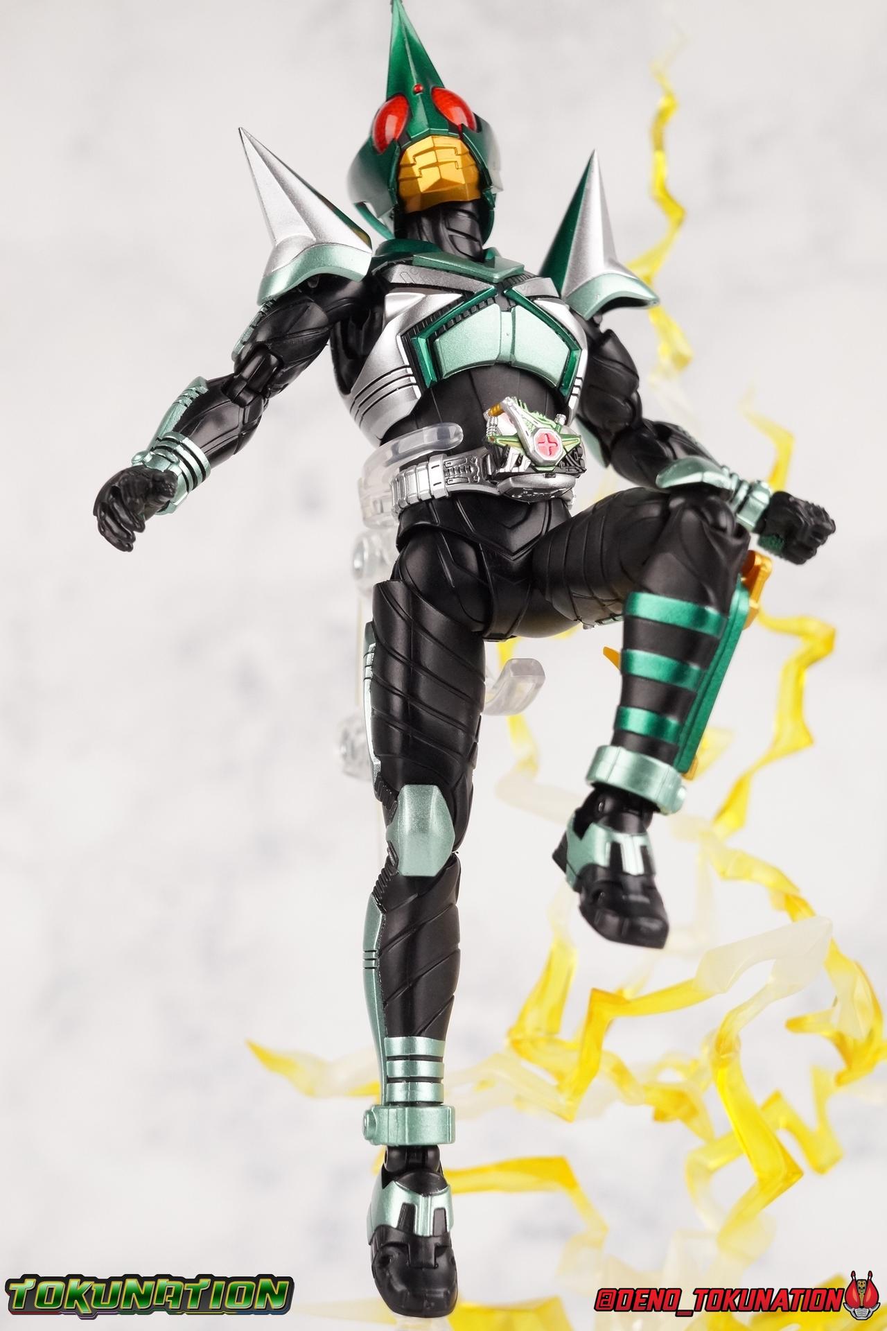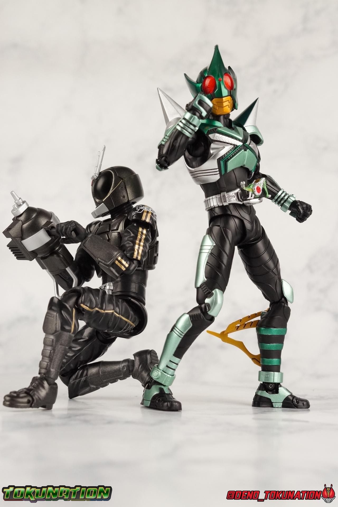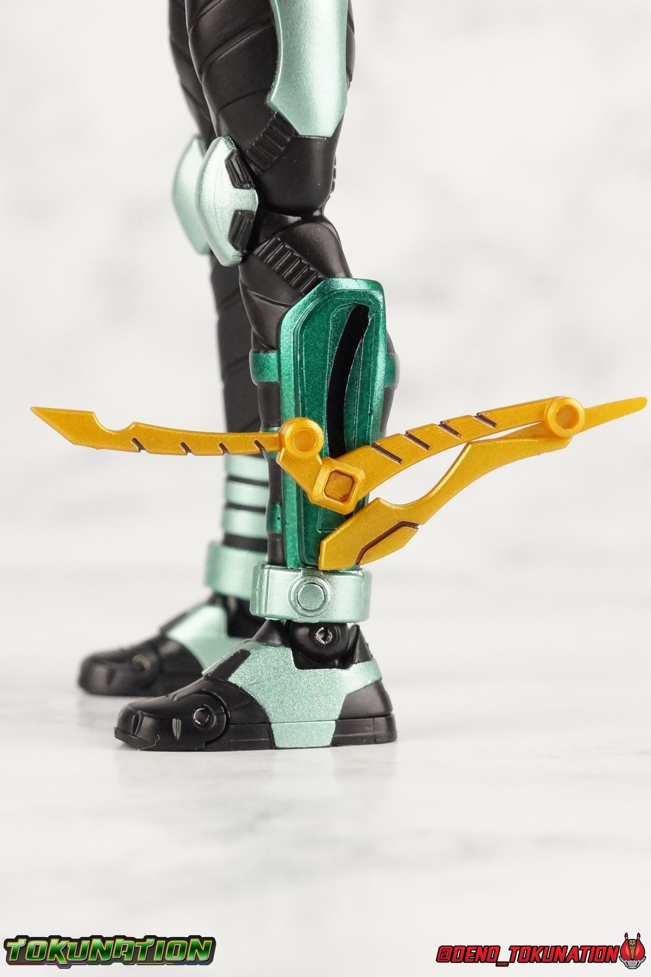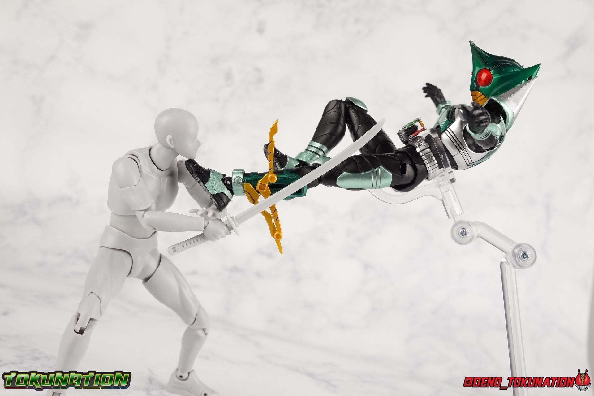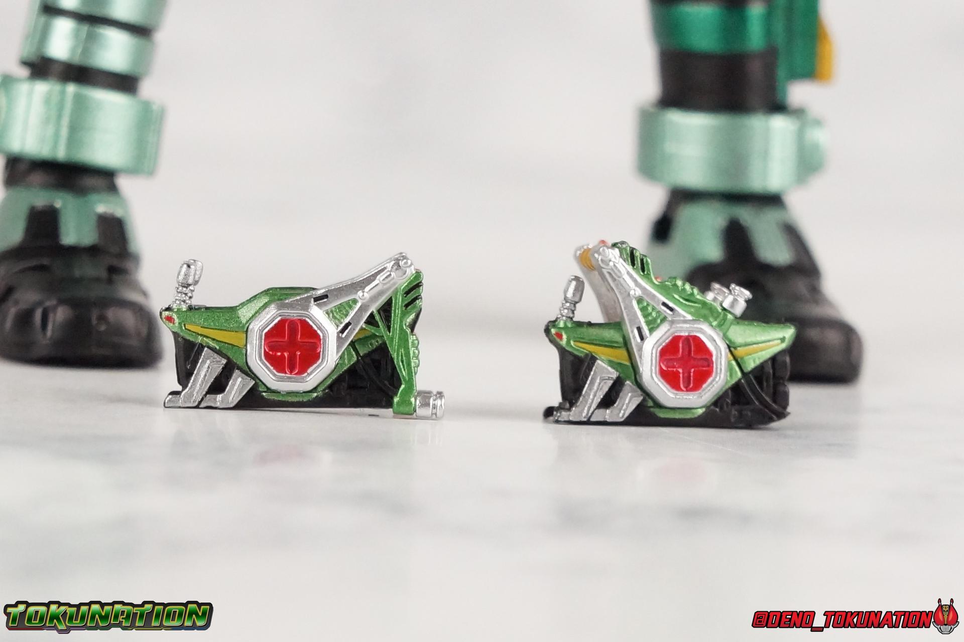 Sou Yaguruma was once the top dog of ZECT, commanding legions of ZECTroopers as Kamen Rider TheBee. The advocate of "perfect harmony" would soon be humbled however by Souji Tendou, and begin walking a darker path of self-loathing that eventually (and inexplicably) lead him to his new identity as Kamen Rider Kickhopper! Now Yaguruma is the latest addition to the Shinkocchou Seihou premium renewal line of S.H. Figuarts! So let's dive into our review of the figure. Packaging That standard slipcover packaging of Shinkocchou Seihou returns again. I promise I really appreciate the ease of access this kind of packaging provides. I really like this design more than a standard figuarts square box, but they've gotta start spicing things up. The one monotone image across the front of the box is getting rather boring. The presentation is nice but it's starting to fall flat in the face of more colorful and creative mainline releases like those from Ex-Aid is all. Main Figure Just as with Kabuto, Gattack, & Dark Kabuto before him, Kickhopper is an overwhelmingly needed update to an outdated and obsolete figure. The original release was plagued by the now standard QC issues of the original Kabuto line. Especially with those bowed legs. I'm happy to report that Seihou Kickhopper is the perfect successor to that original release. As with my last couple Seihou galleries form this series, you'll find a lot of similar passages in my review, it's just unavoidable when these figures share the same basic body and tooling aside from a few key areas. But I'll definitely zero in on the differences with this one. To start, the most iconic thing about Kickhopper is of course the Anchor Joint weapon attached to his left ankle. This unique item not only gives Kickhopper the 'jump' in his Rider Jump, but packs all the power behind his Rider Kick. It's also the most improved thing about this release. On the original figure it was a static accessory, permanently fixed in placed. This go around however the Anchor Joint is actually jointed and can be slid down the shin with the blade fully extendable to properly recreate a Rider Kick. The style of hips originally implemented in this mold provide a wide and balanced motion that allows you to replicate all of Kickhoppers most iconic poses & attacks. Though I do still think any standing kick looks pretty goofy in figure form. I would say the hips are limited only by their design as they do impact the waist assembly a little more prematurely than I'd like. But it's undeniable how versatile they are compared to many figures. The Hopper Zecter is really nicely detailed, especially when compared to the original. The details are sharp, the paint apps crisp, and it's even removeable. If you flip it around, the backside is also (properly) fully painted in Punch Hopper colors. It does pop off the buckle rather easily but it just looks so good. And while we don't have moving pectoral plates or flexible chest armor like with Kabuto & Dark Kabuto, Kickhopper's design is still pretty smooth, albeit a bit more limited in the upper body area. But you also don't have to worry about the torso impacting the Zecter. The new chest armor is really really nice though, it looks like a perfect replica of the show prop with really subtle paint details I had never really noticed before. The arms are free of nearly all obstruction thanks to wonderfully hinged shoulder pads. They do tend to look a little unnatural in some poses and expose the joints beneath however. But the elbows and wrist provide the same great range of motion we've come to expect from this mold, one that's still holding up very well 3 years on. Lastly we look at Kickhoppers head, which is just spot on. The original suffered from it's disproportionate size to the body as well as some issues with length and width. I'm happy to report that this go around the head is the correct size relative to the body and also the proper glossy green. The mouth plate is a brilliant gold and the compound eyes really sparkle in the right light. As with his 3 predecessors, Shinkocchou Seihou Kickhopper really is the ultimate apology for the original release. And being able to FINALLY recreate my favorite moment from Kabuto, the Triple Rider Kick in Seihou form, is the ultimate treat. Accessories Not much here, but just what you need: 1- Hopper Zecter (open). This is the flipped version of the Hopper Zecter from Kickhopper's Rider Jump/Kick combination. After the moving parts that were present on Seihou Kabuto's Zecter years ago I was surprised that Seihou Gattacks' was a swap out part instead, and I'm surprised again that the Hopper Zecter is the same. It just seems like something that could have been engineered to work instead. I mean just look at the W Driver & Gaia Memories. 2 - sets of hands. These hands are a bit odd if you ask me. The open hands are a very stiff variety of open palm. They aren't very expressive at all. The other pair are the standard type of "holding things" hands, and they look almost perfectly shaped for handlebars on a Rider Machine. But the Hopper Bros had no such bikes, nor any weapons they would have held. So these hands are a really pointless inclusion. The two glaring omissions that most collectors will notice are undoubtedly items included with the original figuart. The ramen bowl as well as a personalized Tamashii Stage. The ramen bowl was a pretty hilarious and iconic accessory, signifying one of the goofier plots of the show. And while the stage isn't nearly as important, it was nice that the original Hopper bros came with them. As is the original figuart is so dirt cheap now you could pretty much buy it just for those accessories. So while it's a bummer they weren't included here, it's no great loss either. Final Thoughts That's 4 down and well frankly quite a few to go. With Hyper Kabuto on the way finally, is it only a mater of time before TheBee, Sasword, Drake and others finally get this premium treatment as well