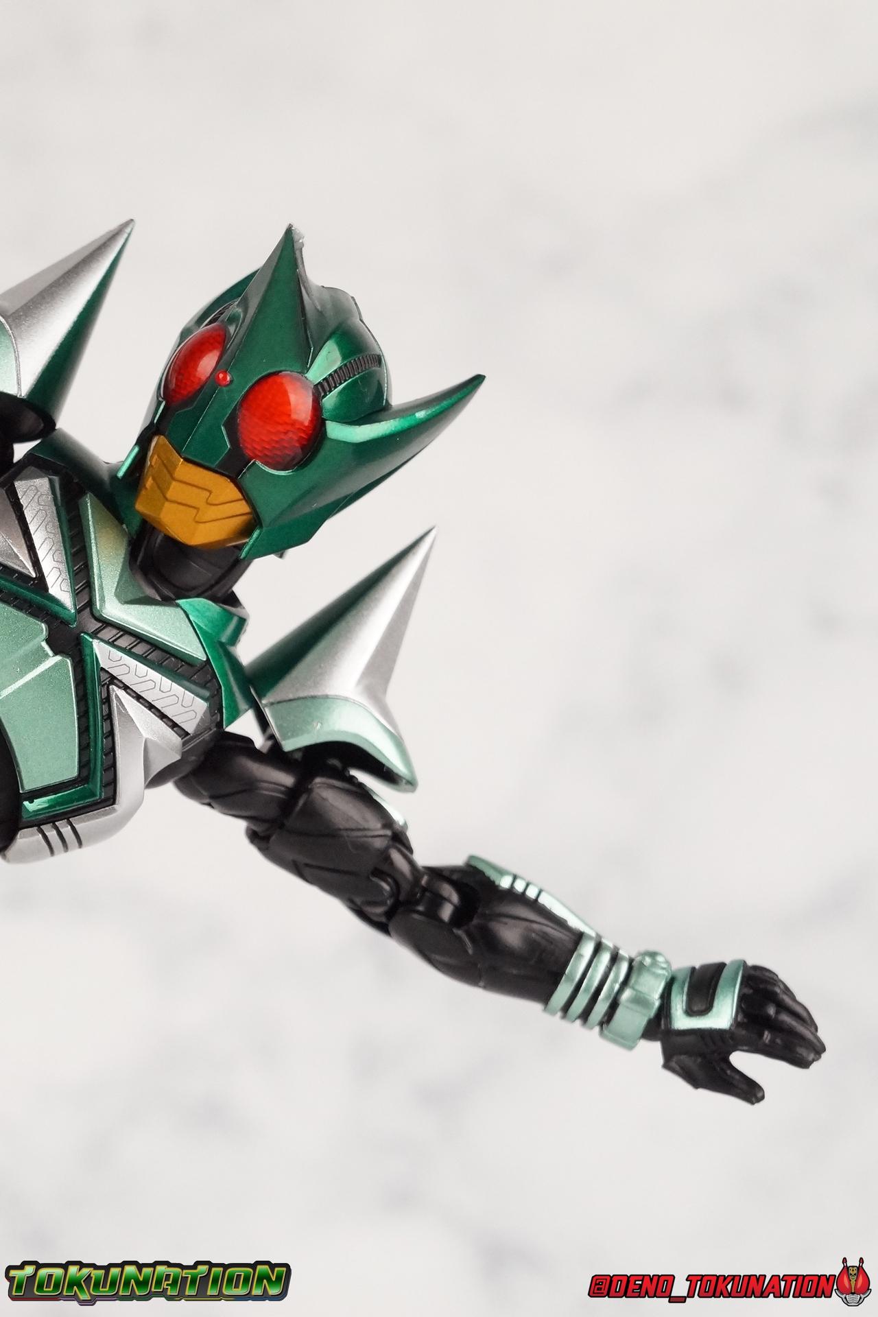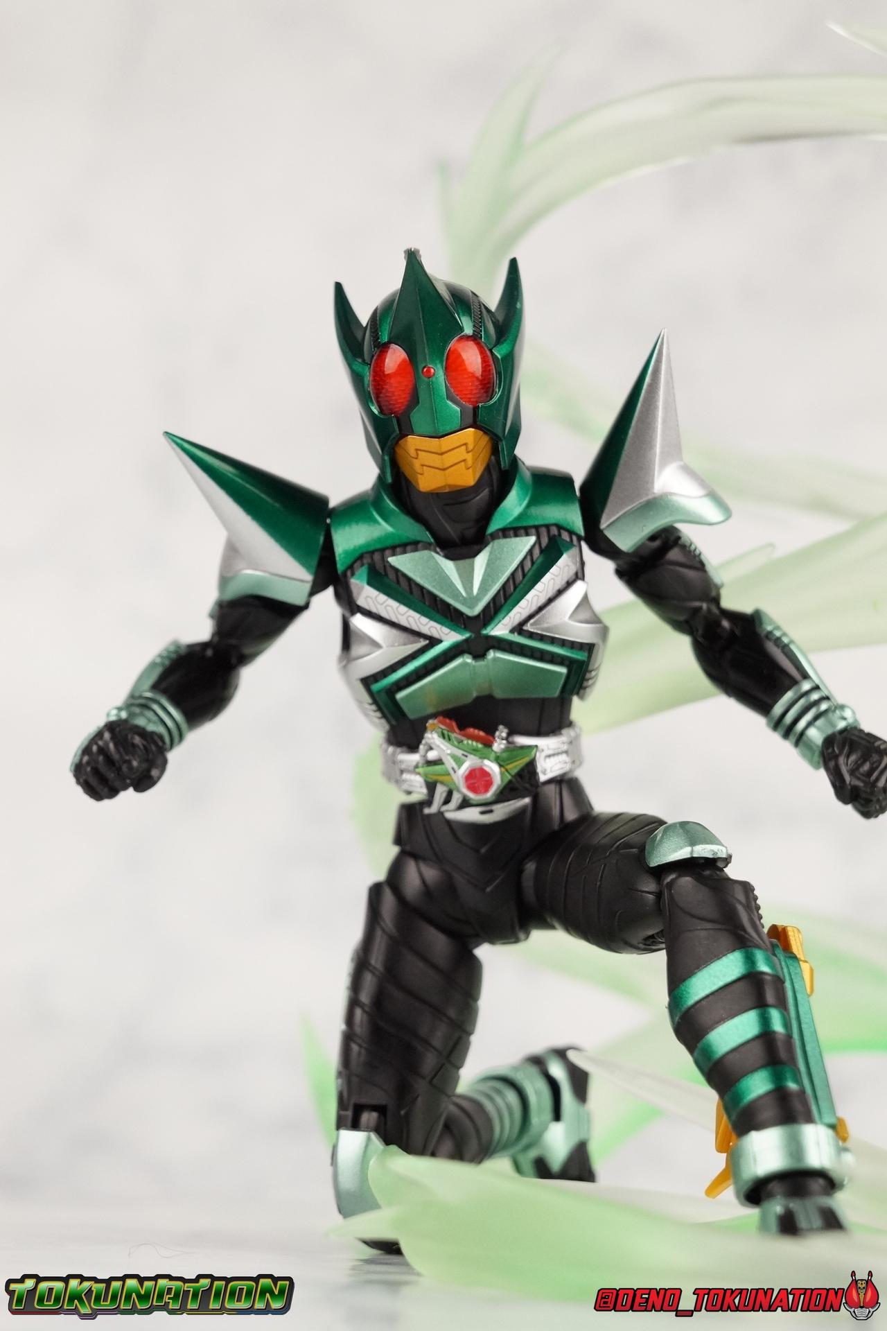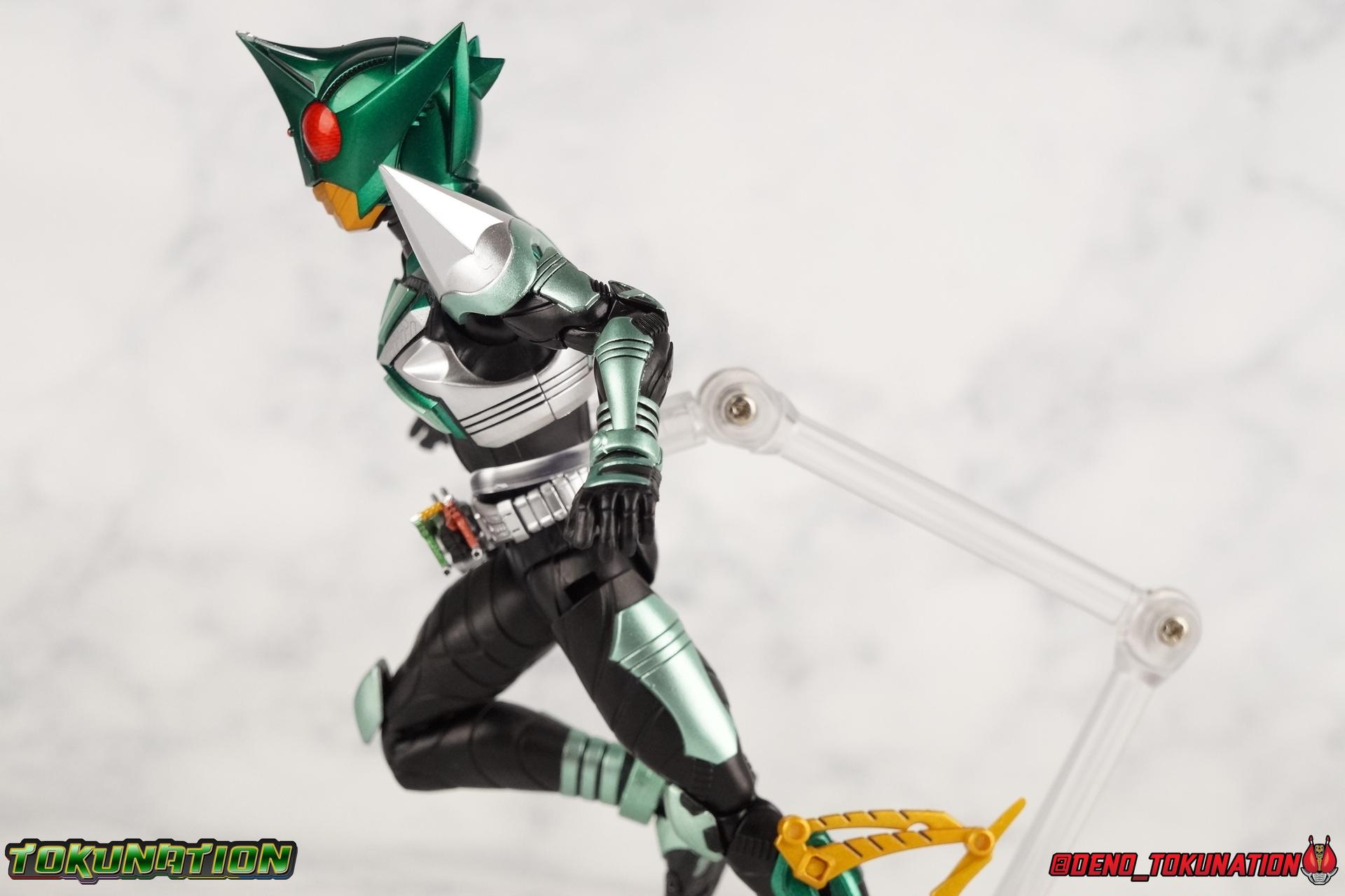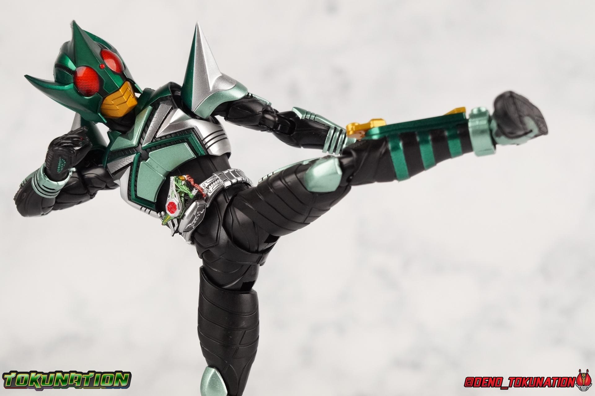 Sou Yaguruma was once the top dog of ZECT, commanding legions of ZECTroopers as Kamen Rider TheBee. The advocate of "perfect harmony" would soon be humbled however by Souji Tendou, and begin walking a darker path of self-loathing that eventually (and inexplicably) lead him to his new identity as Kamen Rider Kickhopper! Now Yaguruma is the latest addition to the Shinkocchou Seihou premium renewal line of S.H. Figuarts! So let's dive into our review of the figure. Packaging That standard slipcover packaging of Shinkocchou Seihou returns again. I promise I really appreciate the ease of access this kind of packaging provides. I really like this design more than a standard figuarts square box, but they've gotta start spicing things up. The one monotone image across the front of the box is getting rather boring. The presentation is nice but it's starting to fall flat in the face of more colorful and creative mainline releases like those from Ex-Aid is all. Main Figure Just as with Kabuto, Gattack, & Dark Kabuto before him, Kickhopper is an overwhelmingly needed update to an outdated and obsolete figure. The original release was plagued by the now standard QC issues of the original Kabuto line. Especially with those bowed legs. I'm happy to report that Seihou Kickhopper is the perfect successor to that original release. As with my last couple Seihou galleries form this series, you'll find a lot of similar passages in my review, it's just unavoidable when these figures share the same basic body and tooling aside from a few key areas. But I'll definitely zero in on the differences with this one. To start, the most iconic thing about Kickhopper is of course the Anchor Joint weapon attached to his left ankle. This unique item not only gives Kickhopper the 'jump' in his Rider Jump, but packs all the power behind his Rider Kick. It's also the most improved thing about this release. On the original figure it was a static accessory, permanently fixed in placed. This go around however the Anchor Joint is actually jointed and can be slid down the shin with the blade fully extendable to properly recreate a Rider Kick. The style of hips originally implemented in this mold provide a wide and balanced motion that allows you to replicate all of Kickhoppers most iconic poses & attacks. Though I do still think any standing kick looks pretty goofy in figure form. I would say the hips are limited only by their design as they do impact the waist assembly a little more prematurely than I'd like. But it's undeniable how versatile they are compared to many figures. The Hopper Zecter is really nicely detailed, especially when compared to the original. The details are sharp, the paint apps crisp, and it's even removeable. If you flip it around, the backside is also (properly) fully painted in Punch Hopper colors. It does pop off the buckle rather easily but it just looks so good. And while we don't have moving pectoral plates or flexible chest armor like with Kabuto & Dark Kabuto, Kickhopper's design is still pretty smooth, albeit a bit more limited in the upper body area. But you also don't have to worry about the torso impacting the Zecter. The new chest armor is really really nice though, it looks like a perfect replica of the show prop with really subtle paint details I had never really noticed before. The arms are free of nearly all obstruction thanks to wonderfully hinged shoulder pads. They do tend to look a little unnatural in some poses and expose the joints beneath however. But the elbows and wrist provide the same great range of motion we've come to expect from this mold, one that's still holding up very well 3 years on. Lastly we look at Kickhoppers head, which is just spot on. The original suffered from it's disproportionate size to the body as well as some issues with length and width. I'm happy to report that this go around the head is the correct size relative to the body and also the proper glossy green. The mouth plate is a brilliant gold and the compound eyes really sparkle in the right light. As with his 3 predecessors, Shinkocchou Seihou Kickhopper really is the ultimate apology for the original release. And being able to FINALLY recreate my favorite moment from Kabuto, the Triple Rider Kick in Seihou form, is the ultimate treat. Accessories Not much here, but just what you need: 1- Hopper Zecter (open). This is the flipped version of the Hopper Zecter from Kickhopper's Rider Jump/Kick combination. After the moving parts that were present on Seihou Kabuto's Zecter years ago I was surprised that Seihou Gattacks' was a swap out part instead, and I'm surprised again that the Hopper Zecter is the same. It just seems like something that could have been engineered to work instead. I mean just look at the W Driver & Gaia Memories. 2 - sets of hands. These hands are a bit odd if you ask me. The open hands are a very stiff variety of open palm. They aren't very expressive at all. The other pair are the standard type of "holding things" hands, and they look almost perfectly shaped for handlebars on a Rider Machine. But the Hopper Bros had no such bikes, nor any weapons they would have held. So these hands are a really pointless inclusion. The two glaring omissions that most collectors will notice are undoubtedly items included with the original figuart. The ramen bowl as well as a personalized Tamashii Stage. The ramen bowl was a pretty hilarious and iconic accessory, signifying one of the goofier plots of the show. And while the stage isn't nearly as important, it was nice that the original Hopper bros came with them. As is the original figuart is so dirt cheap now you could pretty much buy it just for those accessories. So while it's a bummer they weren't included here, it's no great loss either. Final Thoughts That's 4 down and well frankly quite a few to go. With Hyper Kabuto on the way finally, is it only a mater of time before TheBee, Sasword, Drake and others finally get this premium treatment as well