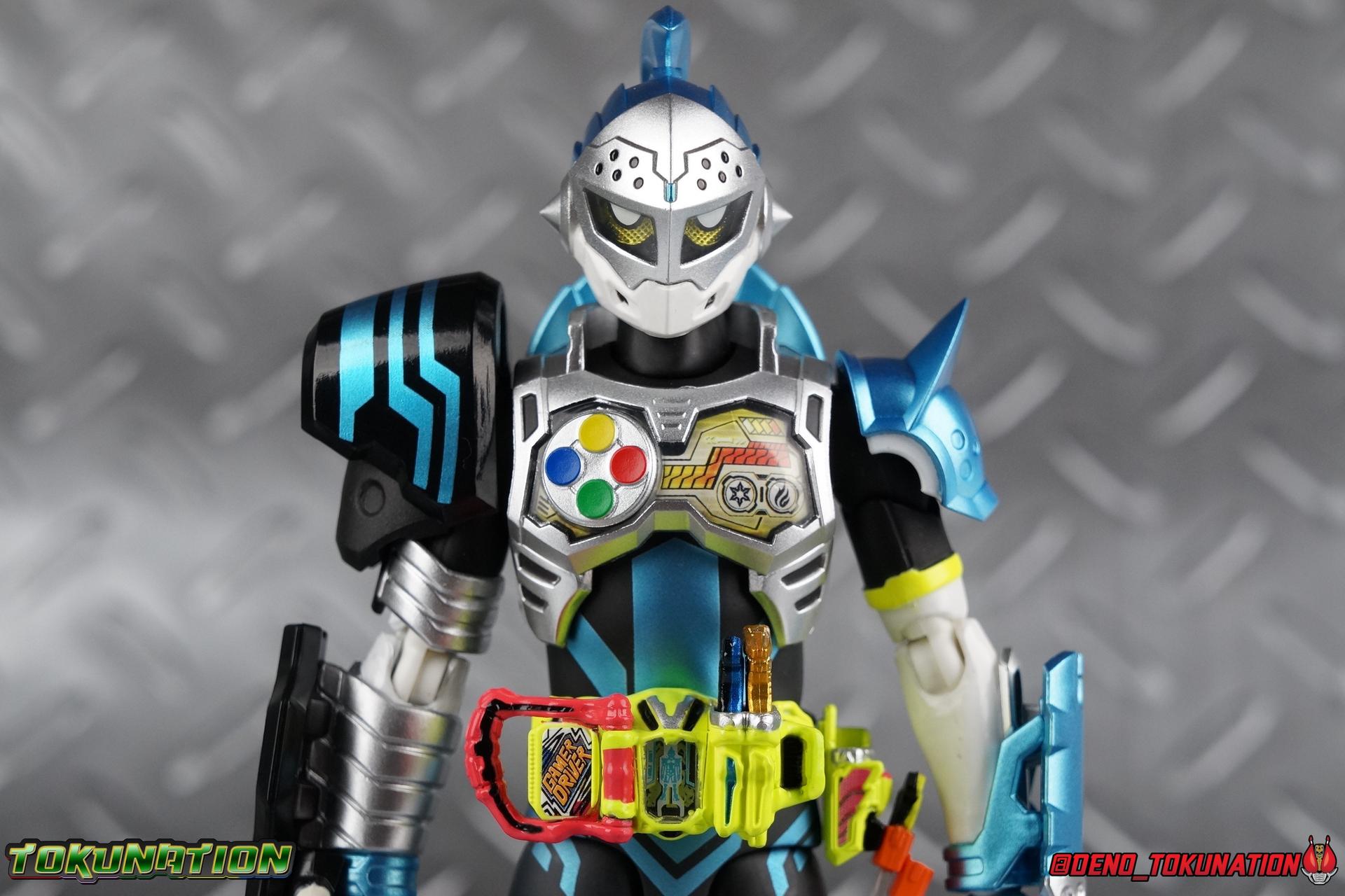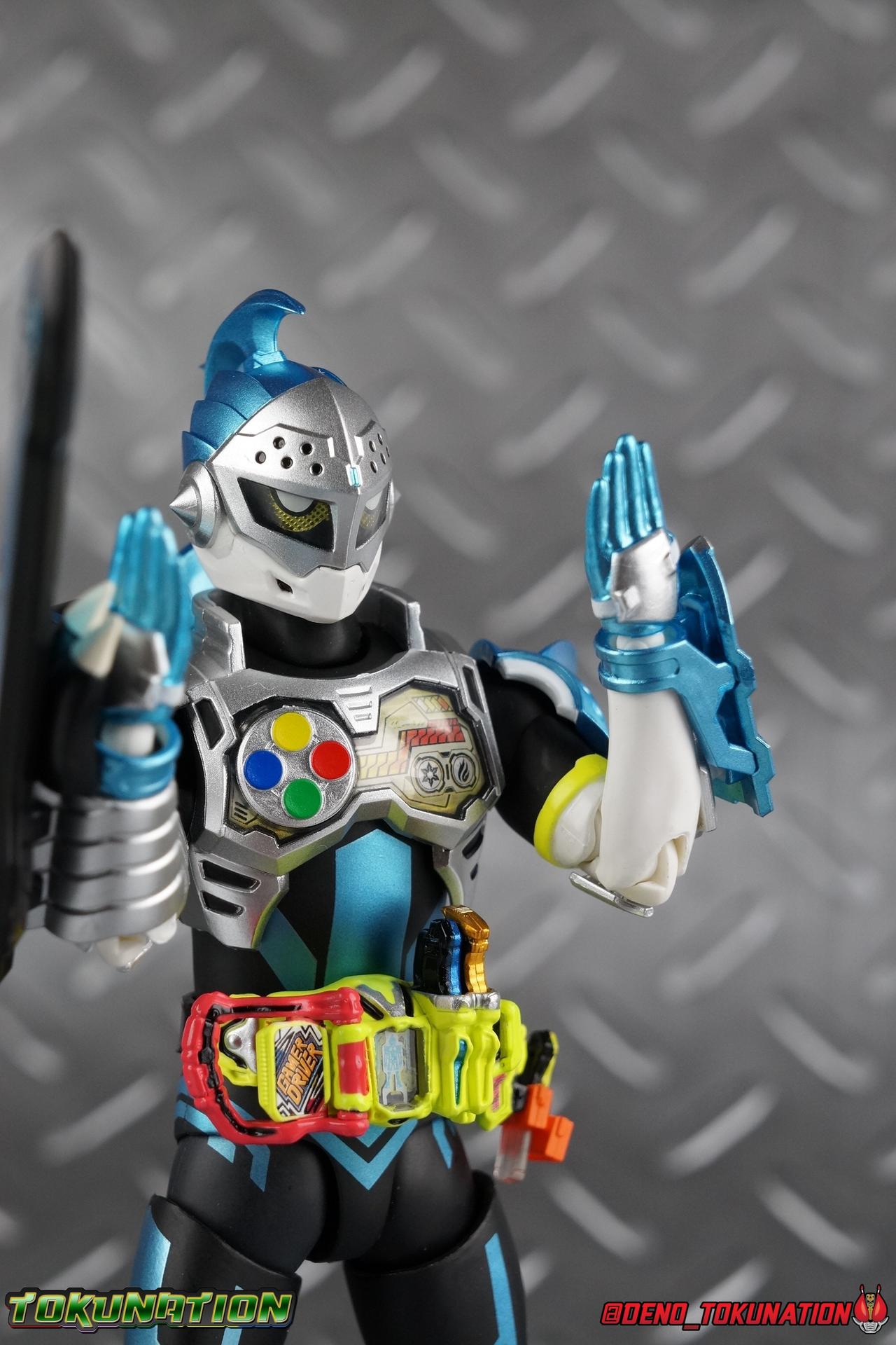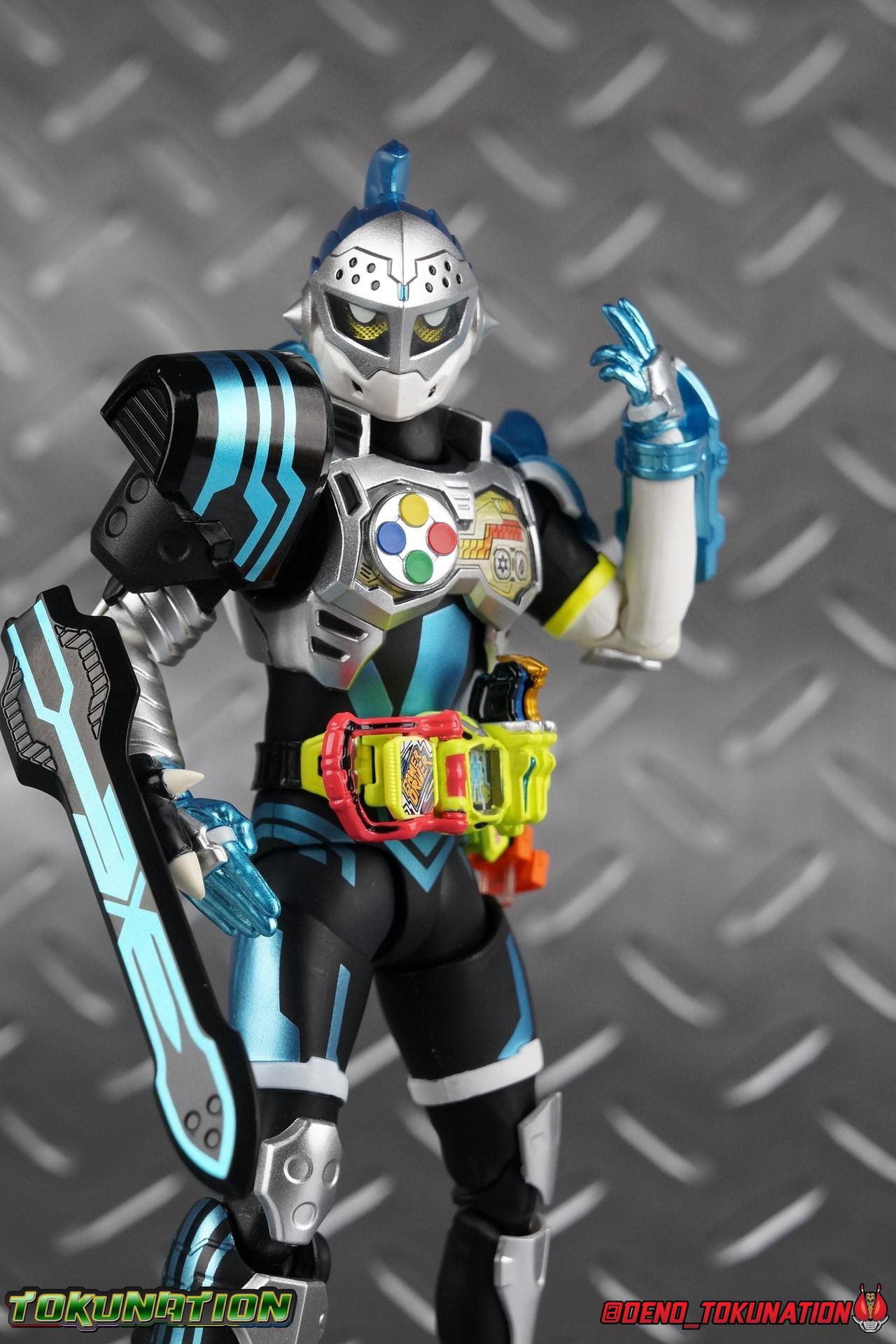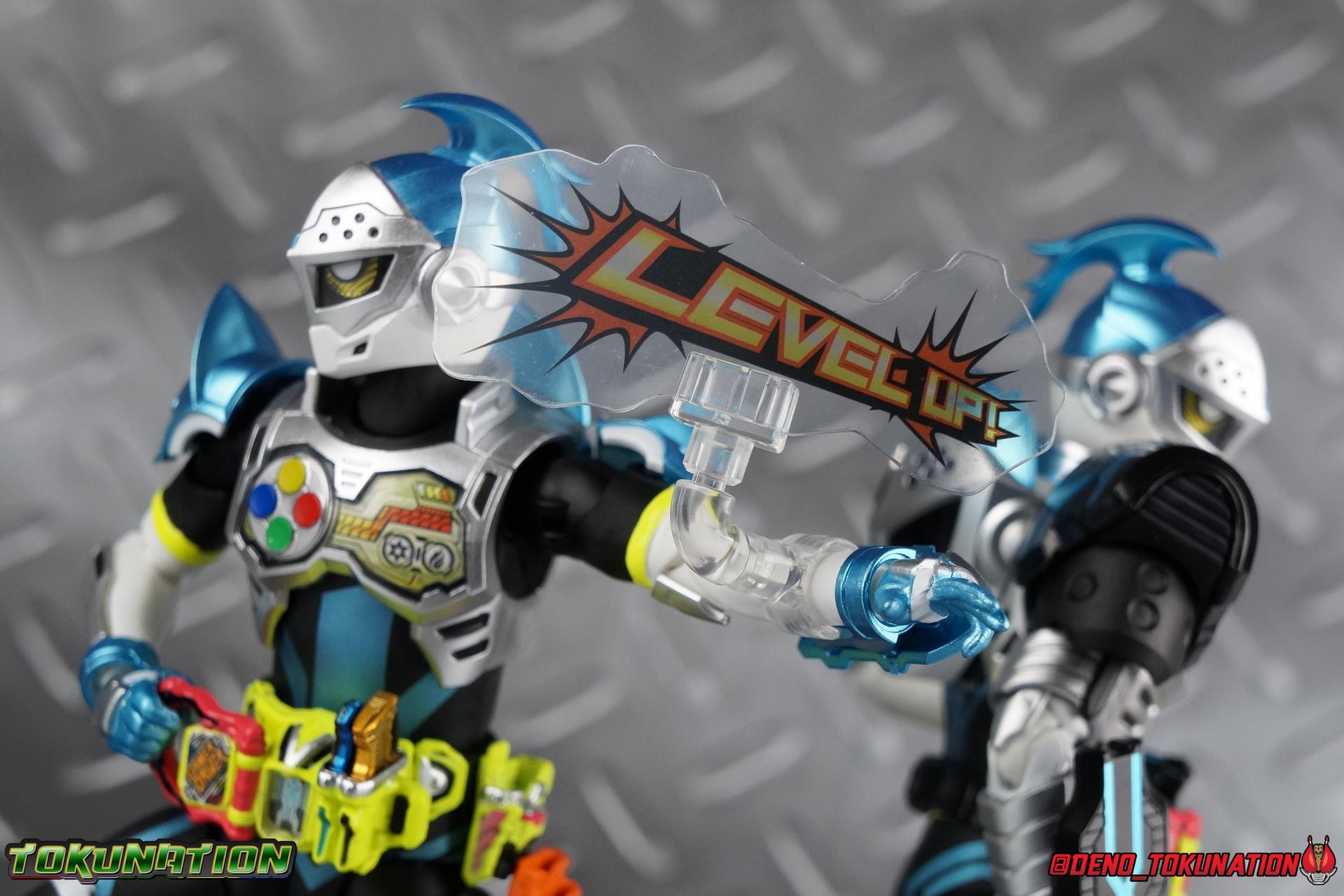 When 1 Player alone couldn't defeat the powered up Bugster, Graphite, it took 4-Player co-op to bring him down! Using the Level 5 Gashat Drago Knight Hunter Z Ex-Aid and his allies were each granted a portion of it's power and a piece of it's armor. In Hiro's case he inherited the power of the Dragon Blade, fitting his knight theme perfectly. In co-op form Brave only gained this piece of the Hunter Gamer powers but would eventually come to master this Gashat's power completely. Now it's time to take a look at how well his Figuart has inherited the Dragon's Blade with our review of S.H. Figuarts Kamen Rider Brave Hunter Quest Gamer Level 5! Packaging As with the first web exclusive in this line, Lazer Level 2, Brave features a bright and standout box. With no packaging window as all web exclusives are these days. As with Lazer the colors really pop and I like the character portrait on the front, despite it's rather misleading positioning of the figures arms. More on that later. Main Figure Seeing as this figure features components from two others we've seen previously, Brave Level 2 & Ex-Aid Level 5, you'll notice a lot of my review is very similar. Most of Brave Level 5's body is reused from the Level 2 release. While the right side of the body reuses components from the Level 5 Ex-Aid body. The Level 2 Ex-Aid riders themselves all share a great many number of parts as is. Each suit has it's own unique detailing and colors, but at a basic level they feature the same mold. Sporty type shoes, the bike shorts look, the driver, the chest plate. You see what I mean. This release of Brave is still as lavish as the first. From the Ground up the Ex-Aid type body is pretty solidly built. Though the ankles are still a huge fault for me. They don't have the full range of motion they need for Brave to assume many of the dynamic poses he's known for. You'll find that wide stances are just really really difficult to achieve, which means he's always gonna be a bit off balance. Sadly my Level 5 Brave also appears to have one leg longer than the other making it difficult to get him in a normal standing pose. The knees have a great bend that helps improve some of the articulation. And I would say that the bulkier right leg helps a bit with weight and stability. All that being said, the paint apps for the legs are exquisite. Luckily the white paint apps are so much better this go around. My Level 2 Brave had very spotty QC there. As with previous releases, Gamer Driver is still my favorite thing about the figure. This entire device is extraordinarily detailed for something at this scale. The Driver handle can flip shut. The functionality it features still astounds me. Changes to this release include a new "dummy" Drago Knight Hunter Z Gashat, which is removable as you can see in my pictures below. You can insert it as with any other Gashat into the Critical Finish slot on the Gashat Holster. Speaking of there's also what is meant to be the Level 3 DoReMiFa Beat Gashat in the holster. As with Ex-Aid Level 5's Gekitotsu Robots Gashat, DoReMiFa Beat is sparsely detailed and permanently fixed to the holster. Brave's upper body, left arm and head are unchanged. Brave is absolutely breathtaking but his chest detailing is something I still just cannot get over. The paint apps on the outer layer are crisp and clear, but I'm so impressed by the Rider Gauge label within his chest. On the flip side of the torso is the deactivated Level 1 head we've seen before. The left arm still has that pesky issue with the shoulder pad. Every time I try to stretch the arms out it's like rather than sliding out properly the pads just pop off again. Still a minor issue but one that bugs me. Looking up to the head, if you were irked by the lack of a white collar on the Level 2 releases then feel free to be irked again. It's an inconsequential detail to me. It's silver this go around too and that doesn't really bother me. Before we finish up with the main body, Brave's right arm has been replaced by the Level 5 Dragon Gun arm. Surprisingly, or maybe it shouldn't be, this arm isn't impaired at all like it was with Ex-Aid Level 5. With Ex-Aid the bulky shoulder pad was attached directly to the main body via the new chest plate on the torso. With Brave thankfully this pad is just attached to the arm and it really frees up the movement. Sadly the elbow is still neutered, being unable to achieve even a decent 90 degree angle. Exchanging hands on this arm is also a nightmare. The wrist pegs are rather tight on this release and difficult to replace thanks to the dragon claws on the wrist. Just as they were with Ex-Aid Physical shortcomings aside, this release still fills out my display quite well. But the real point of it is the accessories it includes. Accessories 4 - sets of hands. These are identical to those that came with Level 2 Brave. Straight re-packs with no additions or subtractions at all. 7 - "word bubble" effect parts. These clear thin plastic sheets were the big selling point for both Brave & Snipe Level 5. Each replicates an effect a battle action or outcome from the show. Included are: