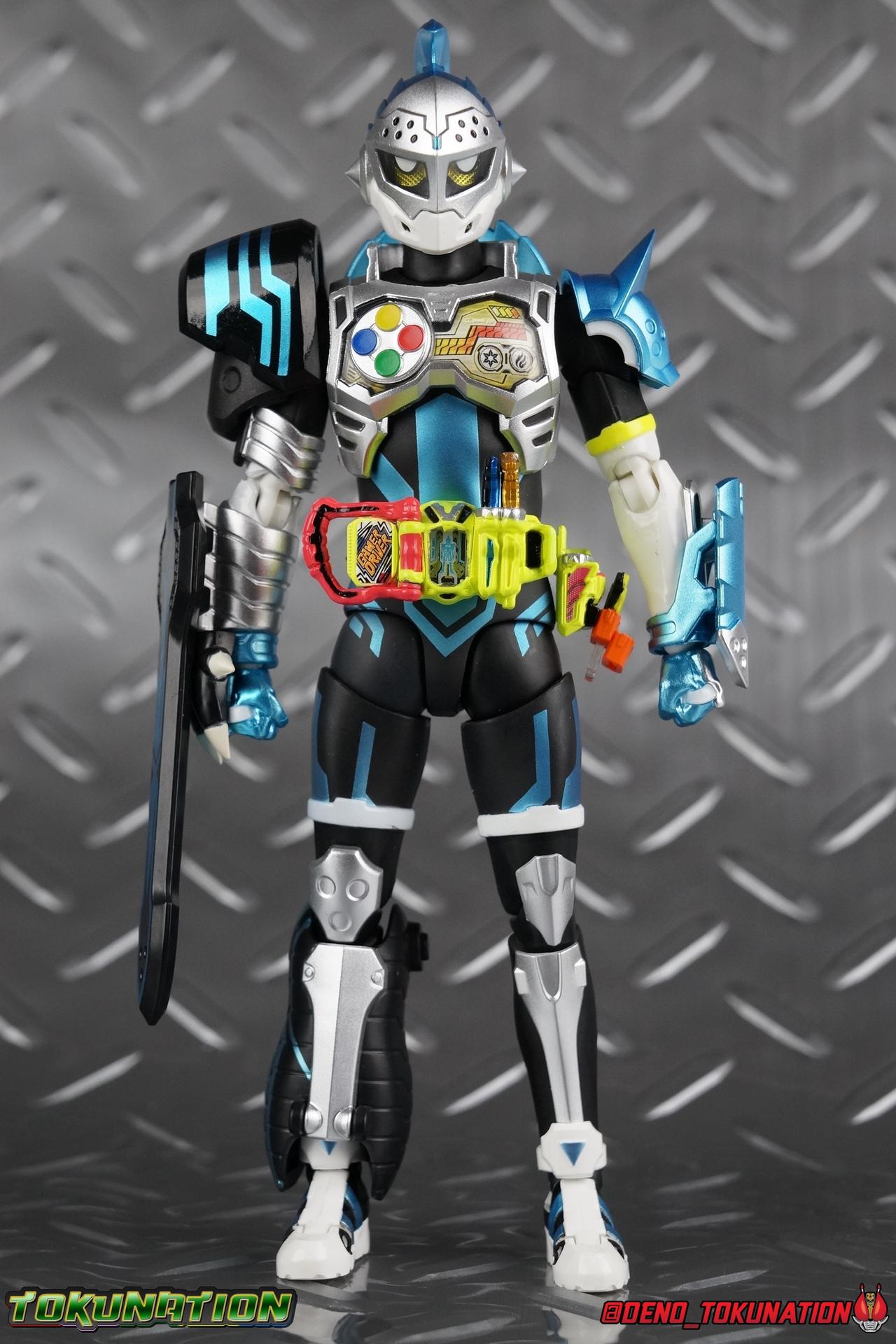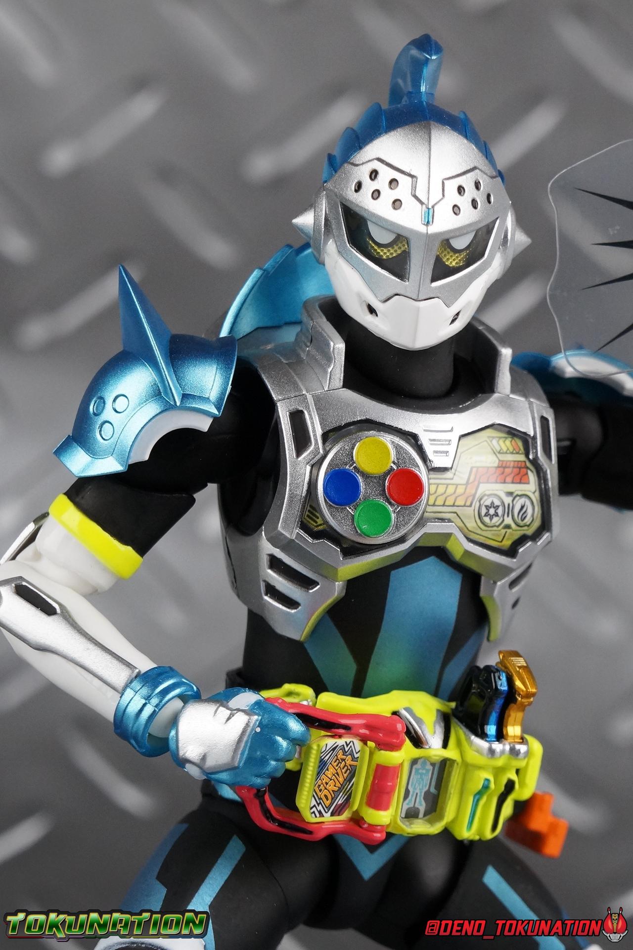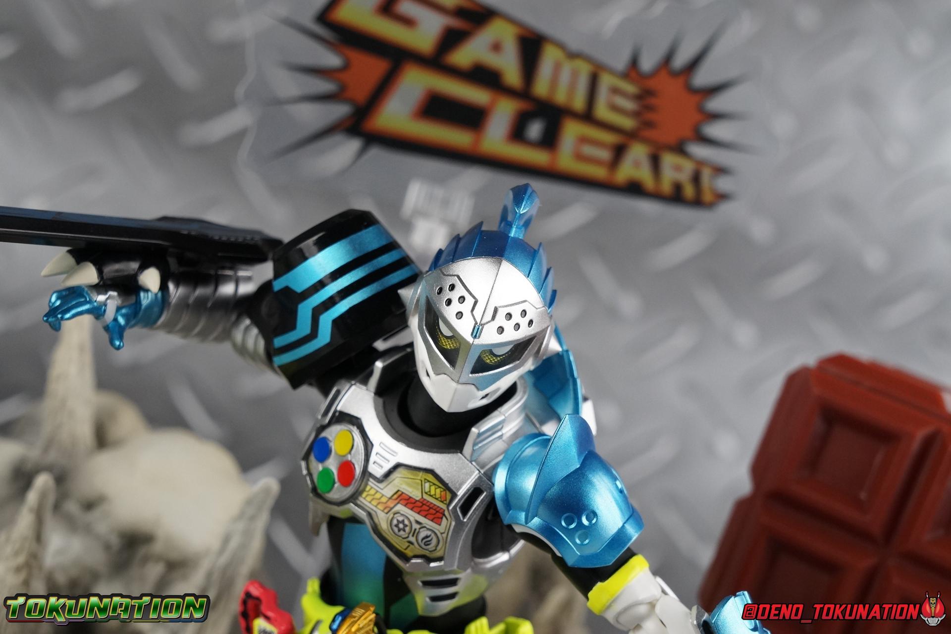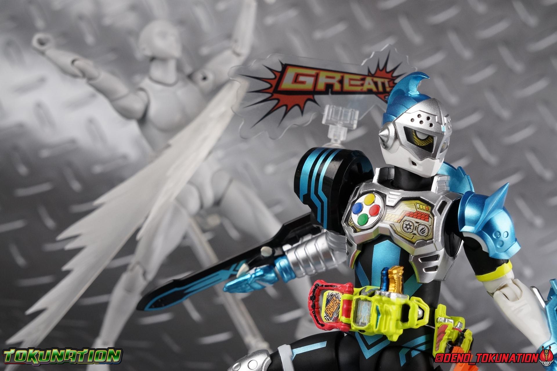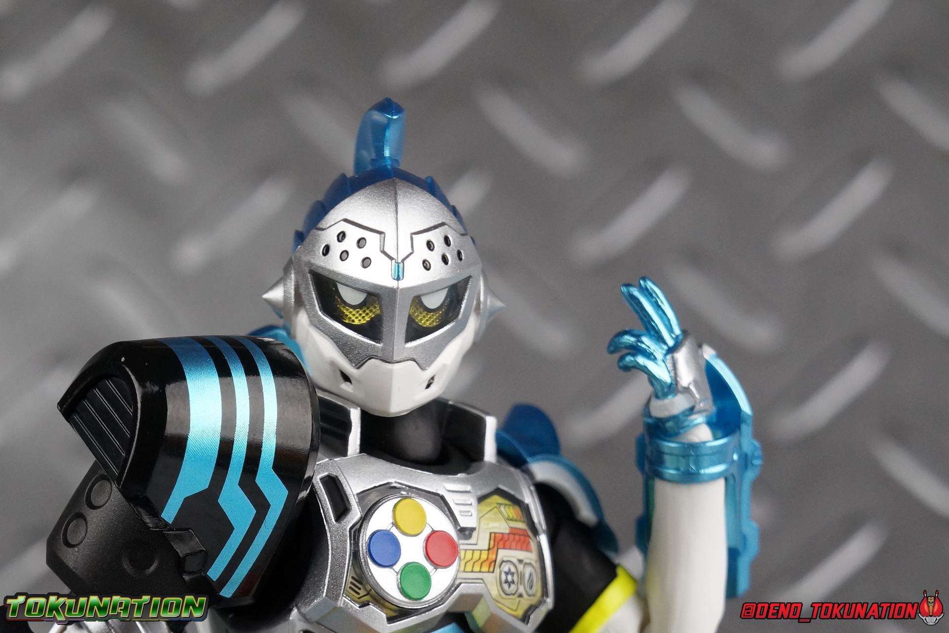 When 1 Player alone couldn't defeat the powered up Bugster, Graphite, it took 4-Player co-op to bring him down! Using the Level 5 Gashat Drago Knight Hunter Z Ex-Aid and his allies were each granted a portion of it's power and a piece of it's armor. In Hiro's case he inherited the power of the Dragon Blade, fitting his knight theme perfectly. In co-op form Brave only gained this piece of the Hunter Gamer powers but would eventually come to master this Gashat's power completely. Now it's time to take a look at how well his Figuart has inherited the Dragon's Blade with our review of S.H. Figuarts Kamen Rider Brave Hunter Quest Gamer Level 5! Packaging As with the first web exclusive in this line, Lazer Level 2, Brave features a bright and standout box. With no packaging window as all web exclusives are these days. As with Lazer the colors really pop and I like the character portrait on the front, despite it's rather misleading positioning of the figures arms. More on that later. Main Figure Seeing as this figure features components from two others we've seen previously, Brave Level 2 & Ex-Aid Level 5, you'll notice a lot of my review is very similar. Most of Brave Level 5's body is reused from the Level 2 release. While the right side of the body reuses components from the Level 5 Ex-Aid body. The Level 2 Ex-Aid riders themselves all share a great many number of parts as is. Each suit has it's own unique detailing and colors, but at a basic level they feature the same mold. Sporty type shoes, the bike shorts look, the driver, the chest plate. You see what I mean. This release of Brave is still as lavish as the first. From the Ground up the Ex-Aid type body is pretty solidly built. Though the ankles are still a huge fault for me. They don't have the full range of motion they need for Brave to assume many of the dynamic poses he's known for. You'll find that wide stances are just really really difficult to achieve, which means he's always gonna be a bit off balance. Sadly my Level 5 Brave also appears to have one leg longer than the other making it difficult to get him in a normal standing pose. The knees have a great bend that helps improve some of the articulation. And I would say that the bulkier right leg helps a bit with weight and stability. All that being said, the paint apps for the legs are exquisite. Luckily the white paint apps are so much better this go around. My Level 2 Brave had very spotty QC there. As with previous releases, Gamer Driver is still my favorite thing about the figure. This entire device is extraordinarily detailed for something at this scale. The Driver handle can flip shut. The functionality it features still astounds me. Changes to this release include a new "dummy" Drago Knight Hunter Z Gashat, which is removable as you can see in my pictures below. You can insert it as with any other Gashat into the Critical Finish slot on the Gashat Holster. Speaking of there's also what is meant to be the Level 3 DoReMiFa Beat Gashat in the holster. As with Ex-Aid Level 5's Gekitotsu Robots Gashat, DoReMiFa Beat is sparsely detailed and permanently fixed to the holster. Brave's upper body, left arm and head are unchanged. Brave is absolutely breathtaking but his chest detailing is something I still just cannot get over. The paint apps on the outer layer are crisp and clear, but I'm so impressed by the Rider Gauge label within his chest. On the flip side of the torso is the deactivated Level 1 head we've seen before. The left arm still has that pesky issue with the shoulder pad. Every time I try to stretch the arms out it's like rather than sliding out properly the pads just pop off again. Still a minor issue but one that bugs me. Looking up to the head, if you were irked by the lack of a white collar on the Level 2 releases then feel free to be irked again. It's an inconsequential detail to me. It's silver this go around too and that doesn't really bother me. Before we finish up with the main body, Brave's right arm has been replaced by the Level 5 Dragon Gun arm. Surprisingly, or maybe it shouldn't be, this arm isn't impaired at all like it was with Ex-Aid Level 5. With Ex-Aid the bulky shoulder pad was attached directly to the main body via the new chest plate on the torso. With Brave thankfully this pad is just attached to the arm and it really frees up the movement. Sadly the elbow is still neutered, being unable to achieve even a decent 90 degree angle. Exchanging hands on this arm is also a nightmare. The wrist pegs are rather tight on this release and difficult to replace thanks to the dragon claws on the wrist. Just as they were with Ex-Aid Physical shortcomings aside, this release still fills out my display quite well. But the real point of it is the accessories it includes. Accessories 4 - sets of hands. These are identical to those that came with Level 2 Brave. Straight re-packs with no additions or subtractions at all. 7 - "word bubble" effect parts. These clear thin plastic sheets were the big selling point for both Brave & Snipe Level 5. Each replicates an effect a battle action or outcome from the show. Included are: