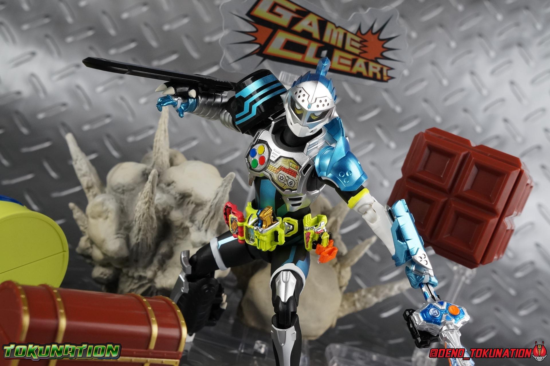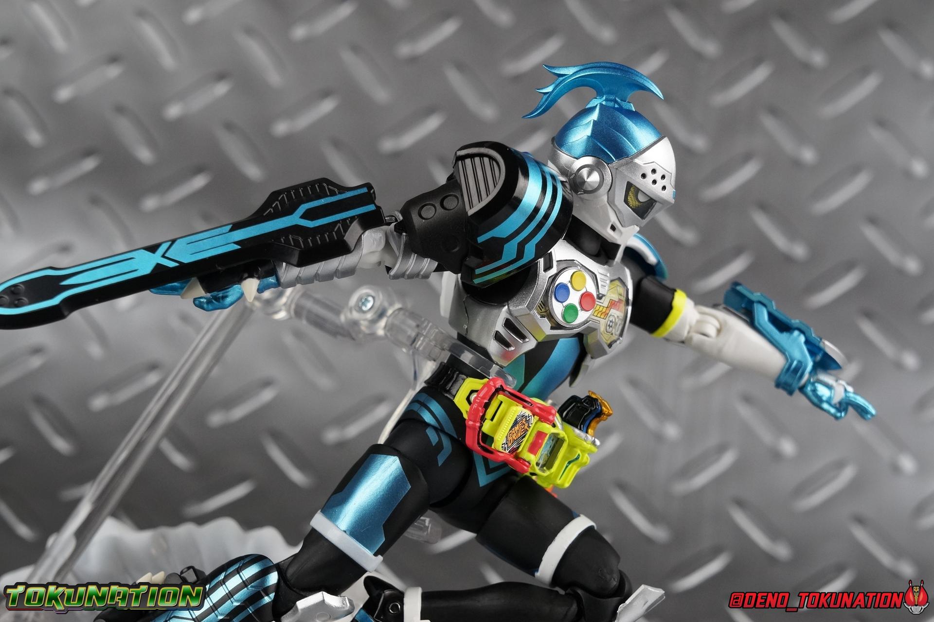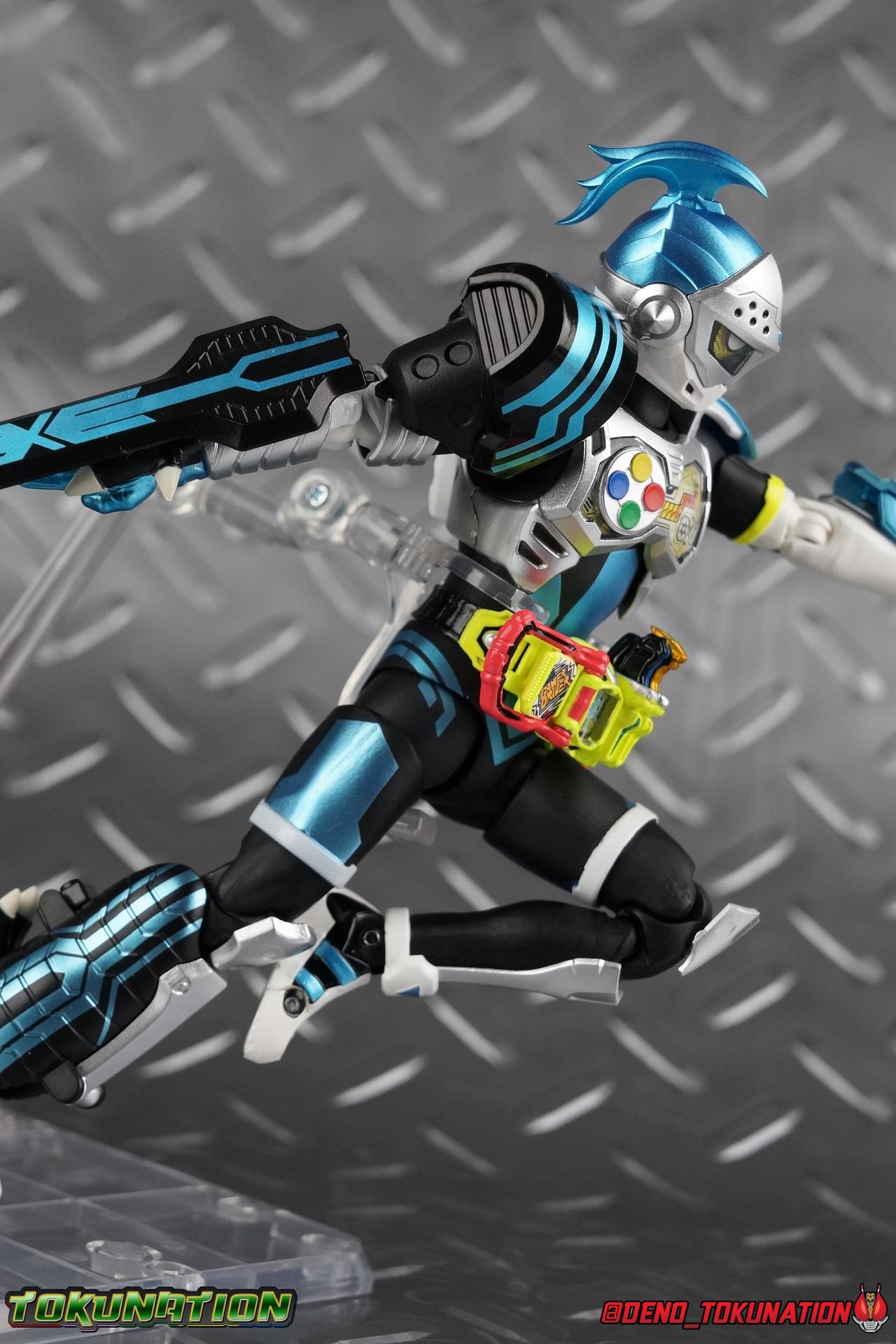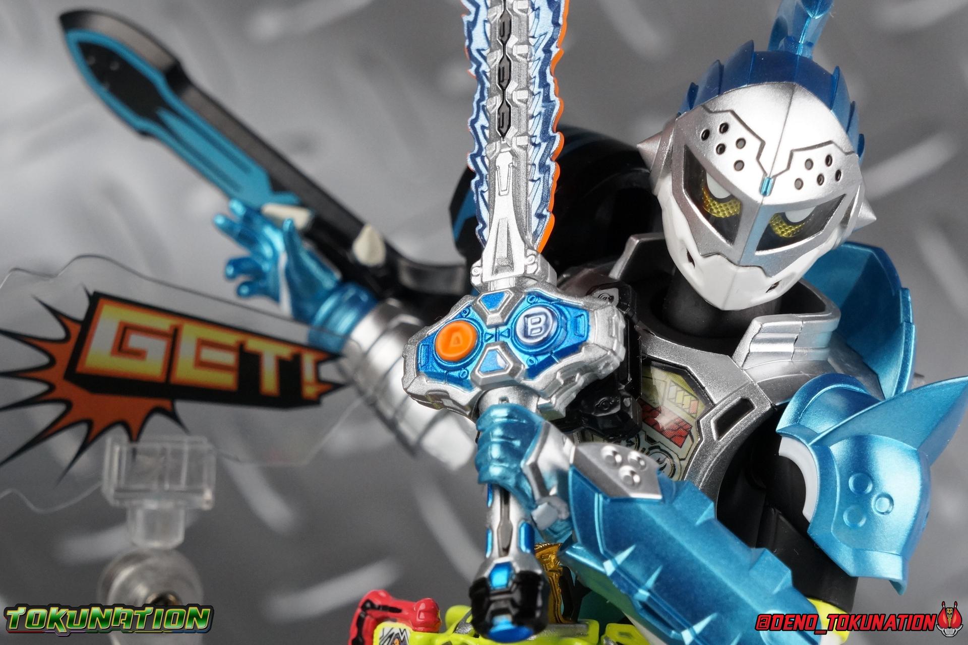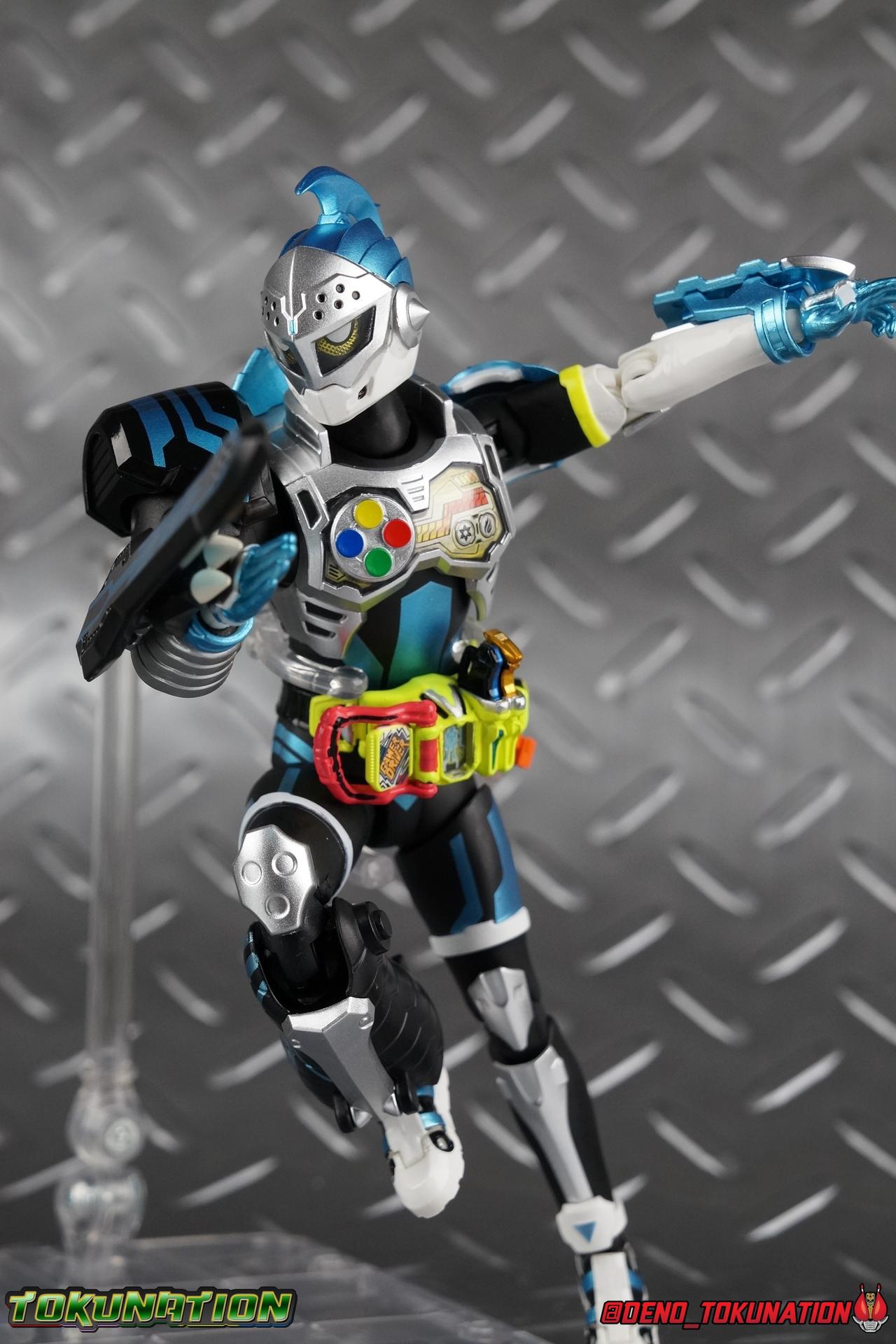 When 1 Player alone couldn't defeat the powered up Bugster, Graphite, it took 4-Player co-op to bring him down! Using the Level 5 Gashat Drago Knight Hunter Z Ex-Aid and his allies were each granted a portion of it's power and a piece of it's armor. In Hiro's case he inherited the power of the Dragon Blade, fitting his knight theme perfectly. In co-op form Brave only gained this piece of the Hunter Gamer powers but would eventually come to master this Gashat's power completely. Now it's time to take a look at how well his Figuart has inherited the Dragon's Blade with our review of S.H. Figuarts Kamen Rider Brave Hunter Quest Gamer Level 5! Packaging As with the first web exclusive in this line, Lazer Level 2, Brave features a bright and standout box. With no packaging window as all web exclusives are these days. As with Lazer the colors really pop and I like the character portrait on the front, despite it's rather misleading positioning of the figures arms. More on that later. Main Figure Seeing as this figure features components from two others we've seen previously, Brave Level 2 & Ex-Aid Level 5, you'll notice a lot of my review is very similar. Most of Brave Level 5's body is reused from the Level 2 release. While the right side of the body reuses components from the Level 5 Ex-Aid body. The Level 2 Ex-Aid riders themselves all share a great many number of parts as is. Each suit has it's own unique detailing and colors, but at a basic level they feature the same mold. Sporty type shoes, the bike shorts look, the driver, the chest plate. You see what I mean. This release of Brave is still as lavish as the first. From the Ground up the Ex-Aid type body is pretty solidly built. Though the ankles are still a huge fault for me. They don't have the full range of motion they need for Brave to assume many of the dynamic poses he's known for. You'll find that wide stances are just really really difficult to achieve, which means he's always gonna be a bit off balance. Sadly my Level 5 Brave also appears to have one leg longer than the other making it difficult to get him in a normal standing pose. The knees have a great bend that helps improve some of the articulation. And I would say that the bulkier right leg helps a bit with weight and stability. All that being said, the paint apps for the legs are exquisite. Luckily the white paint apps are so much better this go around. My Level 2 Brave had very spotty QC there. As with previous releases, Gamer Driver is still my favorite thing about the figure. This entire device is extraordinarily detailed for something at this scale. The Driver handle can flip shut. The functionality it features still astounds me. Changes to this release include a new "dummy" Drago Knight Hunter Z Gashat, which is removable as you can see in my pictures below. You can insert it as with any other Gashat into the Critical Finish slot on the Gashat Holster. Speaking of there's also what is meant to be the Level 3 DoReMiFa Beat Gashat in the holster. As with Ex-Aid Level 5's Gekitotsu Robots Gashat, DoReMiFa Beat is sparsely detailed and permanently fixed to the holster. Brave's upper body, left arm and head are unchanged. Brave is absolutely breathtaking but his chest detailing is something I still just cannot get over. The paint apps on the outer layer are crisp and clear, but I'm so impressed by the Rider Gauge label within his chest. On the flip side of the torso is the deactivated Level 1 head we've seen before. The left arm still has that pesky issue with the shoulder pad. Every time I try to stretch the arms out it's like rather than sliding out properly the pads just pop off again. Still a minor issue but one that bugs me. Looking up to the head, if you were irked by the lack of a white collar on the Level 2 releases then feel free to be irked again. It's an inconsequential detail to me. It's silver this go around too and that doesn't really bother me. Before we finish up with the main body, Brave's right arm has been replaced by the Level 5 Dragon Gun arm. Surprisingly, or maybe it shouldn't be, this arm isn't impaired at all like it was with Ex-Aid Level 5. With Ex-Aid the bulky shoulder pad was attached directly to the main body via the new chest plate on the torso. With Brave thankfully this pad is just attached to the arm and it really frees up the movement. Sadly the elbow is still neutered, being unable to achieve even a decent 90 degree angle. Exchanging hands on this arm is also a nightmare. The wrist pegs are rather tight on this release and difficult to replace thanks to the dragon claws on the wrist. Just as they were with Ex-Aid Physical shortcomings aside, this release still fills out my display quite well. But the real point of it is the accessories it includes. Accessories 4 - sets of hands. These are identical to those that came with Level 2 Brave. Straight re-packs with no additions or subtractions at all. 7 - "word bubble" effect parts. These clear thin plastic sheets were the big selling point for both Brave & Snipe Level 5. Each replicates an effect a battle action or outcome from the show. Included are: