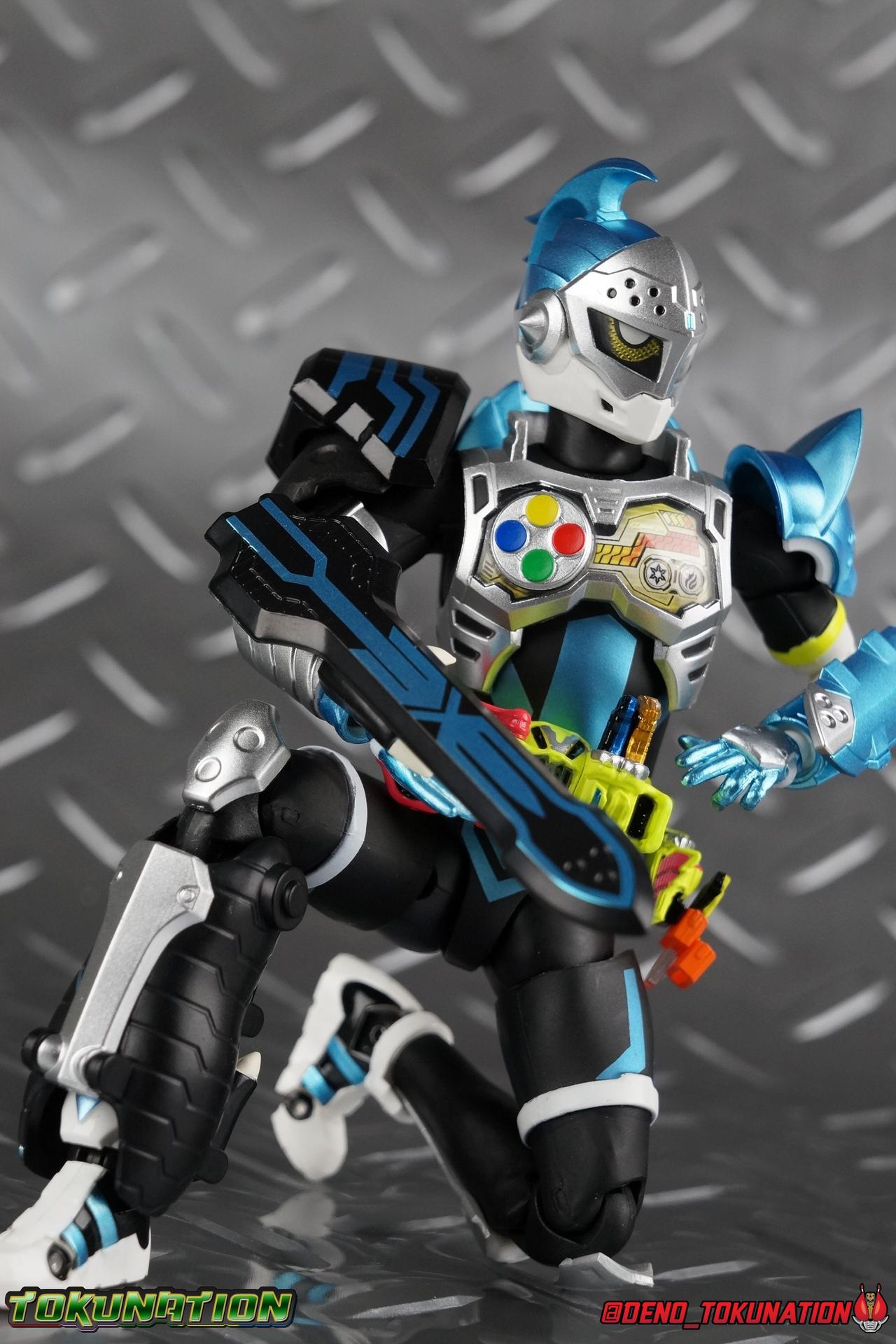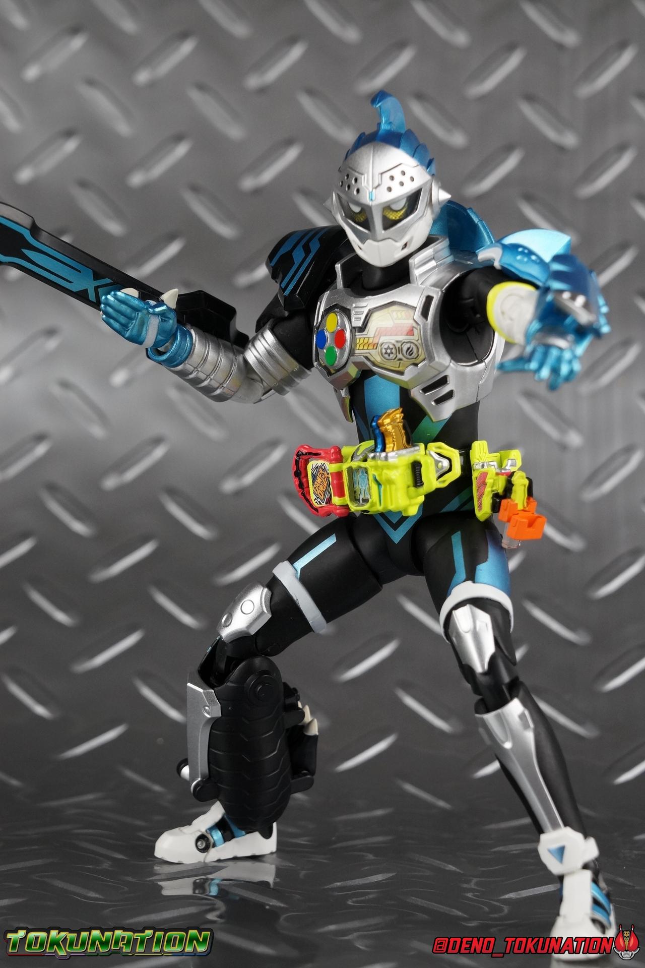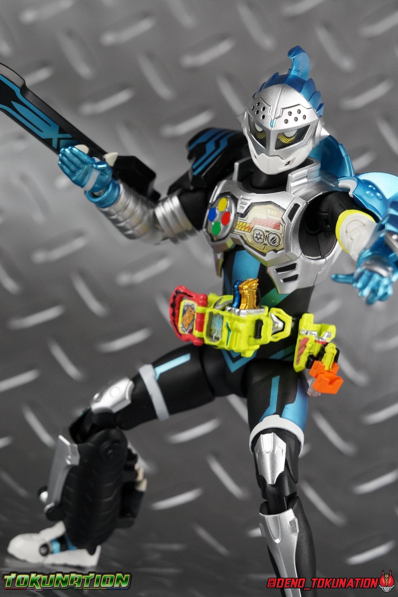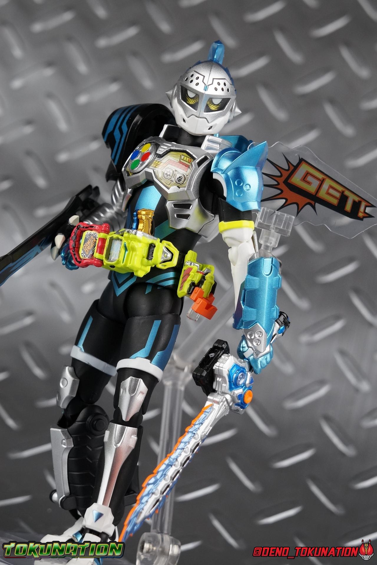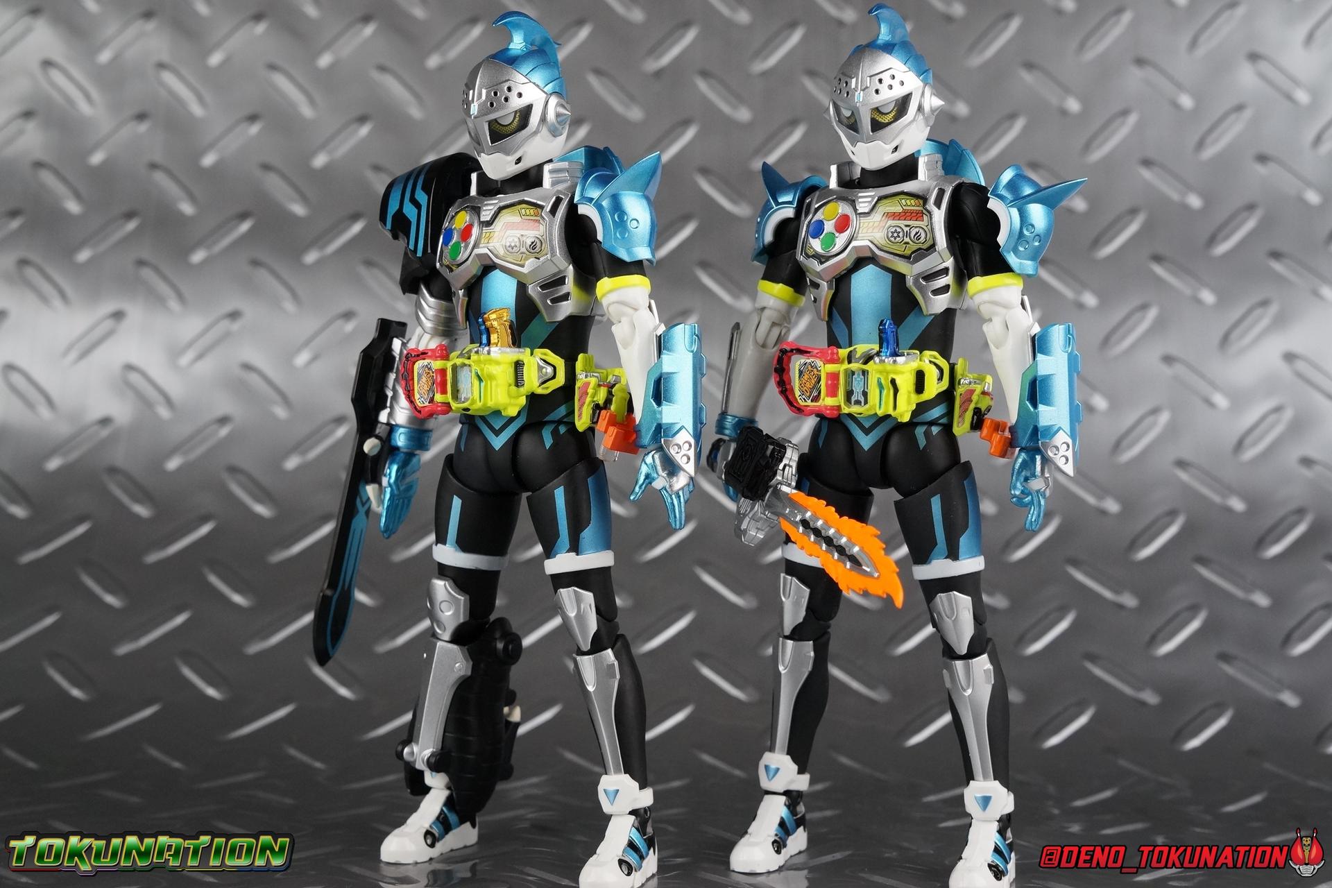 When 1 Player alone couldn't defeat the powered up Bugster, Graphite, it took 4-Player co-op to bring him down! Using the Level 5 Gashat Drago Knight Hunter Z Ex-Aid and his allies were each granted a portion of it's power and a piece of it's armor. In Hiro's case he inherited the power of the Dragon Blade, fitting his knight theme perfectly. In co-op form Brave only gained this piece of the Hunter Gamer powers but would eventually come to master this Gashat's power completely. Now it's time to take a look at how well his Figuart has inherited the Dragon's Blade with our review of S.H. Figuarts Kamen Rider Brave Hunter Quest Gamer Level 5! Packaging As with the first web exclusive in this line, Lazer Level 2, Brave features a bright and standout box. With no packaging window as all web exclusives are these days. As with Lazer the colors really pop and I like the character portrait on the front, despite it's rather misleading positioning of the figures arms. More on that later. Main Figure Seeing as this figure features components from two others we've seen previously, Brave Level 2 & Ex-Aid Level 5, you'll notice a lot of my review is very similar. Most of Brave Level 5's body is reused from the Level 2 release. While the right side of the body reuses components from the Level 5 Ex-Aid body. The Level 2 Ex-Aid riders themselves all share a great many number of parts as is. Each suit has it's own unique detailing and colors, but at a basic level they feature the same mold. Sporty type shoes, the bike shorts look, the driver, the chest plate. You see what I mean. This release of Brave is still as lavish as the first. From the Ground up the Ex-Aid type body is pretty solidly built. Though the ankles are still a huge fault for me. They don't have the full range of motion they need for Brave to assume many of the dynamic poses he's known for. You'll find that wide stances are just really really difficult to achieve, which means he's always gonna be a bit off balance. Sadly my Level 5 Brave also appears to have one leg longer than the other making it difficult to get him in a normal standing pose. The knees have a great bend that helps improve some of the articulation. And I would say that the bulkier right leg helps a bit with weight and stability. All that being said, the paint apps for the legs are exquisite. Luckily the white paint apps are so much better this go around. My Level 2 Brave had very spotty QC there. As with previous releases, Gamer Driver is still my favorite thing about the figure. This entire device is extraordinarily detailed for something at this scale. The Driver handle can flip shut. The functionality it features still astounds me. Changes to this release include a new "dummy" Drago Knight Hunter Z Gashat, which is removable as you can see in my pictures below. You can insert it as with any other Gashat into the Critical Finish slot on the Gashat Holster. Speaking of there's also what is meant to be the Level 3 DoReMiFa Beat Gashat in the holster. As with Ex-Aid Level 5's Gekitotsu Robots Gashat, DoReMiFa Beat is sparsely detailed and permanently fixed to the holster. Brave's upper body, left arm and head are unchanged. Brave is absolutely breathtaking but his chest detailing is something I still just cannot get over. The paint apps on the outer layer are crisp and clear, but I'm so impressed by the Rider Gauge label within his chest. On the flip side of the torso is the deactivated Level 1 head we've seen before. The left arm still has that pesky issue with the shoulder pad. Every time I try to stretch the arms out it's like rather than sliding out properly the pads just pop off again. Still a minor issue but one that bugs me. Looking up to the head, if you were irked by the lack of a white collar on the Level 2 releases then feel free to be irked again. It's an inconsequential detail to me. It's silver this go around too and that doesn't really bother me. Before we finish up with the main body, Brave's right arm has been replaced by the Level 5 Dragon Gun arm. Surprisingly, or maybe it shouldn't be, this arm isn't impaired at all like it was with Ex-Aid Level 5. With Ex-Aid the bulky shoulder pad was attached directly to the main body via the new chest plate on the torso. With Brave thankfully this pad is just attached to the arm and it really frees up the movement. Sadly the elbow is still neutered, being unable to achieve even a decent 90 degree angle. Exchanging hands on this arm is also a nightmare. The wrist pegs are rather tight on this release and difficult to replace thanks to the dragon claws on the wrist. Just as they were with Ex-Aid Physical shortcomings aside, this release still fills out my display quite well. But the real point of it is the accessories it includes. Accessories 4 - sets of hands. These are identical to those that came with Level 2 Brave. Straight re-packs with no additions or subtractions at all. 7 - "word bubble" effect parts. These clear thin plastic sheets were the big selling point for both Brave & Snipe Level 5. Each replicates an effect a battle action or outcome from the show. Included are: