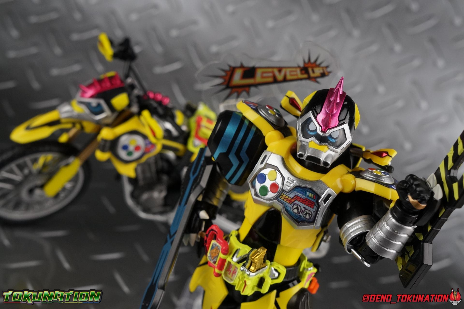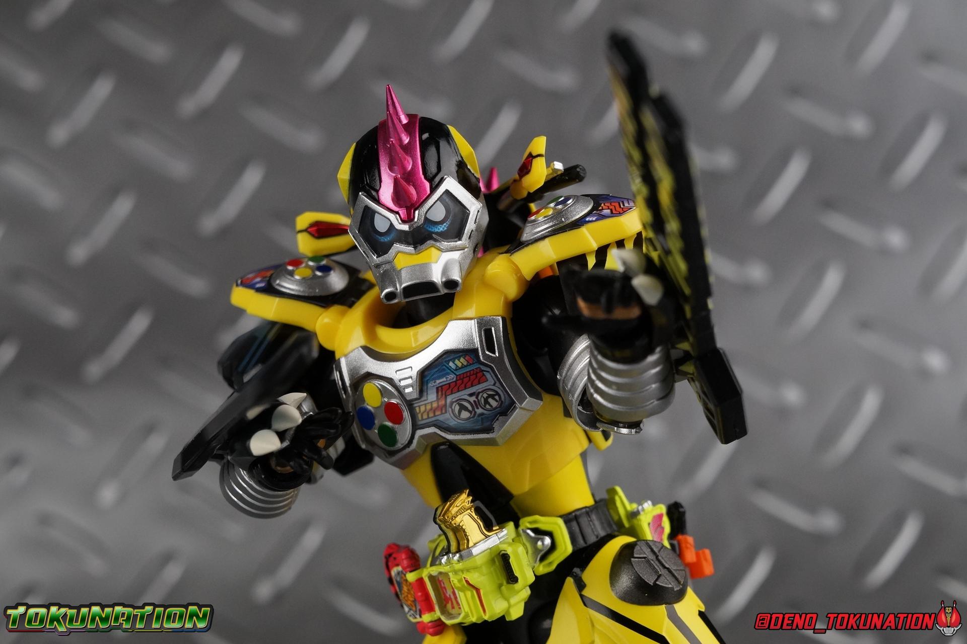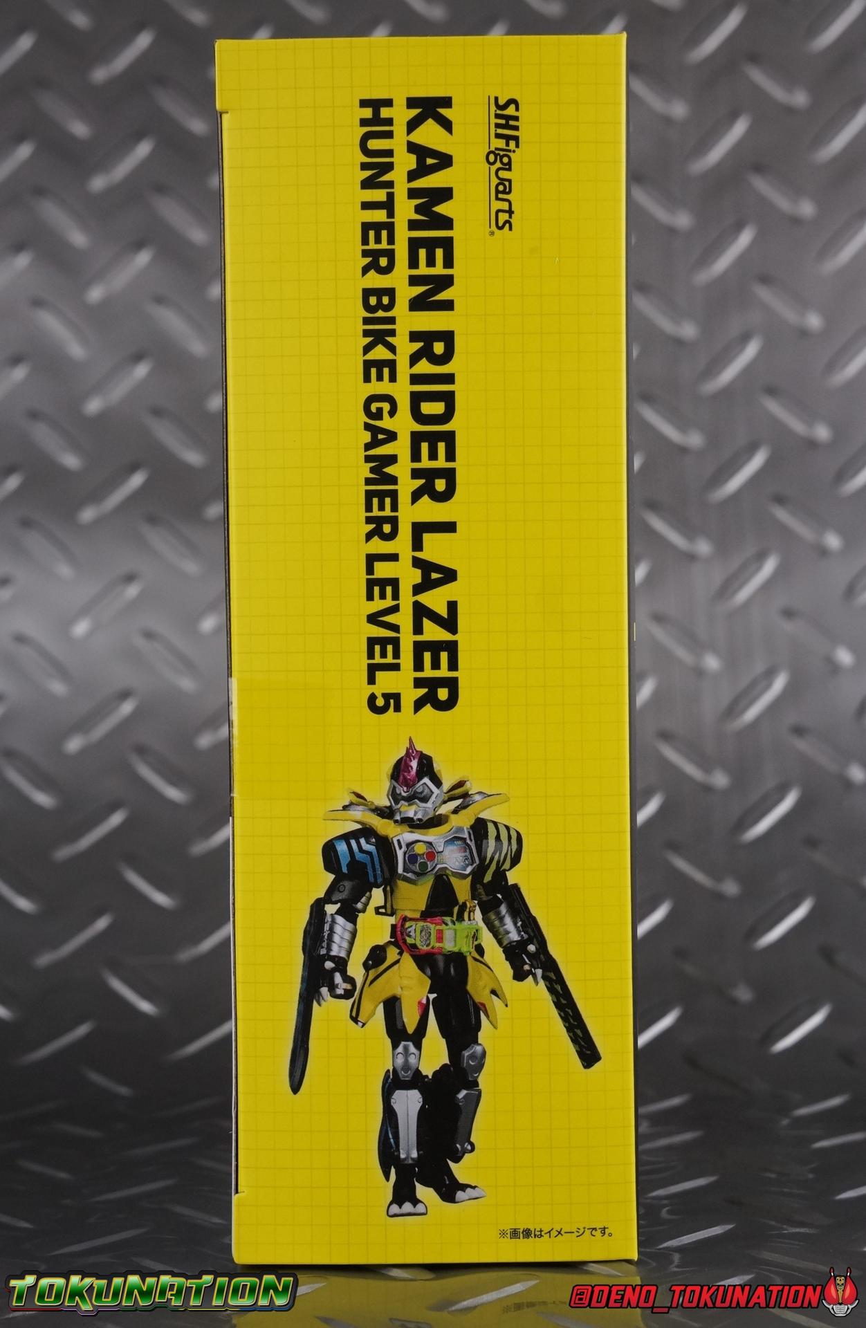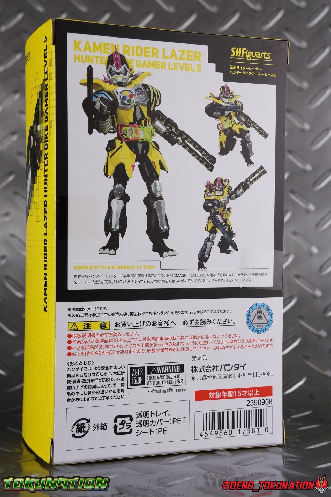 The last time we got to handle Kujou Kiriya it was in his excellent and unorthodox Rider Machine based Bike Gamer Level 2 form. Fans of Kamen Rider Ex-Aid will undoubtedly know that Kamen Rider Lazer finally received a humanoid rider suit when he attained the Giri Giri Chambara derived Level 3 form. And while that's definitely the figure many fans were hoping for, for now at least we've been treated to one step beyond that with this new release, S.H. Figuarts Kamen Rider Lazer Hunter Bike Gamer Level 5! This release gives us almost the full 4-player co-op team that defeated the Bugster Graphite. We still don't have a proper Fang Ex-Aid, but for the time being this looks to be the best we'll get. Let's jump in! Packaging Themed very similarly to Lazer Level 2's box, Level 5 has some bright, loud, packaging and I still really dig it. With no packaging window as all web exclusives are these days. As with the others the colors really pop and I like the character portrait on the front. That's about all there is to say on this one Main Figure A companion piece to Brave Level 5 & Snipe Level 5, Lazer Level 5 brings something old and a little something new to the table. This figure is predominantly new parts; the torso, upper legs, feet, head, all new. The arms and shins are reused from previous Level 5 releases of Ex-Aid, Snipe & Brave. Where Snipe & Brave each had one arm and leg from the Drago Knight Hunter Z armor, Lazer gets the matching set. Honestly this release is the first one in the line outside of Lazer Level 2 to really bring something truly new to the table though with the torso parts. For the leg components, Lazer Level 5 has his new clawed feet, which while a bit on the narrow side are actually pretty nice and stable. Despite the "Drago" in the name of this forms Gashat, these feet are carried over from the Level 3 form. Again the shin armor parts are reuses from the others, but the upper legs are all brand new. These thicker chunky thighs help sell this bulky form a bit bitter, and to their merit they work well. The issue comes up when you have to deal with the hip skirt armor. The armor is on a pair of ball joints when it should have been on side hinges, and they should have been hinged in the middle to allow greater movement in the legs. As you can see in my photos below, the skirt armor really knocks out a usable chunk of the leg motion that would allow this figure to be way more dynamic otherwise. While in this area, the Gamer Driver is still great even if the paint apps on mine are a bit shoddy this go around. The Driver handle can still flip shut. The functionality it features is still surprising. As with Brave & Snipe, Lazer has a "dummy" Drago Knight Hunter Z Gashat in addition to his own Bakusou Bike, both of which are removable. You can insert it as with any other Gashat into the Critical Finish slot on the Gashat Holster or a compatible Gashacon weapon. Speaking of the holster there's also what is meant to be the Level 3 Gir Giri Chanbara Gashat in the holster. As with with the others it's sparsely detailed and non-removable. The torso is by far where the most new work went into this figure. Where we had a lot of body part reuse with all the previous Ex-Aid releases, this torso is all new. Surprisingly, this torso is the best one in the line. The lower and upper halves of the body both have a really nice fluid range of motion and they don't really impact anything that hinders their movement. The backside of the torso has a new shrunken down version of the Level 1 form head as well as the Level 2 engine block. Excellent detailing as always even with paint that's a bit spotty this time. The actual head on the body is brand new though, but it's one we know we'll see again too. Both in show and toy form the Level 5 Lazer head is reused for his Level 0 Lazer Turbo form. The head feels about the right size with the bulk of this Level 5 body, and it should be just the right amount of over-sized for the Level 0 body. I'm really pleased with how that sculpt turned out. One negative to the upper body though, even though we have both of the improved Drago Knight arms from Snipe & Brave on this release, and even some nice hinged shoulder pads on top of them, the vestigial handlebars of the Level 2 form really get in the way. In fact I was worried I'd broken one when I moved the shoulder pad and it made a nasty click against the handlebar. Just be careful. Limitations aside I'm quite happy to have this form. I know plenty of people dislike it compared to Level 3, but I honestly don't like 3 or even 5 all that much. Lazer Turbo is where it's at for me. But it's only a matter of time before Lazer Level 3, the one everyone wants, happens. Now that we have the torso and most of the legs for it with Level 5, it would really be a no brainer to give us this one. Accessories Unfortunately, Lazer Level 5 only includes a few sets of hands. 4 sets of hands to be exact. Open excited hands, calm open palms, posed half pointing hands, and oddly, a set for holding weapons. They're perfect for handlebars or weapons like the Gashacon Sparrow that comes with GenM Level X. But Lazer Level 5 doesn't come anything they're useful for. And it's nearly impossible to get this figure up on Lazer Level 2 to ride it. I'm really baffled as to why this release didn't include the same plastic word bubbles that Snipe & Brave did. Those inclusions really helped sell those figures to me personally. Though I think it's fair to say that the nature of this figure being the only announced humanoid Lazer at the time, helped sell it in pre-orders. But it should have come with more. Anytime a figuart only includes extra hands, it's difficult to contain my disappointment. Final Thoughts All in all this is a pretty solid release taking some of what we've already seen and tossing something new into the mix to keep us interested.The neutered leg articulation is a real bummer, but Kiriya's personality still shines through with