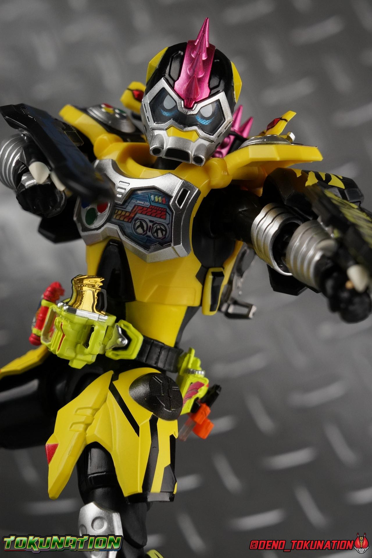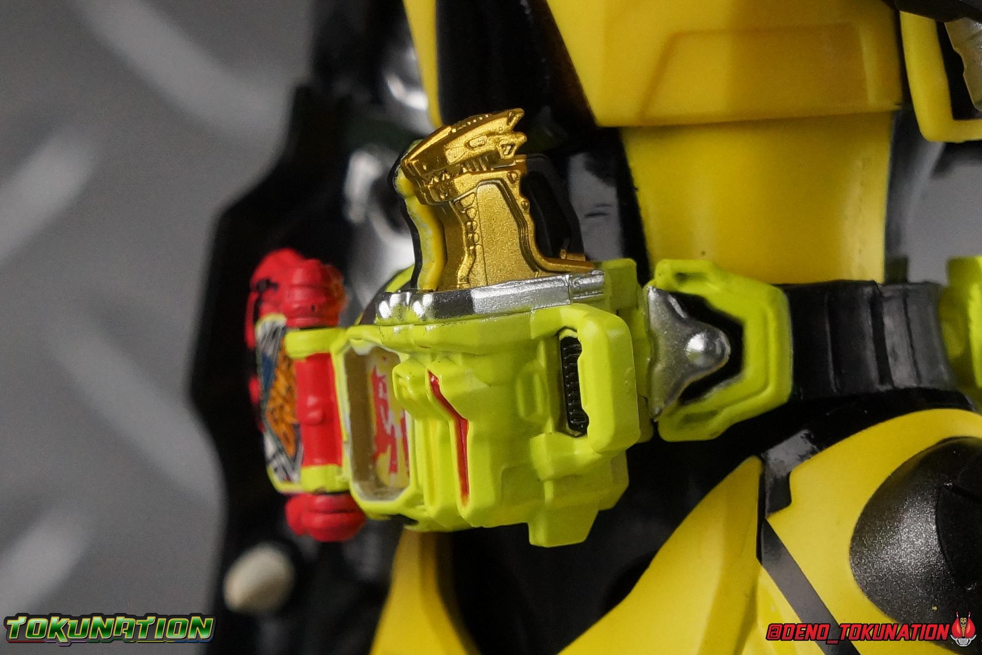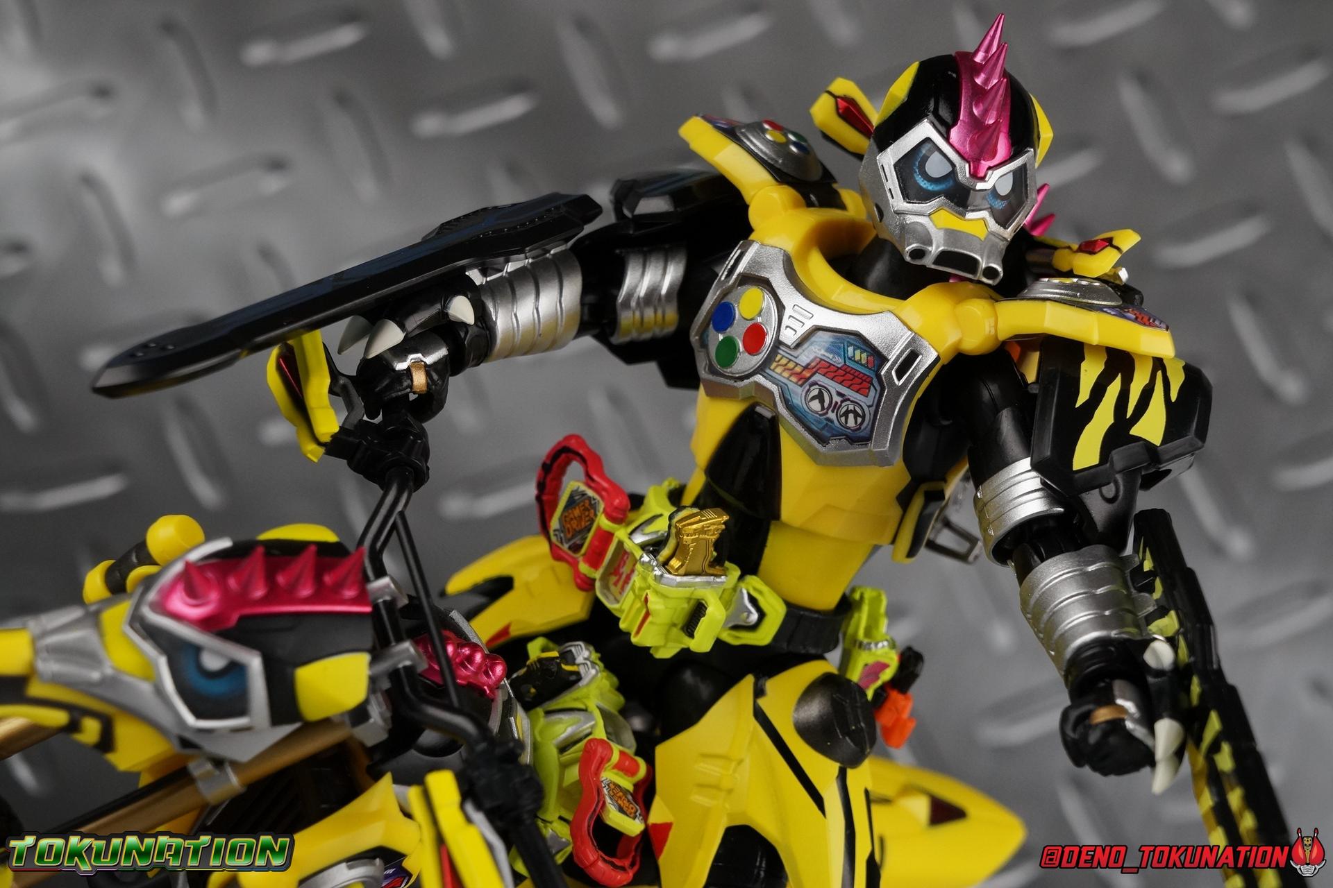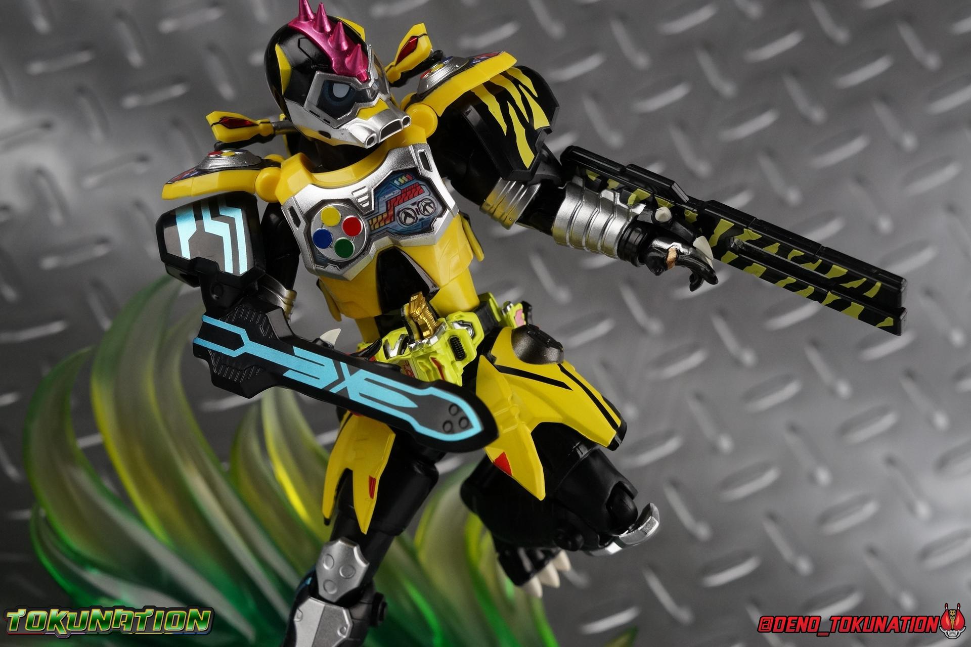 The last time we got to handle Kujou Kiriya it was in his excellent and unorthodox Rider Machine based Bike Gamer Level 2 form. Fans of Kamen Rider Ex-Aid will undoubtedly know that Kamen Rider Lazer finally received a humanoid rider suit when he attained the Giri Giri Chambara derived Level 3 form. And while that's definitely the figure many fans were hoping for, for now at least we've been treated to one step beyond that with this new release, S.H. Figuarts Kamen Rider Lazer Hunter Bike Gamer Level 5! This release gives us almost the full 4-player co-op team that defeated the Bugster Graphite. We still don't have a proper Fang Ex-Aid, but for the time being this looks to be the best we'll get. Let's jump in! Packaging Themed very similarly to Lazer Level 2's box, Level 5 has some bright, loud, packaging and I still really dig it. With no packaging window as all web exclusives are these days. As with the others the colors really pop and I like the character portrait on the front. That's about all there is to say on this one Main Figure A companion piece to Brave Level 5 & Snipe Level 5, Lazer Level 5 brings something old and a little something new to the table. This figure is predominantly new parts; the torso, upper legs, feet, head, all new. The arms and shins are reused from previous Level 5 releases of Ex-Aid, Snipe & Brave. Where Snipe & Brave each had one arm and leg from the Drago Knight Hunter Z armor, Lazer gets the matching set. Honestly this release is the first one in the line outside of Lazer Level 2 to really bring something truly new to the table though with the torso parts. For the leg components, Lazer Level 5 has his new clawed feet, which while a bit on the narrow side are actually pretty nice and stable. Despite the "Drago" in the name of this forms Gashat, these feet are carried over from the Level 3 form. Again the shin armor parts are reuses from the others, but the upper legs are all brand new. These thicker chunky thighs help sell this bulky form a bit bitter, and to their merit they work well. The issue comes up when you have to deal with the hip skirt armor. The armor is on a pair of ball joints when it should have been on side hinges, and they should have been hinged in the middle to allow greater movement in the legs. As you can see in my photos below, the skirt armor really knocks out a usable chunk of the leg motion that would allow this figure to be way more dynamic otherwise. While in this area, the Gamer Driver is still great even if the paint apps on mine are a bit shoddy this go around. The Driver handle can still flip shut. The functionality it features is still surprising. As with Brave & Snipe, Lazer has a "dummy" Drago Knight Hunter Z Gashat in addition to his own Bakusou Bike, both of which are removable. You can insert it as with any other Gashat into the Critical Finish slot on the Gashat Holster or a compatible Gashacon weapon. Speaking of the holster there's also what is meant to be the Level 3 Gir Giri Chanbara Gashat in the holster. As with with the others it's sparsely detailed and non-removable. The torso is by far where the most new work went into this figure. Where we had a lot of body part reuse with all the previous Ex-Aid releases, this torso is all new. Surprisingly, this torso is the best one in the line. The lower and upper halves of the body both have a really nice fluid range of motion and they don't really impact anything that hinders their movement. The backside of the torso has a new shrunken down version of the Level 1 form head as well as the Level 2 engine block. Excellent detailing as always even with paint that's a bit spotty this time. The actual head on the body is brand new though, but it's one we know we'll see again too. Both in show and toy form the Level 5 Lazer head is reused for his Level 0 Lazer Turbo form. The head feels about the right size with the bulk of this Level 5 body, and it should be just the right amount of over-sized for the Level 0 body. I'm really pleased with how that sculpt turned out. One negative to the upper body though, even though we have both of the improved Drago Knight arms from Snipe & Brave on this release, and even some nice hinged shoulder pads on top of them, the vestigial handlebars of the Level 2 form really get in the way. In fact I was worried I'd broken one when I moved the shoulder pad and it made a nasty click against the handlebar. Just be careful. Limitations aside I'm quite happy to have this form. I know plenty of people dislike it compared to Level 3, but I honestly don't like 3 or even 5 all that much. Lazer Turbo is where it's at for me. But it's only a matter of time before Lazer Level 3, the one everyone wants, happens. Now that we have the torso and most of the legs for it with Level 5, it would really be a no brainer to give us this one. Accessories Unfortunately, Lazer Level 5 only includes a few sets of hands. 4 sets of hands to be exact. Open excited hands, calm open palms, posed half pointing hands, and oddly, a set for holding weapons. They're perfect for handlebars or weapons like the Gashacon Sparrow that comes with GenM Level X. But Lazer Level 5 doesn't come anything they're useful for. And it's nearly impossible to get this figure up on Lazer Level 2 to ride it. I'm really baffled as to why this release didn't include the same plastic word bubbles that Snipe & Brave did. Those inclusions really helped sell those figures to me personally. Though I think it's fair to say that the nature of this figure being the only announced humanoid Lazer at the time, helped sell it in pre-orders. But it should have come with more. Anytime a figuart only includes extra hands, it's difficult to contain my disappointment. Final Thoughts All in all this is a pretty solid release taking some of what we've already seen and tossing something new into the mix to keep us interested.The neutered leg articulation is a real bummer, but Kiriya's personality still shines through with