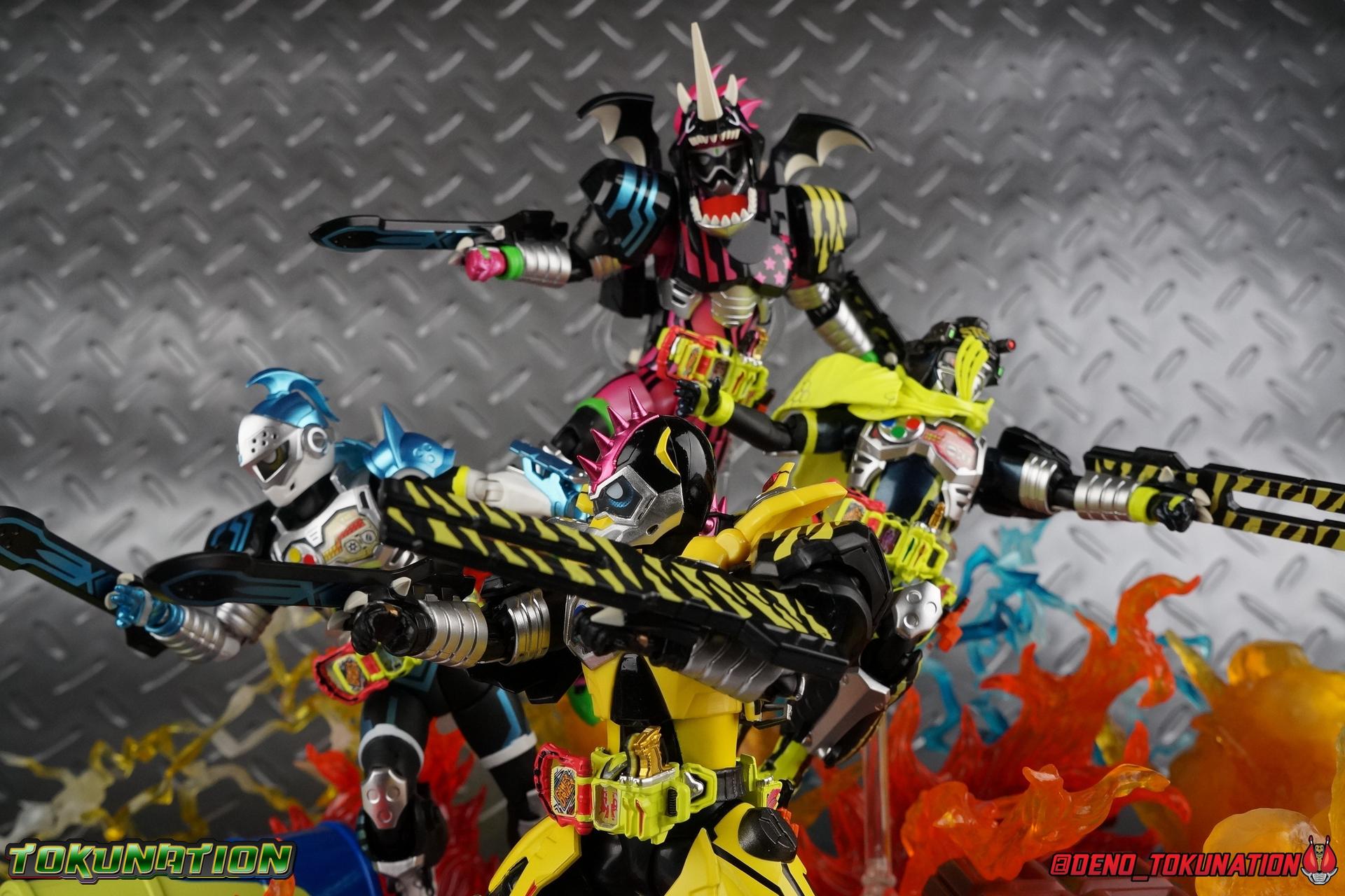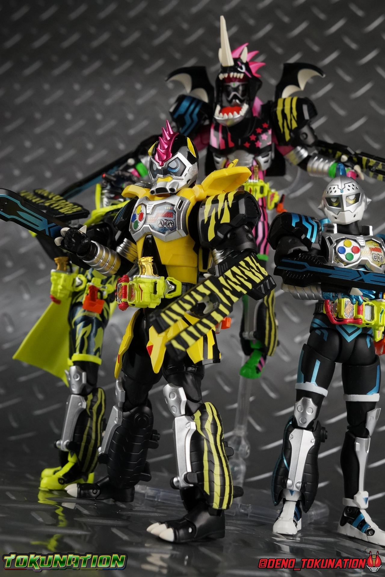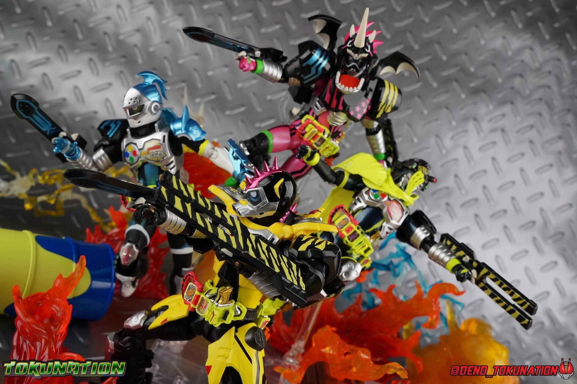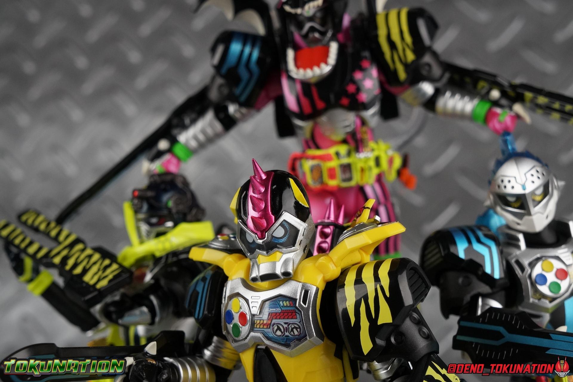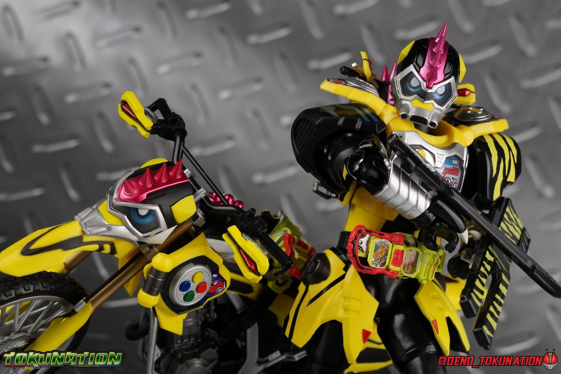 The last time we got to handle Kujou Kiriya it was in his excellent and unorthodox Rider Machine based Bike Gamer Level 2 form. Fans of Kamen Rider Ex-Aid will undoubtedly know that Kamen Rider Lazer finally received a humanoid rider suit when he attained the Giri Giri Chambara derived Level 3 form. And while that's definitely the figure many fans were hoping for, for now at least we've been treated to one step beyond that with this new release, S.H. Figuarts Kamen Rider Lazer Hunter Bike Gamer Level 5! This release gives us almost the full 4-player co-op team that defeated the Bugster Graphite. We still don't have a proper Fang Ex-Aid, but for the time being this looks to be the best we'll get. Let's jump in! Packaging Themed very similarly to Lazer Level 2's box, Level 5 has some bright, loud, packaging and I still really dig it. With no packaging window as all web exclusives are these days. As with the others the colors really pop and I like the character portrait on the front. That's about all there is to say on this one Main Figure A companion piece to Brave Level 5 & Snipe Level 5, Lazer Level 5 brings something old and a little something new to the table. This figure is predominantly new parts; the torso, upper legs, feet, head, all new. The arms and shins are reused from previous Level 5 releases of Ex-Aid, Snipe & Brave. Where Snipe & Brave each had one arm and leg from the Drago Knight Hunter Z armor, Lazer gets the matching set. Honestly this release is the first one in the line outside of Lazer Level 2 to really bring something truly new to the table though with the torso parts. For the leg components, Lazer Level 5 has his new clawed feet, which while a bit on the narrow side are actually pretty nice and stable. Despite the "Drago" in the name of this forms Gashat, these feet are carried over from the Level 3 form. Again the shin armor parts are reuses from the others, but the upper legs are all brand new. These thicker chunky thighs help sell this bulky form a bit bitter, and to their merit they work well. The issue comes up when you have to deal with the hip skirt armor. The armor is on a pair of ball joints when it should have been on side hinges, and they should have been hinged in the middle to allow greater movement in the legs. As you can see in my photos below, the skirt armor really knocks out a usable chunk of the leg motion that would allow this figure to be way more dynamic otherwise. While in this area, the Gamer Driver is still great even if the paint apps on mine are a bit shoddy this go around. The Driver handle can still flip shut. The functionality it features is still surprising. As with Brave & Snipe, Lazer has a "dummy" Drago Knight Hunter Z Gashat in addition to his own Bakusou Bike, both of which are removable. You can insert it as with any other Gashat into the Critical Finish slot on the Gashat Holster or a compatible Gashacon weapon. Speaking of the holster there's also what is meant to be the Level 3 Gir Giri Chanbara Gashat in the holster. As with with the others it's sparsely detailed and non-removable. The torso is by far where the most new work went into this figure. Where we had a lot of body part reuse with all the previous Ex-Aid releases, this torso is all new. Surprisingly, this torso is the best one in the line. The lower and upper halves of the body both have a really nice fluid range of motion and they don't really impact anything that hinders their movement. The backside of the torso has a new shrunken down version of the Level 1 form head as well as the Level 2 engine block. Excellent detailing as always even with paint that's a bit spotty this time. The actual head on the body is brand new though, but it's one we know we'll see again too. Both in show and toy form the Level 5 Lazer head is reused for his Level 0 Lazer Turbo form. The head feels about the right size with the bulk of this Level 5 body, and it should be just the right amount of over-sized for the Level 0 body. I'm really pleased with how that sculpt turned out. One negative to the upper body though, even though we have both of the improved Drago Knight arms from Snipe & Brave on this release, and even some nice hinged shoulder pads on top of them, the vestigial handlebars of the Level 2 form really get in the way. In fact I was worried I'd broken one when I moved the shoulder pad and it made a nasty click against the handlebar. Just be careful. Limitations aside I'm quite happy to have this form. I know plenty of people dislike it compared to Level 3, but I honestly don't like 3 or even 5 all that much. Lazer Turbo is where it's at for me. But it's only a matter of time before Lazer Level 3, the one everyone wants, happens. Now that we have the torso and most of the legs for it with Level 5, it would really be a no brainer to give us this one. Accessories Unfortunately, Lazer Level 5 only includes a few sets of hands. 4 sets of hands to be exact. Open excited hands, calm open palms, posed half pointing hands, and oddly, a set for holding weapons. They're perfect for handlebars or weapons like the Gashacon Sparrow that comes with GenM Level X. But Lazer Level 5 doesn't come anything they're useful for. And it's nearly impossible to get this figure up on Lazer Level 2 to ride it. I'm really baffled as to why this release didn't include the same plastic word bubbles that Snipe & Brave did. Those inclusions really helped sell those figures to me personally. Though I think it's fair to say that the nature of this figure being the only announced humanoid Lazer at the time, helped sell it in pre-orders. But it should have come with more. Anytime a figuart only includes extra hands, it's difficult to contain my disappointment. Final Thoughts All in all this is a pretty solid release taking some of what we've already seen and tossing something new into the mix to keep us interested.The neutered leg articulation is a real bummer, but Kiriya's personality still shines through with