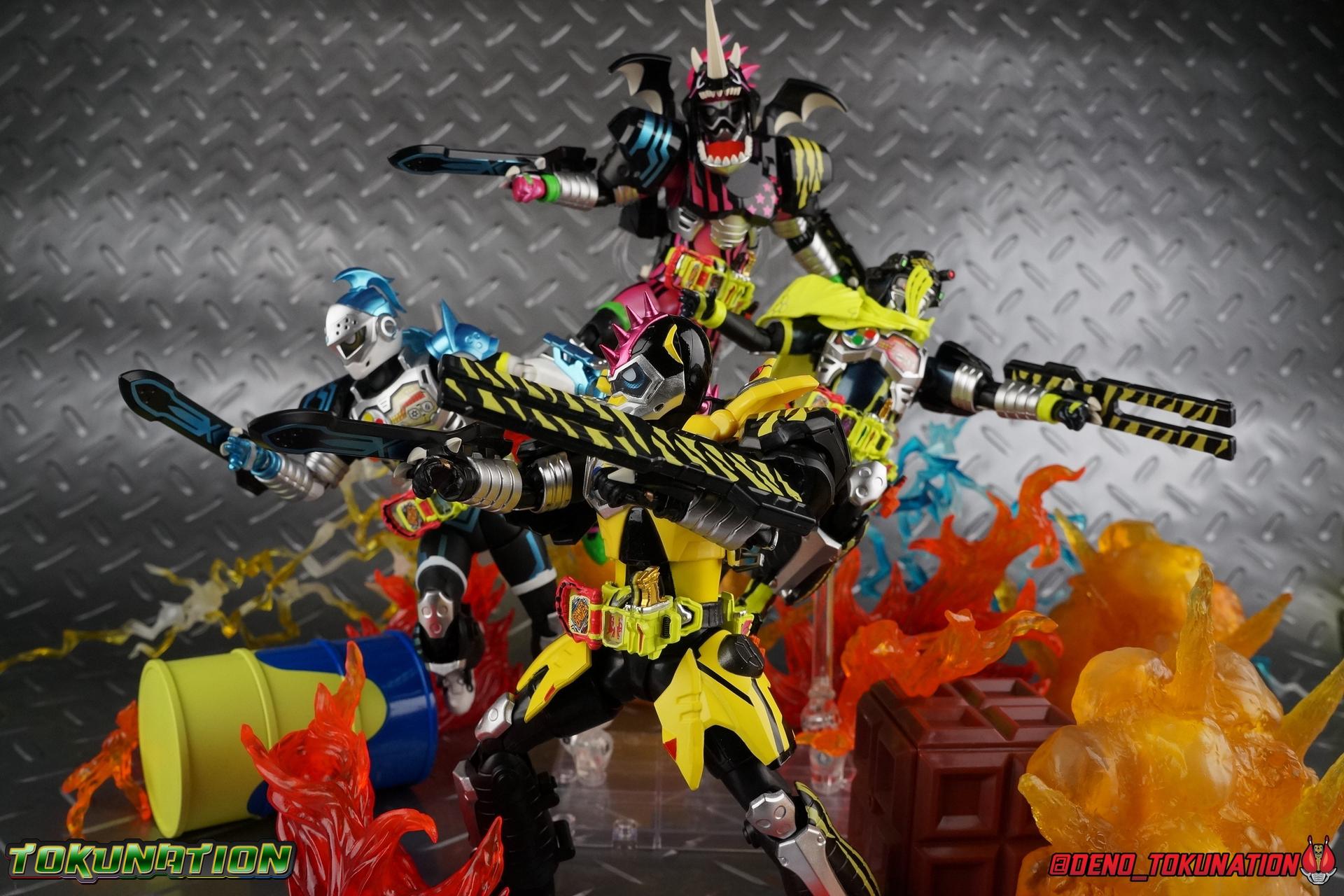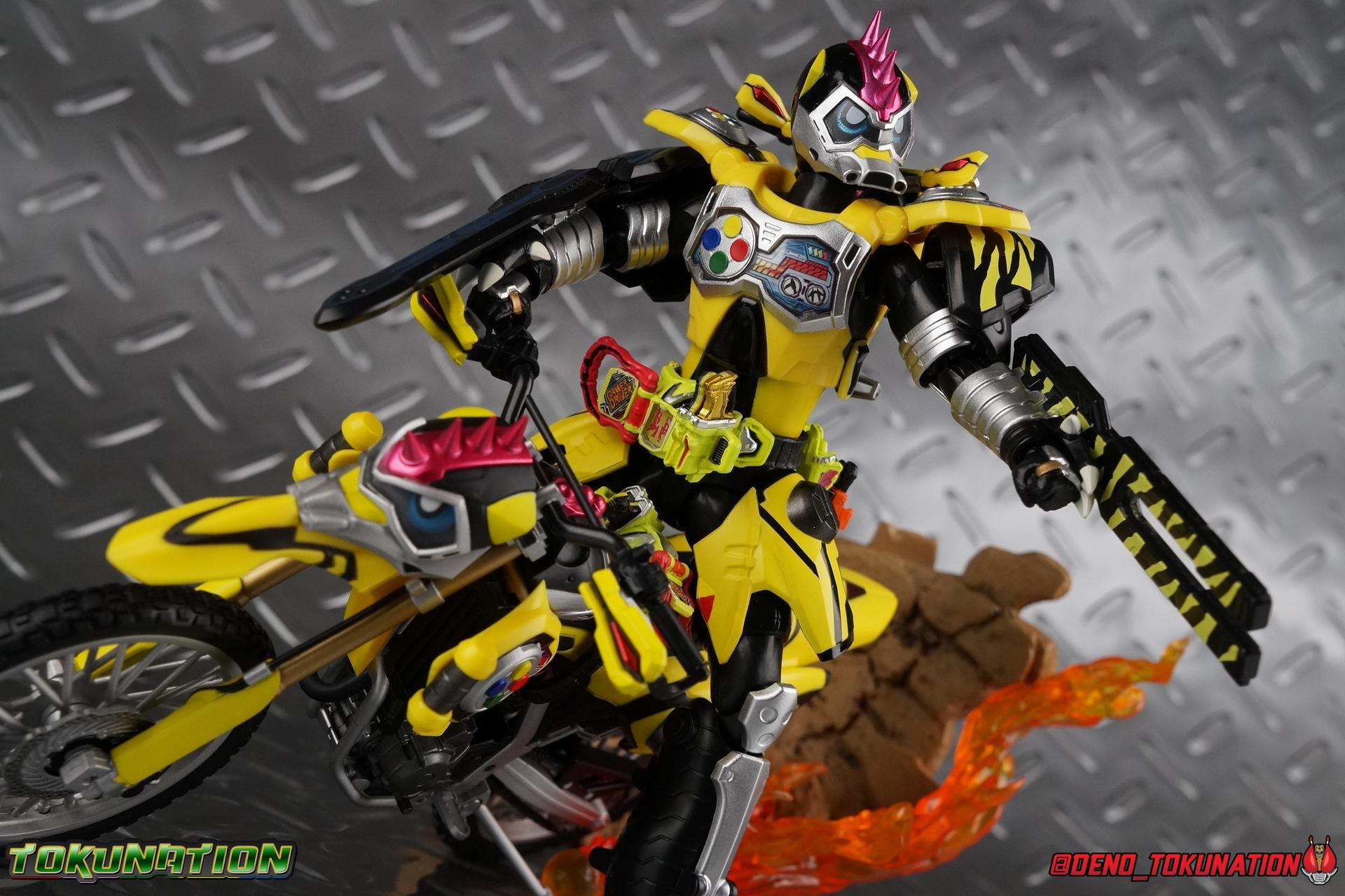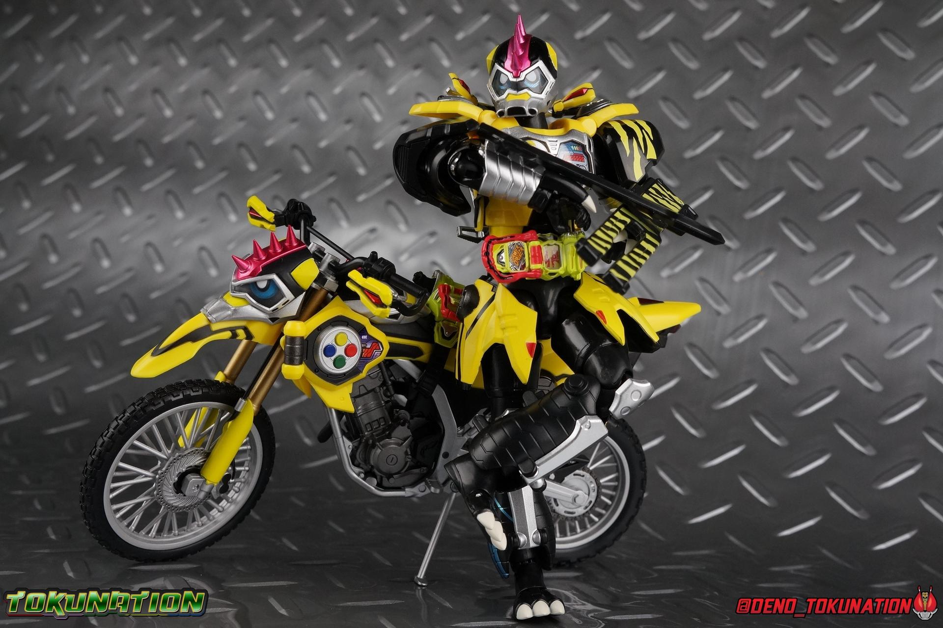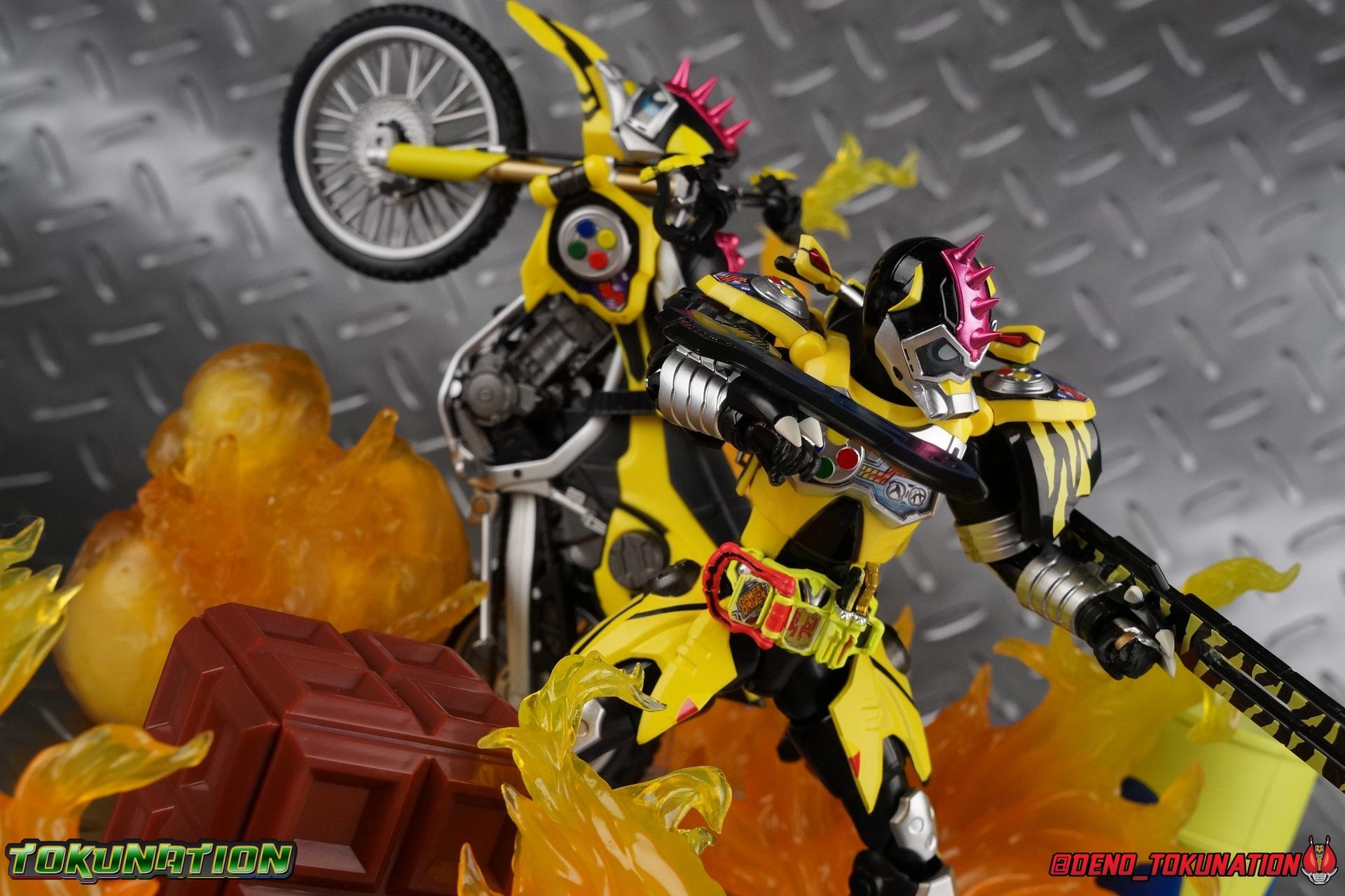 The last time we got to handle Kujou Kiriya it was in his excellent and unorthodox Rider Machine based Bike Gamer Level 2 form. Fans of Kamen Rider Ex-Aid will undoubtedly know that Kamen Rider Lazer finally received a humanoid rider suit when he attained the Giri Giri Chambara derived Level 3 form. And while that's definitely the figure many fans were hoping for, for now at least we've been treated to one step beyond that with this new release, S.H. Figuarts Kamen Rider Lazer Hunter Bike Gamer Level 5! This release gives us almost the full 4-player co-op team that defeated the Bugster Graphite. We still don't have a proper Fang Ex-Aid, but for the time being this looks to be the best we'll get. Let's jump in! Packaging Themed very similarly to Lazer Level 2's box, Level 5 has some bright, loud, packaging and I still really dig it. With no packaging window as all web exclusives are these days. As with the others the colors really pop and I like the character portrait on the front. That's about all there is to say on this one Main Figure A companion piece to Brave Level 5 & Snipe Level 5, Lazer Level 5 brings something old and a little something new to the table. This figure is predominantly new parts; the torso, upper legs, feet, head, all new. The arms and shins are reused from previous Level 5 releases of Ex-Aid, Snipe & Brave. Where Snipe & Brave each had one arm and leg from the Drago Knight Hunter Z armor, Lazer gets the matching set. Honestly this release is the first one in the line outside of Lazer Level 2 to really bring something truly new to the table though with the torso parts. For the leg components, Lazer Level 5 has his new clawed feet, which while a bit on the narrow side are actually pretty nice and stable. Despite the "Drago" in the name of this forms Gashat, these feet are carried over from the Level 3 form. Again the shin armor parts are reuses from the others, but the upper legs are all brand new. These thicker chunky thighs help sell this bulky form a bit bitter, and to their merit they work well. The issue comes up when you have to deal with the hip skirt armor. The armor is on a pair of ball joints when it should have been on side hinges, and they should have been hinged in the middle to allow greater movement in the legs. As you can see in my photos below, the skirt armor really knocks out a usable chunk of the leg motion that would allow this figure to be way more dynamic otherwise. While in this area, the Gamer Driver is still great even if the paint apps on mine are a bit shoddy this go around. The Driver handle can still flip shut. The functionality it features is still surprising. As with Brave & Snipe, Lazer has a "dummy" Drago Knight Hunter Z Gashat in addition to his own Bakusou Bike, both of which are removable. You can insert it as with any other Gashat into the Critical Finish slot on the Gashat Holster or a compatible Gashacon weapon. Speaking of the holster there's also what is meant to be the Level 3 Gir Giri Chanbara Gashat in the holster. As with with the others it's sparsely detailed and non-removable. The torso is by far where the most new work went into this figure. Where we had a lot of body part reuse with all the previous Ex-Aid releases, this torso is all new. Surprisingly, this torso is the best one in the line. The lower and upper halves of the body both have a really nice fluid range of motion and they don't really impact anything that hinders their movement. The backside of the torso has a new shrunken down version of the Level 1 form head as well as the Level 2 engine block. Excellent detailing as always even with paint that's a bit spotty this time. The actual head on the body is brand new though, but it's one we know we'll see again too. Both in show and toy form the Level 5 Lazer head is reused for his Level 0 Lazer Turbo form. The head feels about the right size with the bulk of this Level 5 body, and it should be just the right amount of over-sized for the Level 0 body. I'm really pleased with how that sculpt turned out. One negative to the upper body though, even though we have both of the improved Drago Knight arms from Snipe & Brave on this release, and even some nice hinged shoulder pads on top of them, the vestigial handlebars of the Level 2 form really get in the way. In fact I was worried I'd broken one when I moved the shoulder pad and it made a nasty click against the handlebar. Just be careful. Limitations aside I'm quite happy to have this form. I know plenty of people dislike it compared to Level 3, but I honestly don't like 3 or even 5 all that much. Lazer Turbo is where it's at for me. But it's only a matter of time before Lazer Level 3, the one everyone wants, happens. Now that we have the torso and most of the legs for it with Level 5, it would really be a no brainer to give us this one. Accessories Unfortunately, Lazer Level 5 only includes a few sets of hands. 4 sets of hands to be exact. Open excited hands, calm open palms, posed half pointing hands, and oddly, a set for holding weapons. They're perfect for handlebars or weapons like the Gashacon Sparrow that comes with GenM Level X. But Lazer Level 5 doesn't come anything they're useful for. And it's nearly impossible to get this figure up on Lazer Level 2 to ride it. I'm really baffled as to why this release didn't include the same plastic word bubbles that Snipe & Brave did. Those inclusions really helped sell those figures to me personally. Though I think it's fair to say that the nature of this figure being the only announced humanoid Lazer at the time, helped sell it in pre-orders. But it should have come with more. Anytime a figuart only includes extra hands, it's difficult to contain my disappointment. Final Thoughts All in all this is a pretty solid release taking some of what we've already seen and tossing something new into the mix to keep us interested.The neutered leg articulation is a real bummer, but Kiriya's personality still shines through with