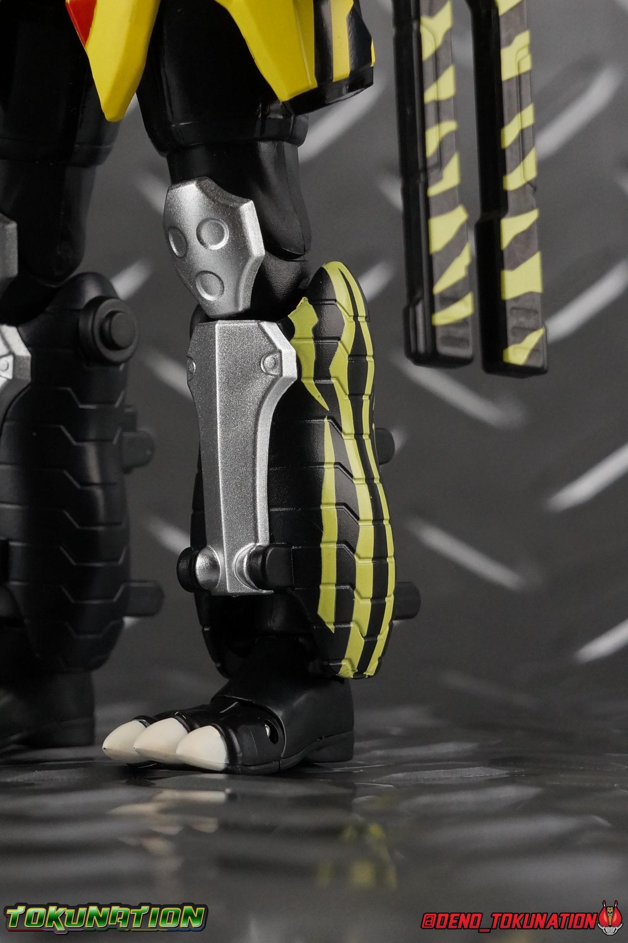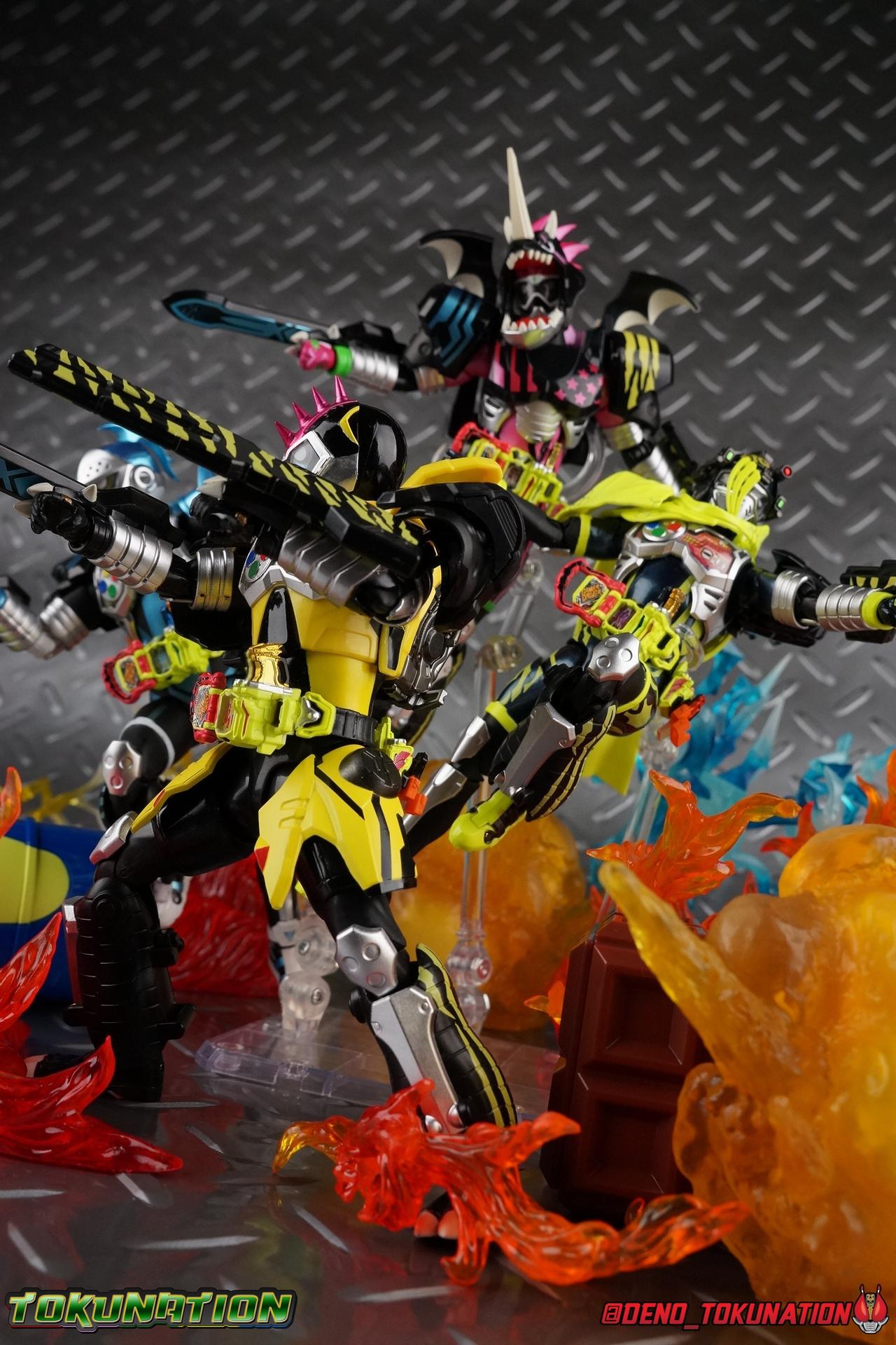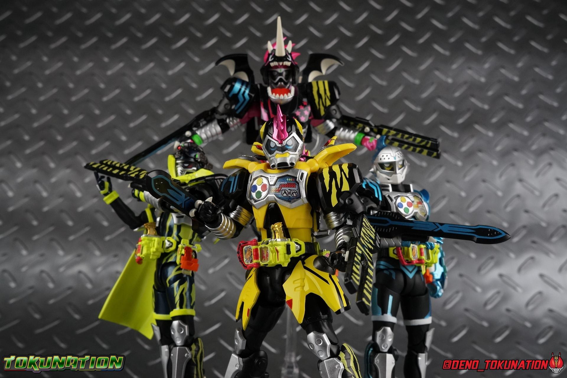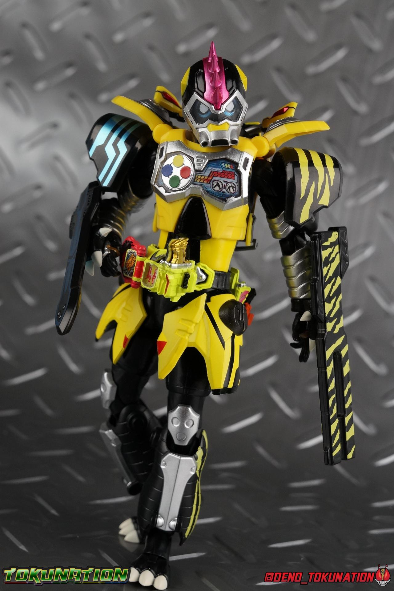 The last time we got to handle Kujou Kiriya it was in his excellent and unorthodox Rider Machine based Bike Gamer Level 2 form. Fans of Kamen Rider Ex-Aid will undoubtedly know that Kamen Rider Lazer finally received a humanoid rider suit when he attained the Giri Giri Chambara derived Level 3 form. And while that's definitely the figure many fans were hoping for, for now at least we've been treated to one step beyond that with this new release, S.H. Figuarts Kamen Rider Lazer Hunter Bike Gamer Level 5! This release gives us almost the full 4-player co-op team that defeated the Bugster Graphite. We still don't have a proper Fang Ex-Aid, but for the time being this looks to be the best we'll get. Let's jump in! Packaging Themed very similarly to Lazer Level 2's box, Level 5 has some bright, loud, packaging and I still really dig it. With no packaging window as all web exclusives are these days. As with the others the colors really pop and I like the character portrait on the front. That's about all there is to say on this one Main Figure A companion piece to Brave Level 5 & Snipe Level 5, Lazer Level 5 brings something old and a little something new to the table. This figure is predominantly new parts; the torso, upper legs, feet, head, all new. The arms and shins are reused from previous Level 5 releases of Ex-Aid, Snipe & Brave. Where Snipe & Brave each had one arm and leg from the Drago Knight Hunter Z armor, Lazer gets the matching set. Honestly this release is the first one in the line outside of Lazer Level 2 to really bring something truly new to the table though with the torso parts. For the leg components, Lazer Level 5 has his new clawed feet, which while a bit on the narrow side are actually pretty nice and stable. Despite the "Drago" in the name of this forms Gashat, these feet are carried over from the Level 3 form. Again the shin armor parts are reuses from the others, but the upper legs are all brand new. These thicker chunky thighs help sell this bulky form a bit bitter, and to their merit they work well. The issue comes up when you have to deal with the hip skirt armor. The armor is on a pair of ball joints when it should have been on side hinges, and they should have been hinged in the middle to allow greater movement in the legs. As you can see in my photos below, the skirt armor really knocks out a usable chunk of the leg motion that would allow this figure to be way more dynamic otherwise. While in this area, the Gamer Driver is still great even if the paint apps on mine are a bit shoddy this go around. The Driver handle can still flip shut. The functionality it features is still surprising. As with Brave & Snipe, Lazer has a "dummy" Drago Knight Hunter Z Gashat in addition to his own Bakusou Bike, both of which are removable. You can insert it as with any other Gashat into the Critical Finish slot on the Gashat Holster or a compatible Gashacon weapon. Speaking of the holster there's also what is meant to be the Level 3 Gir Giri Chanbara Gashat in the holster. As with with the others it's sparsely detailed and non-removable. The torso is by far where the most new work went into this figure. Where we had a lot of body part reuse with all the previous Ex-Aid releases, this torso is all new. Surprisingly, this torso is the best one in the line. The lower and upper halves of the body both have a really nice fluid range of motion and they don't really impact anything that hinders their movement. The backside of the torso has a new shrunken down version of the Level 1 form head as well as the Level 2 engine block. Excellent detailing as always even with paint that's a bit spotty this time. The actual head on the body is brand new though, but it's one we know we'll see again too. Both in show and toy form the Level 5 Lazer head is reused for his Level 0 Lazer Turbo form. The head feels about the right size with the bulk of this Level 5 body, and it should be just the right amount of over-sized for the Level 0 body. I'm really pleased with how that sculpt turned out. One negative to the upper body though, even though we have both of the improved Drago Knight arms from Snipe & Brave on this release, and even some nice hinged shoulder pads on top of them, the vestigial handlebars of the Level 2 form really get in the way. In fact I was worried I'd broken one when I moved the shoulder pad and it made a nasty click against the handlebar. Just be careful. Limitations aside I'm quite happy to have this form. I know plenty of people dislike it compared to Level 3, but I honestly don't like 3 or even 5 all that much. Lazer Turbo is where it's at for me. But it's only a matter of time before Lazer Level 3, the one everyone wants, happens. Now that we have the torso and most of the legs for it with Level 5, it would really be a no brainer to give us this one. Accessories Unfortunately, Lazer Level 5 only includes a few sets of hands. 4 sets of hands to be exact. Open excited hands, calm open palms, posed half pointing hands, and oddly, a set for holding weapons. They're perfect for handlebars or weapons like the Gashacon Sparrow that comes with GenM Level X. But Lazer Level 5 doesn't come anything they're useful for. And it's nearly impossible to get this figure up on Lazer Level 2 to ride it. I'm really baffled as to why this release didn't include the same plastic word bubbles that Snipe & Brave did. Those inclusions really helped sell those figures to me personally. Though I think it's fair to say that the nature of this figure being the only announced humanoid Lazer at the time, helped sell it in pre-orders. But it should have come with more. Anytime a figuart only includes extra hands, it's difficult to contain my disappointment. Final Thoughts All in all this is a pretty solid release taking some of what we've already seen and tossing something new into the mix to keep us interested.The neutered leg articulation is a real bummer, but Kiriya's personality still shines through with