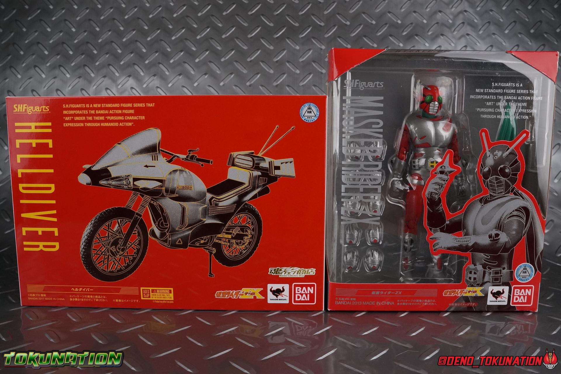 Well this one's been a long time coming. S.H. Figuarts Kamen Rider ZX was released over 4 years ago. Oddly enough just this past month, his Rider Machine the [BS.H. Figuarts ]Helldiver [/B]was finally released as well. Seeing as this has been a rather long and spottily quality controlled journey, we thought it best to examine the pair of these releases together. We'll kick things off with ZX himself: Part 1: S.H. Figuarts Kamen Rider ZX Packaging Kamen Rider ZX came out in 2013, just as figuarts packaging was really starting to get creative and unique. While at the time there wasn't much to ZX in fiction aside from the original Birth of the 10th special (he'd eventually make a fresh appearance in Heisei VS Showa Kamen Rider Taisen), Showa riders themselves were enjoying quite a bit of SHF merch. This figure was hot on the heels of the Kamen Rider Black Renewal actually. So ZX sort of falls into that weird crack between older style packaging and newer properly themed packaging. It's a bit plain but works well enough. Main Figure Now, while the box may be a bit bland it pales in comparison to just how horrendously executed this figure was. I want to preface this review by just straight up telling you that S.H. Figuarts Kamen Rider ZX is a mess. Here are the numerous reasons why. In every basic way, this figure is made poorly. While quality can certainly vary from sample to sample I've never really seen anyone give this release anything that amounts to a positive review. Looking at ZX, he's quite accurate. The suit's been re-created expertly and given how off some Showa suits can look in a modern toy aesthetic (I'm lookin' at you X) ZX actually looks good. However looks can be very deceiving. From the bottom up, ZX actually has some nice flexible ankles, lot's of good range in them. The knees have nice solid bends as well making them quite useful. On the shins you'll notice one of ZX's signature weapons, the Focus Bomb. These are removable and an accessory is included to replicate their proper bomb form. The big drawback of the legs however is the incredibly weak hip joints. I mean we're talking just dangling legs in some cases. It's common for older figuarts hips to crack over time, however my ZX has like this straight out of the box 4 years ago. Just super loose hips that make poses without a Tamashii Stage nearly impossible. Looking at the ZX Belt, it too looks the part but is deceptively poorly made. The center portion sits crooked on mine permanently because it was molded crookedly. It can be removed to replace it with the exposed circuitry version if you so choose. The small rectangles on either side of the belts were similarly poorly molded and don't quit fit the peg holes they're in on the belt. They fall off with an insanely irritating frequency. The two sections of the torso itself are not altogether bad, they provide and pretty good range of motion that any rider should have. Where there's an issue is the bulged out portions of the chest around the shoulders. You see the arms would likewise not be bad on their own. But those arms on this torso make for a combination that kills a huge chunk of articulation. The chest makes it impossible to stretch the arms out straight properly. Thankfully they have bicep swivels to mitigate some of that. The arms, similar to the legs, feature removable parts. This time the Cross Shuriken. An actual Shuriken is included to represent the proper weapon form of this part. While we're here, the wrists also work quite well, they sit a little too far out for my personal tastes but they work quite well. The hands however are either frustratingly difficult to plug on, or so loose they fall right off at will. The head is probably the one thing that really should be nailed on any rider release. But when it's off it's off. The likeness is there but the quality control is once again not. Mainly the details look very soft and unrefined, the paint is a bit sloppy, and the compound eyes are bit blurry from most angles. Likewise a rider's scarf should always be pulled off. This one is very disappointing. Thanks to a very shallow and loose ball joint socket, ZX's scarf falls out constantly when posing. Functionally this toy just doesn't work on most levels. Which is really sad considering ZX has such a great design. It translated extraordinarily well to his S.I.C. figure. I'd like to think that this long after his initial release, that Helldiver sales could maybe possibly spur a Shinkocchou Seihou. But that's probably a long shot. Accessories Despite his poor quality, ZX comes with a great many accessories. Everything he's ever been seen using: 5 - sets of hands. Pretty much all the varieties you'd need. Even bike hands which is bizarre considering how many years it took to get the Helldiver. Sadly none of these hands can hold his Micro Chain or Cross Shuriken well, and only a single hand has a peg hole compatible with the Focus Bomb. 1 - scarf. As I mentioned above thanks to a very shallow and loose ball joint socket, ZX's scarf falls out constantly when posing. 1 - ZX Belt (exposed electronics). Just a simple battle damage swap out part. It honestly pegs on better than the regular belt piece on my copy. 1 - Cross Shuriken. Considering the dummy Shuriken's on either forearm are removeable, I find it odd that only one proper shuriken was included. There's not really a proper dedicated hand that can even hold it sadly. 1 - Focus Bomb. This accessory doesn't look like much but it gets the point across of what it's supposed to be. However again there's only 1 when the dummy bombs on the shins are both removable. It can only be properly held by one right hand with a peg hole to accommodate it. 1 - Micro Chain. This weapon is a bit more unique for a figuart. a bladed kunai/shuriken type wepon on the end of an actual metal chain. Sadly there is no hand included that can make a firm grip on this chain. It's use with the figure is predicated entirely upon a balancing act.