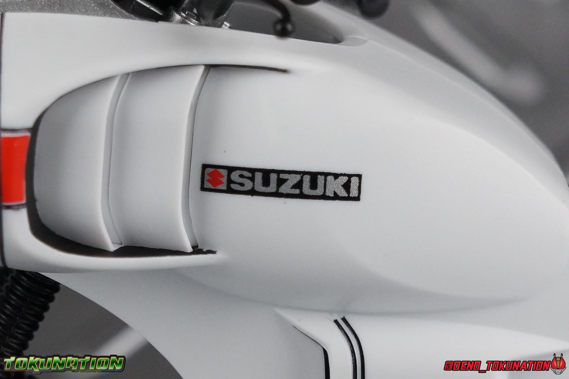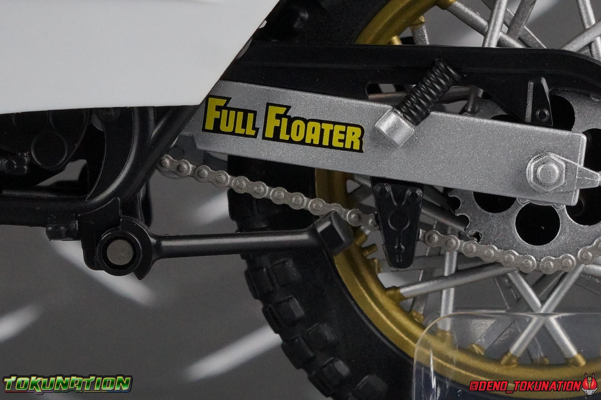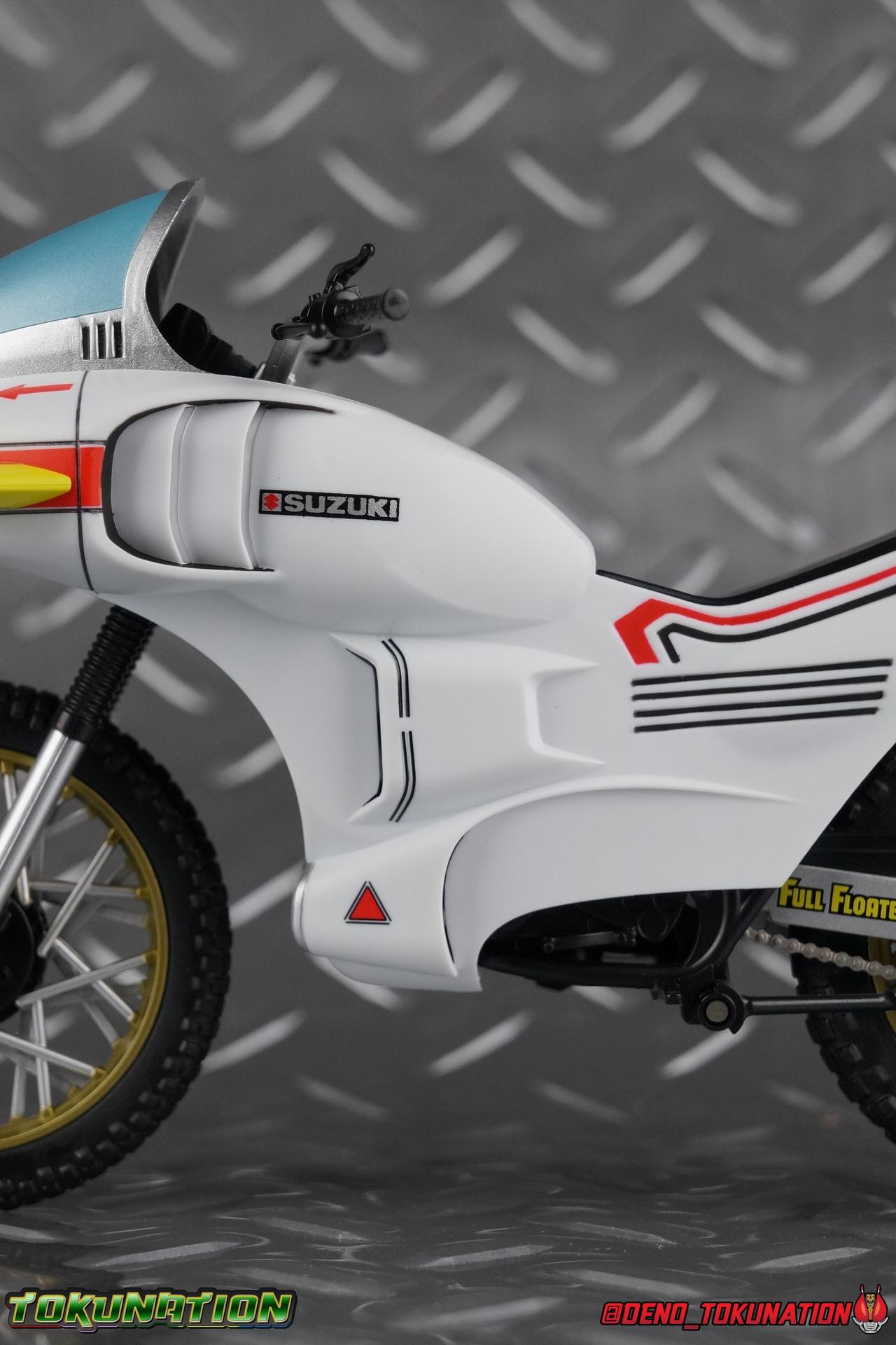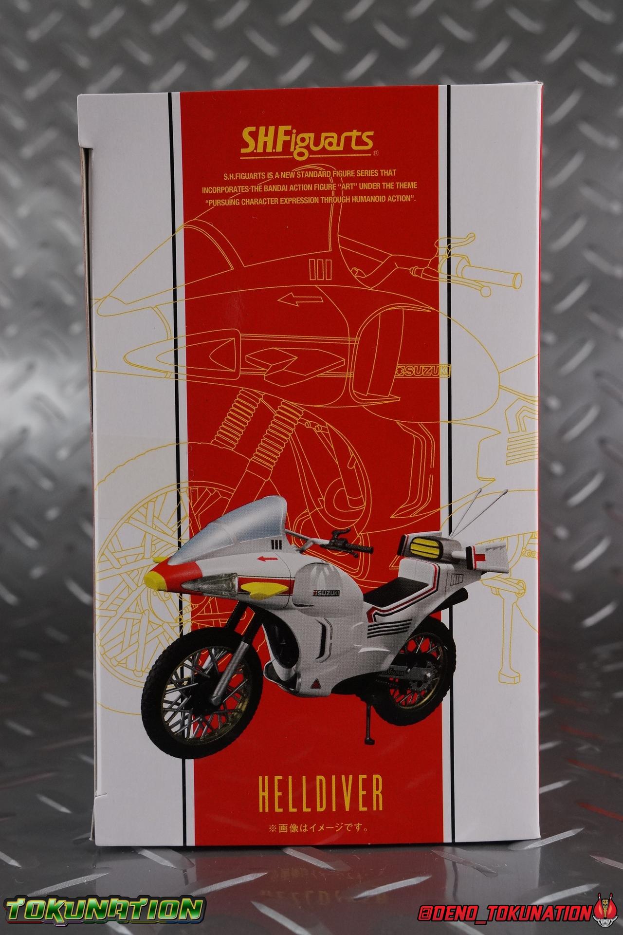 Packaging The Helldiver's packaging, despite being the most recent Showa Rider Machine released, falls right in line with what we've been seeing for years. The unique way in which the two-tone box art is done, is synonymous to me with Showa machines now. It just looks really cool. I especially like the sort of design line art used on the spine of the box. The standard stock photos are what you'd expect otherwise. Main Figure As one of very people who even bothered to order a Helldiver to compliment their lackluster ZX's, I have to say I quite like this bike despite it coming with almost nothing and doing even less. The Helldiver is a very typical Rider Machine of the Showa Era. A unique looking bike (this time based on the basic chassis of a Suzuki DR250S. It may seem like an unorthodox looking bike as well but it's got nothing more bizarre designs like the X-Cruiser & Jungler. The typical hallmarks are here though, like working rear suspension, turning front axle, and a kickstand. I do find that when more simplistic rider machines are released that they almost always have exquisite paint apps, the Helldiver is no different. Right down to the official Suzuki logo and the "Full Floater" callout on the rear suspension, everything is crisp and clear. You can even make out the odometer quite well. And while I've never noticed it before now, the front portion of the Helldiver looks quite a bit like a rocket to me. Which is an odd bike them for a (basically) ninja themed rider. As far as the bike's functionality, that's really it. Now the big problem is that it can't perfectly interact with the ZX figuart. ZX is 4 years older than the Helldiver and it shows. This machine is made in a scale that seems more in line with other contemporary rider machines, to accommodate figuarts that are larger than those of the old era. ZX is really a bit undersized for this bike and that's the crux of the problem. His hips can't move out widely enough to sit flatly on the seat and he winds up sitting too far forward. ZX's ankles and knees do however finally have some usefulness as he can properly get into a stance that places his feet on the foot pegs. The legs are however too short for the foot to sit nice and flat on the ground while he's seated on the bike. ZX's oddly shaped chest makes it a little difficult to get his hand around the handlebars as well, but it can be done. Accessories Just two. Like all rider machines the Helldiver comes with a standard Wheel Base to hold the rear wheel in place and make display that much easier. This release also includes an accessory that's becoming more and more of a standard with SHF bikes and that's a Tamashii Stage Adapter. It plugs into a port on the underside of the engine block and can allow you to pull off some more dynamic action poses. Final Thoughts Overall I really like this bike. It has enough charm and personality to really win me over. Sometimes the simple vehicles really can be some of the best. If you already own ZX and want an accessory to make him actually useful, then pick up S.H. Figuarts Helldiver.
