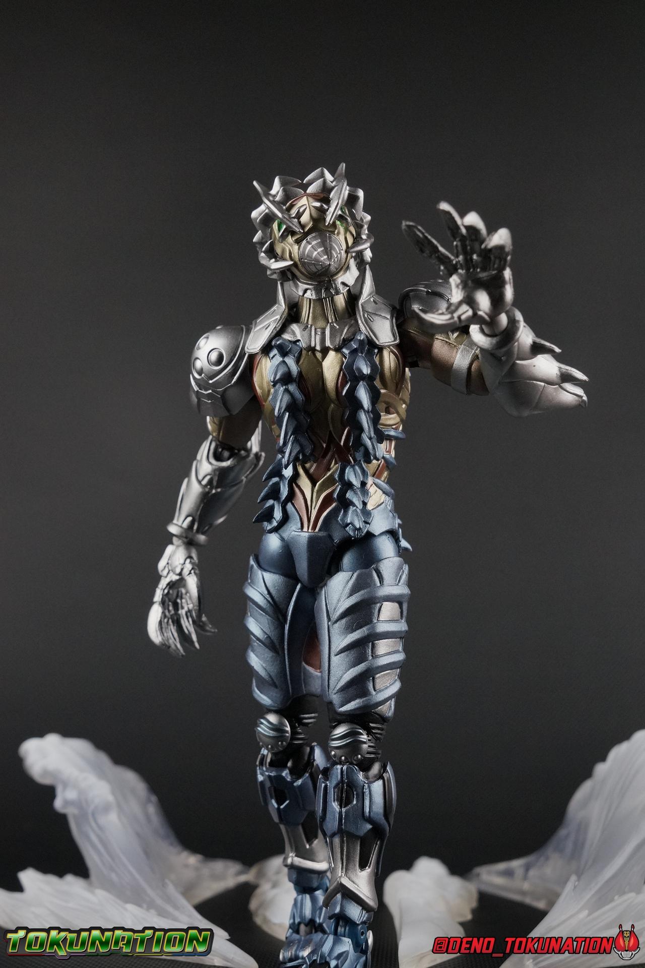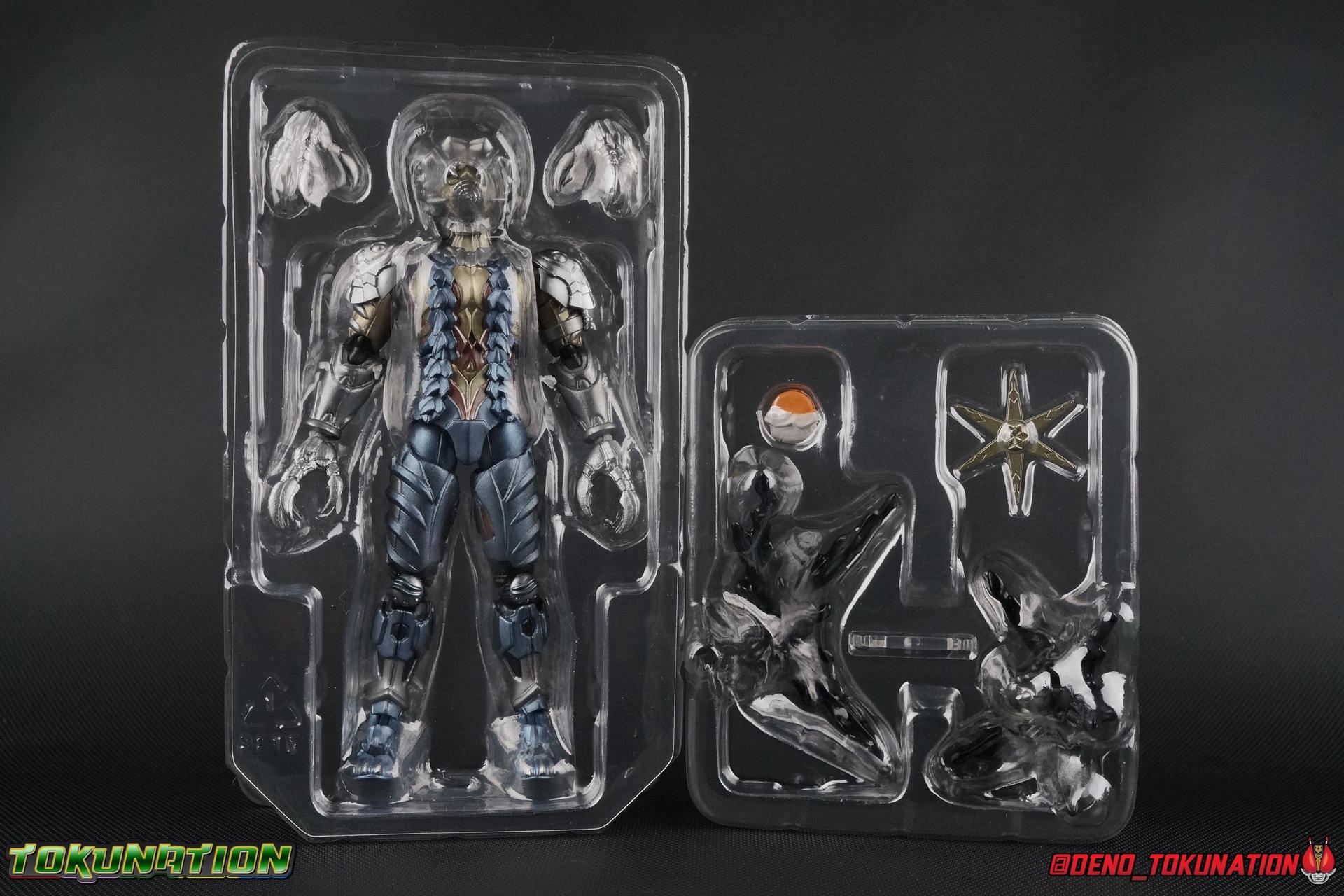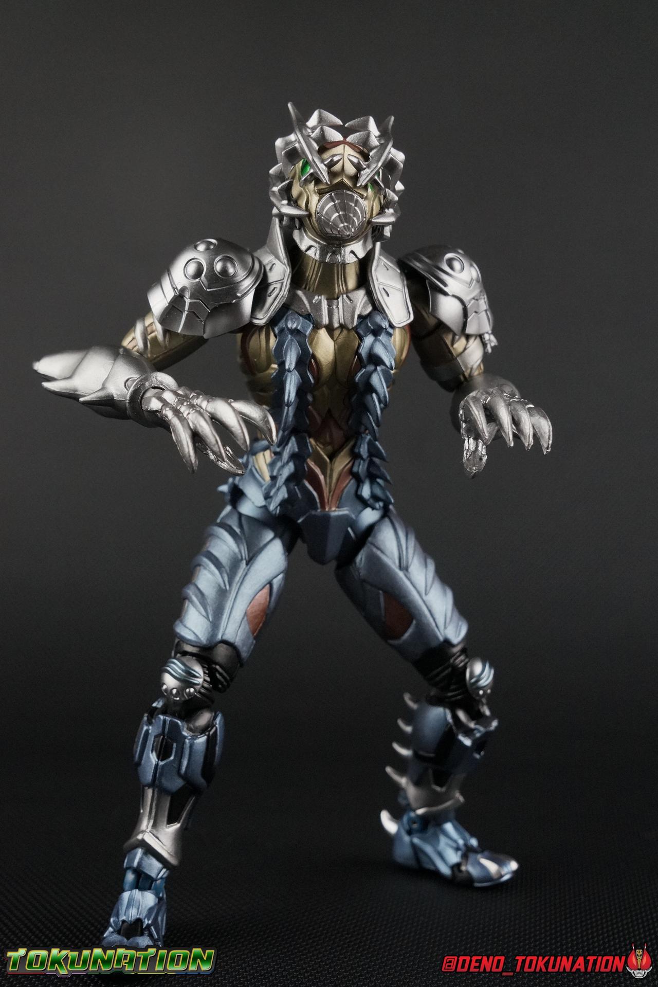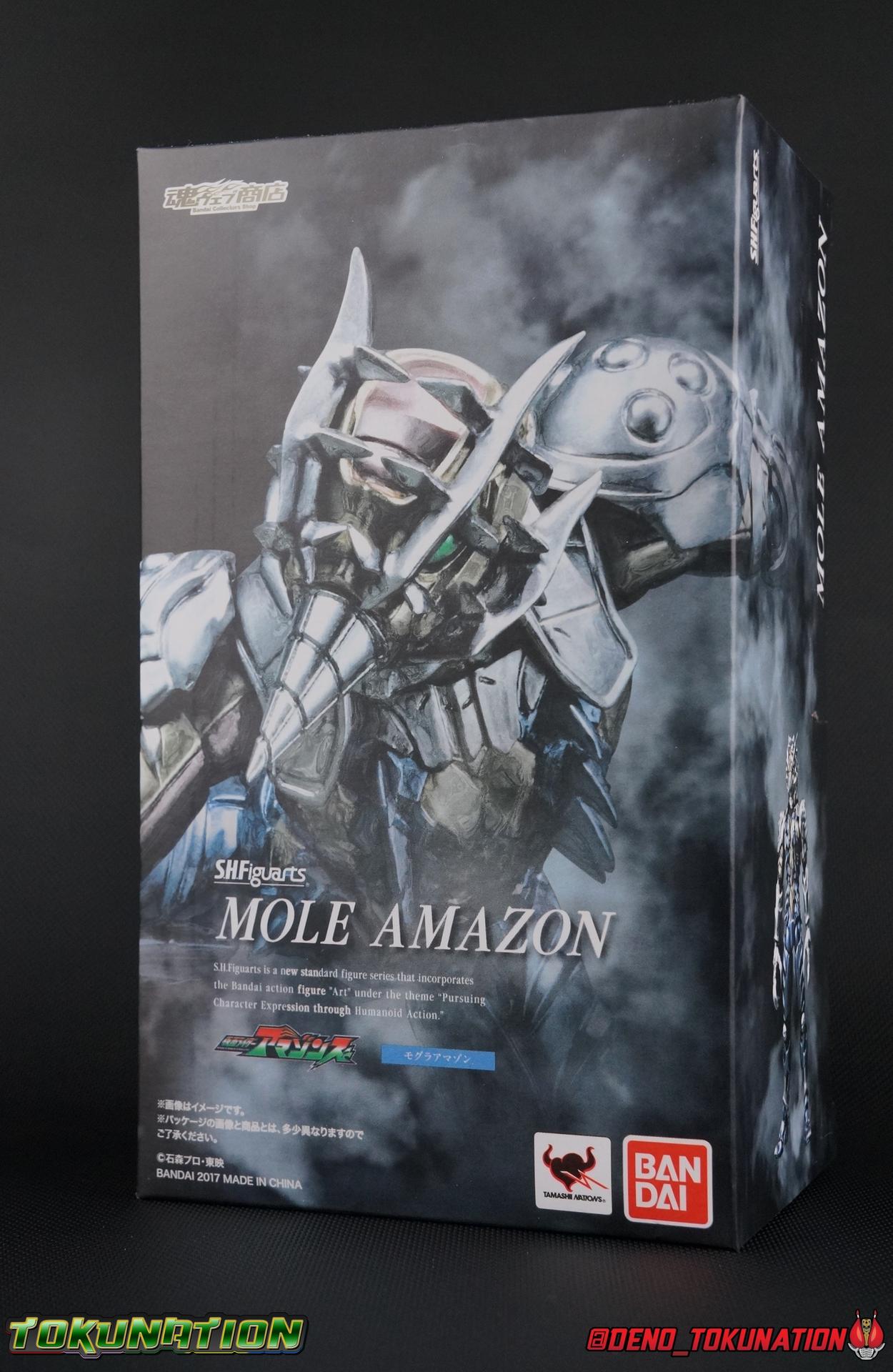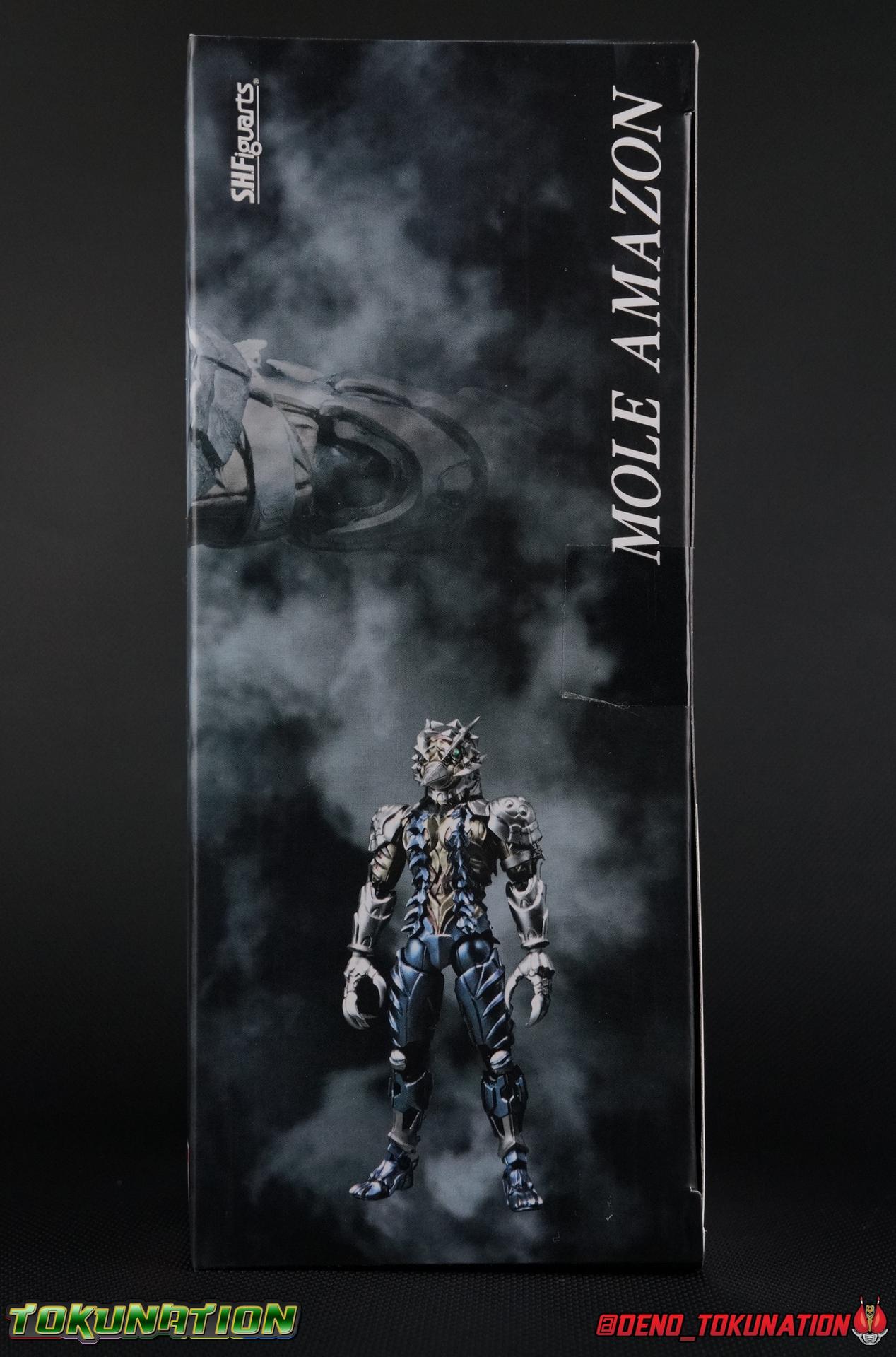 Before Haruka Mizusawa became Amazon Omega, another Amazon friendly to humans helped hunt his own kind. Mamoru, the Mole Amazon, was a member of the Nozoma Peston Service. A rag tag group of mercenaries working any job they could to get paid. Destroying Amazons any and everywhere, the heavy hitter of this group was Mamoru as the only Amazon controlled by Nozoma before the arrival of Haruka/Omega. While powerful, Mamoru had a gentle soul and would have done anything to protect his friends. Often seen eating a hamburger in lieu of his kinds' preferred protein intake, Mamoru lived a simple life. As we all know he would change dramatically 5 years after the first season. Still, there's something to love about Mamoru's character in season 1 of Kamen Rider Amazons. If you weren't aware, Mole Amazon is actually based on the Showa character Mole Beastman from the original Kamen Rider Amazon TV series. Mole Beastman was actually the very first Kaijin to befriend an Kamen Rider, and became a strong ally to Amazon. So it's no wonder that a similar bond was forged between Mamoru & Haruka for a time. As the first of the proper non-rider Amazons to receive a figure, let's dive in and take a look at S.H. Figuarts Mole Amazon! Packaging Unlike a majority of the Amazons releases in my collection, Mole Amazon was not released in any sort of Amazon JP Edition. So he has more standardized packaging in line with the regular releases of Alpha, Omega, New Omega, & Neo. Mole Amazon's box actually matches up really well with Sigma's. Which is just perfect given the character's interactions. The shot used on the front of the box is particularly nice, and really all of the stock photography on the back is spot on, showcasing the best things about this figure. Main Figures I was really really excited when this figure got announced. Not only because of the burger (but duh also because he comes with a damn hamburger accessory) but really just because it showed a willingness to branch out more from just the proper Kamen Riders of the Amazons show. Mamoru was certainly an integral member of the team. but he wasn't a character I'd ever really assumed would get a figuart. After Amazon Sigma was announced I'd just assumed we were probably done with season 1 characters. I'm really happy I was wrong about that. Don't get me wrong I have some qualms with the Mole Amazon as you'll see below, but on the whole I really do like this figure. As always I want to start my review off from the bottom up. You'll see that essentially every surface on Mole's body is lavishly painted in metallic ice blue, silver, and on the upper body a sort of metallic mustard/bronze. Normally I'd be a bit afraid of quite this much paint but Mole actually doesn't have any serious or notable paint flaws that I can find. Now to the legs. After reviewing Amazon Neo, I find him to be sort of the bellweather of this line. A surprisingly well designed figure that I wasn't prepared to love with some great articulation. With that in mind I'm just a bit disappointed that Mole Amazon has some stunted leg articulation. Particularly in the ankles. Thanks to the shin armor/ankle cuffs you lose a bit of side and forward motion out of each foot. The feet themselves feel difficult to balance as is without this though. The knees suffer almost the same fate as Amazon Alpha, the protruding sections on the calves impact the back of the hips immediately limiting how far the leg can bend back. It's not as bad as Alpha but it's there. The hips are thankfully the "new style" and therefore not drop down which is always nice. They do feel a bit tight and don't angle out quite as much as I like but they get the job done. As you'll see below, the Mole Amazon's torso/upper body is just fantastically intricately detailed. The sculpted lines in the chest, abs, and back make this figure feel much more like a suit come to life than most. And the protruding spikes on the front and back side are done very well. They aren't soft or rubbery at all, but actually rather pointy and a little uncomfortable, but great. My big gripe here however is that the waist joint does feel a bit too tight, and a bit limited. While tightness can change sample to sample I don't feel this waist joint is as good as it could or should be. You'll need to be careful as you move the torso around to keep the spikes on it and those on the waist in mind as it can be easier than you think to knock the two together. Mole's arms are quite good, though not perfect. The elbows work at just about a 90 degree angle and the wrists have plenty of clearance for either pair of his large clawed hands. Finger tips and spikes here are likewise nice and pointy so be careful with them. Shoulder pads can move up a decent amount out of the way. Don't forget there's an Amazons Register on the left bicep as well. The silver paint has a way of making it easy to miss but it's really nicely detailed. This all brings us up to the head, which is the most striking and interesting thing about the figure. From a design standpoint it's really unique. Mole almost looks as though he's trapped within a cage. I'm really pleased again with how the paint details worked out on him. I am a bit disappointed with how the head impact the collar around the neck though. There's definitely room for improvement there. The contrast between the bronze and silver really allows his green eyes to pop even more. And while this character of course homages the Mole Beastman form the original Kamen Rider Amazon series, that can be hard to tell if you don't know. So of course the best link between the two is the mouth/drill they share. In it's standard form you can't quite see it in the Mole Amazon, but if you use the open mouth accessory below, the homage finally becomes more apparent. Accessories Because the Mole Amazon didn't really use weapons in the same manner as the Amazons riders, he winds up coming with the best and most appropriate accessories possible: 1 - set