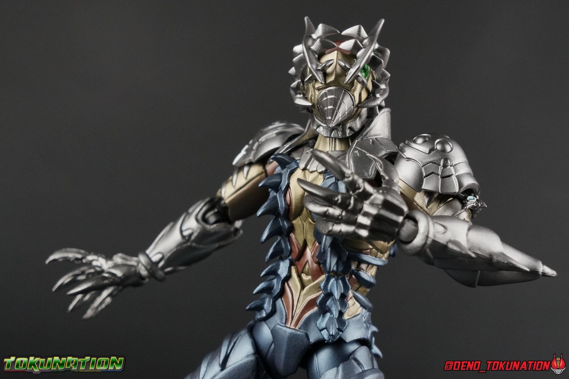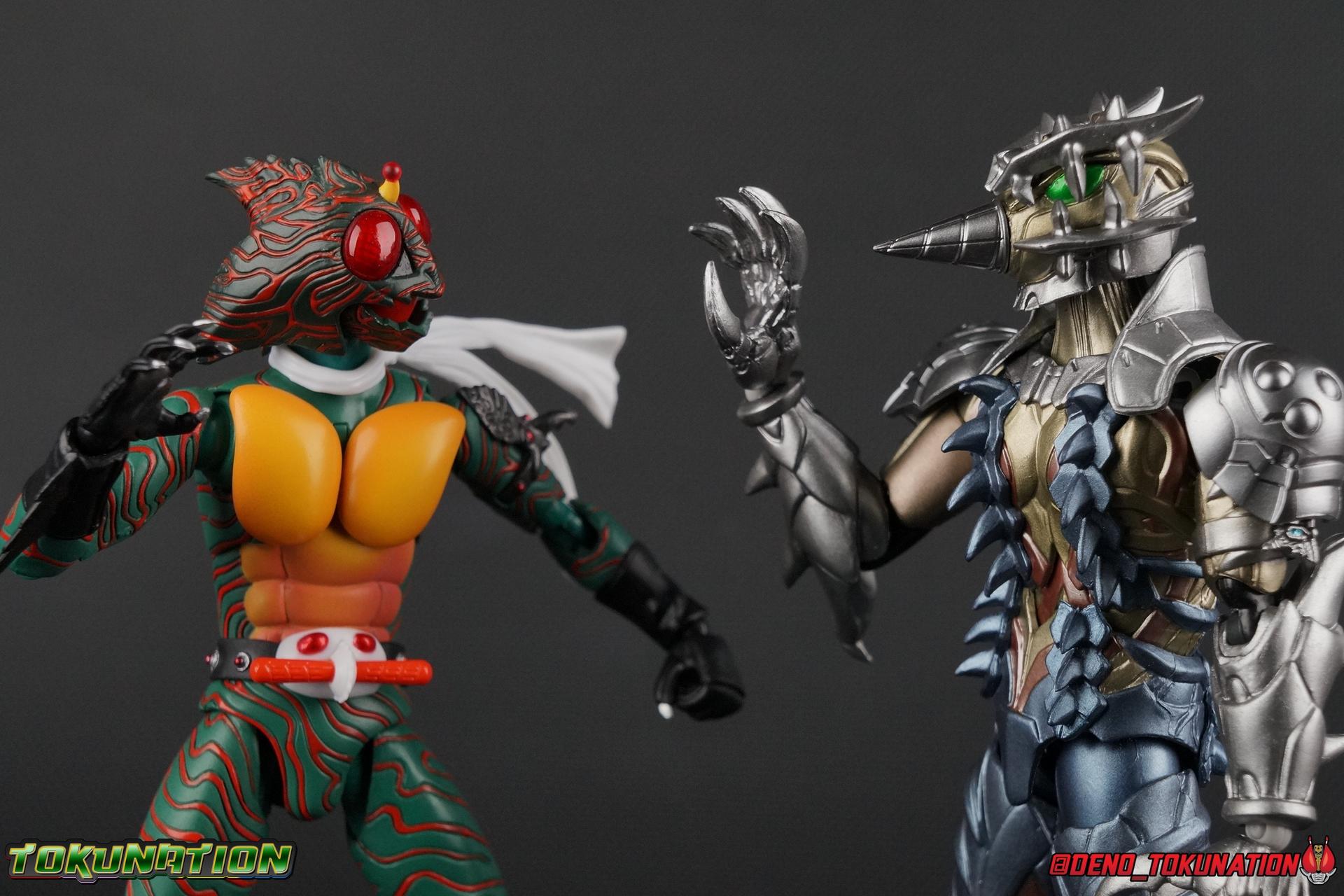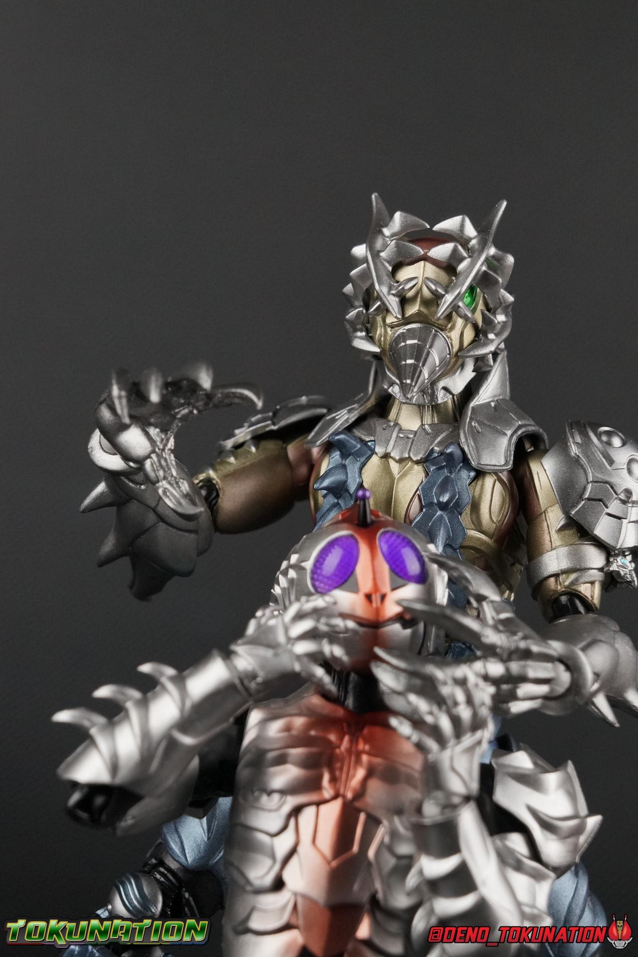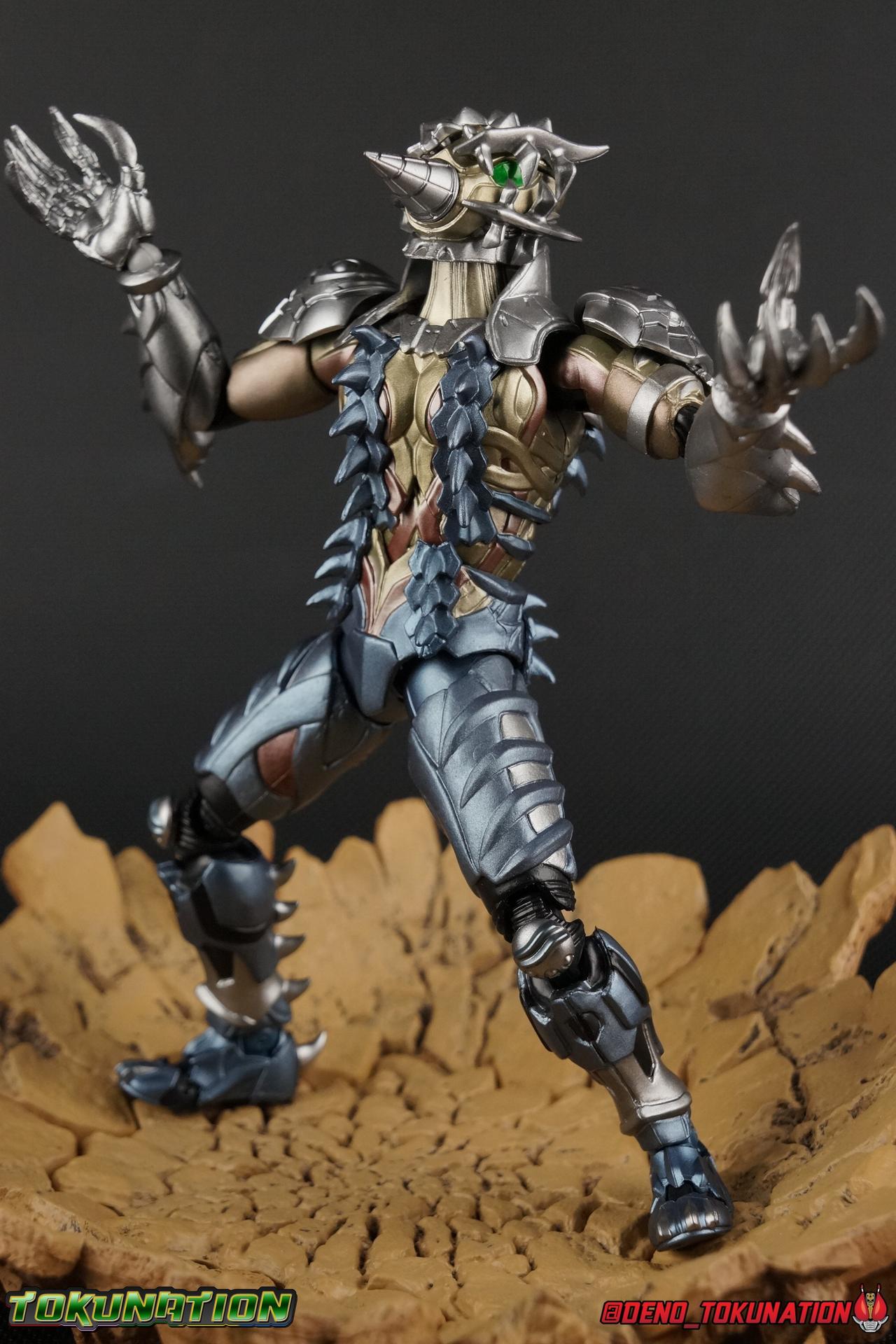 Before Haruka Mizusawa became Amazon Omega, another Amazon friendly to humans helped hunt his own kind. Mamoru, the Mole Amazon, was a member of the Nozoma Peston Service. A rag tag group of mercenaries working any job they could to get paid. Destroying Amazons any and everywhere, the heavy hitter of this group was Mamoru as the only Amazon controlled by Nozoma before the arrival of Haruka/Omega. While powerful, Mamoru had a gentle soul and would have done anything to protect his friends. Often seen eating a hamburger in lieu of his kinds' preferred protein intake, Mamoru lived a simple life. As we all know he would change dramatically 5 years after the first season. Still, there's something to love about Mamoru's character in season 1 of Kamen Rider Amazons. If you weren't aware, Mole Amazon is actually based on the Showa character Mole Beastman from the original Kamen Rider Amazon TV series. Mole Beastman was actually the very first Kaijin to befriend an Kamen Rider, and became a strong ally to Amazon. So it's no wonder that a similar bond was forged between Mamoru & Haruka for a time. As the first of the proper non-rider Amazons to receive a figure, let's dive in and take a look at S.H. Figuarts Mole Amazon! Packaging Unlike a majority of the Amazons releases in my collection, Mole Amazon was not released in any sort of Amazon JP Edition. So he has more standardized packaging in line with the regular releases of Alpha, Omega, New Omega, & Neo. Mole Amazon's box actually matches up really well with Sigma's. Which is just perfect given the character's interactions. The shot used on the front of the box is particularly nice, and really all of the stock photography on the back is spot on, showcasing the best things about this figure. Main Figures I was really really excited when this figure got announced. Not only because of the burger (but duh also because he comes with a damn hamburger accessory) but really just because it showed a willingness to branch out more from just the proper Kamen Riders of the Amazons show. Mamoru was certainly an integral member of the team. but he wasn't a character I'd ever really assumed would get a figuart. After Amazon Sigma was announced I'd just assumed we were probably done with season 1 characters. I'm really happy I was wrong about that. Don't get me wrong I have some qualms with the Mole Amazon as you'll see below, but on the whole I really do like this figure. As always I want to start my review off from the bottom up. You'll see that essentially every surface on Mole's body is lavishly painted in metallic ice blue, silver, and on the upper body a sort of metallic mustard/bronze. Normally I'd be a bit afraid of quite this much paint but Mole actually doesn't have any serious or notable paint flaws that I can find. Now to the legs. After reviewing Amazon Neo, I find him to be sort of the bellweather of this line. A surprisingly well designed figure that I wasn't prepared to love with some great articulation. With that in mind I'm just a bit disappointed that Mole Amazon has some stunted leg articulation. Particularly in the ankles. Thanks to the shin armor/ankle cuffs you lose a bit of side and forward motion out of each foot. The feet themselves feel difficult to balance as is without this though. The knees suffer almost the same fate as Amazon Alpha, the protruding sections on the calves impact the back of the hips immediately limiting how far the leg can bend back. It's not as bad as Alpha but it's there. The hips are thankfully the "new style" and therefore not drop down which is always nice. They do feel a bit tight and don't angle out quite as much as I like but they get the job done. As you'll see below, the Mole Amazon's torso/upper body is just fantastically intricately detailed. The sculpted lines in the chest, abs, and back make this figure feel much more like a suit come to life than most. And the protruding spikes on the front and back side are done very well. They aren't soft or rubbery at all, but actually rather pointy and a little uncomfortable, but great. My big gripe here however is that the waist joint does feel a bit too tight, and a bit limited. While tightness can change sample to sample I don't feel this waist joint is as good as it could or should be. You'll need to be careful as you move the torso around to keep the spikes on it and those on the waist in mind as it can be easier than you think to knock the two together. Mole's arms are quite good, though not perfect. The elbows work at just about a 90 degree angle and the wrists have plenty of clearance for either pair of his large clawed hands. Finger tips and spikes here are likewise nice and pointy so be careful with them. Shoulder pads can move up a decent amount out of the way. Don't forget there's an Amazons Register on the left bicep as well. The silver paint has a way of making it easy to miss but it's really nicely detailed. This all brings us up to the head, which is the most striking and interesting thing about the figure. From a design standpoint it's really unique. Mole almost looks as though he's trapped within a cage. I'm really pleased again with how the paint details worked out on him. I am a bit disappointed with how the head impact the collar around the neck though. There's definitely room for improvement there. The contrast between the bronze and silver really allows his green eyes to pop even more. And while this character of course homages the Mole Beastman form the original Kamen Rider Amazon series, that can be hard to tell if you don't know. So of course the best link between the two is the mouth/drill they share. In it's standard form you can't quite see it in the Mole Amazon, but if you use the open mouth accessory below, the homage finally becomes more apparent. Accessories Because the Mole Amazon didn't really use weapons in the same manner as the Amazons riders, he winds up coming with the best and most appropriate accessories possible: 1 - set