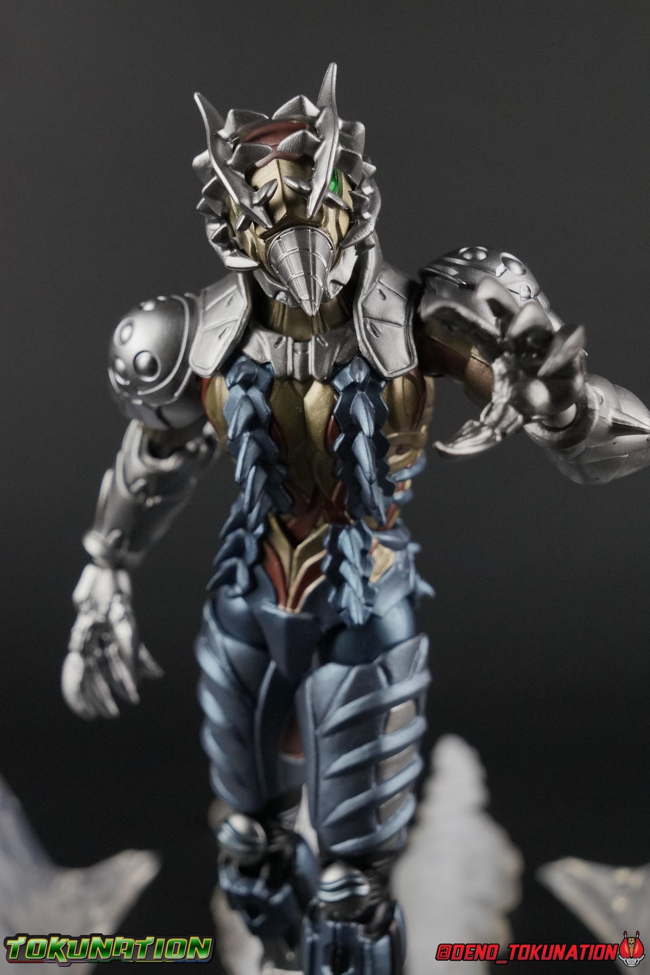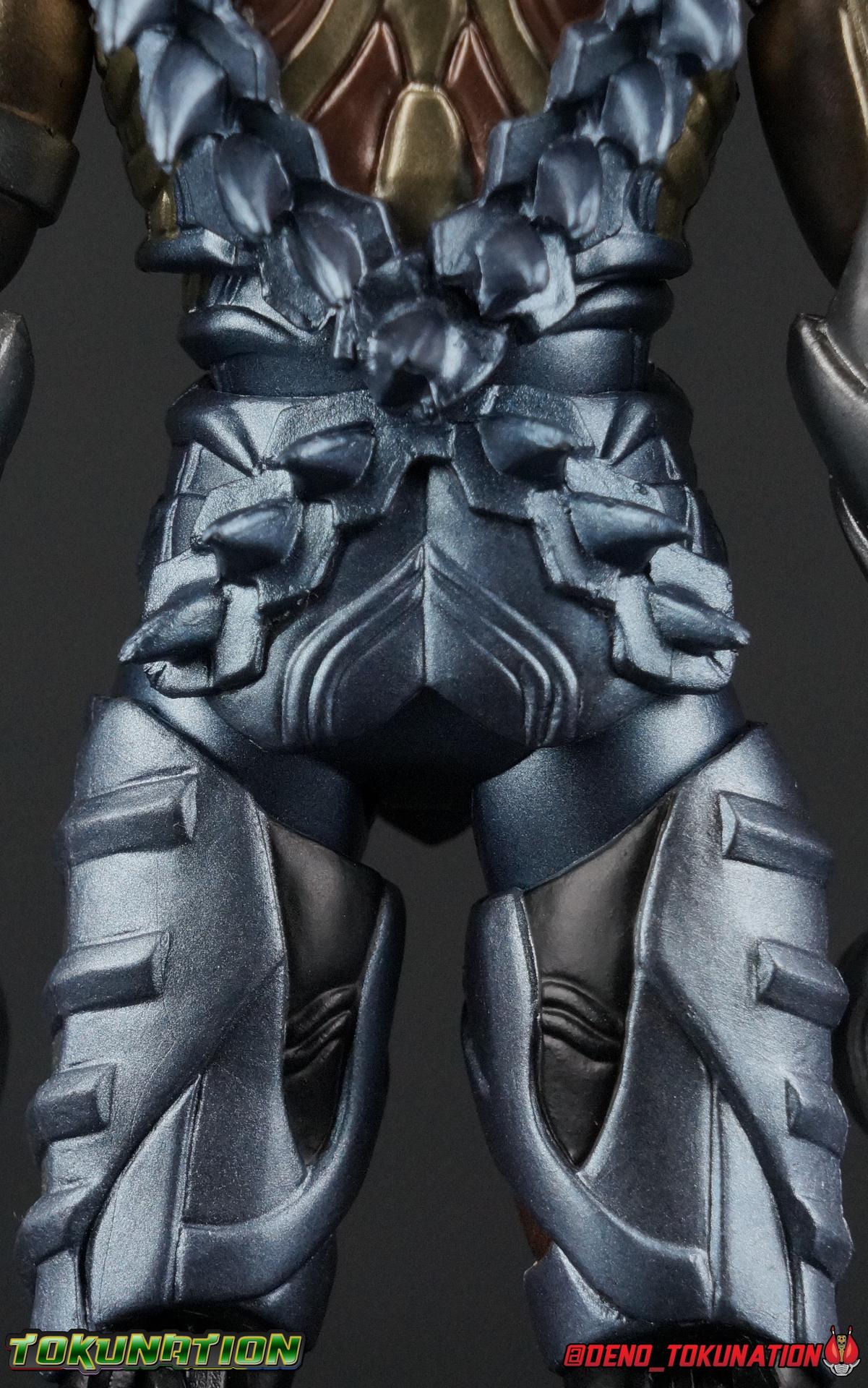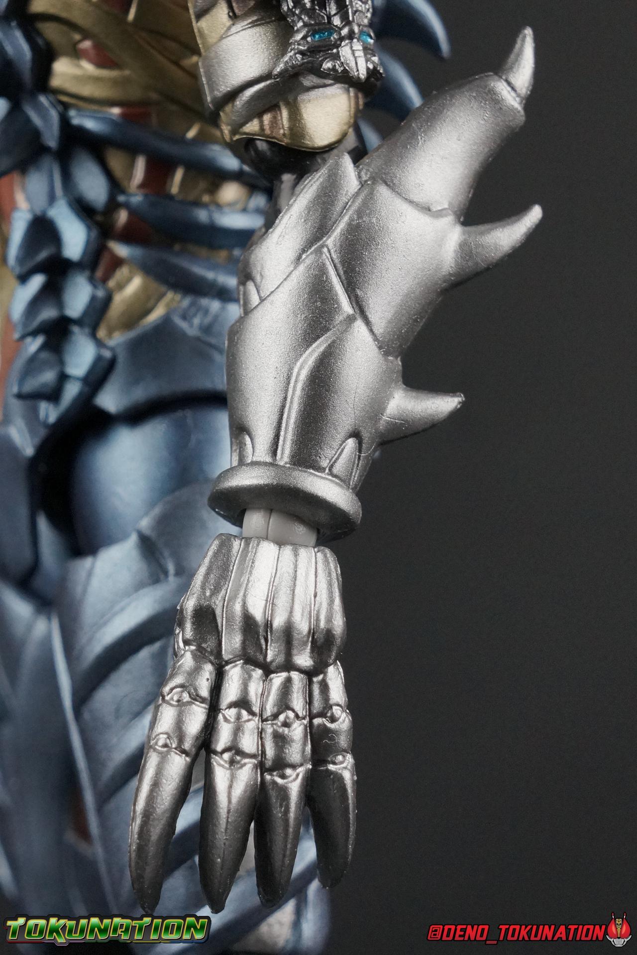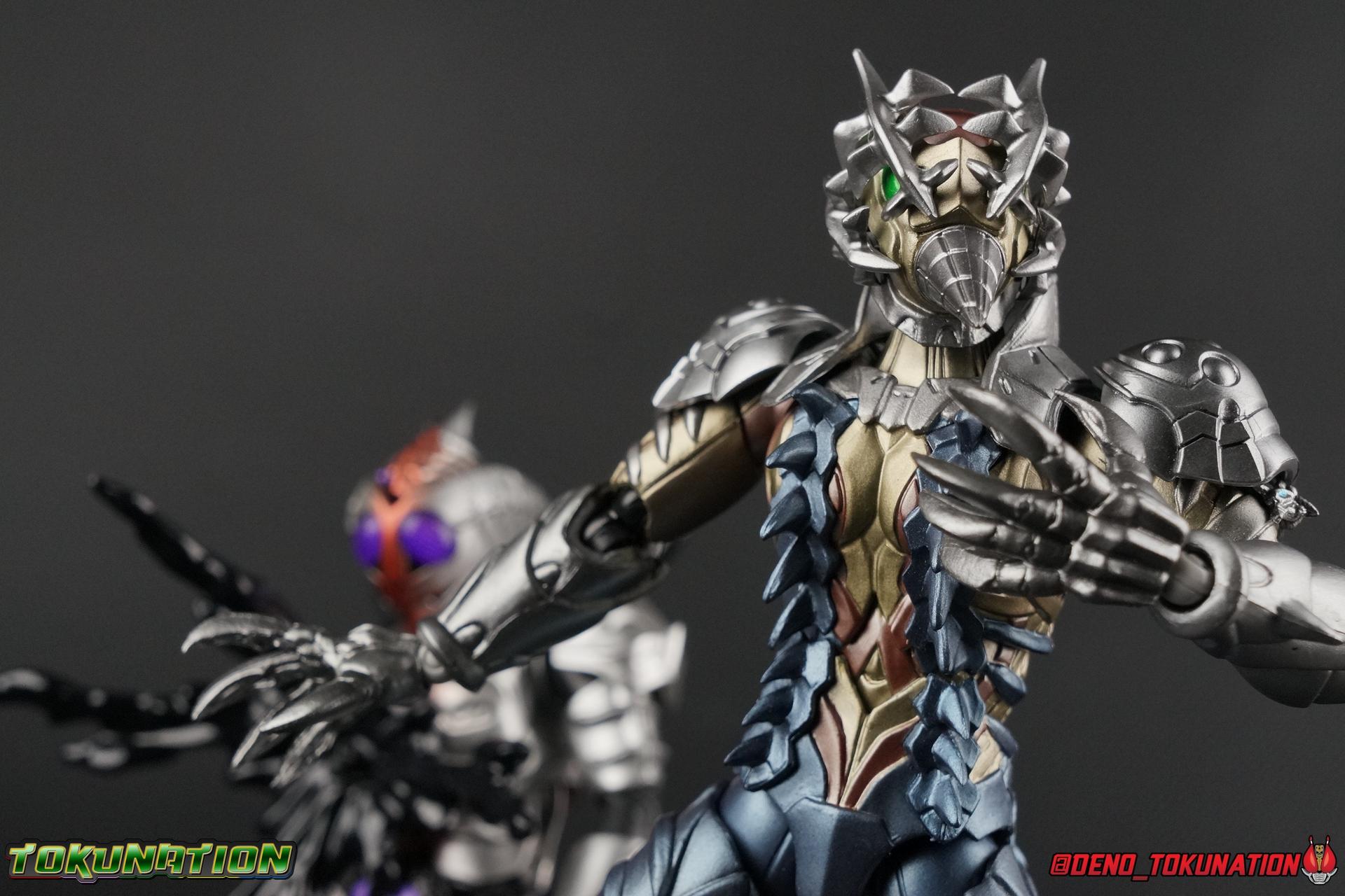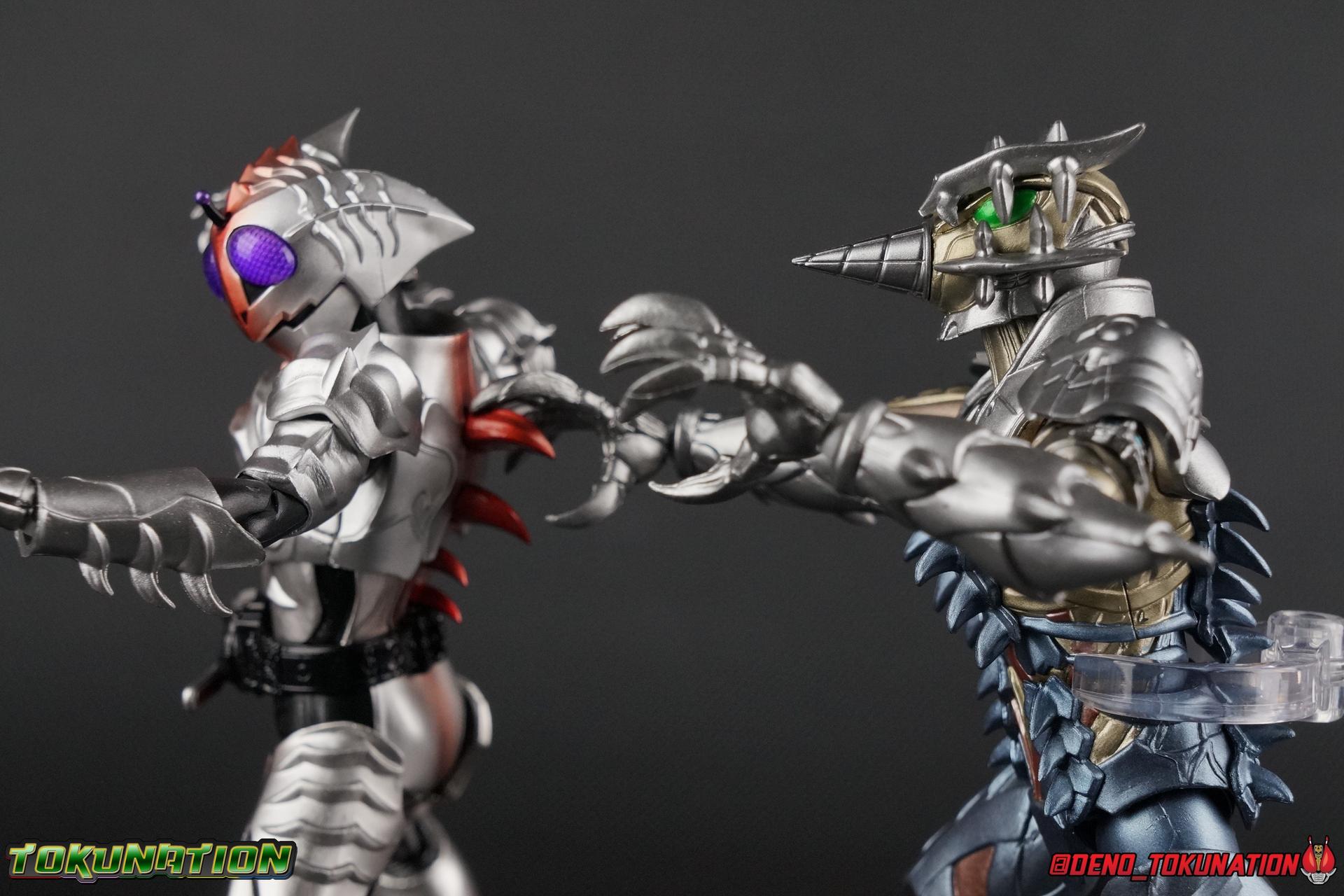 Before Haruka Mizusawa became Amazon Omega, another Amazon friendly to humans helped hunt his own kind. Mamoru, the Mole Amazon, was a member of the Nozoma Peston Service. A rag tag group of mercenaries working any job they could to get paid. Destroying Amazons any and everywhere, the heavy hitter of this group was Mamoru as the only Amazon controlled by Nozoma before the arrival of Haruka/Omega. While powerful, Mamoru had a gentle soul and would have done anything to protect his friends. Often seen eating a hamburger in lieu of his kinds' preferred protein intake, Mamoru lived a simple life. As we all know he would change dramatically 5 years after the first season. Still, there's something to love about Mamoru's character in season 1 of Kamen Rider Amazons. If you weren't aware, Mole Amazon is actually based on the Showa character Mole Beastman from the original Kamen Rider Amazon TV series. Mole Beastman was actually the very first Kaijin to befriend an Kamen Rider, and became a strong ally to Amazon. So it's no wonder that a similar bond was forged between Mamoru & Haruka for a time. As the first of the proper non-rider Amazons to receive a figure, let's dive in and take a look at S.H. Figuarts Mole Amazon! Packaging Unlike a majority of the Amazons releases in my collection, Mole Amazon was not released in any sort of Amazon JP Edition. So he has more standardized packaging in line with the regular releases of Alpha, Omega, New Omega, & Neo. Mole Amazon's box actually matches up really well with Sigma's. Which is just perfect given the character's interactions. The shot used on the front of the box is particularly nice, and really all of the stock photography on the back is spot on, showcasing the best things about this figure. Main Figures I was really really excited when this figure got announced. Not only because of the burger (but duh also because he comes with a damn hamburger accessory) but really just because it showed a willingness to branch out more from just the proper Kamen Riders of the Amazons show. Mamoru was certainly an integral member of the team. but he wasn't a character I'd ever really assumed would get a figuart. After Amazon Sigma was announced I'd just assumed we were probably done with season 1 characters. I'm really happy I was wrong about that. Don't get me wrong I have some qualms with the Mole Amazon as you'll see below, but on the whole I really do like this figure. As always I want to start my review off from the bottom up. You'll see that essentially every surface on Mole's body is lavishly painted in metallic ice blue, silver, and on the upper body a sort of metallic mustard/bronze. Normally I'd be a bit afraid of quite this much paint but Mole actually doesn't have any serious or notable paint flaws that I can find. Now to the legs. After reviewing Amazon Neo, I find him to be sort of the bellweather of this line. A surprisingly well designed figure that I wasn't prepared to love with some great articulation. With that in mind I'm just a bit disappointed that Mole Amazon has some stunted leg articulation. Particularly in the ankles. Thanks to the shin armor/ankle cuffs you lose a bit of side and forward motion out of each foot. The feet themselves feel difficult to balance as is without this though. The knees suffer almost the same fate as Amazon Alpha, the protruding sections on the calves impact the back of the hips immediately limiting how far the leg can bend back. It's not as bad as Alpha but it's there. The hips are thankfully the "new style" and therefore not drop down which is always nice. They do feel a bit tight and don't angle out quite as much as I like but they get the job done. As you'll see below, the Mole Amazon's torso/upper body is just fantastically intricately detailed. The sculpted lines in the chest, abs, and back make this figure feel much more like a suit come to life than most. And the protruding spikes on the front and back side are done very well. They aren't soft or rubbery at all, but actually rather pointy and a little uncomfortable, but great. My big gripe here however is that the waist joint does feel a bit too tight, and a bit limited. While tightness can change sample to sample I don't feel this waist joint is as good as it could or should be. You'll need to be careful as you move the torso around to keep the spikes on it and those on the waist in mind as it can be easier than you think to knock the two together. Mole's arms are quite good, though not perfect. The elbows work at just about a 90 degree angle and the wrists have plenty of clearance for either pair of his large clawed hands. Finger tips and spikes here are likewise nice and pointy so be careful with them. Shoulder pads can move up a decent amount out of the way. Don't forget there's an Amazons Register on the left bicep as well. The silver paint has a way of making it easy to miss but it's really nicely detailed. This all brings us up to the head, which is the most striking and interesting thing about the figure. From a design standpoint it's really unique. Mole almost looks as though he's trapped within a cage. I'm really pleased again with how the paint details worked out on him. I am a bit disappointed with how the head impact the collar around the neck though. There's definitely room for improvement there. The contrast between the bronze and silver really allows his green eyes to pop even more. And while this character of course homages the Mole Beastman form the original Kamen Rider Amazon series, that can be hard to tell if you don't know. So of course the best link between the two is the mouth/drill they share. In it's standard form you can't quite see it in the Mole Amazon, but if you use the open mouth accessory below, the homage finally becomes more apparent. Accessories Because the Mole Amazon didn't really use weapons in the same manner as the Amazons riders, he winds up coming with the best and most appropriate accessories possible: 1 - set