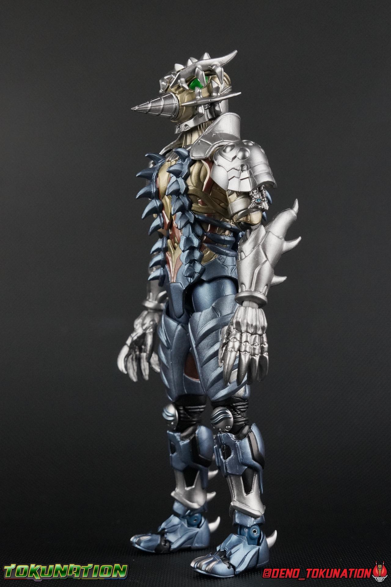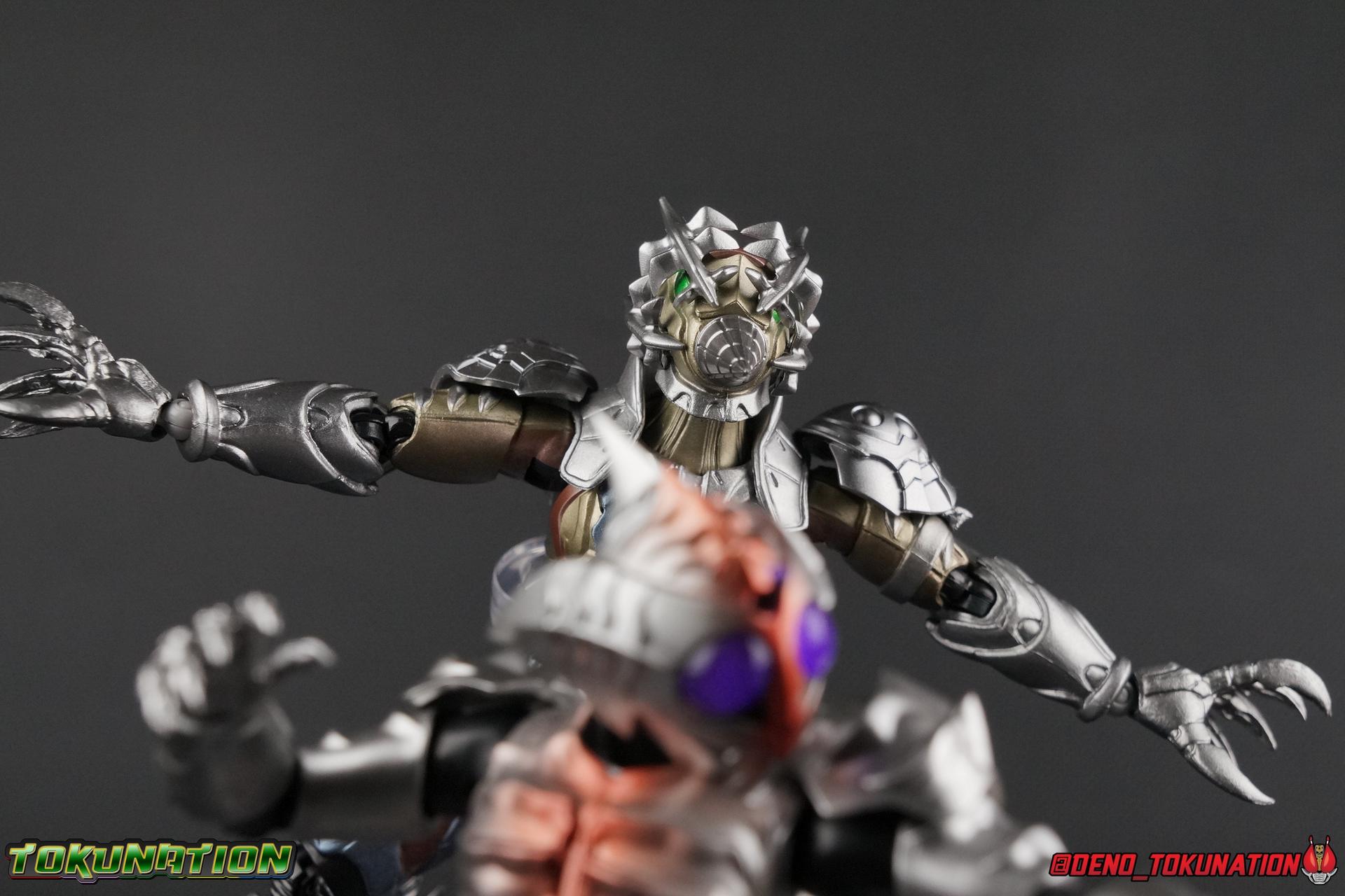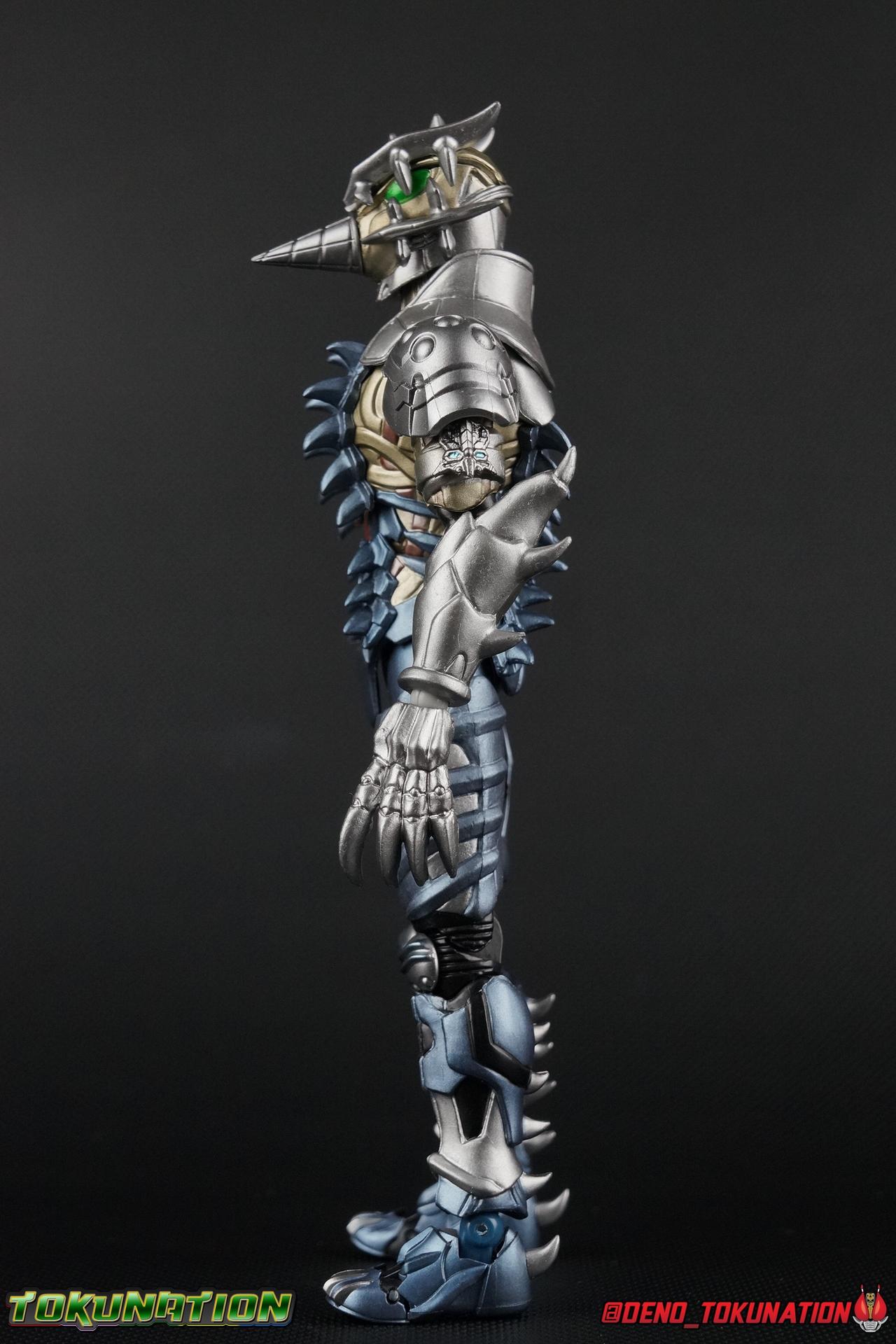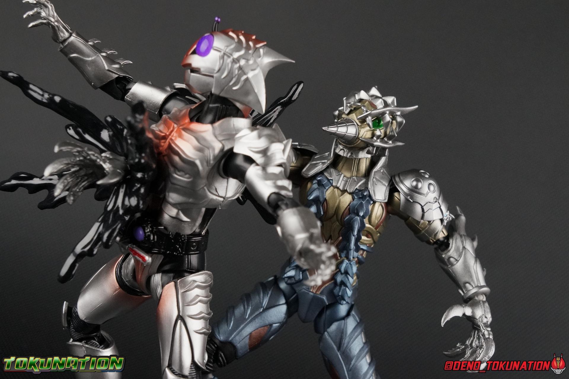 Before Haruka Mizusawa became Amazon Omega, another Amazon friendly to humans helped hunt his own kind. Mamoru, the Mole Amazon, was a member of the Nozoma Peston Service. A rag tag group of mercenaries working any job they could to get paid. Destroying Amazons any and everywhere, the heavy hitter of this group was Mamoru as the only Amazon controlled by Nozoma before the arrival of Haruka/Omega. While powerful, Mamoru had a gentle soul and would have done anything to protect his friends. Often seen eating a hamburger in lieu of his kinds' preferred protein intake, Mamoru lived a simple life. As we all know he would change dramatically 5 years after the first season. Still, there's something to love about Mamoru's character in season 1 of Kamen Rider Amazons. If you weren't aware, Mole Amazon is actually based on the Showa character Mole Beastman from the original Kamen Rider Amazon TV series. Mole Beastman was actually the very first Kaijin to befriend an Kamen Rider, and became a strong ally to Amazon. So it's no wonder that a similar bond was forged between Mamoru & Haruka for a time. As the first of the proper non-rider Amazons to receive a figure, let's dive in and take a look at S.H. Figuarts Mole Amazon! Packaging Unlike a majority of the Amazons releases in my collection, Mole Amazon was not released in any sort of Amazon JP Edition. So he has more standardized packaging in line with the regular releases of Alpha, Omega, New Omega, & Neo. Mole Amazon's box actually matches up really well with Sigma's. Which is just perfect given the character's interactions. The shot used on the front of the box is particularly nice, and really all of the stock photography on the back is spot on, showcasing the best things about this figure. Main Figures I was really really excited when this figure got announced. Not only because of the burger (but duh also because he comes with a damn hamburger accessory) but really just because it showed a willingness to branch out more from just the proper Kamen Riders of the Amazons show. Mamoru was certainly an integral member of the team. but he wasn't a character I'd ever really assumed would get a figuart. After Amazon Sigma was announced I'd just assumed we were probably done with season 1 characters. I'm really happy I was wrong about that. Don't get me wrong I have some qualms with the Mole Amazon as you'll see below, but on the whole I really do like this figure. As always I want to start my review off from the bottom up. You'll see that essentially every surface on Mole's body is lavishly painted in metallic ice blue, silver, and on the upper body a sort of metallic mustard/bronze. Normally I'd be a bit afraid of quite this much paint but Mole actually doesn't have any serious or notable paint flaws that I can find. Now to the legs. After reviewing Amazon Neo, I find him to be sort of the bellweather of this line. A surprisingly well designed figure that I wasn't prepared to love with some great articulation. With that in mind I'm just a bit disappointed that Mole Amazon has some stunted leg articulation. Particularly in the ankles. Thanks to the shin armor/ankle cuffs you lose a bit of side and forward motion out of each foot. The feet themselves feel difficult to balance as is without this though. The knees suffer almost the same fate as Amazon Alpha, the protruding sections on the calves impact the back of the hips immediately limiting how far the leg can bend back. It's not as bad as Alpha but it's there. The hips are thankfully the "new style" and therefore not drop down which is always nice. They do feel a bit tight and don't angle out quite as much as I like but they get the job done. As you'll see below, the Mole Amazon's torso/upper body is just fantastically intricately detailed. The sculpted lines in the chest, abs, and back make this figure feel much more like a suit come to life than most. And the protruding spikes on the front and back side are done very well. They aren't soft or rubbery at all, but actually rather pointy and a little uncomfortable, but great. My big gripe here however is that the waist joint does feel a bit too tight, and a bit limited. While tightness can change sample to sample I don't feel this waist joint is as good as it could or should be. You'll need to be careful as you move the torso around to keep the spikes on it and those on the waist in mind as it can be easier than you think to knock the two together. Mole's arms are quite good, though not perfect. The elbows work at just about a 90 degree angle and the wrists have plenty of clearance for either pair of his large clawed hands. Finger tips and spikes here are likewise nice and pointy so be careful with them. Shoulder pads can move up a decent amount out of the way. Don't forget there's an Amazons Register on the left bicep as well. The silver paint has a way of making it easy to miss but it's really nicely detailed. This all brings us up to the head, which is the most striking and interesting thing about the figure. From a design standpoint it's really unique. Mole almost looks as though he's trapped within a cage. I'm really pleased again with how the paint details worked out on him. I am a bit disappointed with how the head impact the collar around the neck though. There's definitely room for improvement there. The contrast between the bronze and silver really allows his green eyes to pop even more. And while this character of course homages the Mole Beastman form the original Kamen Rider Amazon series, that can be hard to tell if you don't know. So of course the best link between the two is the mouth/drill they share. In it's standard form you can't quite see it in the Mole Amazon, but if you use the open mouth accessory below, the homage finally becomes more apparent. Accessories Because the Mole Amazon didn't really use weapons in the same manner as the Amazons riders, he winds up coming with the best and most appropriate accessories possible: 1 - set