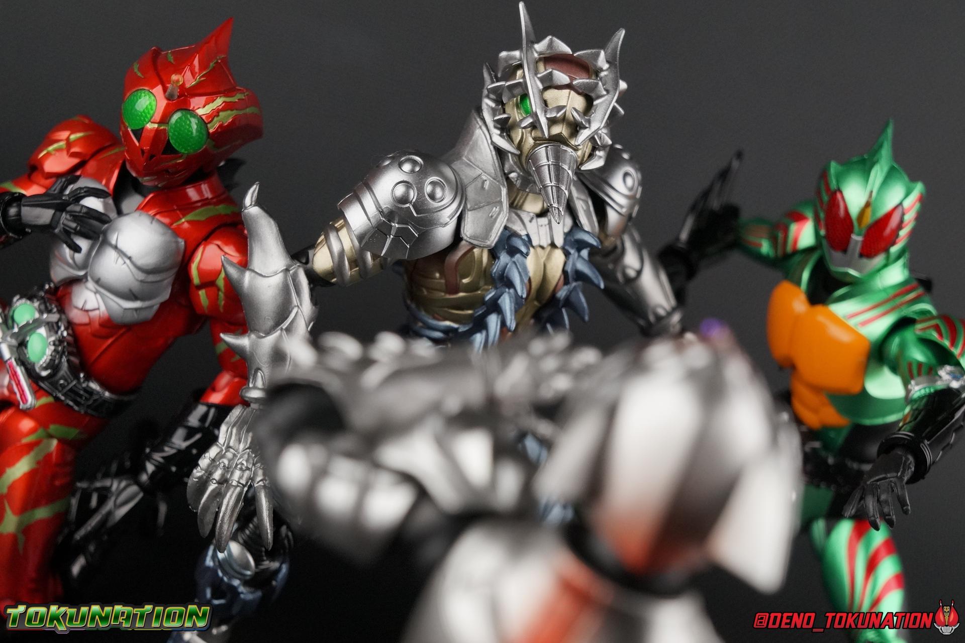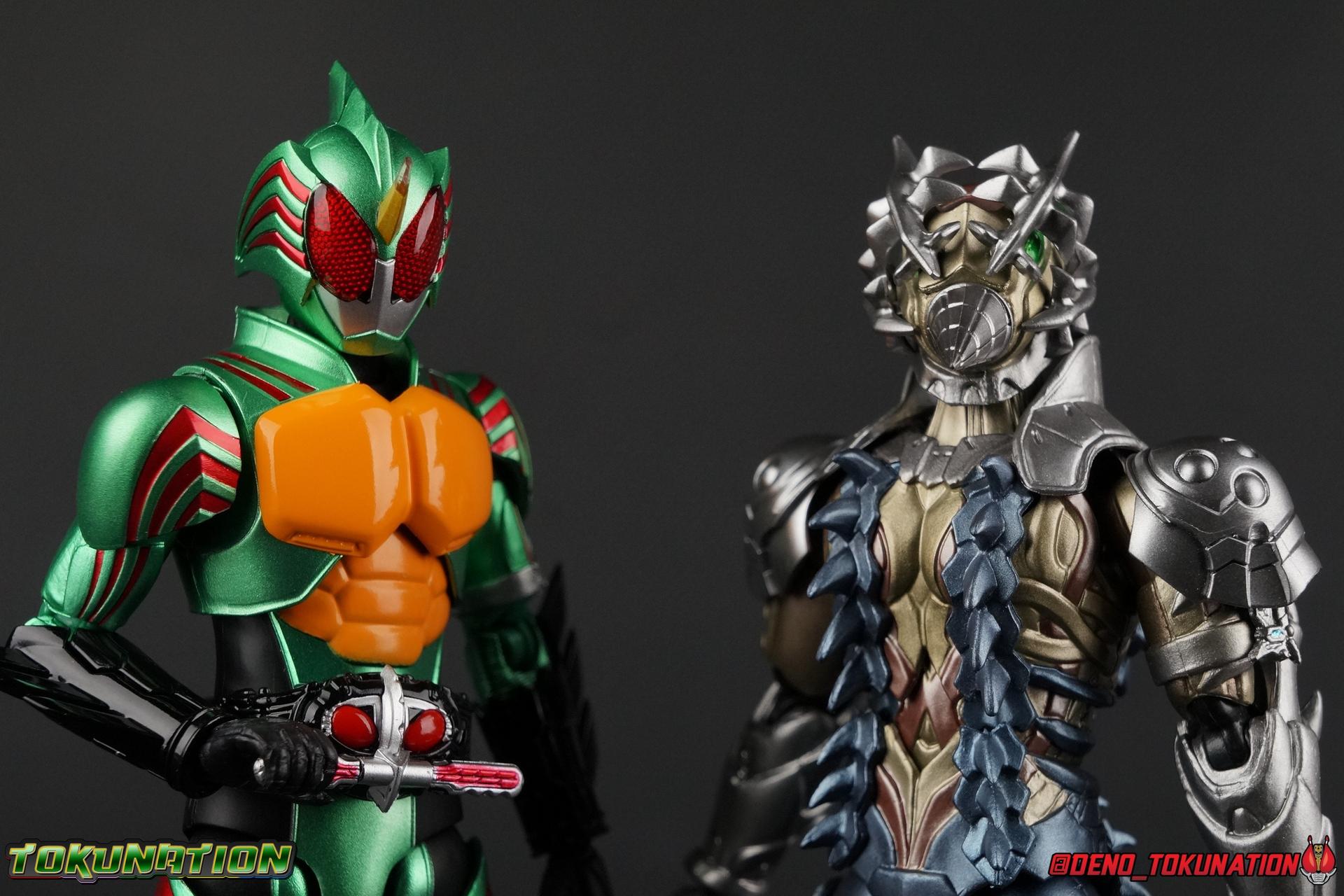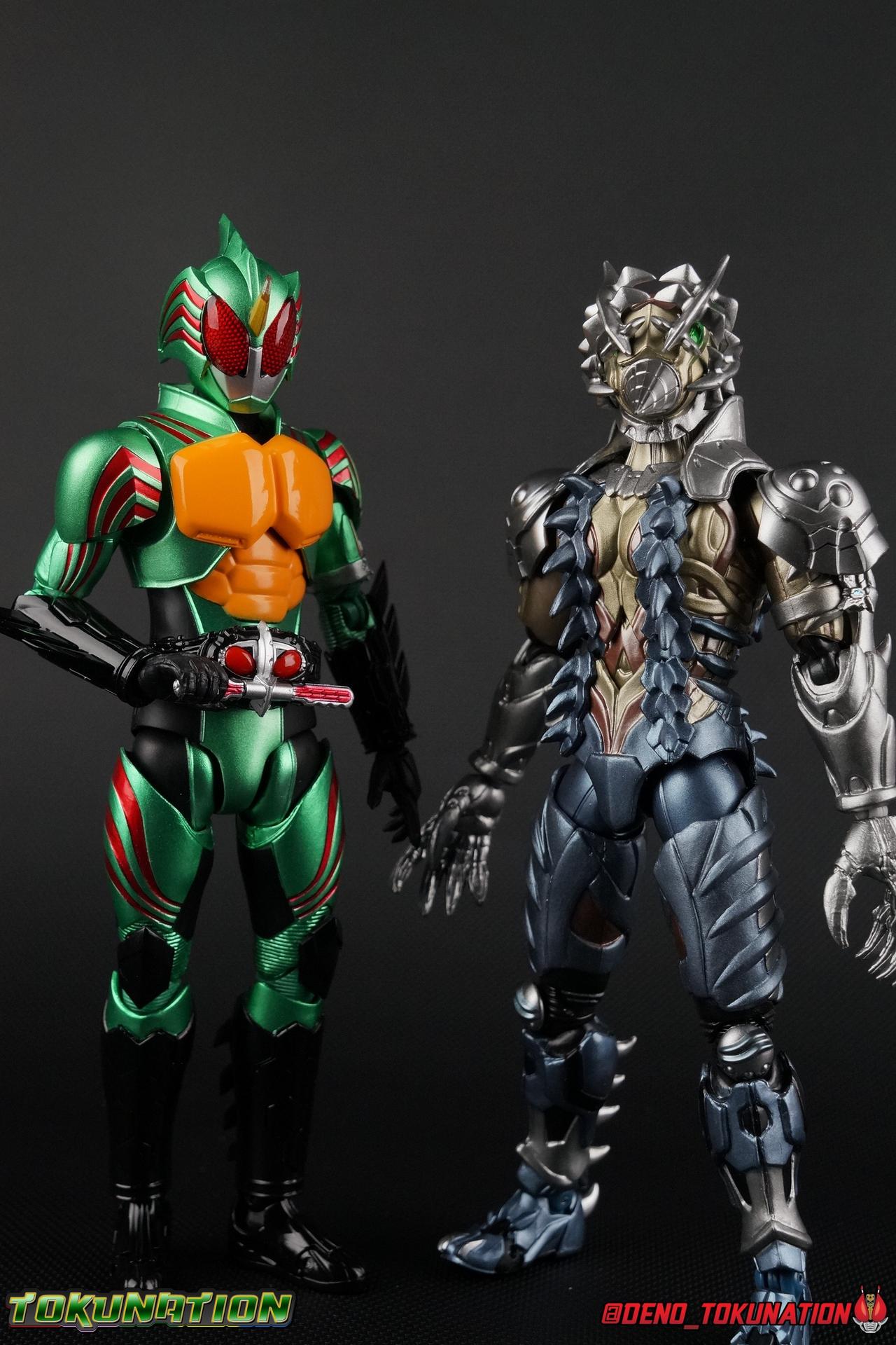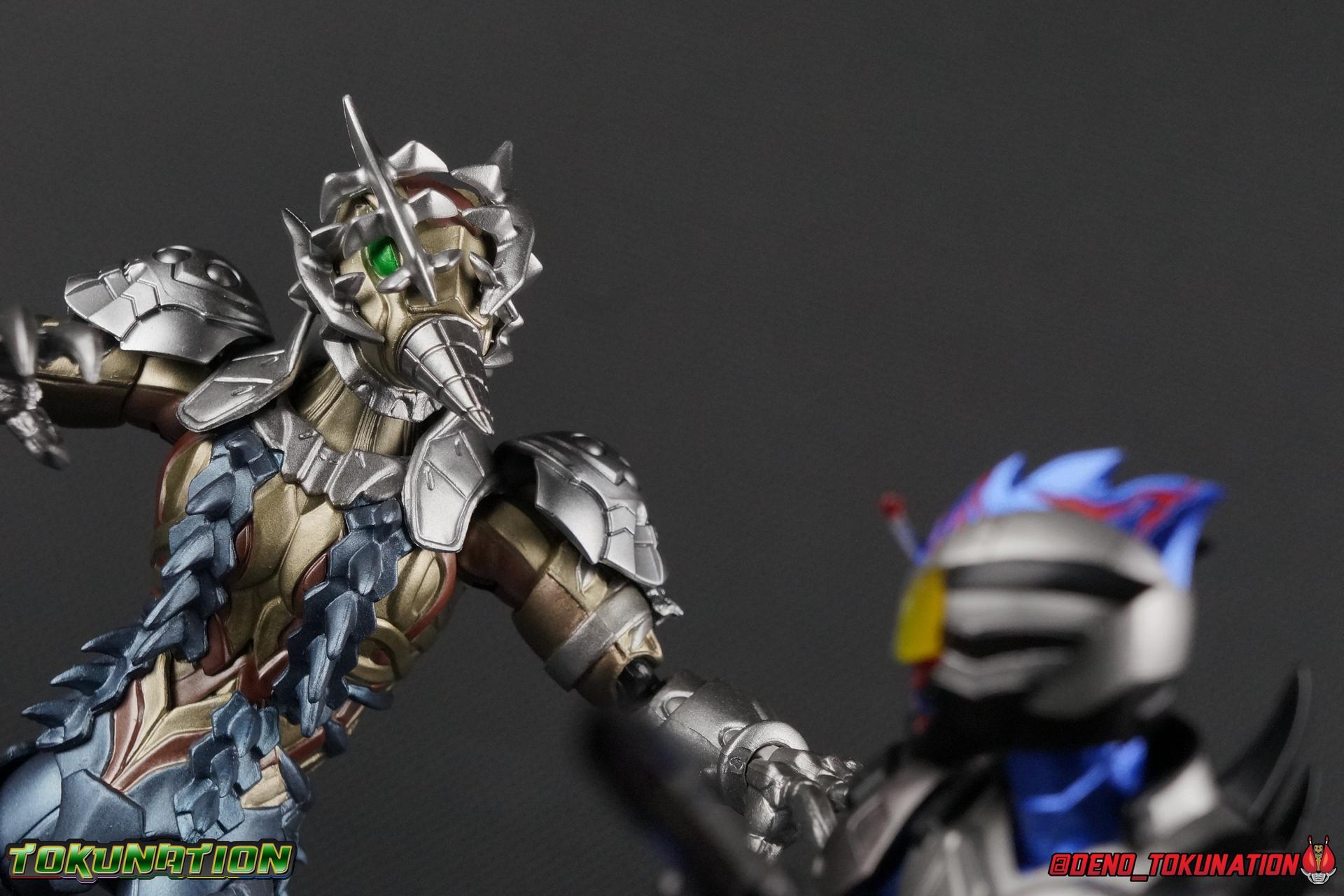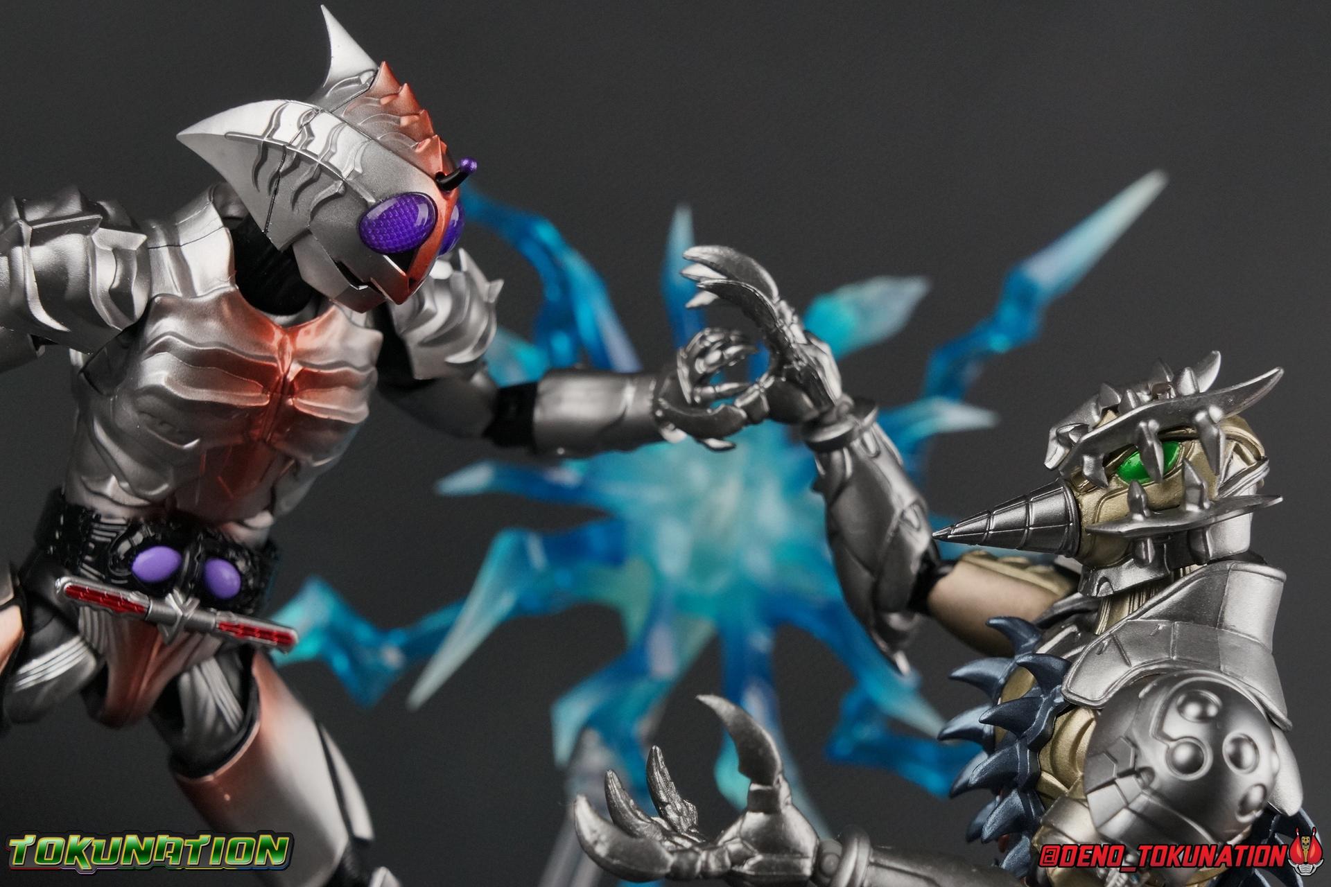 Before Haruka Mizusawa became Amazon Omega, another Amazon friendly to humans helped hunt his own kind. Mamoru, the Mole Amazon, was a member of the Nozoma Peston Service. A rag tag group of mercenaries working any job they could to get paid. Destroying Amazons any and everywhere, the heavy hitter of this group was Mamoru as the only Amazon controlled by Nozoma before the arrival of Haruka/Omega. While powerful, Mamoru had a gentle soul and would have done anything to protect his friends. Often seen eating a hamburger in lieu of his kinds' preferred protein intake, Mamoru lived a simple life. As we all know he would change dramatically 5 years after the first season. Still, there's something to love about Mamoru's character in season 1 of Kamen Rider Amazons. If you weren't aware, Mole Amazon is actually based on the Showa character Mole Beastman from the original Kamen Rider Amazon TV series. Mole Beastman was actually the very first Kaijin to befriend an Kamen Rider, and became a strong ally to Amazon. So it's no wonder that a similar bond was forged between Mamoru & Haruka for a time. As the first of the proper non-rider Amazons to receive a figure, let's dive in and take a look at S.H. Figuarts Mole Amazon! Packaging Unlike a majority of the Amazons releases in my collection, Mole Amazon was not released in any sort of Amazon JP Edition. So he has more standardized packaging in line with the regular releases of Alpha, Omega, New Omega, & Neo. Mole Amazon's box actually matches up really well with Sigma's. Which is just perfect given the character's interactions. The shot used on the front of the box is particularly nice, and really all of the stock photography on the back is spot on, showcasing the best things about this figure. Main Figures I was really really excited when this figure got announced. Not only because of the burger (but duh also because he comes with a damn hamburger accessory) but really just because it showed a willingness to branch out more from just the proper Kamen Riders of the Amazons show. Mamoru was certainly an integral member of the team. but he wasn't a character I'd ever really assumed would get a figuart. After Amazon Sigma was announced I'd just assumed we were probably done with season 1 characters. I'm really happy I was wrong about that. Don't get me wrong I have some qualms with the Mole Amazon as you'll see below, but on the whole I really do like this figure. As always I want to start my review off from the bottom up. You'll see that essentially every surface on Mole's body is lavishly painted in metallic ice blue, silver, and on the upper body a sort of metallic mustard/bronze. Normally I'd be a bit afraid of quite this much paint but Mole actually doesn't have any serious or notable paint flaws that I can find. Now to the legs. After reviewing Amazon Neo, I find him to be sort of the bellweather of this line. A surprisingly well designed figure that I wasn't prepared to love with some great articulation. With that in mind I'm just a bit disappointed that Mole Amazon has some stunted leg articulation. Particularly in the ankles. Thanks to the shin armor/ankle cuffs you lose a bit of side and forward motion out of each foot. The feet themselves feel difficult to balance as is without this though. The knees suffer almost the same fate as Amazon Alpha, the protruding sections on the calves impact the back of the hips immediately limiting how far the leg can bend back. It's not as bad as Alpha but it's there. The hips are thankfully the "new style" and therefore not drop down which is always nice. They do feel a bit tight and don't angle out quite as much as I like but they get the job done. As you'll see below, the Mole Amazon's torso/upper body is just fantastically intricately detailed. The sculpted lines in the chest, abs, and back make this figure feel much more like a suit come to life than most. And the protruding spikes on the front and back side are done very well. They aren't soft or rubbery at all, but actually rather pointy and a little uncomfortable, but great. My big gripe here however is that the waist joint does feel a bit too tight, and a bit limited. While tightness can change sample to sample I don't feel this waist joint is as good as it could or should be. You'll need to be careful as you move the torso around to keep the spikes on it and those on the waist in mind as it can be easier than you think to knock the two together. Mole's arms are quite good, though not perfect. The elbows work at just about a 90 degree angle and the wrists have plenty of clearance for either pair of his large clawed hands. Finger tips and spikes here are likewise nice and pointy so be careful with them. Shoulder pads can move up a decent amount out of the way. Don't forget there's an Amazons Register on the left bicep as well. The silver paint has a way of making it easy to miss but it's really nicely detailed. This all brings us up to the head, which is the most striking and interesting thing about the figure. From a design standpoint it's really unique. Mole almost looks as though he's trapped within a cage. I'm really pleased again with how the paint details worked out on him. I am a bit disappointed with how the head impact the collar around the neck though. There's definitely room for improvement there. The contrast between the bronze and silver really allows his green eyes to pop even more. And while this character of course homages the Mole Beastman form the original Kamen Rider Amazon series, that can be hard to tell if you don't know. So of course the best link between the two is the mouth/drill they share. In it's standard form you can't quite see it in the Mole Amazon, but if you use the open mouth accessory below, the homage finally becomes more apparent. Accessories Because the Mole Amazon didn't really use weapons in the same manner as the Amazons riders, he winds up coming with the best and most appropriate accessories possible: 1 - set