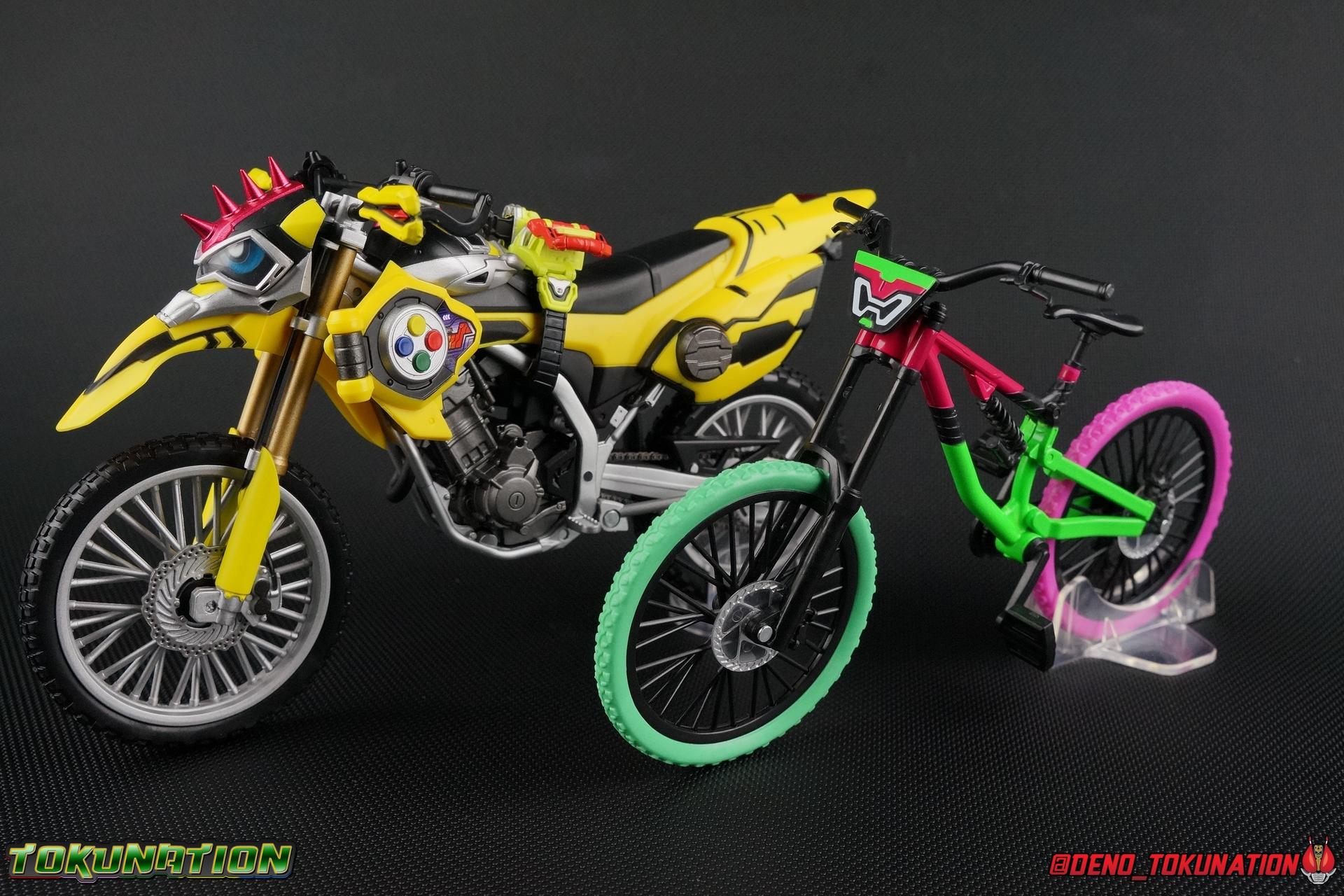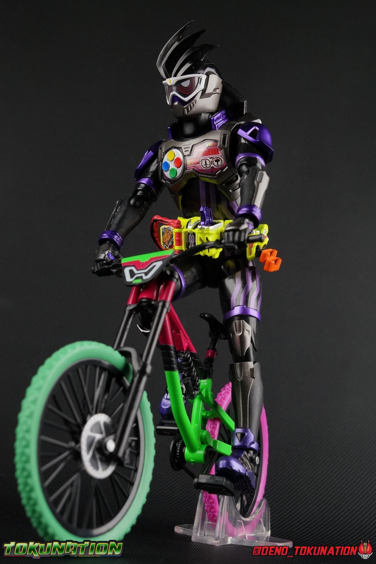 At long last, Kuroto Dan arrives in his original form! While we previously took a look at the exceedingly popular Level X/Dangerous Zombie release, now we have him as he was first presented in his Level 2 form! This figure, oddly, came out as a Tamashii Nations 2017 exclusive. While this was clearly done because of it's nature as a very simple repaint, as has been the trend with event exclusives of years past, the characters' immense popularity made this a less than ideal situation. In light of this Tamashii opted to make this figure available as a Lucky Draw Web Exclusive item at a later date as well, with the caveat that it would not include the Shakariki Sports bike. So of course I had to have this more complete version. So let's take a look at S.H. Figuarts Kamen Rider GenM Action Gamer Level 2 & Shakariki Sports! Packaging Now THIS is something interesting. Event exclusives have had some great box art over the last few years. See Dark Kabuto, Proto-Drive & Lemon Energy Baron. This year however, Tamashii Nations has gone over the top for their 10th anniversary. GenM comes packaged in a special 2-box slipcase set. The outer slipcase in mint green has a fantastic stock photo of the figure and bike that I think looks really sharp. The inner packaging is two separate boxes, one containing GenM, and one containing the Shakariki bike. GenM's box is identical to what we we'll see with the Web Exclusive release coming next year and fits in line with the rest of the toyline perfectly. The Shakariki bike comes in a separate purple monotone box that I really like. It reminds me of the way the Tires & Effect bonuses were packaged for Kamen Rider Driver, though obviously on a larger scale this time. Main Figure We're back once again with a mold we know all too well! The original Ex-Aid mold has been used as a basis for a majority of figures in the line so far including Ex-Aid himself as well as Snipe, Brave, their upgrades, and the Mighty Brothers. But very specifically the figure we're looking at today, Genm Level 2, is a 100% repaint of Ex-Aid Level 2 with no physical alterations whatsoever. GenM is a pretty lavish repaint of this original mold, and a dead sexy one. But the physical portions of this review will be a carbon copy of what I wrote for Ex-Aid. Feel free to skip down a bit if you like. GenM Action Gamer Level 2 utilizes the familiar Mighty Action X body type we've come to know and love. Bringing with it all the meticulous molded details and paint apps we've previously seen before. TMuch as with Ex-Aid, this figure is just lavishly executed. From the Ground up this body type is a sold build. Physically I still nitpick the ankles on this mold, they still feel a bit limited, especially moving forward. And getting GenM into a good pose is a total necessity for his character. So you really have to work with these feet. The knees have a great bend that helps add to the general athletic platformer theme of the figure. Sadly, as with GenM Level X, I find the paint apps on the legs, and in several other places to be a bit sloppy. There are plenty of flecks on the thighs and minor defects that are an annoyance on an expensive event exclusive such as this one. The Gamer Driver for this figure is the same standard one we've seen close to 10 times now. I still think it's an incredible to-scale replica. The appropriate readout and Game title have been added to this release. The Driver handle can flip shut, thus hiding the rider read out on the front screen as well. The right of the driver has 2 slots for Gasshats. One is already attached in the form of the Proto-Mighty Action X Gasshat. As is standard this is a dummy Gashat that can be reattached to any compatible Driver, holster, or Gashacon weapon. To the right of the driver, is a Gashat holster. There are 2 slots for extra Gasshats as well as 1 slot for a Critical Finish to be inserted. As with Ex-Aid, GenM's chest detailing is magnificent. And unlike the Mighty Brothers the interior label used for the Rider Gauge is flawless. The paint apps on the outer layer are crisp and clear here for the most part as well. I should point out that much like Brave having an incorrectly colored collar piece, GenM too is wrong. His shoulder/collar area should be purple but has instead been left silver. On the flip side of the torso is the deactivated Level 1 head. It's a bit stylized and shrunk down, but that's as it should be if TV CG magic could really work in toy form. Not to be forgotten are the arms, which admittedly only have one flaw that I'm truly bothered by, and that's the shoulder pads. Not because they impact the articulation, but because they pop off easily when fully extending the arms. I had the same problem with my Ex-Aid though oddly not with the Mighty Brothers. But it's a minor issue. The wrists are solid, the elbows fully functional and the bicep swivel welcome as always. Finally that brings us to the head. This is where the most egregious paint issues are present. The white paint used for the visor is just pitifully applied. Lot's of hazy overspray around the edges and a ton of flecks on the visor itself. The "hair" of the helmet likewise has a number of white flecks that really detract from it's overall look. Otherwise I think the shape of the head is generally great, and the hair looks very solid. Lots of people took issue with this head on the original Ex-Aid release, but I've always thought it looked spot on. Accessories 4 - set of hands. 3 varieties of open palm hands and 1 set for holding things, weapons or bike handles. 1 - set of Gashacon Bug Visor parts. This accessory is actually split into a few pieces though out of box it comes in the Chainsaw Eliminator mode. Although the saw form is not the standard mode of the weapon. The Bug Visor itself is just a plate in the center that makes up most of the mass of the accessory. It's attached to a long board with the saw extended on one end. The EXP Grip Knuckle is likewise a separate pa