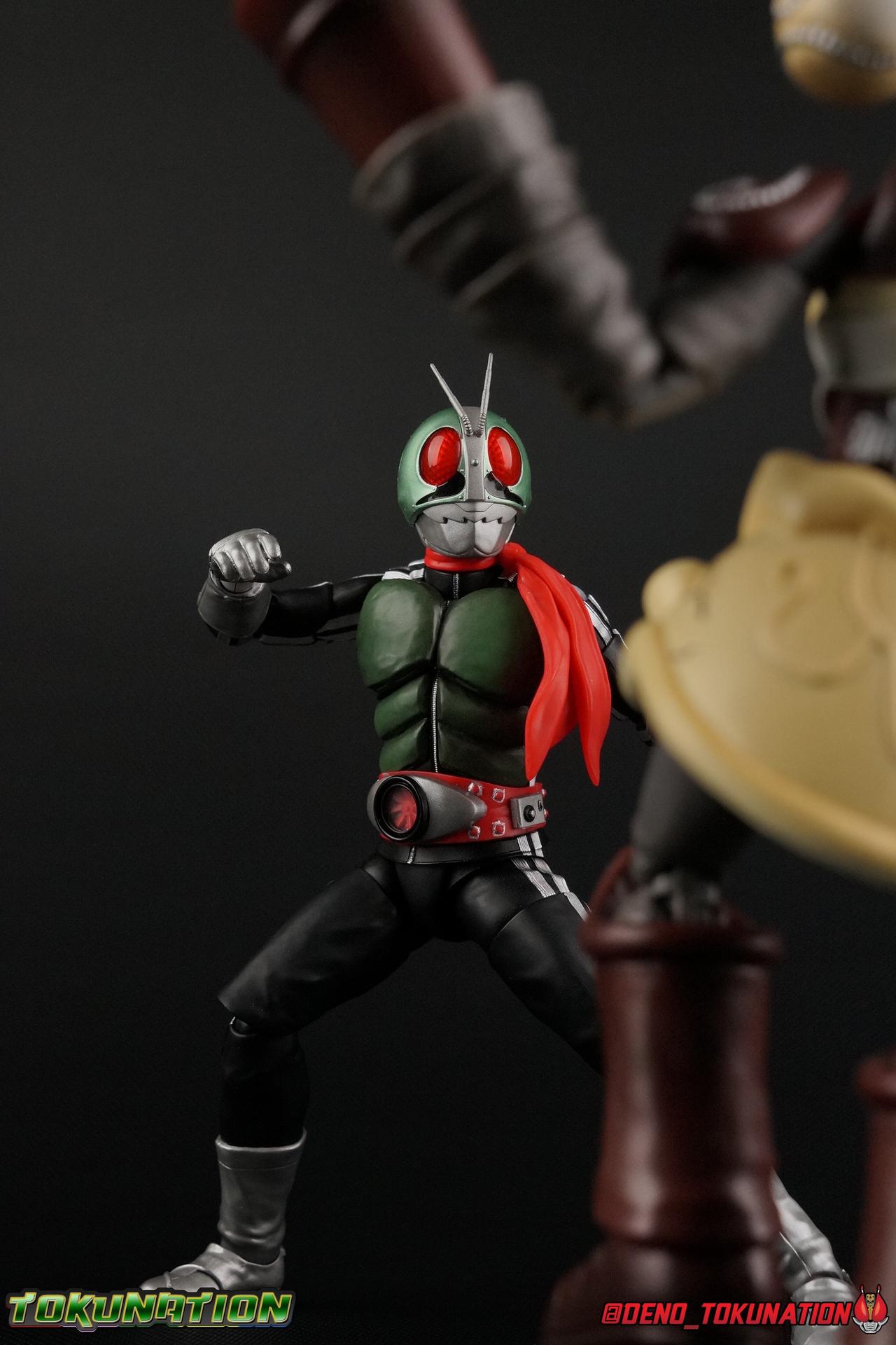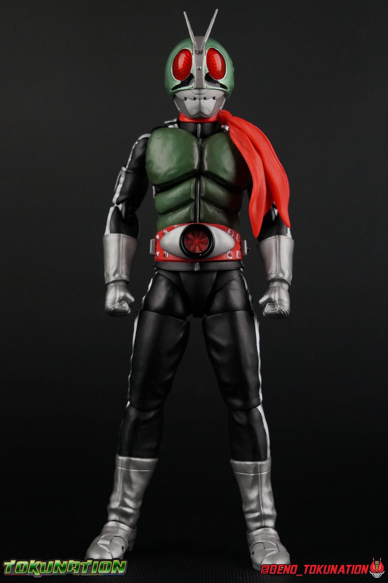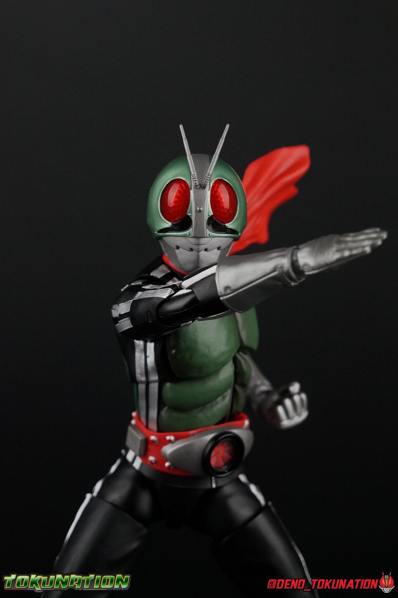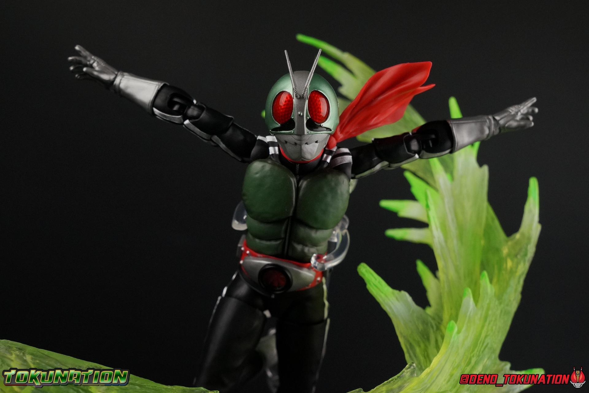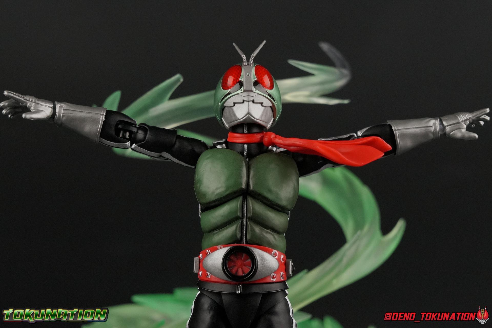 Following up from our recent look at S.H. Figuarts Takeshi Hongo, we have the most iconic riders' other new figure as well! Shinkocchou Seihou as a toyline has sought out the perfect balance of functional figures with as close to 100% screen accuracy as possible. The results frankly speak for themselves, from the first figure releases (Kabuto) to the most recent one before this (Skull), this line has continued to knock things out of the park. So how well has it worked for the original Kamen Rider? Very! Read below for our full review of S.H. Figuarts Shinkocchou Seihou Kamen Rider 1! ** This gallery is spread across the first 3 posts of this thread. Be sure to check them all out! Packaging That standard slipcover packaging of Shinkocchou Seihou returns again. You've seen it numerous times before. Rider 1's artwork looks really sharp on it. But of course there's nothing really new offered here. Business as usual. Main Figure What a time to be a collector! It's been just over 10 years since the S.H. figuarts toyline came into being. What began with figures based on the then current Kamen Rider The First film, has led us to this point. It's appropriate that 10 years later all the advances of this toyline are embodied in the releases we're looking at today. Those he's had numerous S.H. figuarts releases in one form or another over the last 10 years, finally the original Kamen Rider 1 gets the premium renewal Shinkocchou Seihou treatment! Released at the very end of 2017, Seihou Rider 1 is easily one of the best releases of last year. It's also easily the best figure form representation of this character we've ever had. This brand new mold works to as closely as possible recreate the original suit it's based on, right down to the most minute of details. This figure is of course based on the "Shin" Rider 1 design introduced later into the original TV series run. Avid fans will of course remember the classic green and pink eyes look of the original suit as well as the darker Sakurajima Rider 1 suits used later on. But the Shin design is the one most often associated with Takeshi Hongo, and it's become his easily most iconic look. It's the form he's taken in every single appearance he's made since it's debut in the original series for the last 40+ years save for the 2016 Movie design. So it's only appropriate that this design be the one to receive the Seihou treatment first. Similarly the upcoming Seihou Rider 2 release is based on his equally iconic & standard Shin Rider 2 design. Now, what's so special about this release? Well if you've handled any of the multiple prior Rider 1 figuarts you've undoubtedly noticed by now that those figures don't stack up to many modern releases now. They tend to be short, disproportionate, and use outdated articulation design. Seihou Rider 1 tosses all that out the window. Starting with the legs, we have a really remarkable design choice even just for the feet. A nice free balljoint is used for the ankle so you don't have much obstructing it, but it also has one of the best toe bends I've ever seen on a figuarts. That's going both directions! It just provides really stable balance. Similarly to other Seihous the legs are also expertly crafted. Akin to W or Skull, Rider 1 has a sort of receding knee joint that's hidden under the knee itself and expands as you move it. Making things look really natural and proportionate. The hips are a really interesting combinations of new ideas. Some of which I can see were borrowed from recent renewals of Super Saiyan Vegeta & Super Saiyan 3 Goku. Both of these figures featured a new hip "mesh" design. An overlay of parts that move over the hip to keep the design unbroken while posing. Rider 1 has a very similar system in place, though it can look odd from extreme angles. They aren't really impacted by his waist section at all either which is a huge relief. This figure needs to be every bit as dynamic as the real character. The legs as a whole also feature great molded in fabric style details to really sell how accurate the figure is to the actual suit. It's been a hallmark of this toyline and I love it. Moving up, we have the latest version of the Typhoon rider belt. This is probably the best detailed and most accurate version of it done at this scale so far. Mine has a few silver paint splotches that you really only notice upon a close inspection though. Now the torso is by far the thing that sets this release apart most. Modern Rider 1 figures have very often taken his classic design and streamlined bits of it to be more modern, as in they look less like painted styrofoam and rubber. Thankfully Seihou Rider 1 embraces the original design. This couldn't be more evident than with the green padding on his chest and stomach. Right down to every rough imperfection, concave are, and ripple, the suit has been properly recreated for the first time. And it manages to look better than the actual suit still. I will warn you to be careful as on my copy the waist joint and floating torso joints are both very very tight and require a bit of force to move. But the design of the upper body is just so visually pleasing that I'm willing to forgo that criticism. The arms are likewise greatly improved. Thankfully to a sunken in shoulder joint that doesn't protrude from the body, the shoulders are free to fully rotate 180 degrees, be fully outstretched and arched back, hell you can even completely invert the joint and turn the arm around backwards. It's an absolutely killer design. The wonderful bicep swivels return as well! Something that should be standard on every last figuart in my opinion. The elbows work perfectly and the balljoints for the hands are extended just far enough away from the wrist to free them up for dynamic posing as well. My only gripe with the arms is that they do impact the torso somewhat, and can't lay totally flat against his ribs. But that's a small price to pay for this level of functionality. Before we tackle the he
