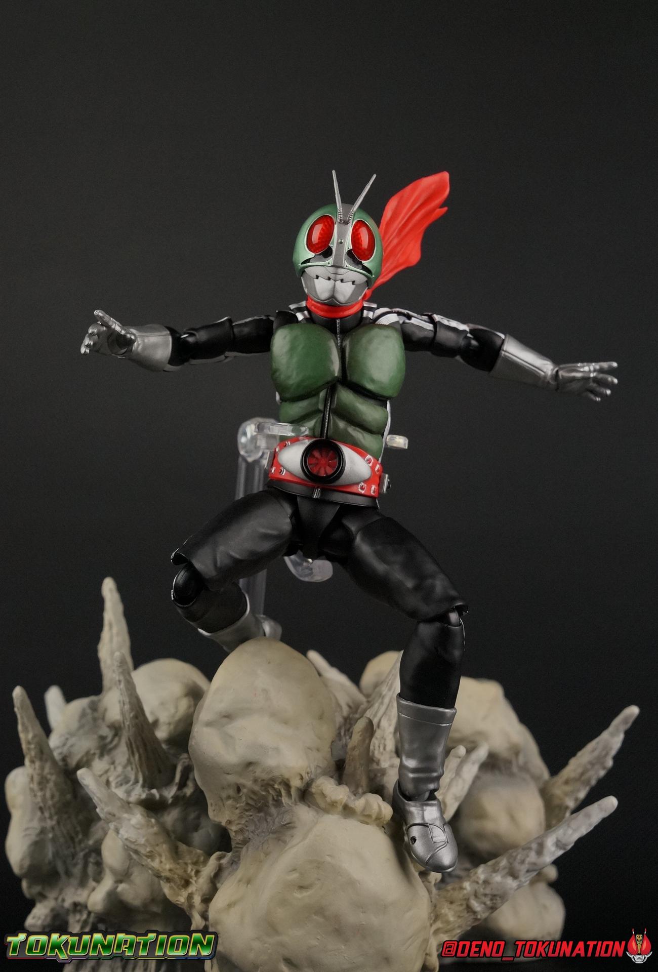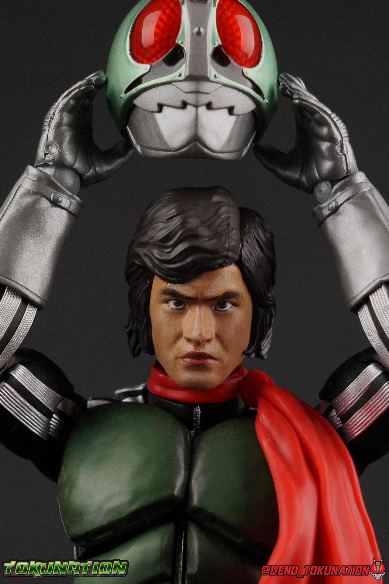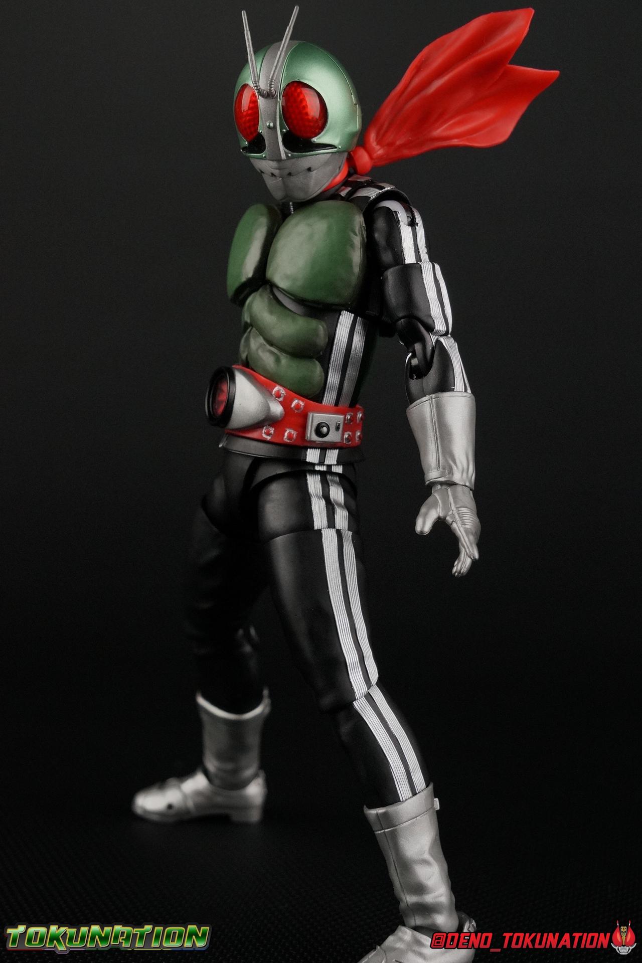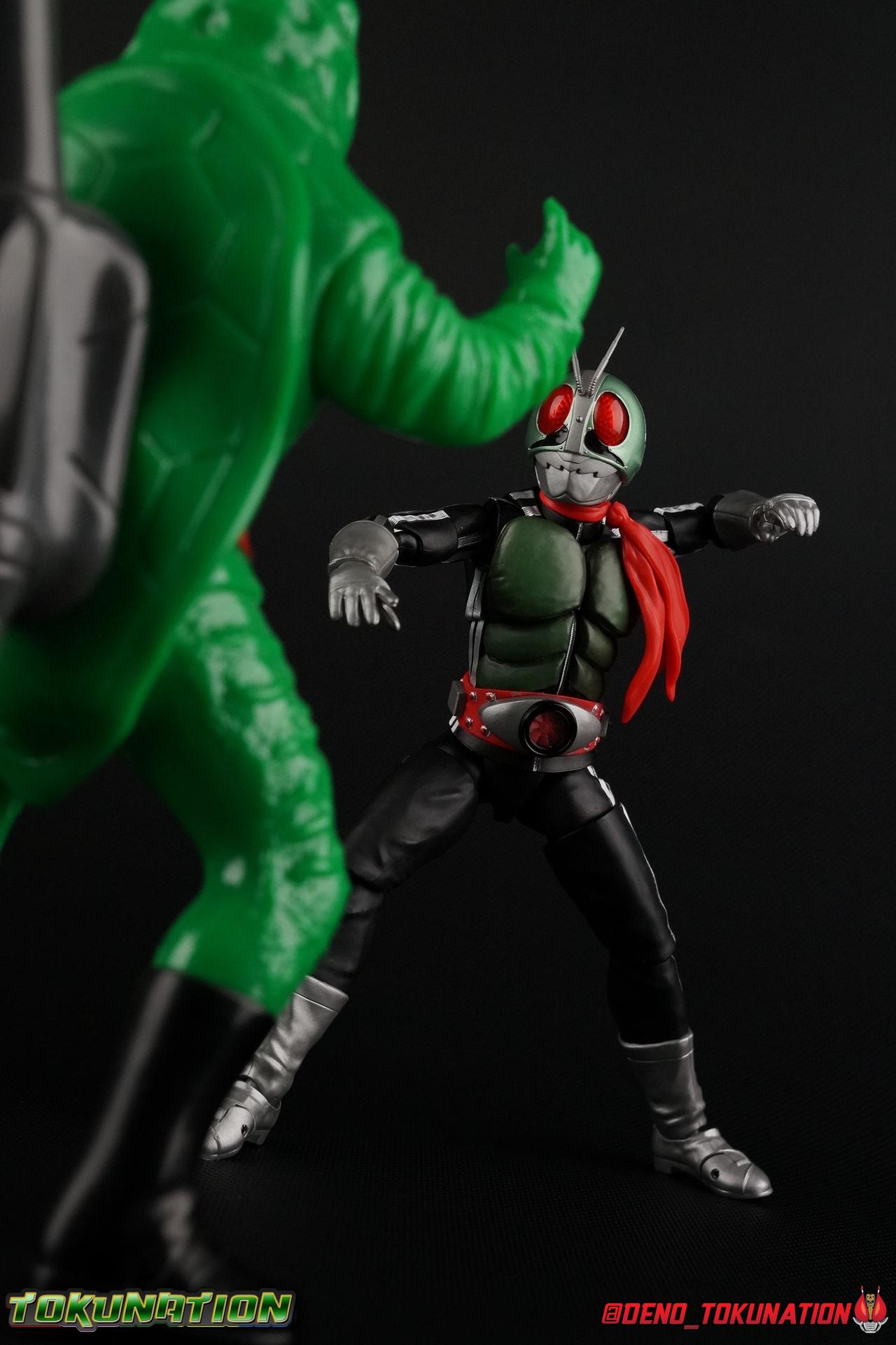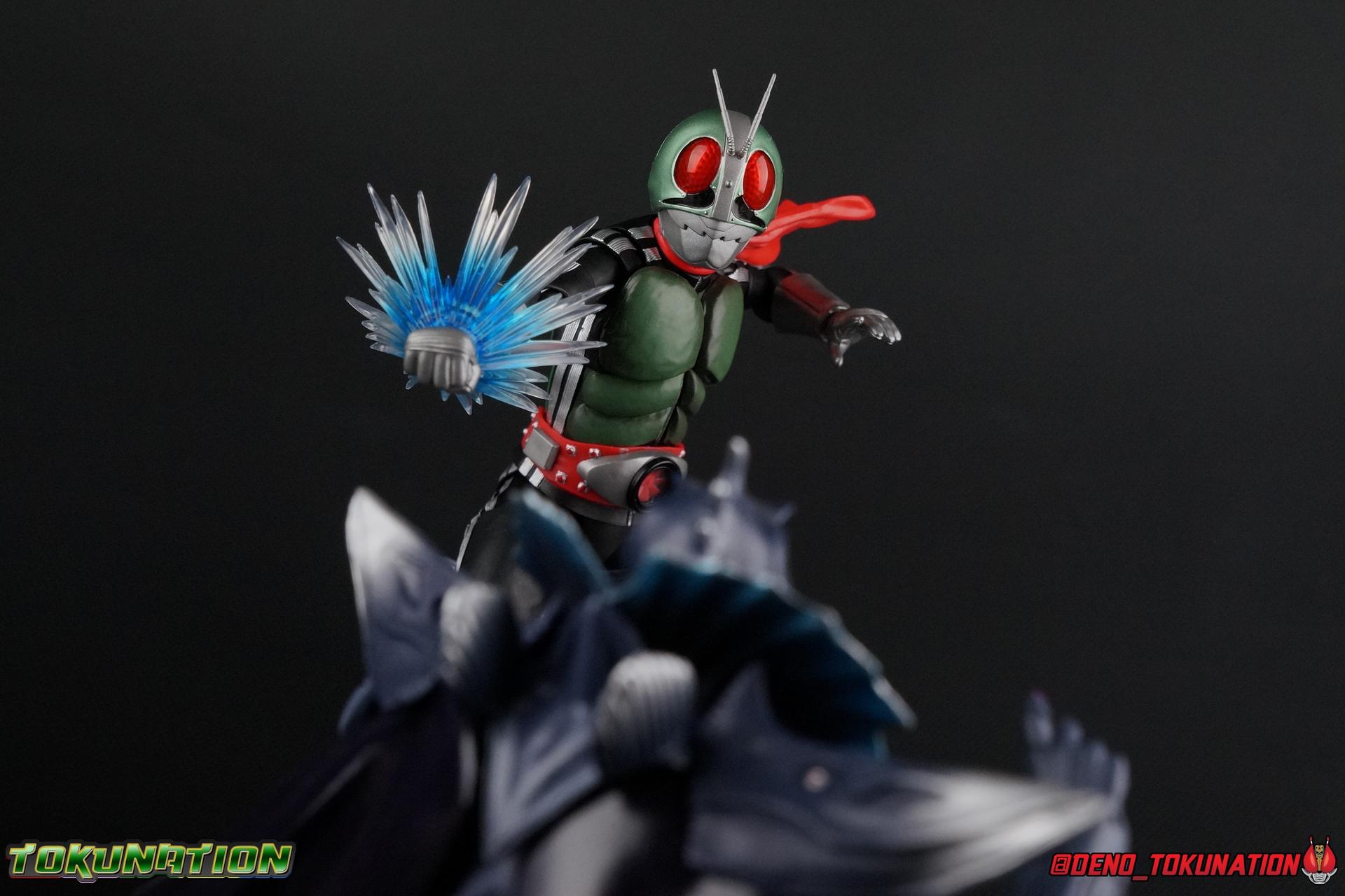 Following up from our recent look at S.H. Figuarts Takeshi Hongo, we have the most iconic riders' other new figure as well! Shinkocchou Seihou as a toyline has sought out the perfect balance of functional figures with as close to 100% screen accuracy as possible. The results frankly speak for themselves, from the first figure releases (Kabuto) to the most recent one before this (Skull), this line has continued to knock things out of the park. So how well has it worked for the original Kamen Rider? Very! Read below for our full review of S.H. Figuarts Shinkocchou Seihou Kamen Rider 1! ** This gallery is spread across the first 3 posts of this thread. Be sure to check them all out! Packaging That standard slipcover packaging of Shinkocchou Seihou returns again. You've seen it numerous times before. Rider 1's artwork looks really sharp on it. But of course there's nothing really new offered here. Business as usual. Main Figure What a time to be a collector! It's been just over 10 years since the S.H. figuarts toyline came into being. What began with figures based on the then current Kamen Rider The First film, has led us to this point. It's appropriate that 10 years later all the advances of this toyline are embodied in the releases we're looking at today. Those he's had numerous S.H. figuarts releases in one form or another over the last 10 years, finally the original Kamen Rider 1 gets the premium renewal Shinkocchou Seihou treatment! Released at the very end of 2017, Seihou Rider 1 is easily one of the best releases of last year. It's also easily the best figure form representation of this character we've ever had. This brand new mold works to as closely as possible recreate the original suit it's based on, right down to the most minute of details. This figure is of course based on the "Shin" Rider 1 design introduced later into the original TV series run. Avid fans will of course remember the classic green and pink eyes look of the original suit as well as the darker Sakurajima Rider 1 suits used later on. But the Shin design is the one most often associated with Takeshi Hongo, and it's become his easily most iconic look. It's the form he's taken in every single appearance he's made since it's debut in the original series for the last 40+ years save for the 2016 Movie design. So it's only appropriate that this design be the one to receive the Seihou treatment first. Similarly the upcoming Seihou Rider 2 release is based on his equally iconic & standard Shin Rider 2 design. Now, what's so special about this release? Well if you've handled any of the multiple prior Rider 1 figuarts you've undoubtedly noticed by now that those figures don't stack up to many modern releases now. They tend to be short, disproportionate, and use outdated articulation design. Seihou Rider 1 tosses all that out the window. Starting with the legs, we have a really remarkable design choice even just for the feet. A nice free balljoint is used for the ankle so you don't have much obstructing it, but it also has one of the best toe bends I've ever seen on a figuarts. That's going both directions! It just provides really stable balance. Similarly to other Seihous the legs are also expertly crafted. Akin to W or Skull, Rider 1 has a sort of receding knee joint that's hidden under the knee itself and expands as you move it. Making things look really natural and proportionate. The hips are a really interesting combinations of new ideas. Some of which I can see were borrowed from recent renewals of Super Saiyan Vegeta & Super Saiyan 3 Goku. Both of these figures featured a new hip "mesh" design. An overlay of parts that move over the hip to keep the design unbroken while posing. Rider 1 has a very similar system in place, though it can look odd from extreme angles. They aren't really impacted by his waist section at all either which is a huge relief. This figure needs to be every bit as dynamic as the real character. The legs as a whole also feature great molded in fabric style details to really sell how accurate the figure is to the actual suit. It's been a hallmark of this toyline and I love it. Moving up, we have the latest version of the Typhoon rider belt. This is probably the best detailed and most accurate version of it done at this scale so far. Mine has a few silver paint splotches that you really only notice upon a close inspection though. Now the torso is by far the thing that sets this release apart most. Modern Rider 1 figures have very often taken his classic design and streamlined bits of it to be more modern, as in they look less like painted styrofoam and rubber. Thankfully Seihou Rider 1 embraces the original design. This couldn't be more evident than with the green padding on his chest and stomach. Right down to every rough imperfection, concave are, and ripple, the suit has been properly recreated for the first time. And it manages to look better than the actual suit still. I will warn you to be careful as on my copy the waist joint and floating torso joints are both very very tight and require a bit of force to move. But the design of the upper body is just so visually pleasing that I'm willing to forgo that criticism. The arms are likewise greatly improved. Thankfully to a sunken in shoulder joint that doesn't protrude from the body, the shoulders are free to fully rotate 180 degrees, be fully outstretched and arched back, hell you can even completely invert the joint and turn the arm around backwards. It's an absolutely killer design. The wonderful bicep swivels return as well! Something that should be standard on every last figuart in my opinion. The elbows work perfectly and the balljoints for the hands are extended just far enough away from the wrist to free them up for dynamic posing as well. My only gripe with the arms is that they do impact the torso somewhat, and can't lay totally flat against his ribs. But that's a small price to pay for this level of functionality. Before we tackle the he