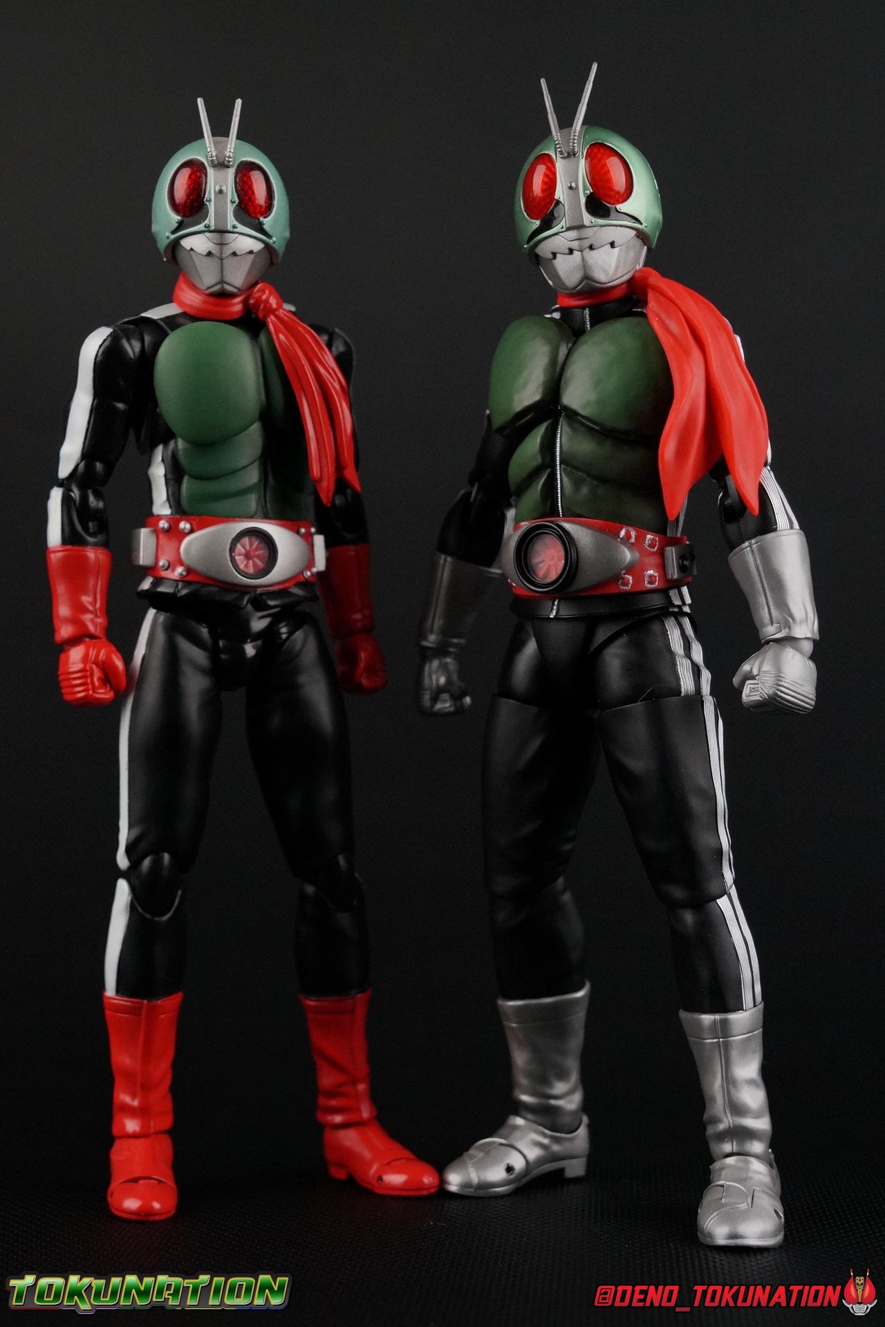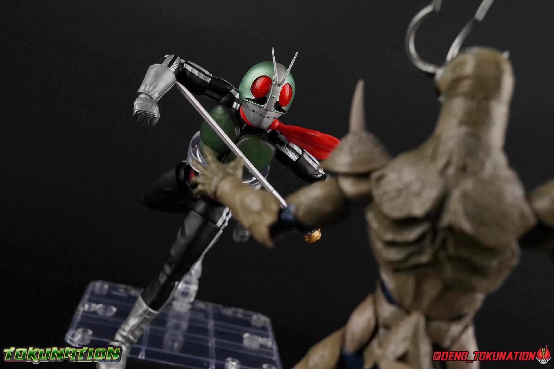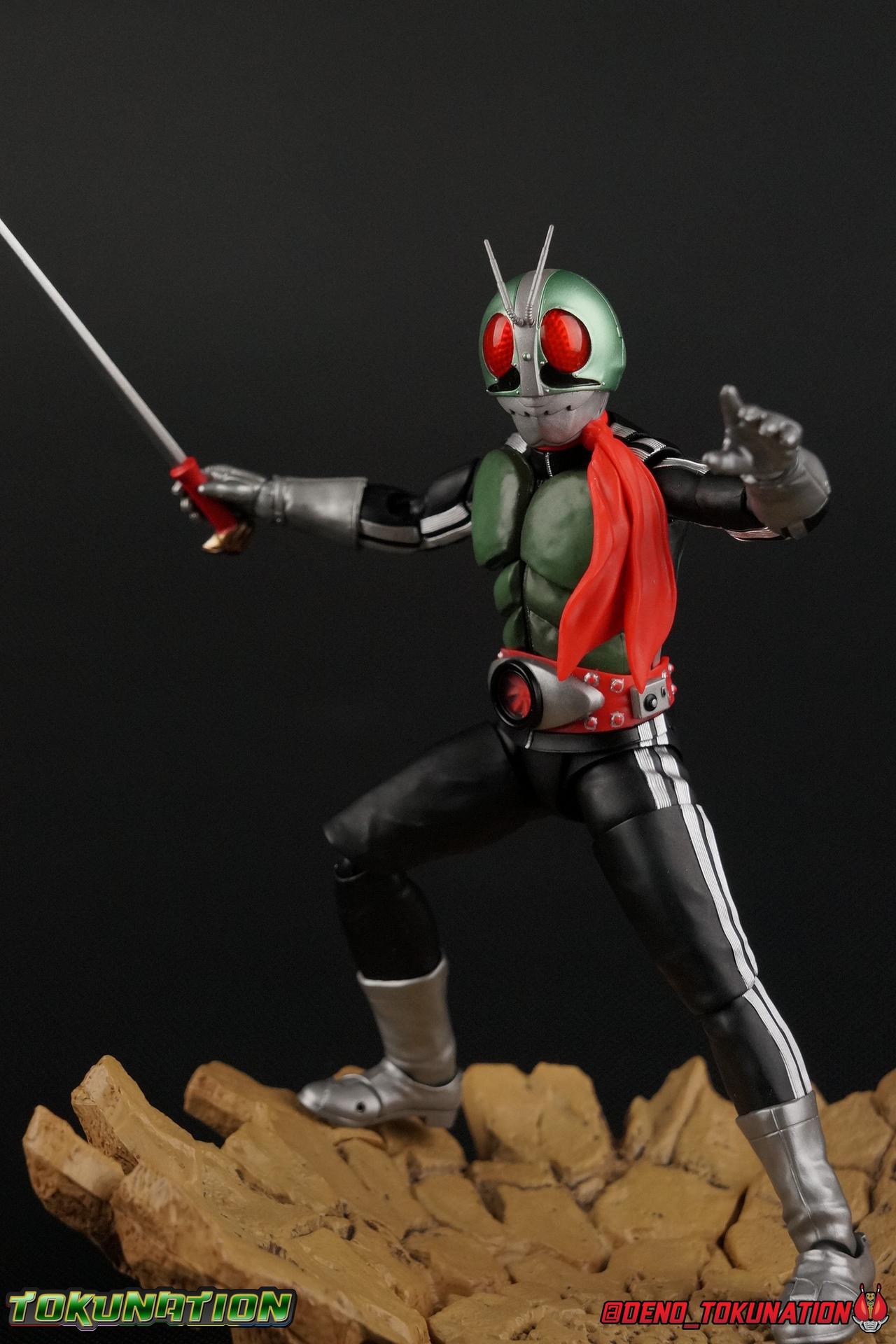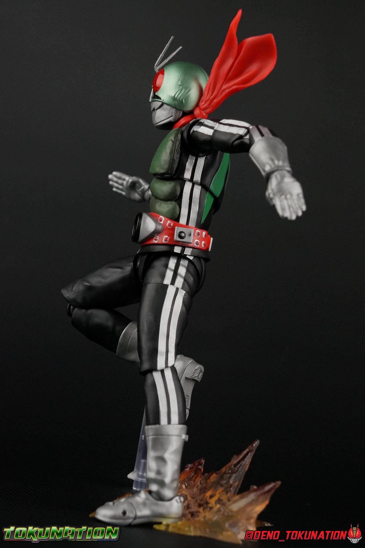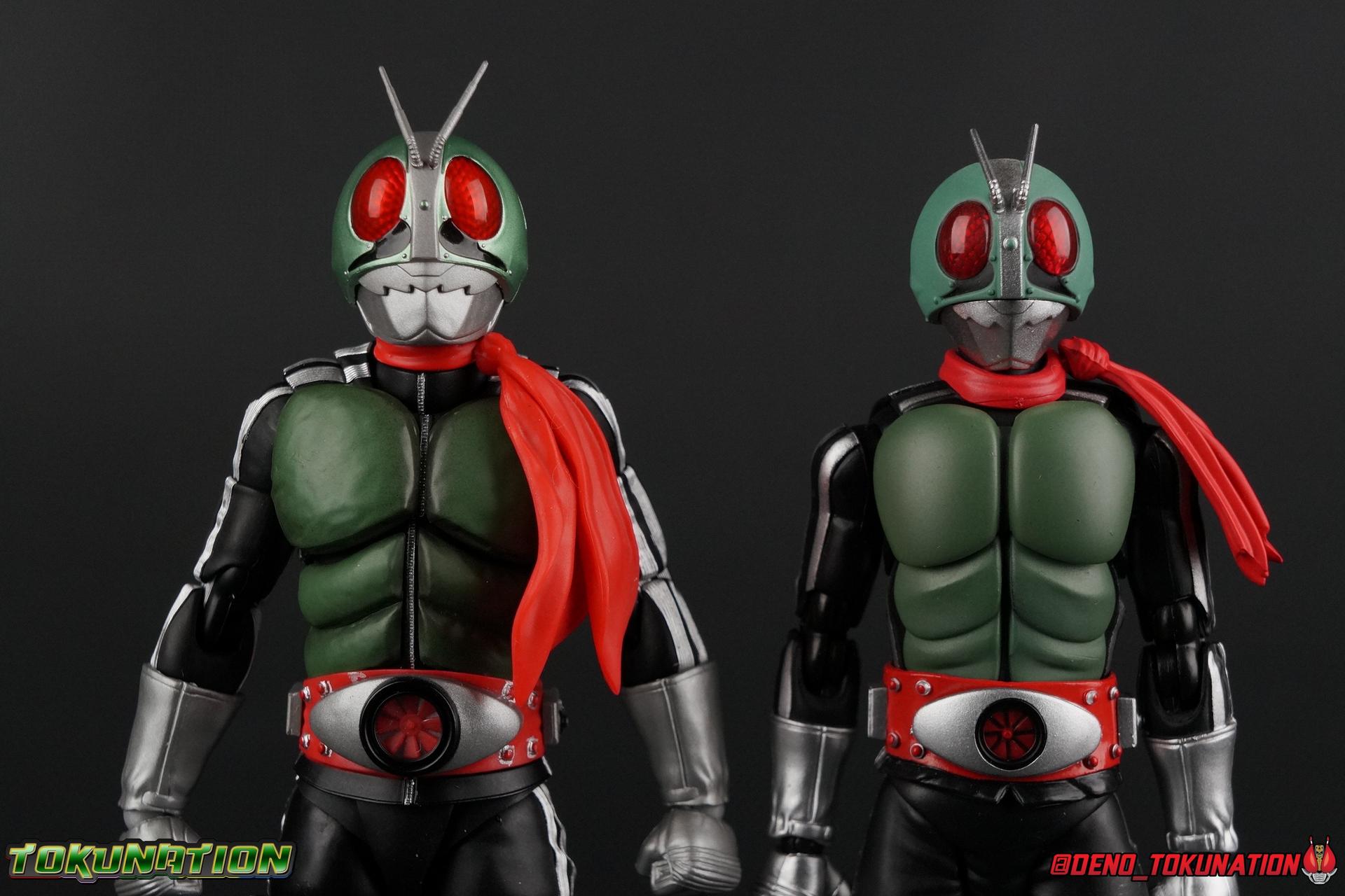 Following up from our recent look at S.H. Figuarts Takeshi Hongo, we have the most iconic riders' other new figure as well! Shinkocchou Seihou as a toyline has sought out the perfect balance of functional figures with as close to 100% screen accuracy as possible. The results frankly speak for themselves, from the first figure releases (Kabuto) to the most recent one before this (Skull), this line has continued to knock things out of the park. So how well has it worked for the original Kamen Rider? Very! Read below for our full review of S.H. Figuarts Shinkocchou Seihou Kamen Rider 1! ** This gallery is spread across the first 3 posts of this thread. Be sure to check them all out! Packaging That standard slipcover packaging of Shinkocchou Seihou returns again. You've seen it numerous times before. Rider 1's artwork looks really sharp on it. But of course there's nothing really new offered here. Business as usual. Main Figure What a time to be a collector! It's been just over 10 years since the S.H. figuarts toyline came into being. What began with figures based on the then current Kamen Rider The First film, has led us to this point. It's appropriate that 10 years later all the advances of this toyline are embodied in the releases we're looking at today. Those he's had numerous S.H. figuarts releases in one form or another over the last 10 years, finally the original Kamen Rider 1 gets the premium renewal Shinkocchou Seihou treatment! Released at the very end of 2017, Seihou Rider 1 is easily one of the best releases of last year. It's also easily the best figure form representation of this character we've ever had. This brand new mold works to as closely as possible recreate the original suit it's based on, right down to the most minute of details. This figure is of course based on the "Shin" Rider 1 design introduced later into the original TV series run. Avid fans will of course remember the classic green and pink eyes look of the original suit as well as the darker Sakurajima Rider 1 suits used later on. But the Shin design is the one most often associated with Takeshi Hongo, and it's become his easily most iconic look. It's the form he's taken in every single appearance he's made since it's debut in the original series for the last 40+ years save for the 2016 Movie design. So it's only appropriate that this design be the one to receive the Seihou treatment first. Similarly the upcoming Seihou Rider 2 release is based on his equally iconic & standard Shin Rider 2 design. Now, what's so special about this release? Well if you've handled any of the multiple prior Rider 1 figuarts you've undoubtedly noticed by now that those figures don't stack up to many modern releases now. They tend to be short, disproportionate, and use outdated articulation design. Seihou Rider 1 tosses all that out the window. Starting with the legs, we have a really remarkable design choice even just for the feet. A nice free balljoint is used for the ankle so you don't have much obstructing it, but it also has one of the best toe bends I've ever seen on a figuarts. That's going both directions! It just provides really stable balance. Similarly to other Seihous the legs are also expertly crafted. Akin to W or Skull, Rider 1 has a sort of receding knee joint that's hidden under the knee itself and expands as you move it. Making things look really natural and proportionate. The hips are a really interesting combinations of new ideas. Some of which I can see were borrowed from recent renewals of Super Saiyan Vegeta & Super Saiyan 3 Goku. Both of these figures featured a new hip "mesh" design. An overlay of parts that move over the hip to keep the design unbroken while posing. Rider 1 has a very similar system in place, though it can look odd from extreme angles. They aren't really impacted by his waist section at all either which is a huge relief. This figure needs to be every bit as dynamic as the real character. The legs as a whole also feature great molded in fabric style details to really sell how accurate the figure is to the actual suit. It's been a hallmark of this toyline and I love it. Moving up, we have the latest version of the Typhoon rider belt. This is probably the best detailed and most accurate version of it done at this scale so far. Mine has a few silver paint splotches that you really only notice upon a close inspection though. Now the torso is by far the thing that sets this release apart most. Modern Rider 1 figures have very often taken his classic design and streamlined bits of it to be more modern, as in they look less like painted styrofoam and rubber. Thankfully Seihou Rider 1 embraces the original design. This couldn't be more evident than with the green padding on his chest and stomach. Right down to every rough imperfection, concave are, and ripple, the suit has been properly recreated for the first time. And it manages to look better than the actual suit still. I will warn you to be careful as on my copy the waist joint and floating torso joints are both very very tight and require a bit of force to move. But the design of the upper body is just so visually pleasing that I'm willing to forgo that criticism. The arms are likewise greatly improved. Thankfully to a sunken in shoulder joint that doesn't protrude from the body, the shoulders are free to fully rotate 180 degrees, be fully outstretched and arched back, hell you can even completely invert the joint and turn the arm around backwards. It's an absolutely killer design. The wonderful bicep swivels return as well! Something that should be standard on every last figuart in my opinion. The elbows work perfectly and the balljoints for the hands are extended just far enough away from the wrist to free them up for dynamic posing as well. My only gripe with the arms is that they do impact the torso somewhat, and can't lay totally flat against his ribs. But that's a small price to pay for this level of functionality. Before we tackle the he
