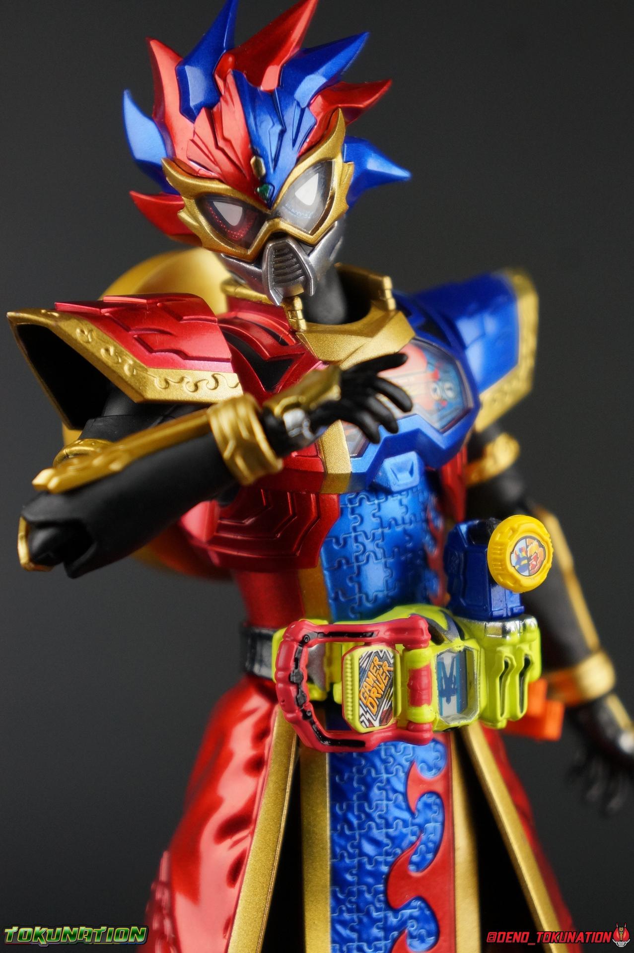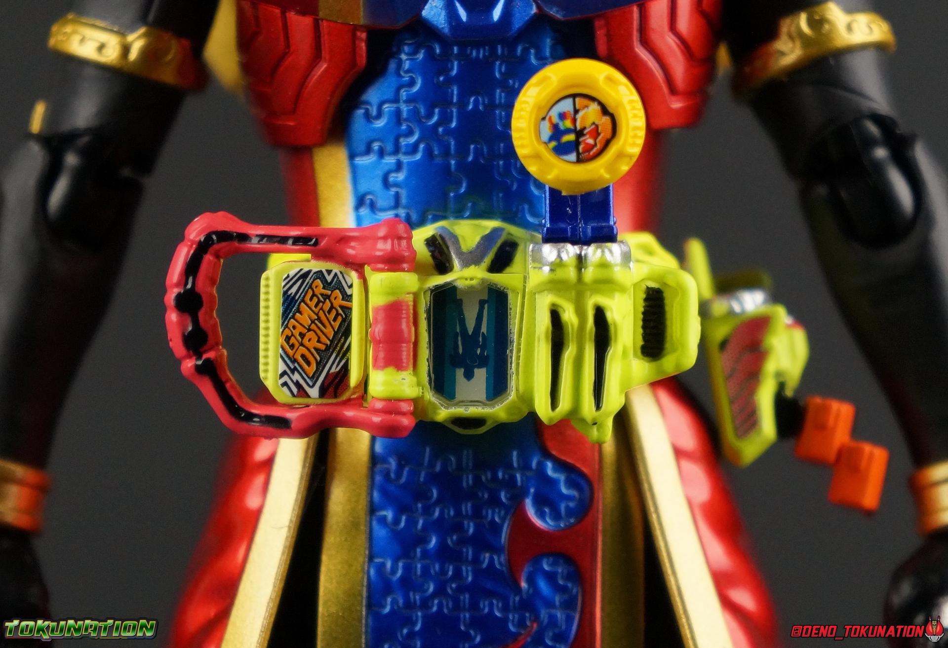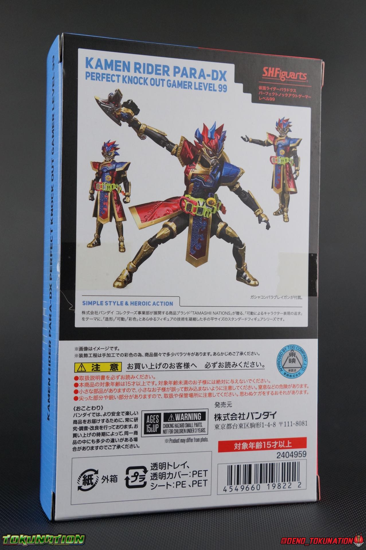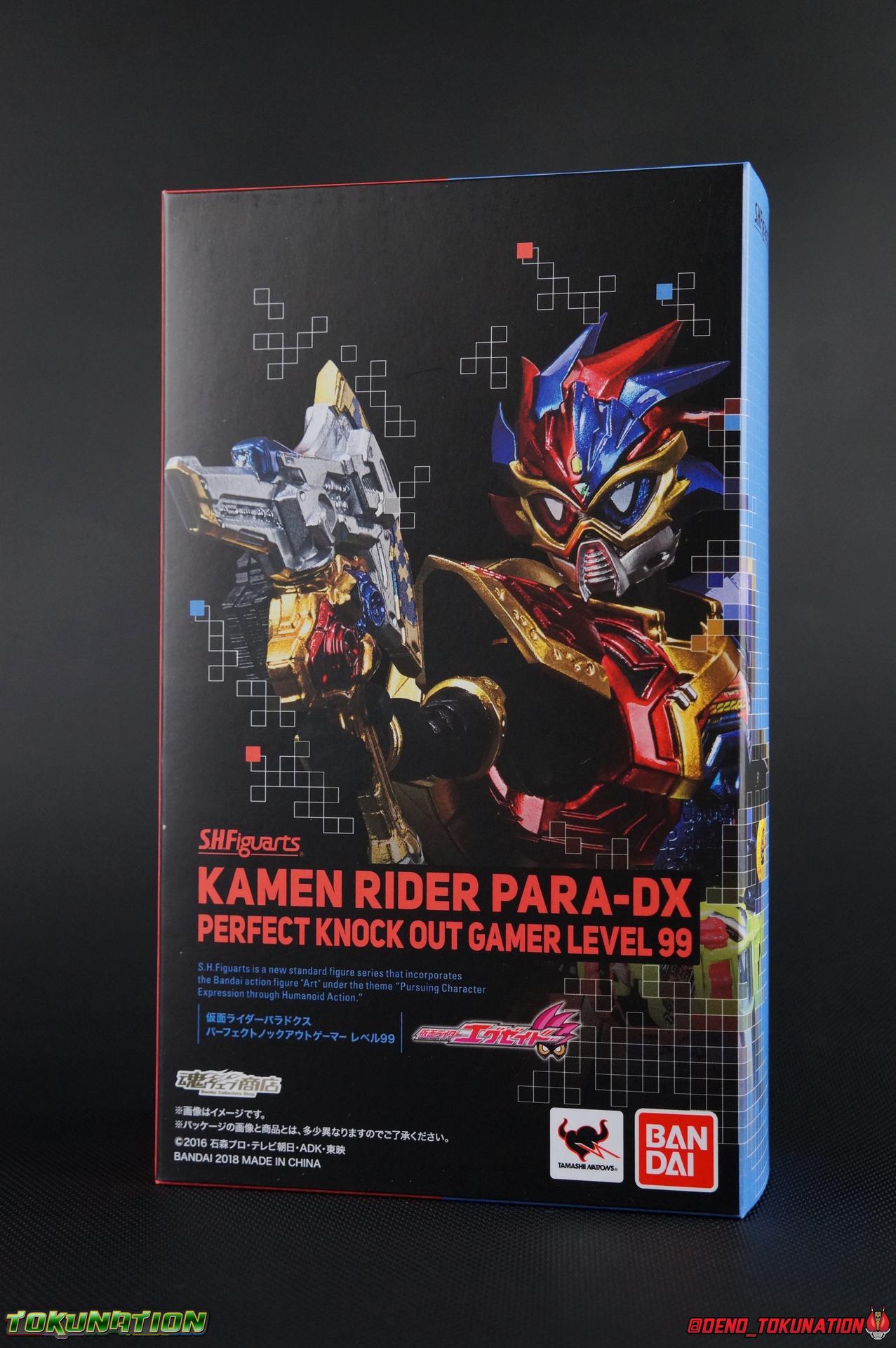 The Genius Gamer M or rather, the Bugster Parad whom'd given Emu those skills for years would eventually become Kamen Rider Para-DX. Using the Gashat Gear Dual he could alternate between two powerful Level 50 forms. In an attempt to stay relevant in Emu's life and surpass him, Parad would even go so far as to have himself be reprogrammed by Maximum Mighty X. This procedure allowed him to finally use a Gamer Driver like a human, in doing so giving him access to his most powerful form. Now we look at this pinnacle of strength & skill in our gallery of S.H. Figuarts Kamen rider Para-DX Perfect Knockout Gamer Level 99! Packaging As with previous releases, Para-DX Level 99's box is themed very similarly to the rest of the line. With it's bright, loud, packaging it's right at home with the rest of the Ex-Aid lineup. With no packaging window as all web exclusives are these days. As with the others the colors really pop and I like the character portrait on the front. And I'm always down for red/blue two-tone. That's about all there is to say on this one once again. Main Figure I'll be honest, it took me a long time to really care for Parad's Level 99 form in show. The design just did not work for me for some time. It felt very at odds with itself in my mind. But as the show continued it really became easier for me to digest the suit and I eventually really grew to like it overall. The figure won me over straight out of the box thanks to this. Para-DX Level 99 has a really strong and powerful sculpt that definitely showcases it's high level nature. This is a form that commands attention. And thanks to the 3-piece poseable skirt armor the figure can assume some really nice wide angled stances that are filled out a bit from these parts. Something about them helps contribute to the overall look of the figure and really bulks the lower body up quite nicely. Even if the legs themselves are still basically the Ex-Aid ones we've come to know so well, minor flaws and all, the whole package really works. And I absolutely LOVE the engraved puzzle piece design on the skirt. It's just top notch gorgeous as is the section on his abs. As with previous releases, the Gamer Driver is as always my favorite thing about these figures. This entire device is really intricately detailed for something at this scale. The Driver handle can still flip shut. Changes to this release include a new read out on the driver that pairs with this form. I'd never noticed before but it seems that the image is of Para-DX's Perfect Puzzle form. There's also the addition of the "dummy" Gashat Gear Dual, which is removable and compatible with all Gamer Drivers and double slotted Gashacon weapons. You can insert it into any other Gamer Driver with two open slots, much in the same way as Mighty Brothers XX or Snipe Level 50. At this scale I'm really impressed by the artwork on the front of the Gashat Gear Dual, it's a really good representation of the real deal. The Gashat Holster to the left of the Driver is empty. The upper body of the figure has a lot going on. Particularly on Parad's back. This is where the large Dial representing the Gashat Gear Dual sits. While pretty large this part doesn't detract from the design or hinder Parad's articulation. The chest detailing on the figure is also quite nice. As most always seems to be the case for Ex-Aid Riders, Para-DX has a nice crisp clear Rider Gauge in his chest as well. Honestly there's just a ton of great detailing on this fella. There's a lot of ornate engraving style details on the armor. The puzzle pieces I mentioned above are the best, but I love the sort of gold engraving done on the legs arms and shoulder pads. The shoulder pads while I'm on them, are a bit of a bother. The keep the figure from fully lifting his arms up perpendicular to the body. You can always rotate the shoulders back and angle things out as you need, but I'm always bothered when figures can't fully extend their arms out to the sides. That brings us to head, where the biggest fault of this release lies. Unfortunately the head was manufactured pretty inaccurately. The eyes within the visor are a bit misshapen compared to the actual show prop, but the bigger issue is their placement. They're supposed to touch the top edge of the visor and come down from there. Instead the eyes are almost centered within the visor. The look is both very off-putting and rather disappointing. The paint work on the rest of the helmet is brilliant but the issue with the eyes is just so irksome that it's difficult to enjoy it beyond that. The flared out alternating "hair" is very well done and definitely makes Para-DX seem just a 'tad' bit like a Yu-Gi-Oh character. Accessories Para-DX comes with pretty much all he really could. Even if it feels a bit on the lite side. 3 - Sets of hands. 2 splayed open hands, two more relaxed open hands, and two weapon holding hands. Nothing unique to speak of but enough hands to get the job done in most cases. 1 - Gashacon Parabladegun. This strange two form weapon has never felt like nearly as intuitive of a design as the Gashacon Breaker to me. And it feels just a bit awkward in toy form as well. It's detailed quite nicely so it at least looks good in that respect. But I almost do feel it's a little over-sized, maybe? The grip is just a hint too thick as well. It doesn't fit quite as well in Parad's hand as I'd like. To switch between the Ax & Gun modes you just rotate the blade back and forth. It's a little bit loose though. There's also a slot to accommodate any double sized Gashat to replicate a Critical Finish. I would really really hope that at some point in the future, an accurate head would be included with another Ex-Aid figuart, in much the same way that the original Accel figuart eventually got a new head with Booster. Para-DX's head is just kind of unforgivably off and we need a replacement for it ASAP. Toss it in with Perfect Puzzle or Knockout Fighter when and if those come out. Somethi